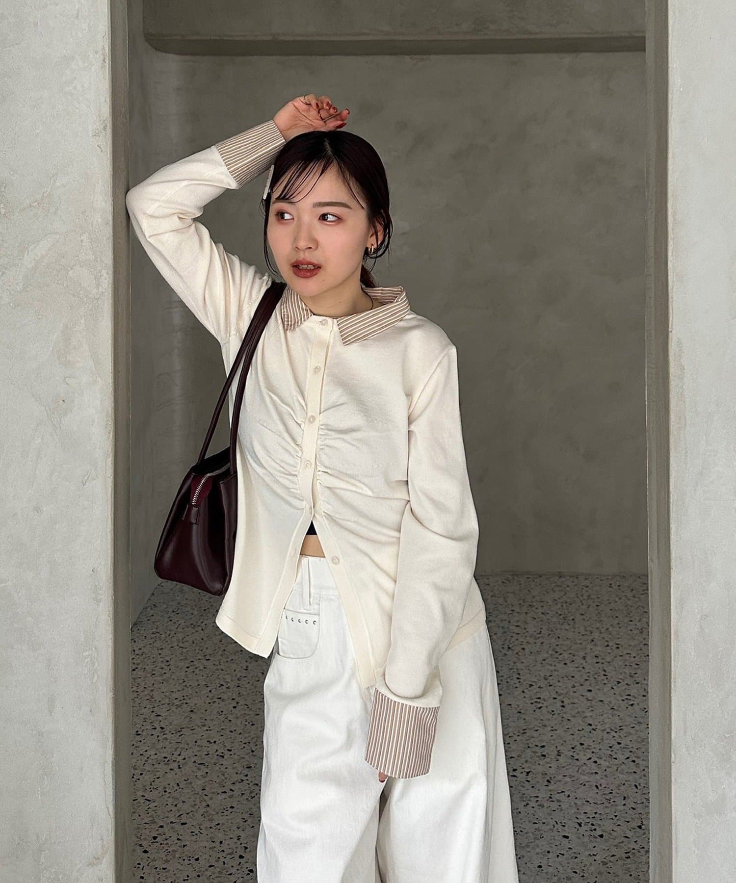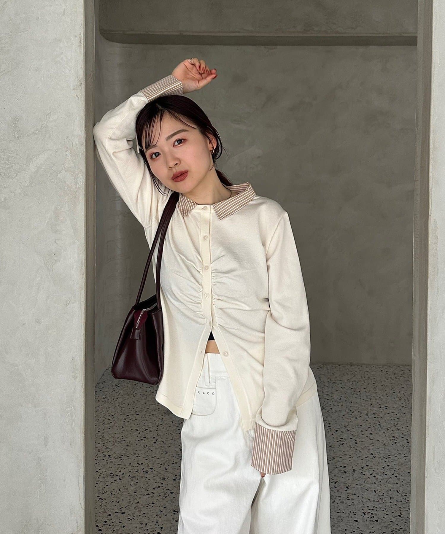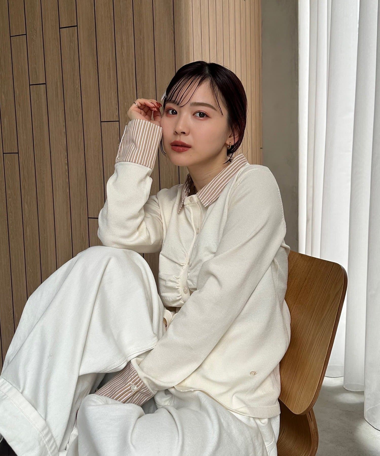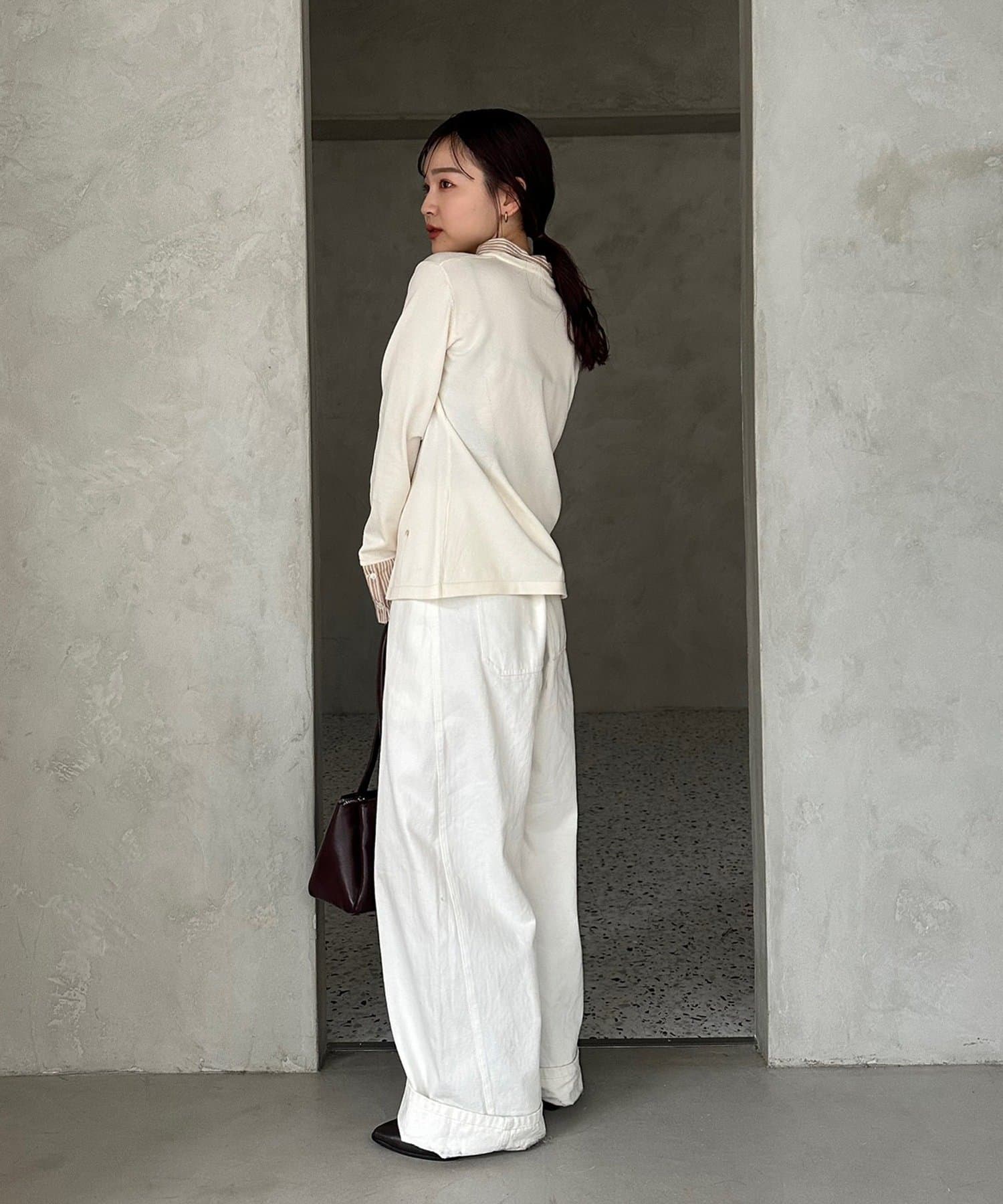 ・襟を取り外してクルーネックカーディガンとしても!下にカラーのTシャツを重ねるのもおすすめです!