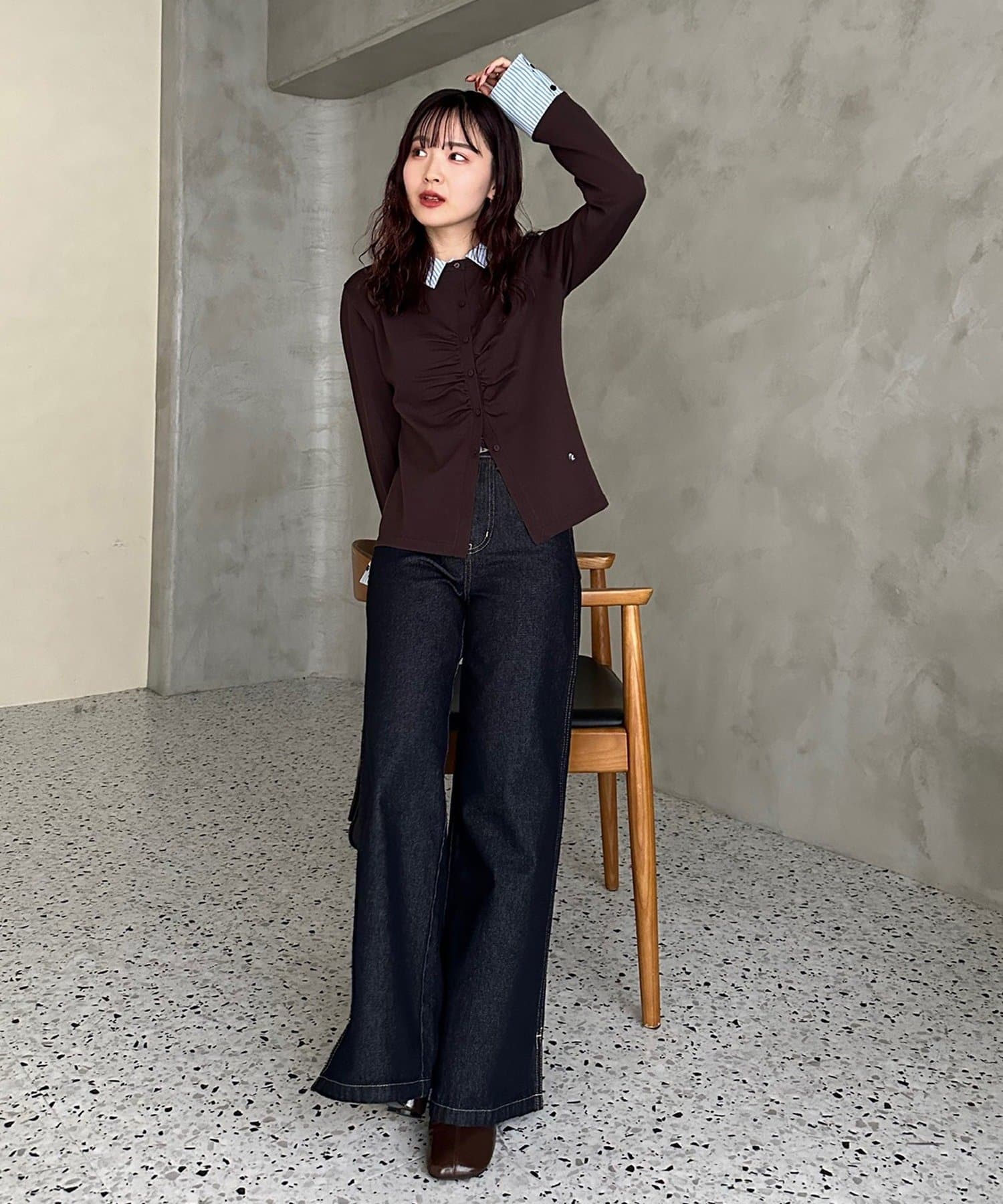 ・デニムで合わせてシンプルながらもトップスのレイヤード風で簡単にオシャレ見えを◎