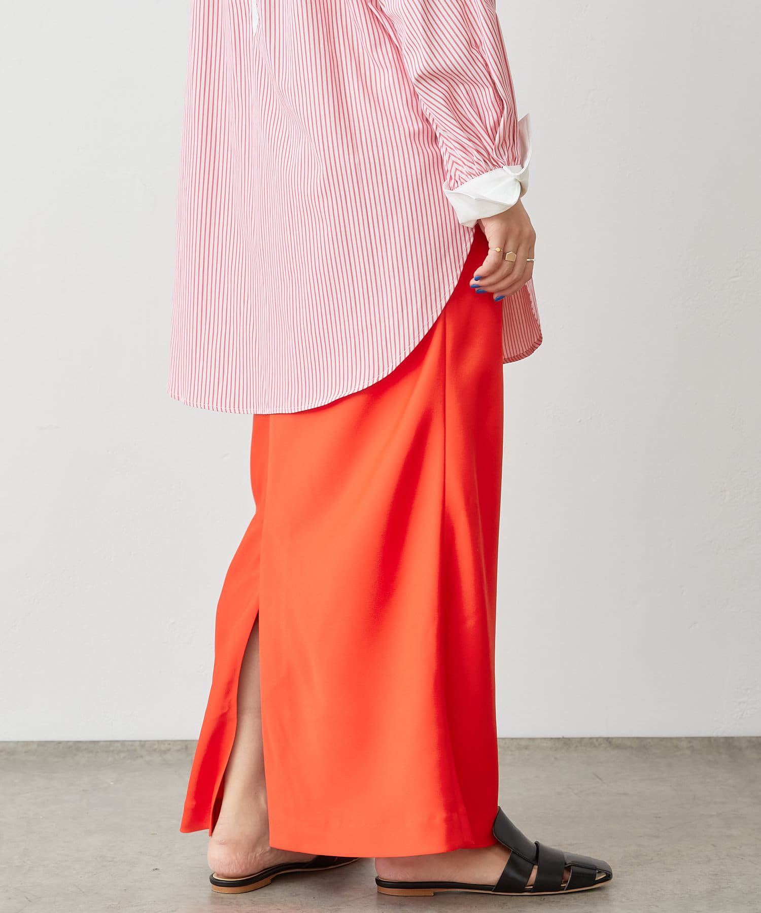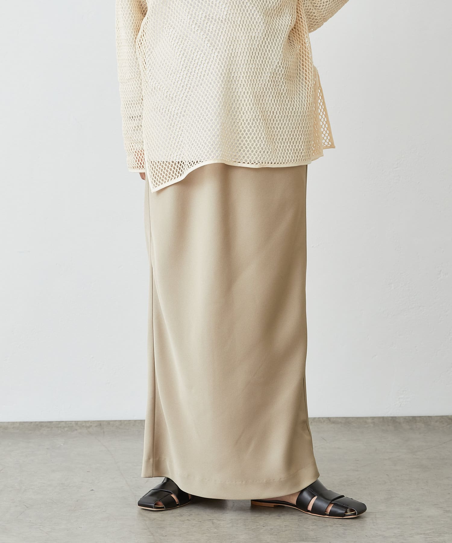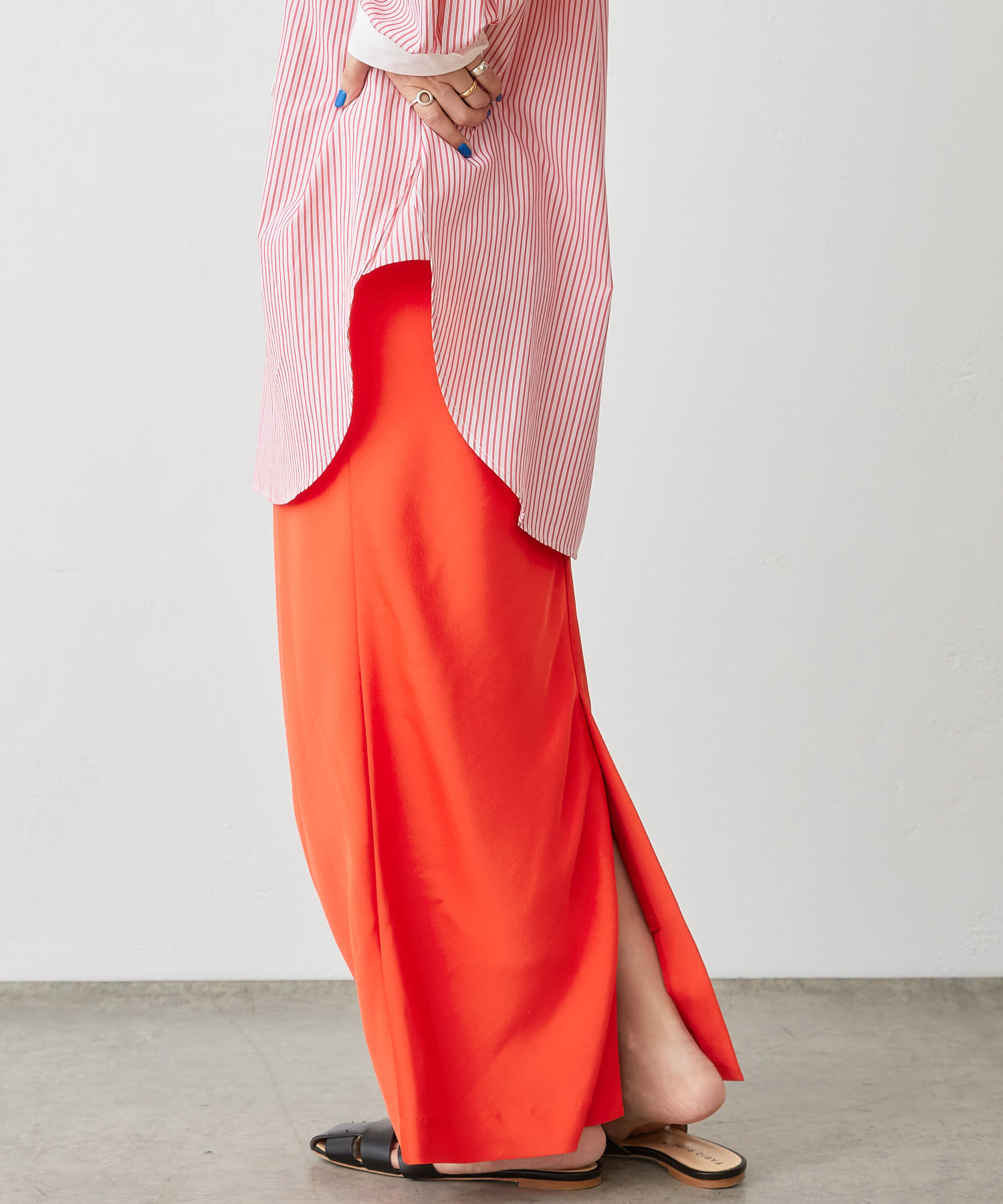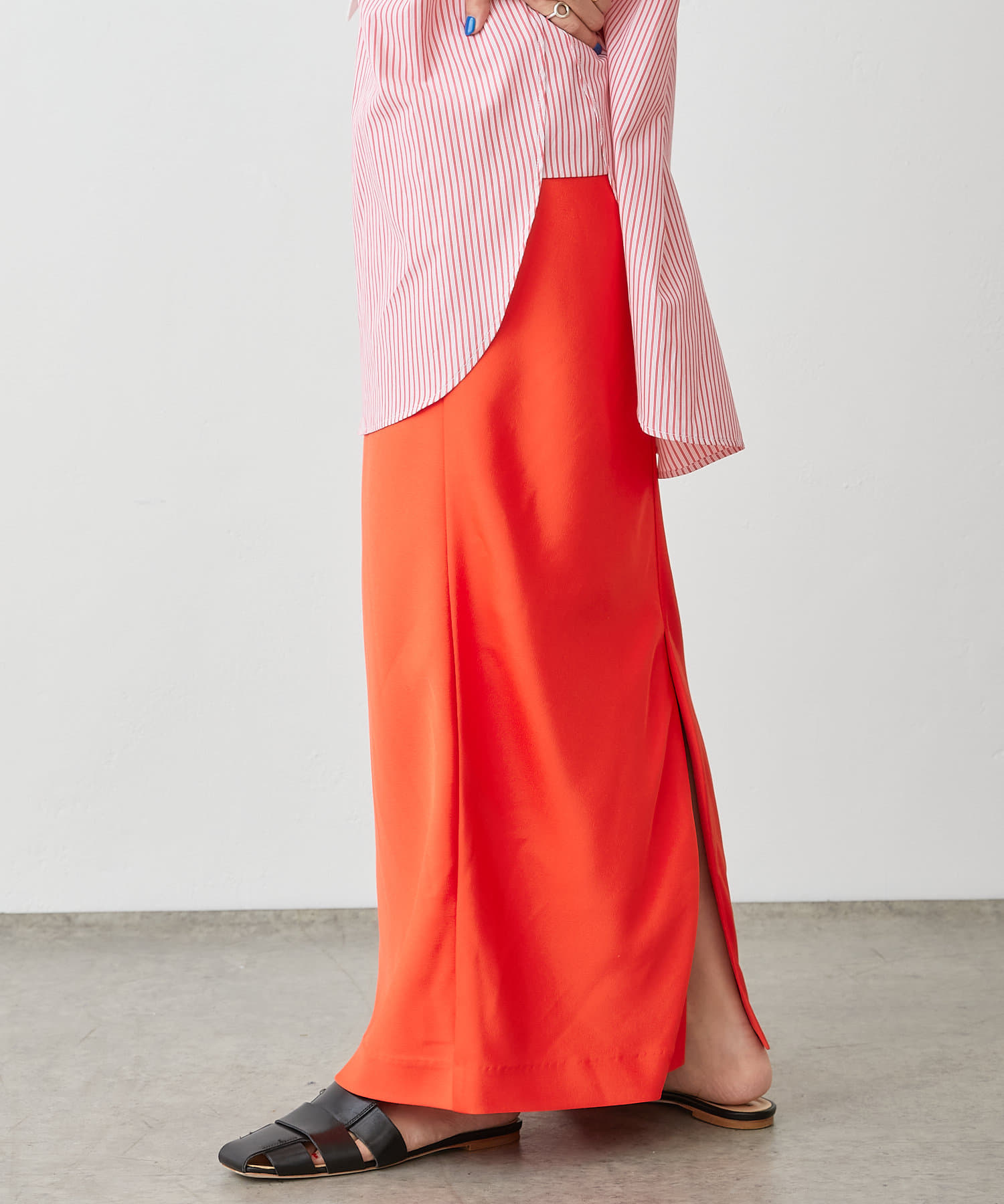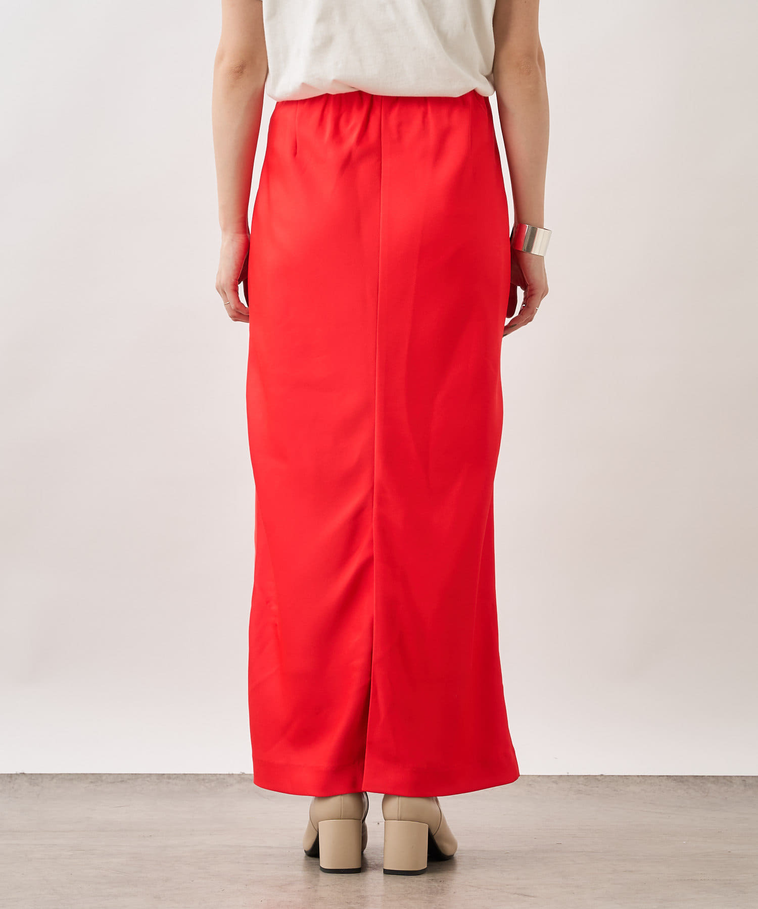 ・光沢感が上品で華やかなサテンスカート、揺れ動くたびに優美で女性らしいシルエットを演出してくれます。