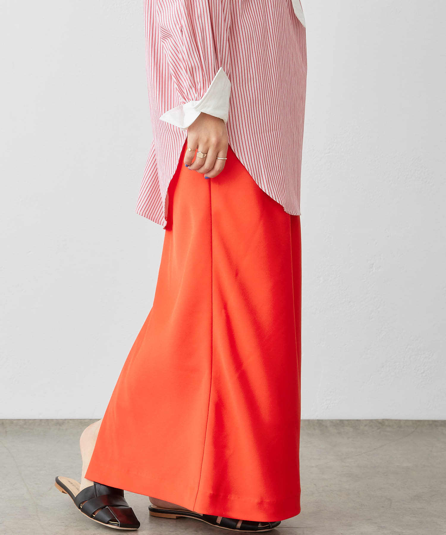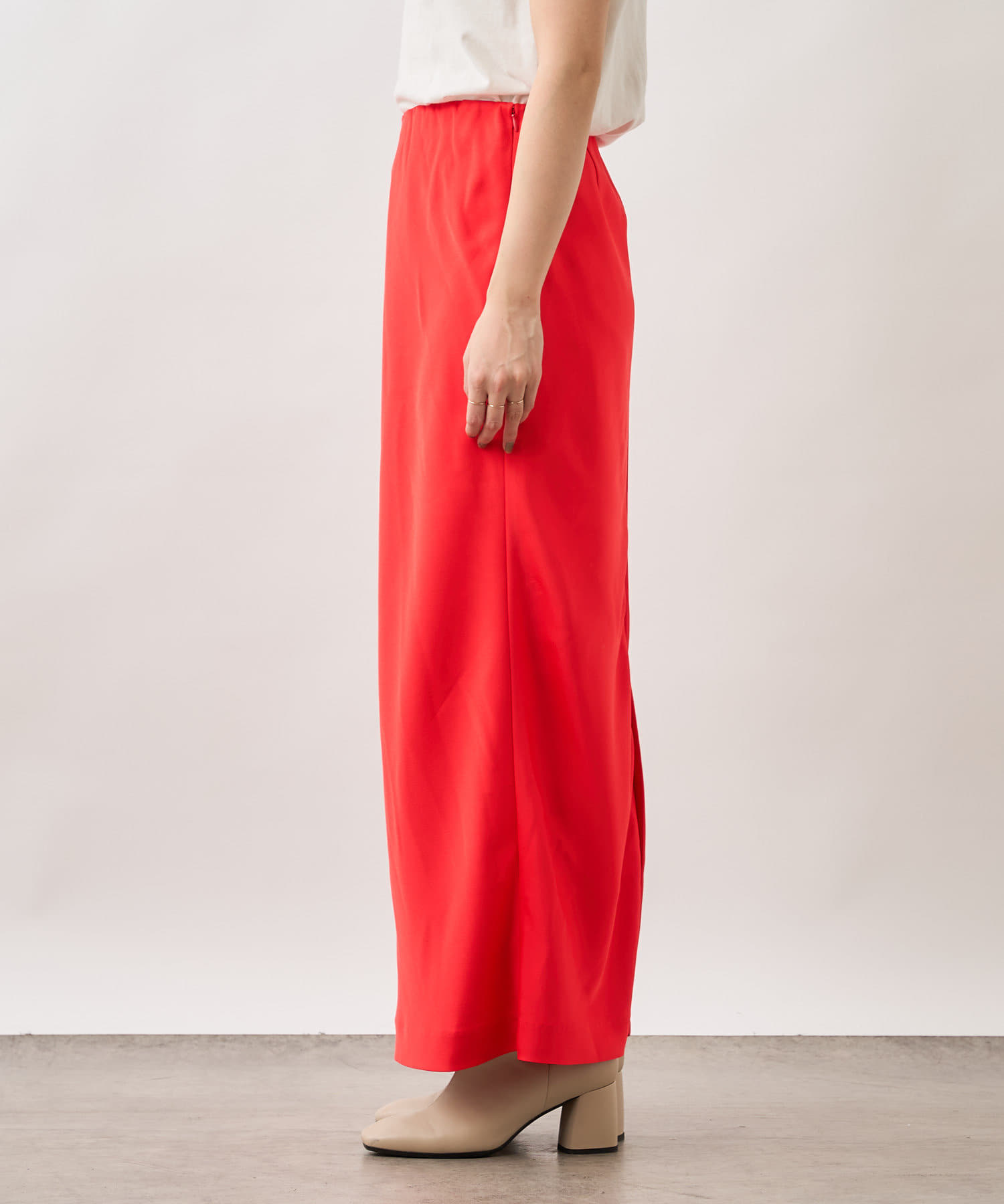 ・着回しが効く定番カラーのベージュ、ブラックに加え、履くだけでコーディネートの主役になるレッドの三色展開です。