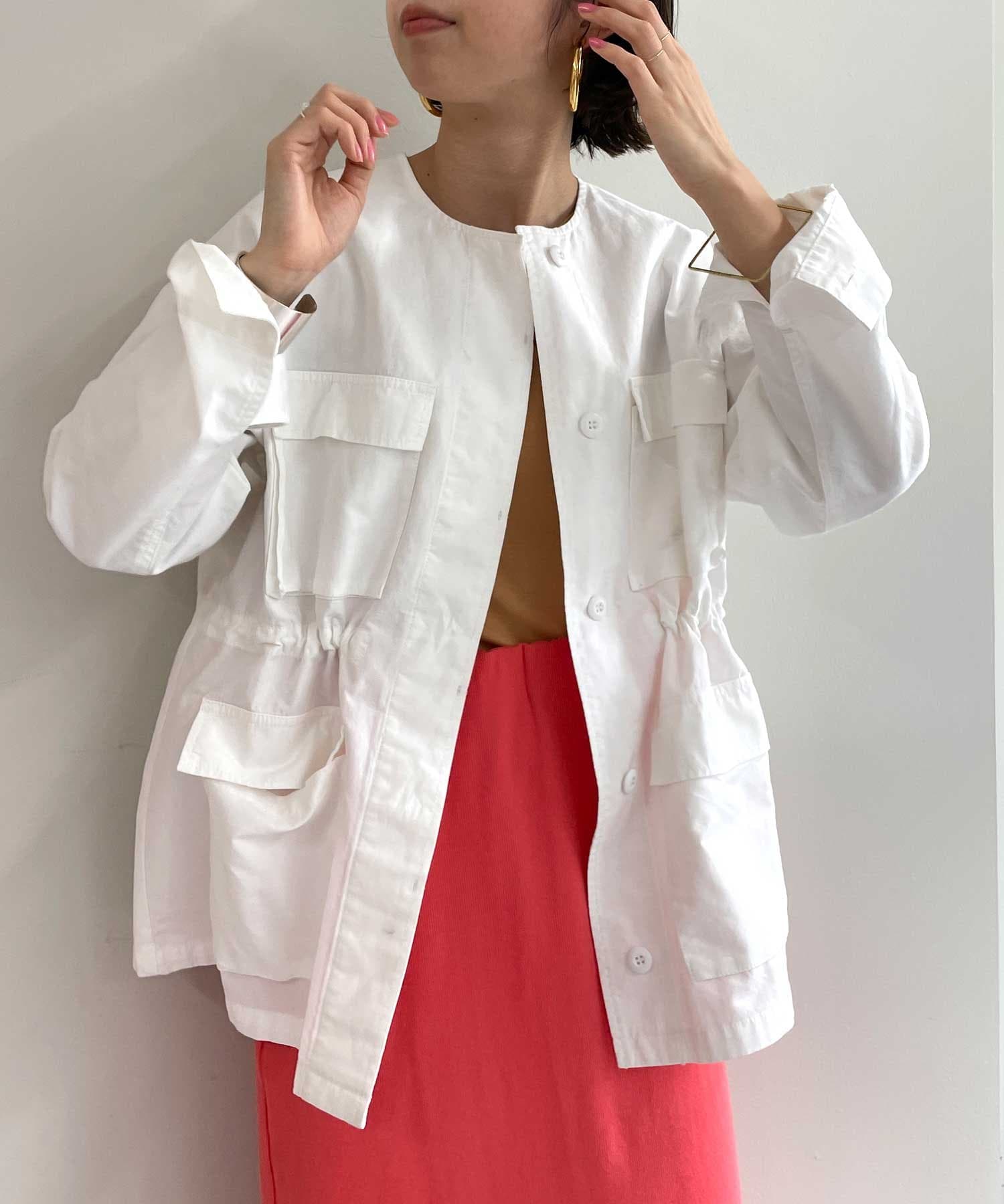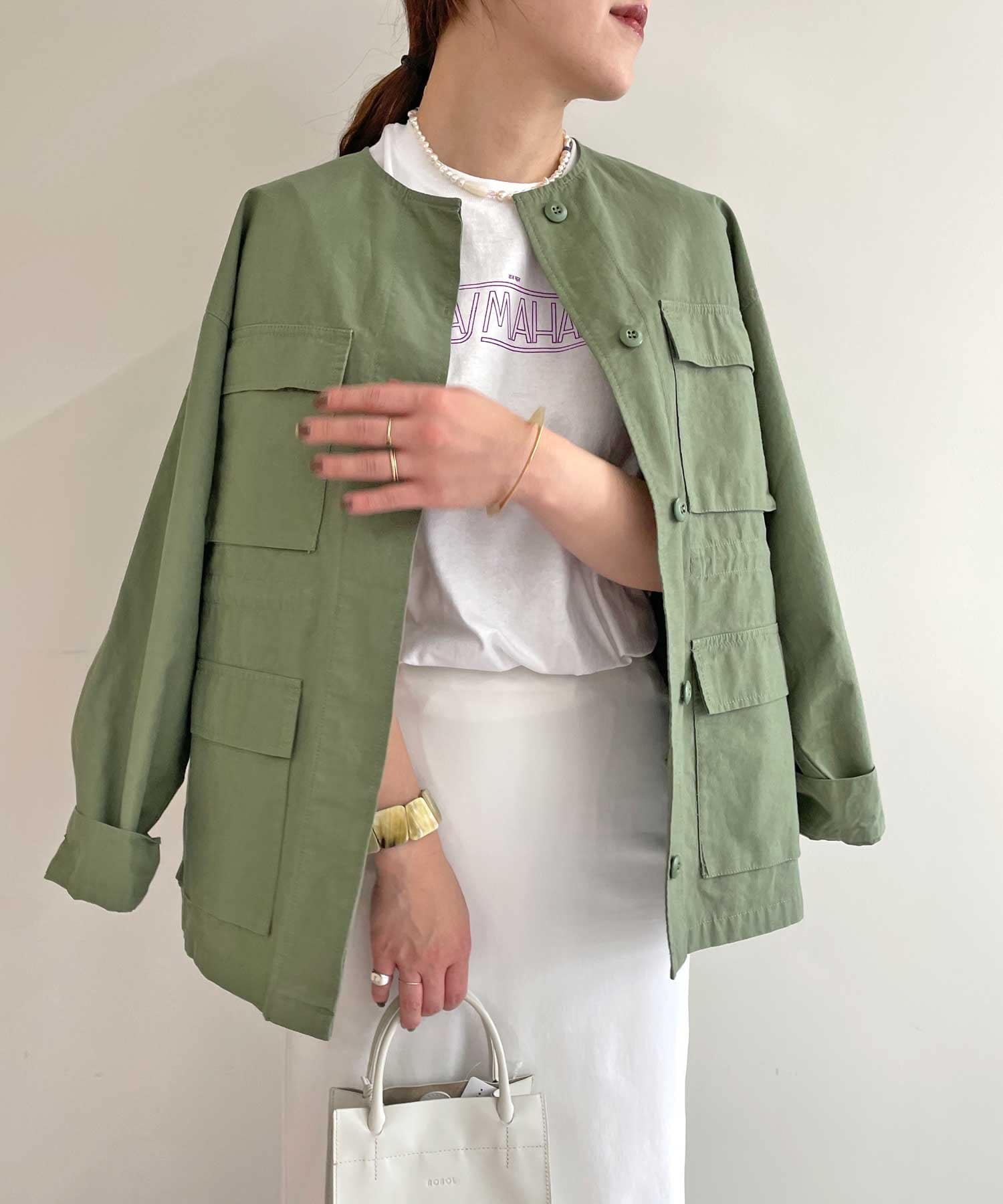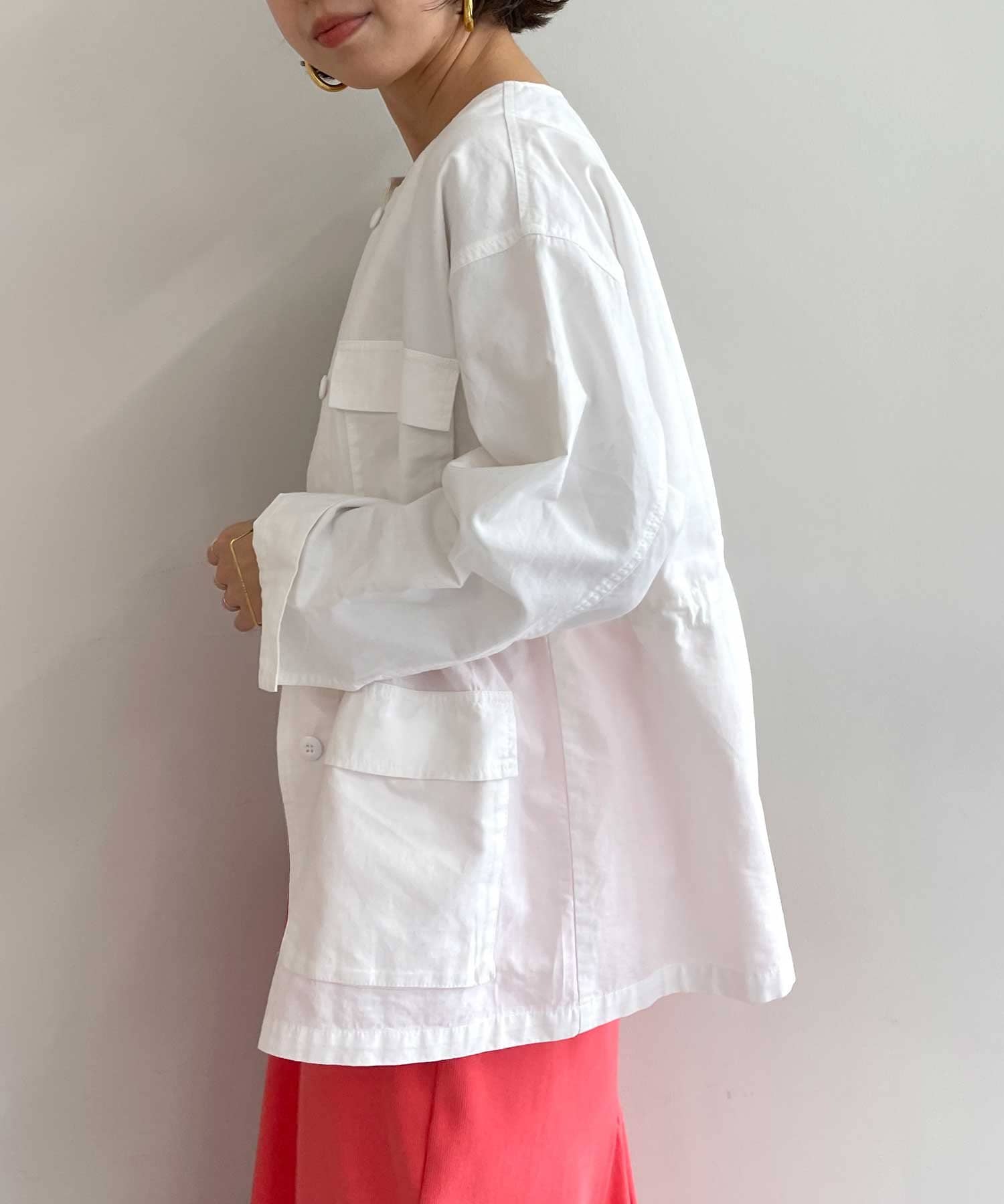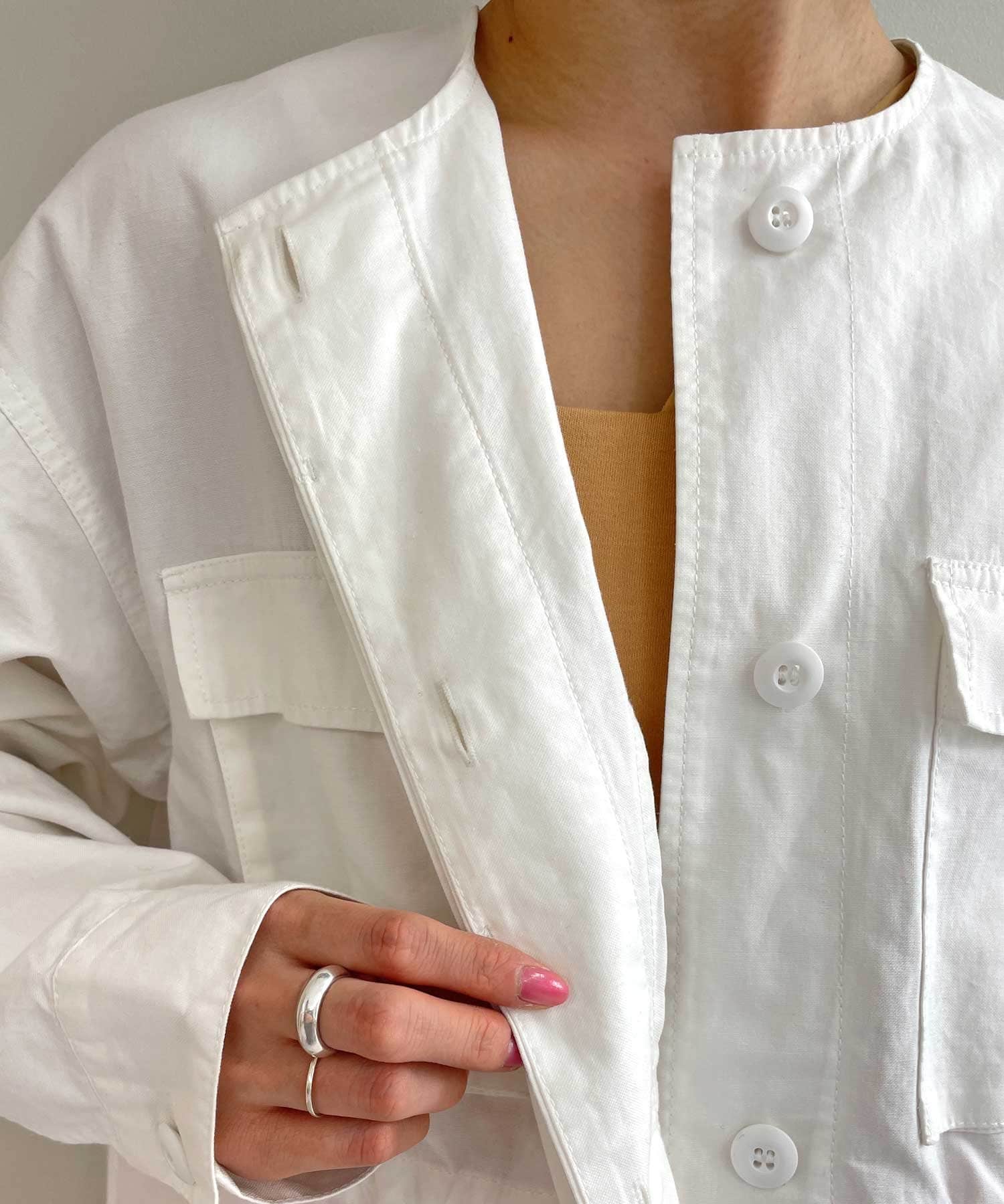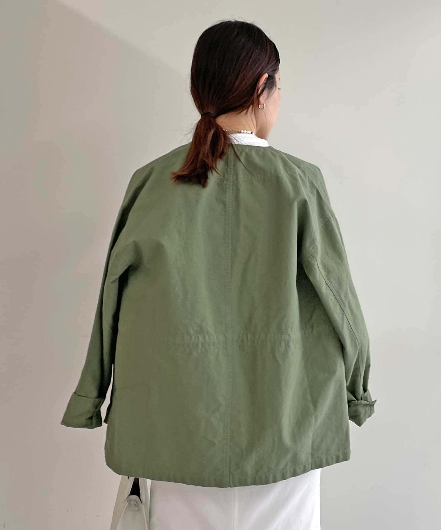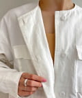・ノーカラーのジャケットは、首周りがすっきりしていて付け襟やアクセサリーが映えるデザインです。