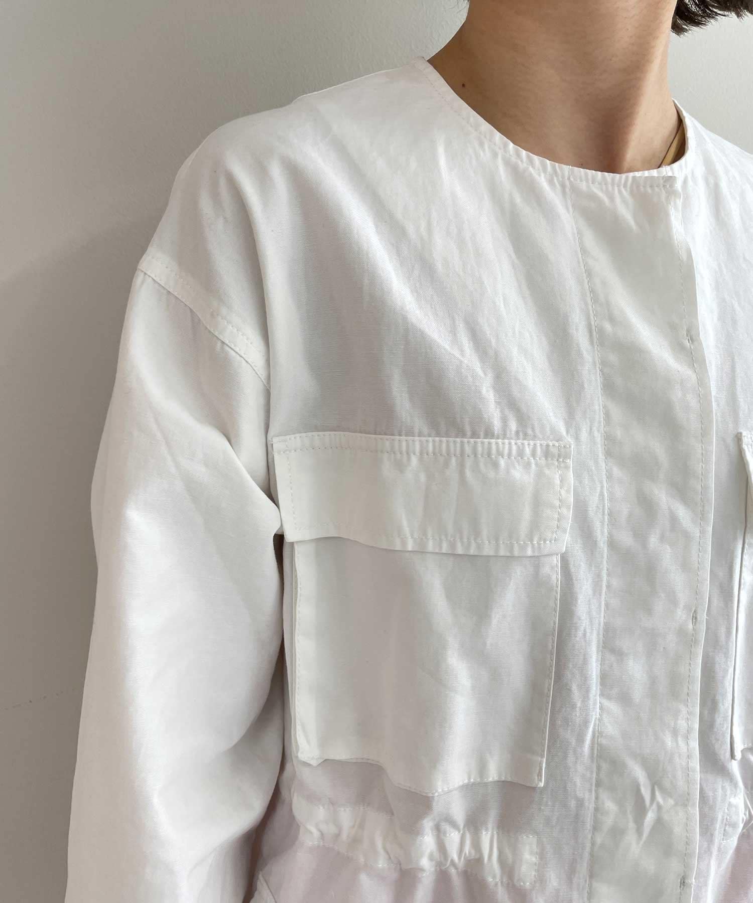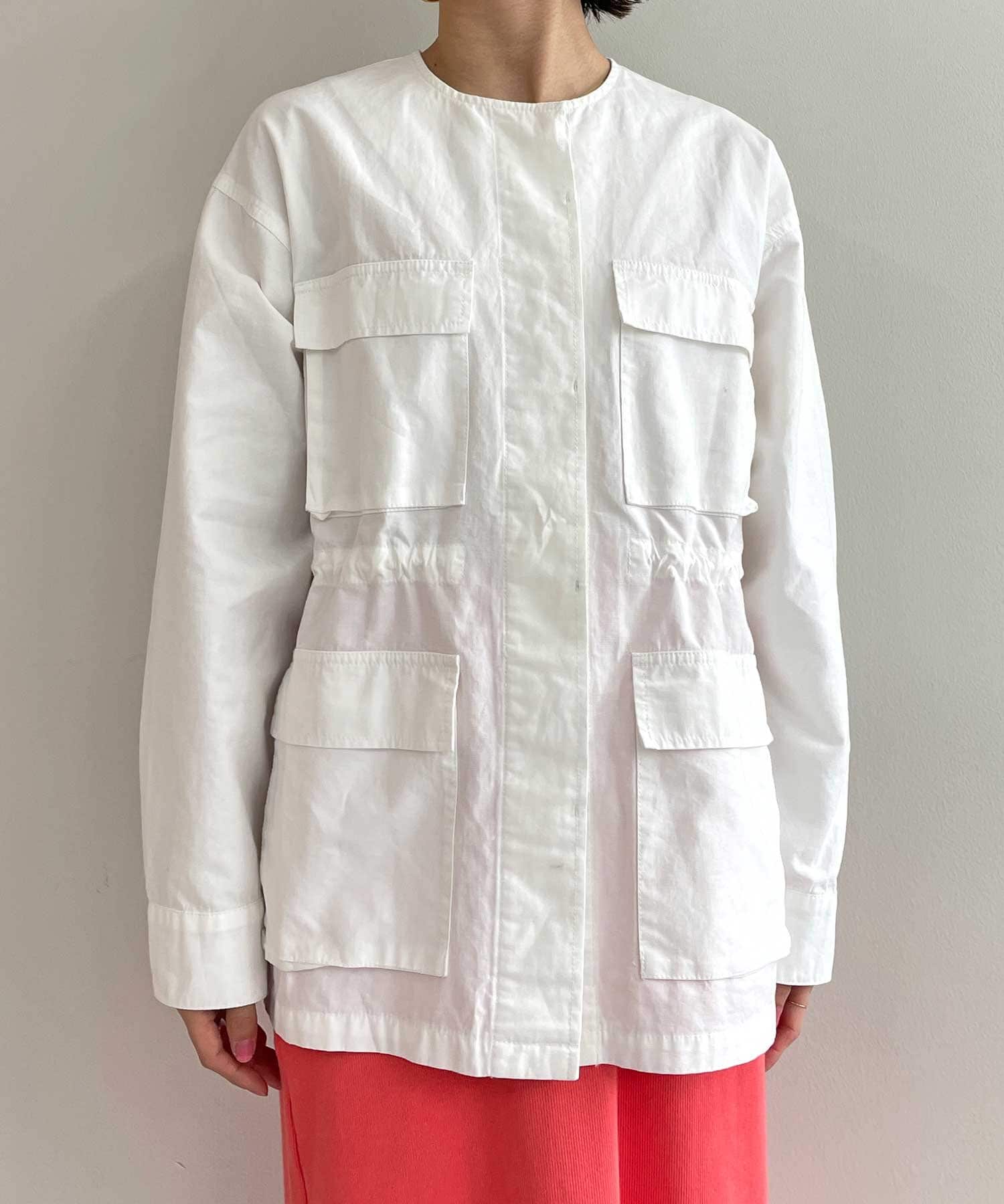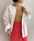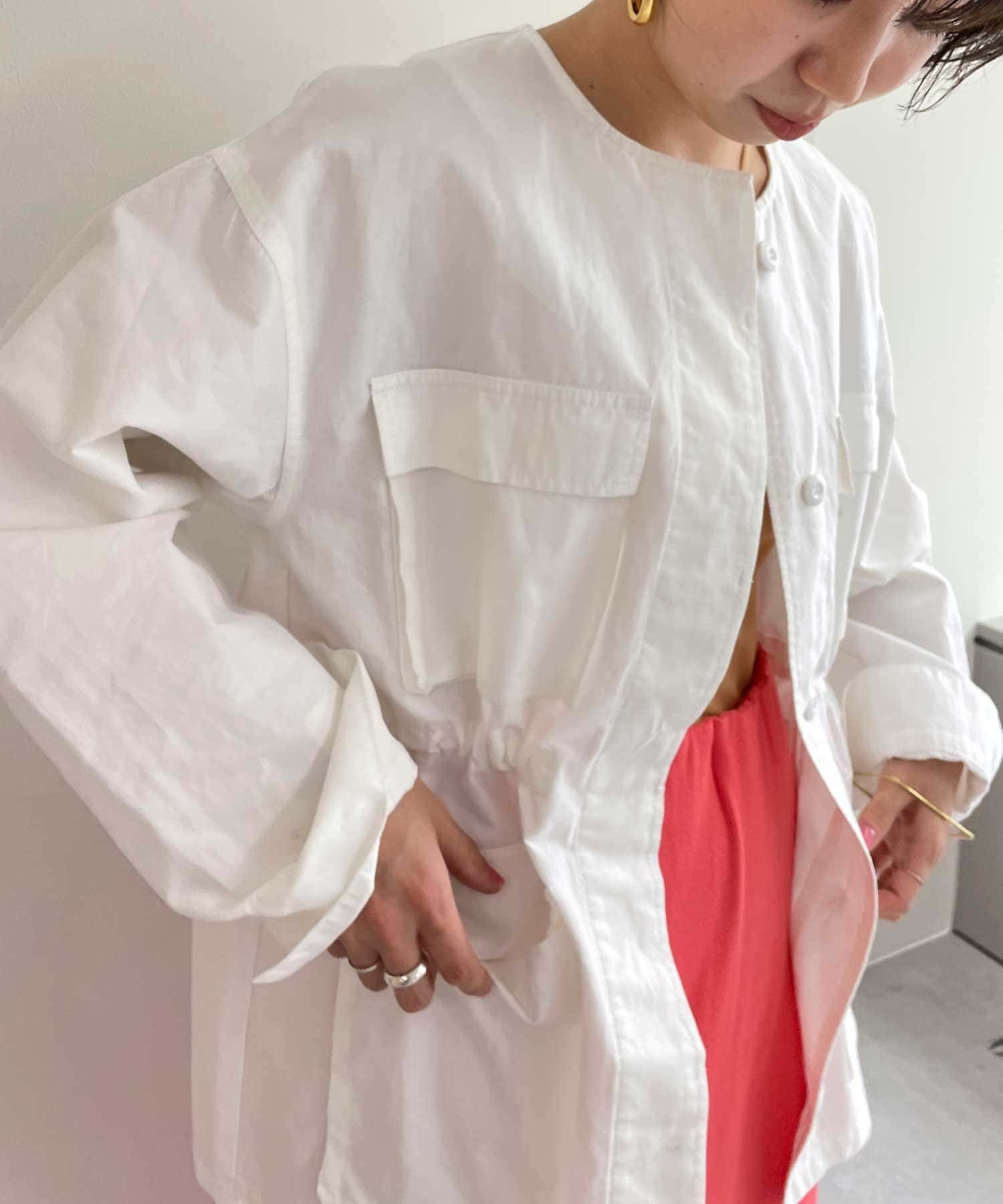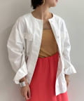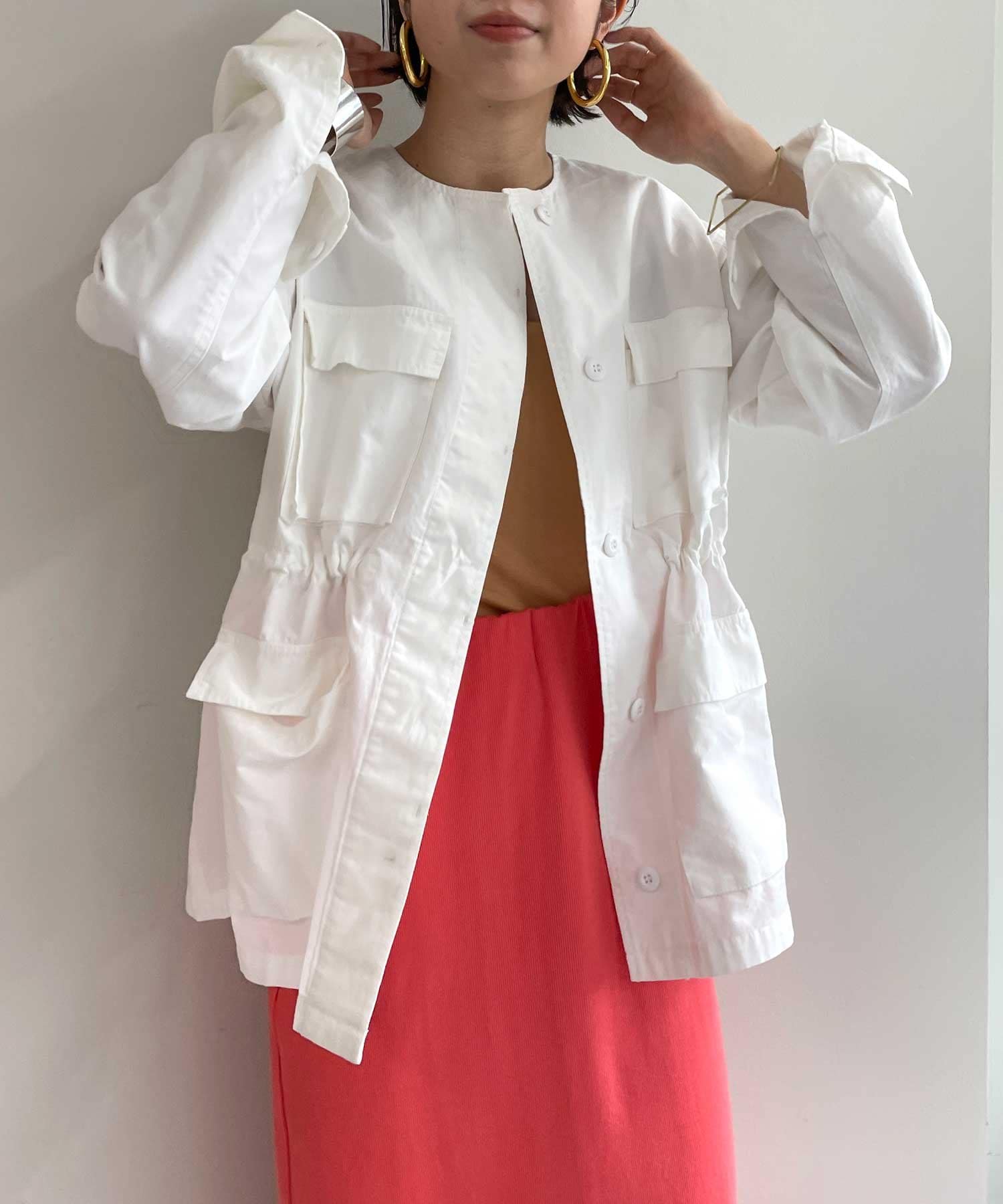 ・ノーカラーのジャケットは、首周りがすっきりしていて付け襟やアクセサリーが映えるデザインです。