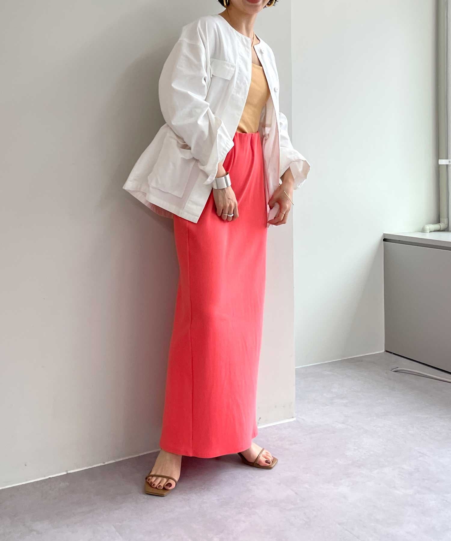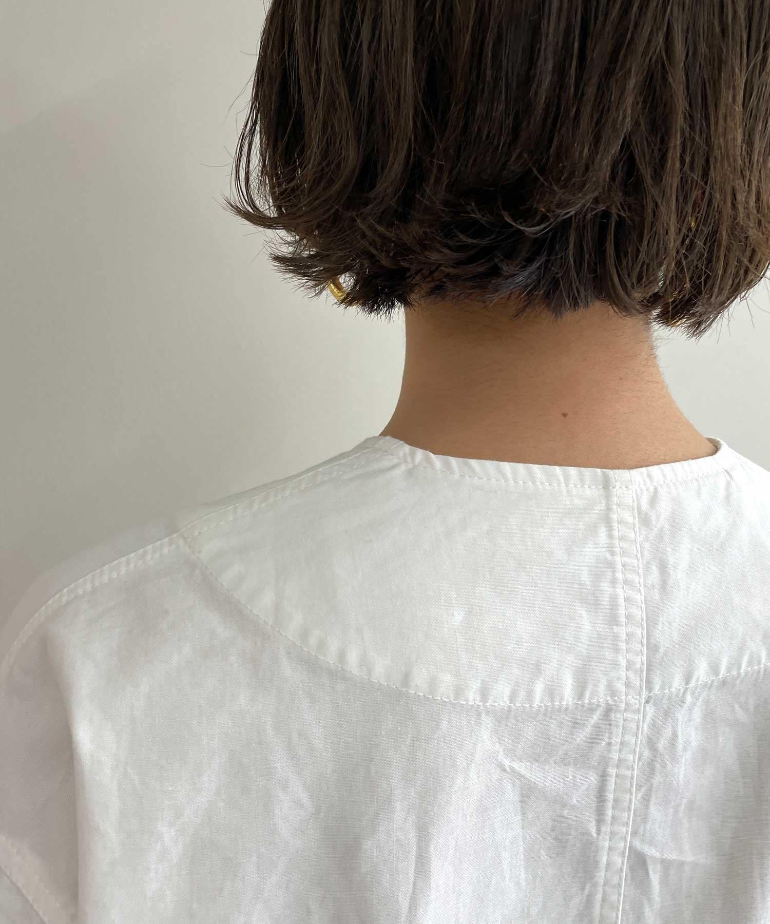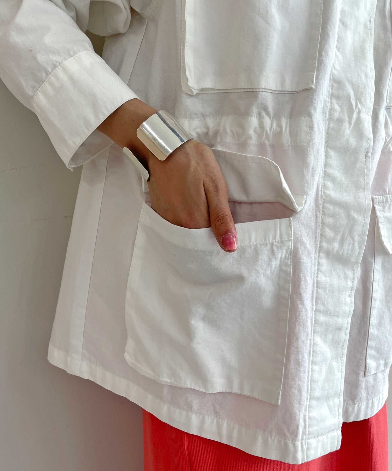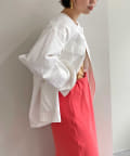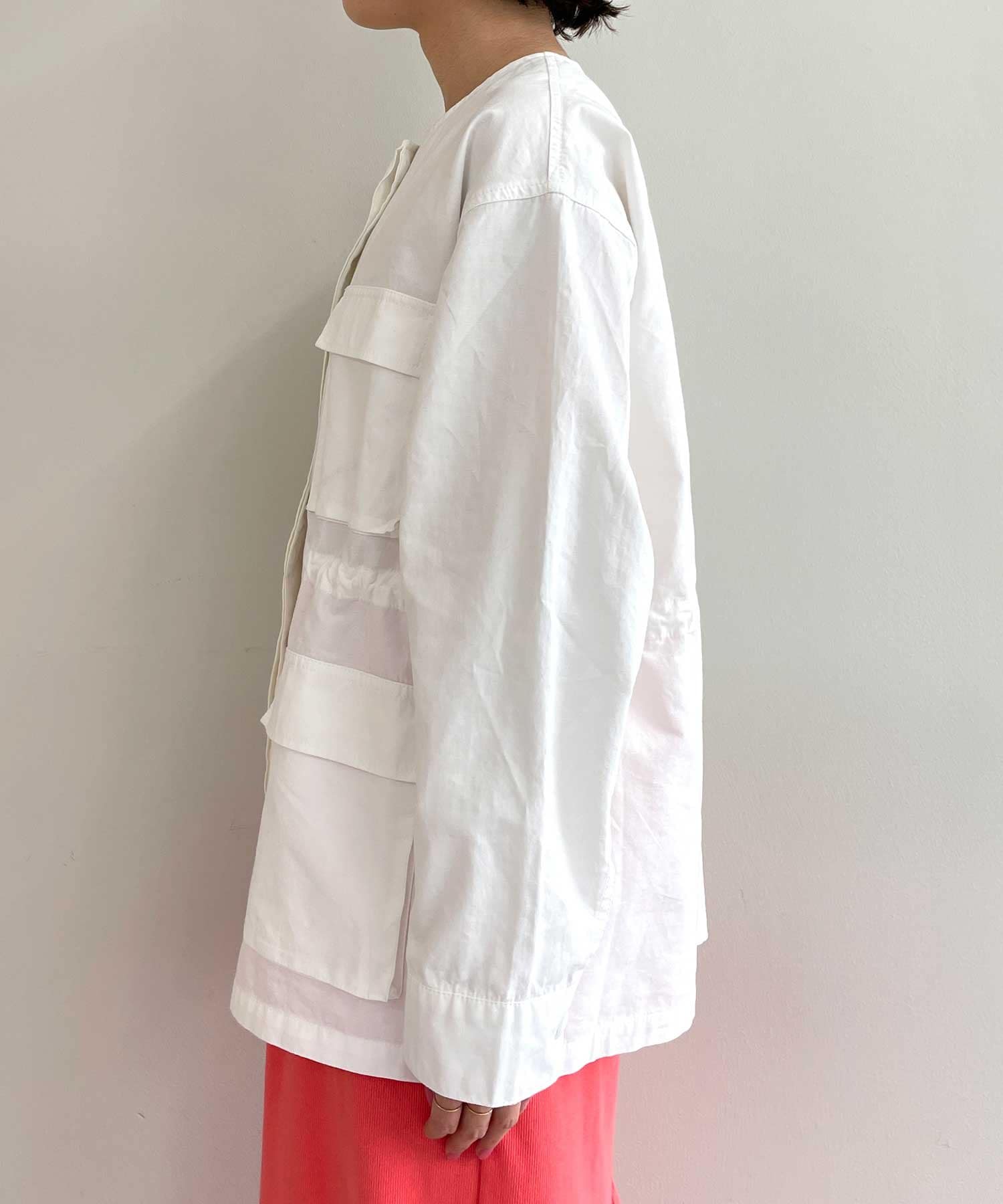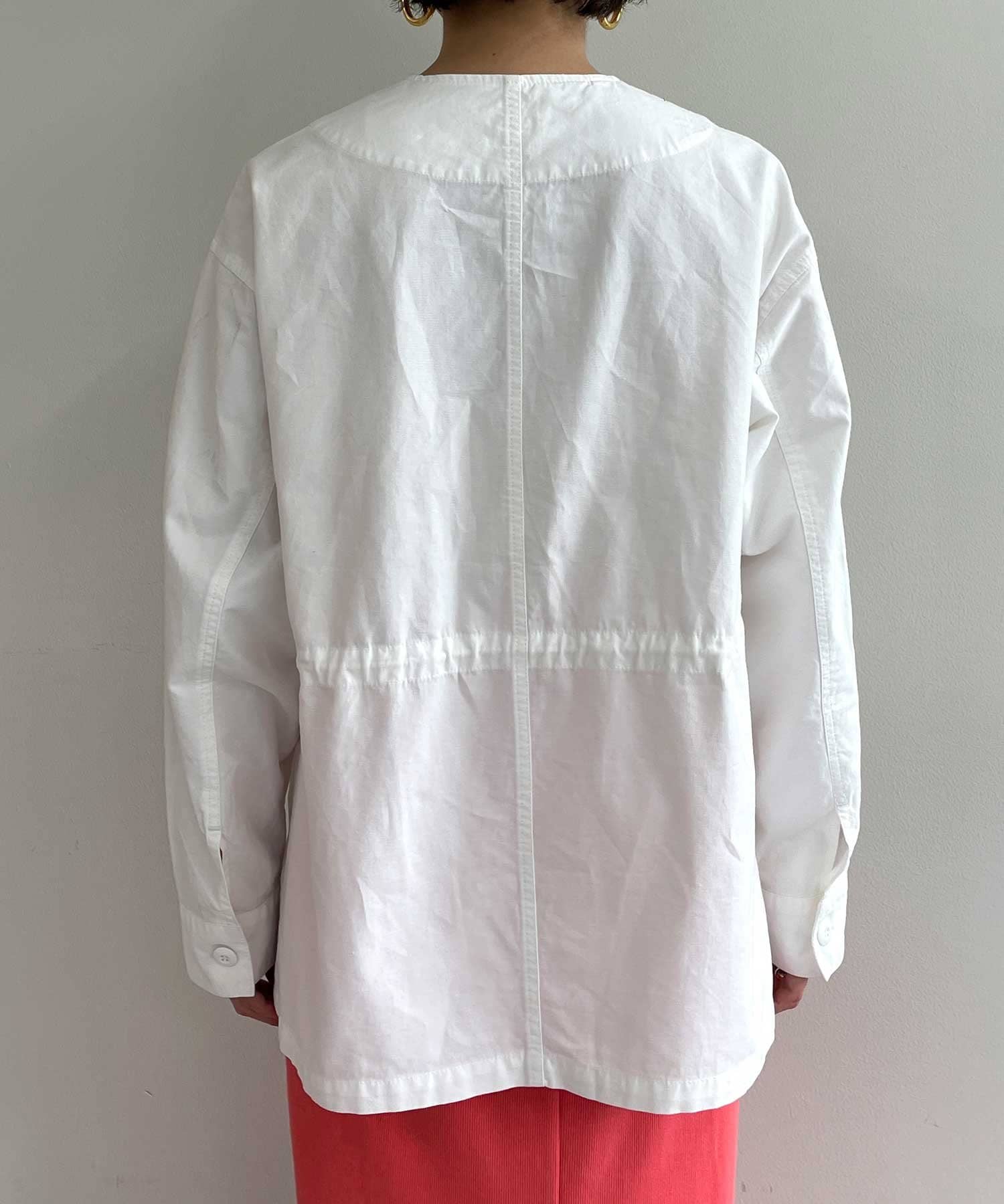・ノーカラーのジャケットは、首周りがすっきりしていて付け襟やアクセサリーが映えるデザインです。