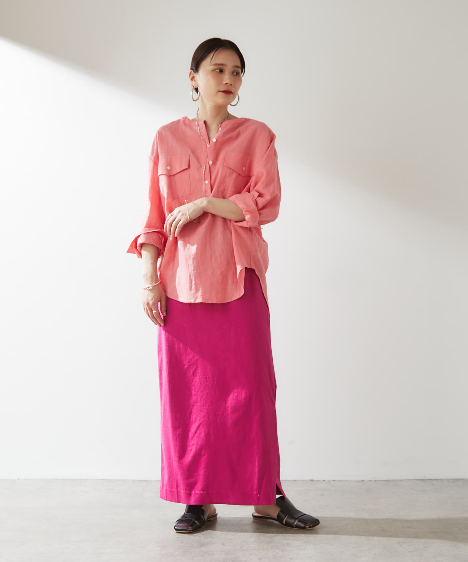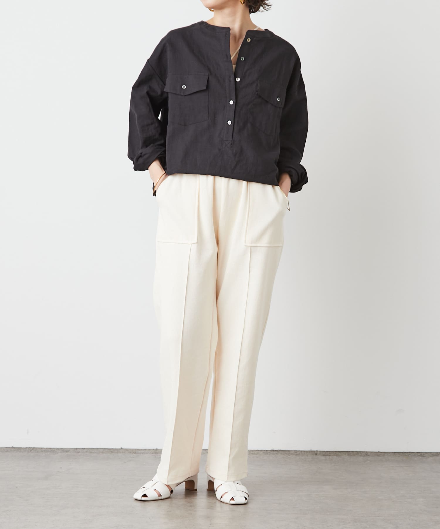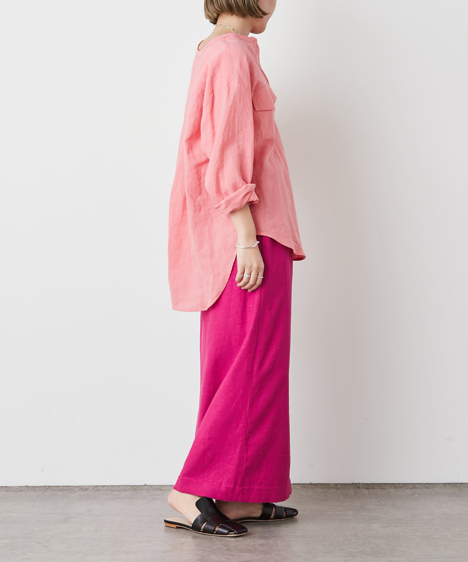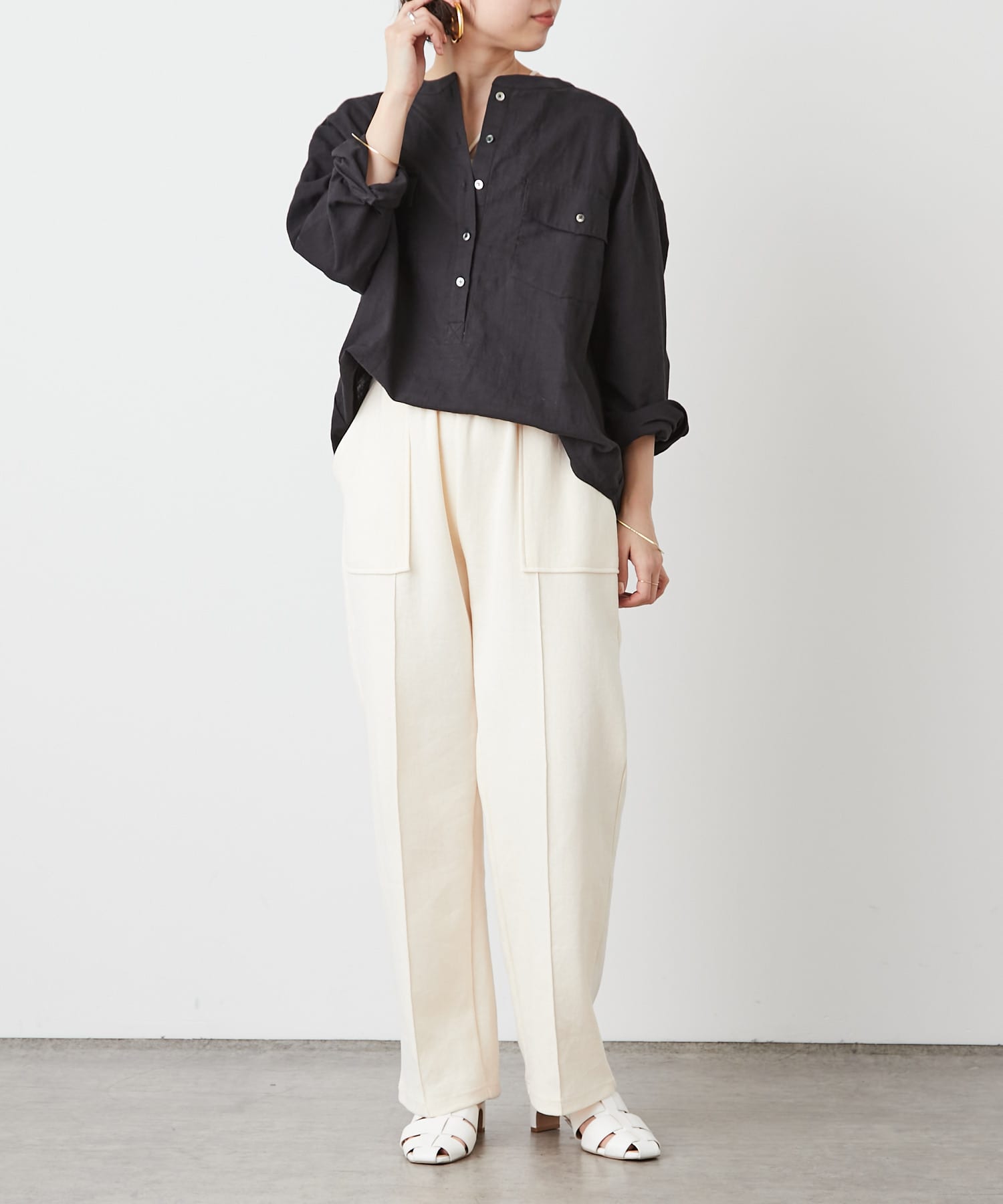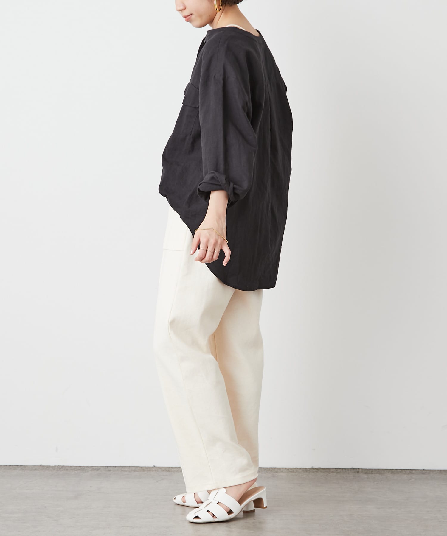 ・リネン素材でリラックス感がありつつ、カジュアルからキレイめまでコーディネートは幅広く楽しめるアイテム。