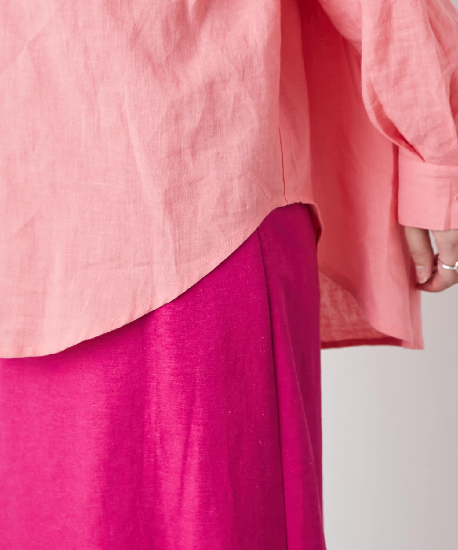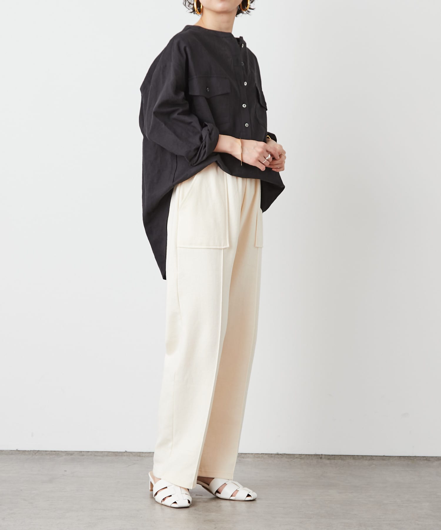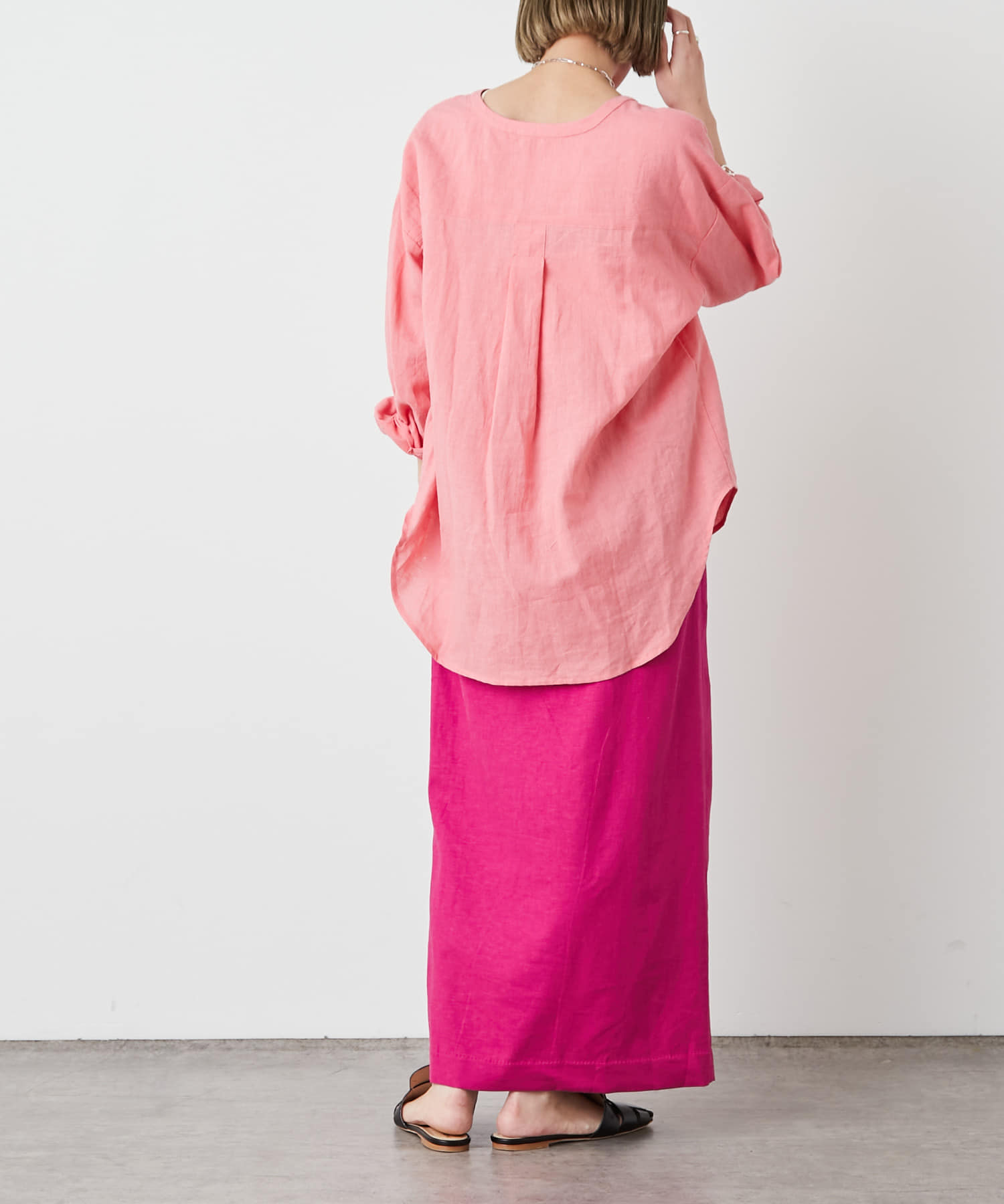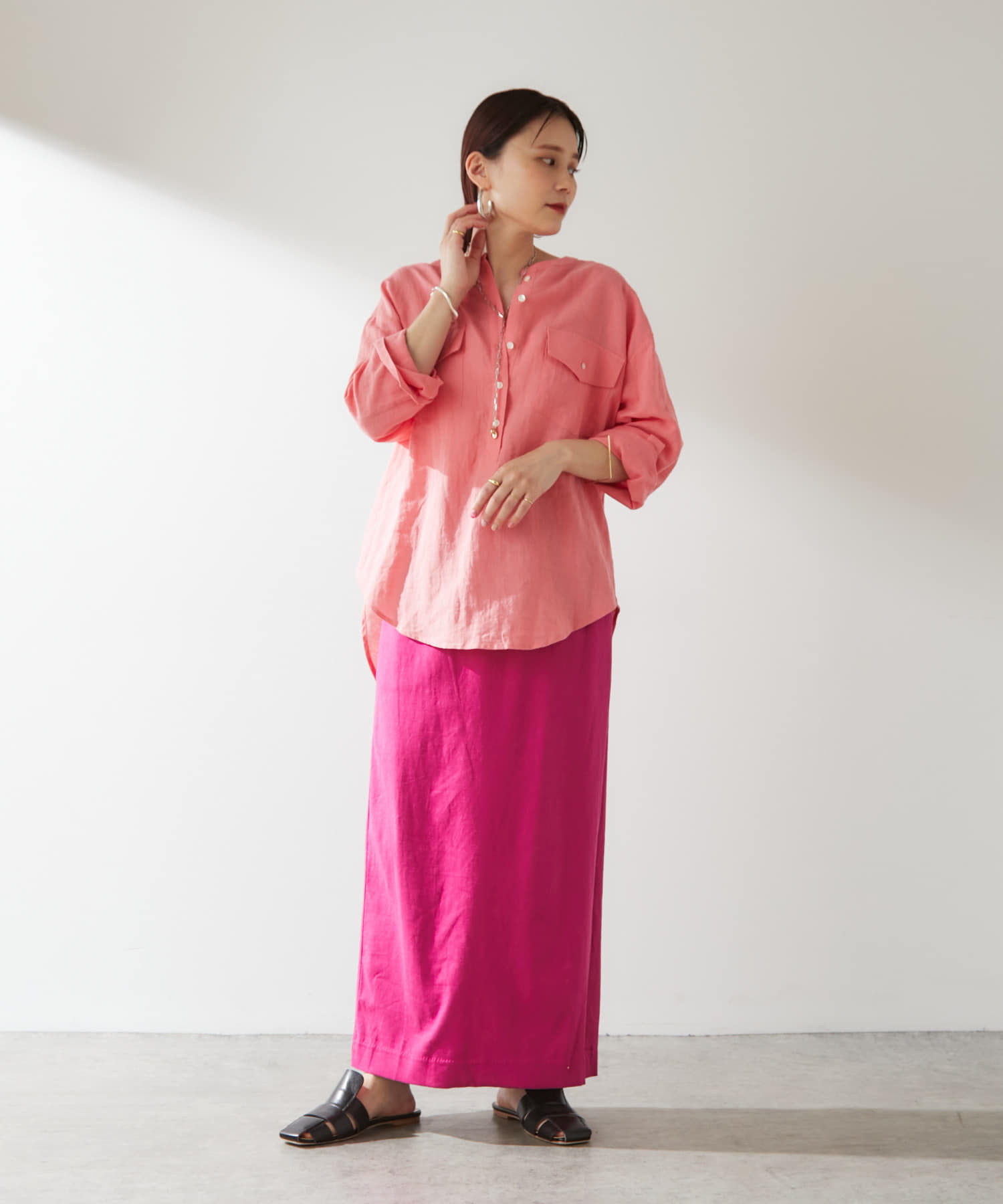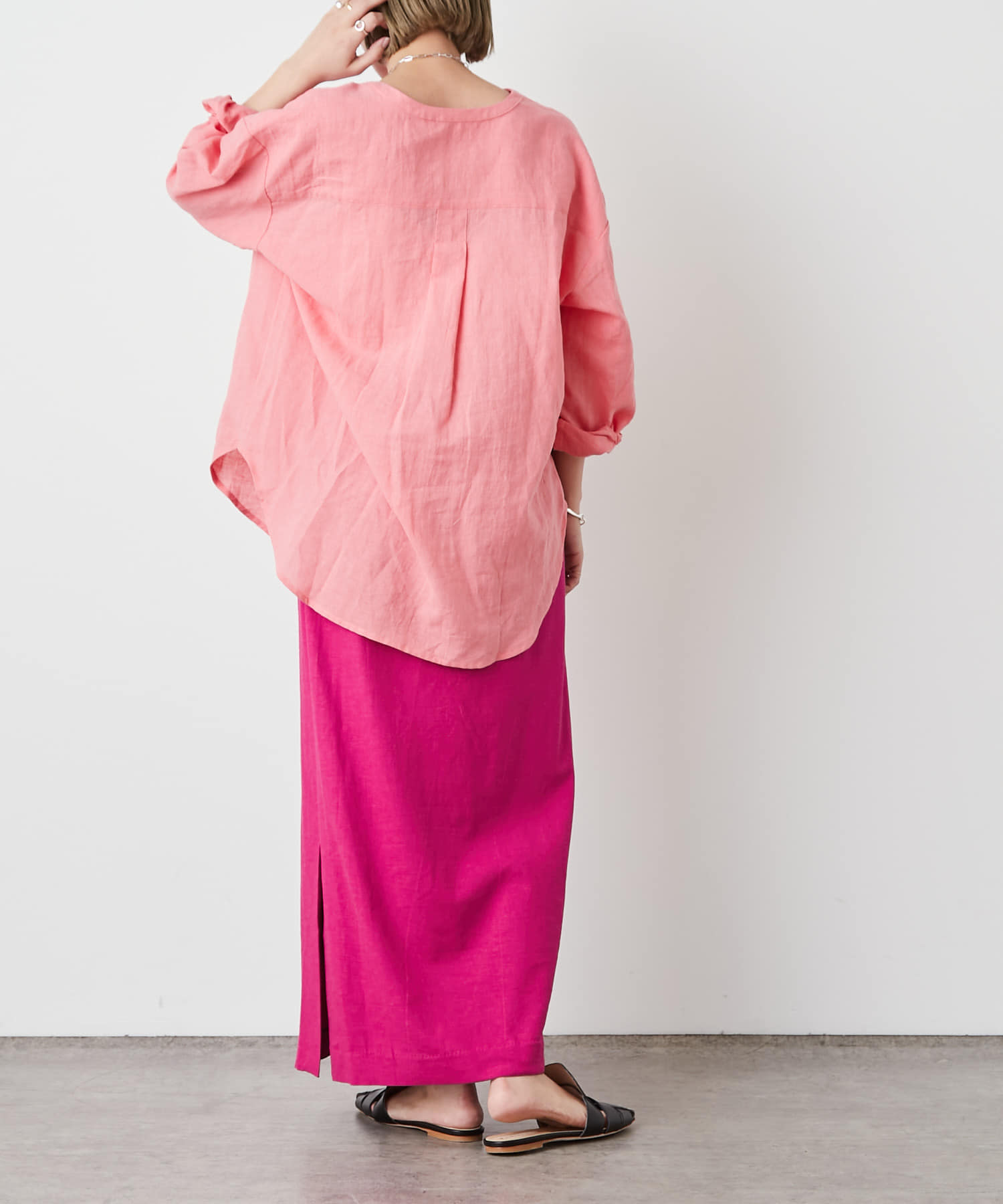 ・リネン素材でリラックス感がありつつ、カジュアルからキレイめまでコーディネートは幅広く楽しめるアイテム。