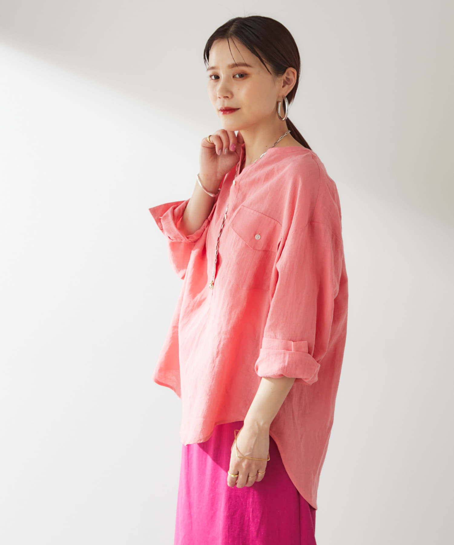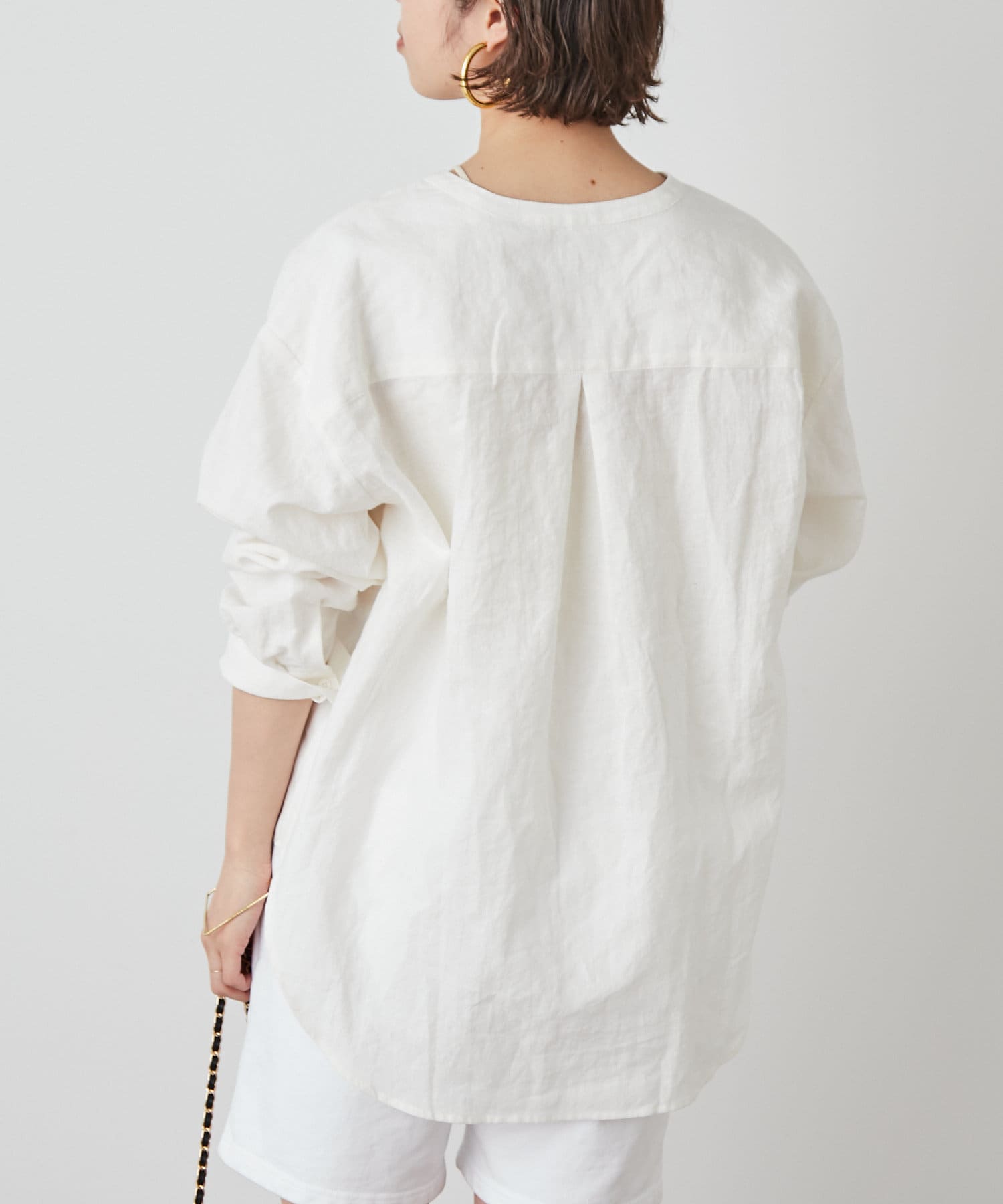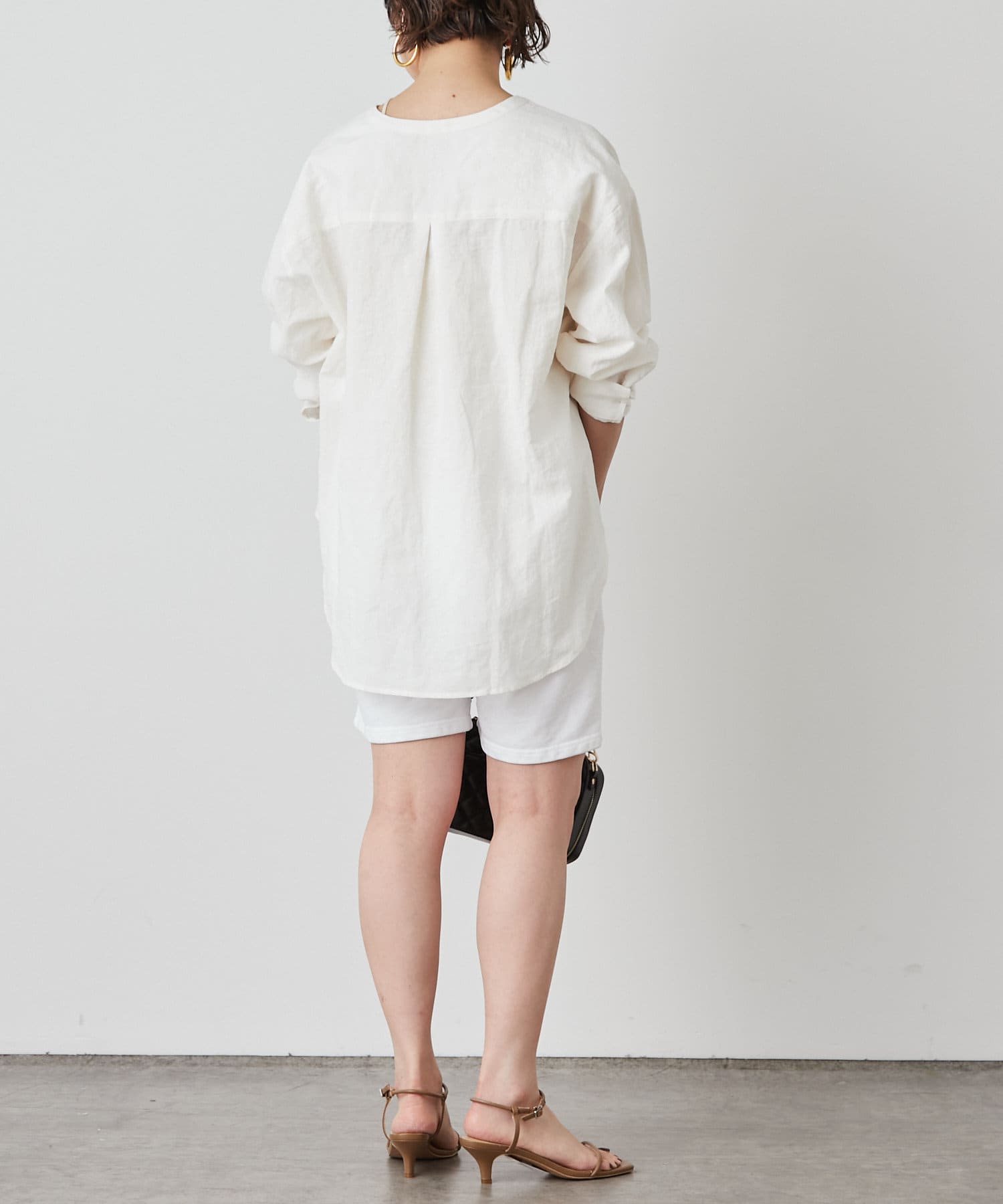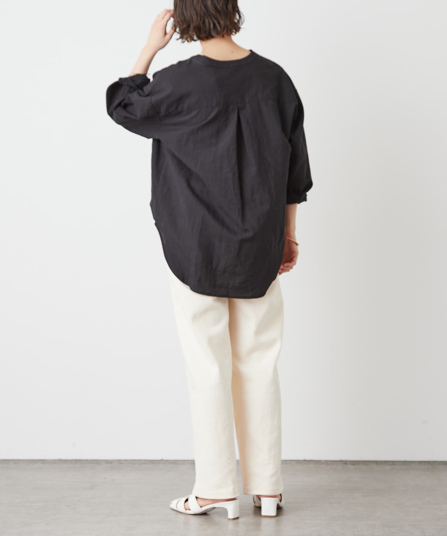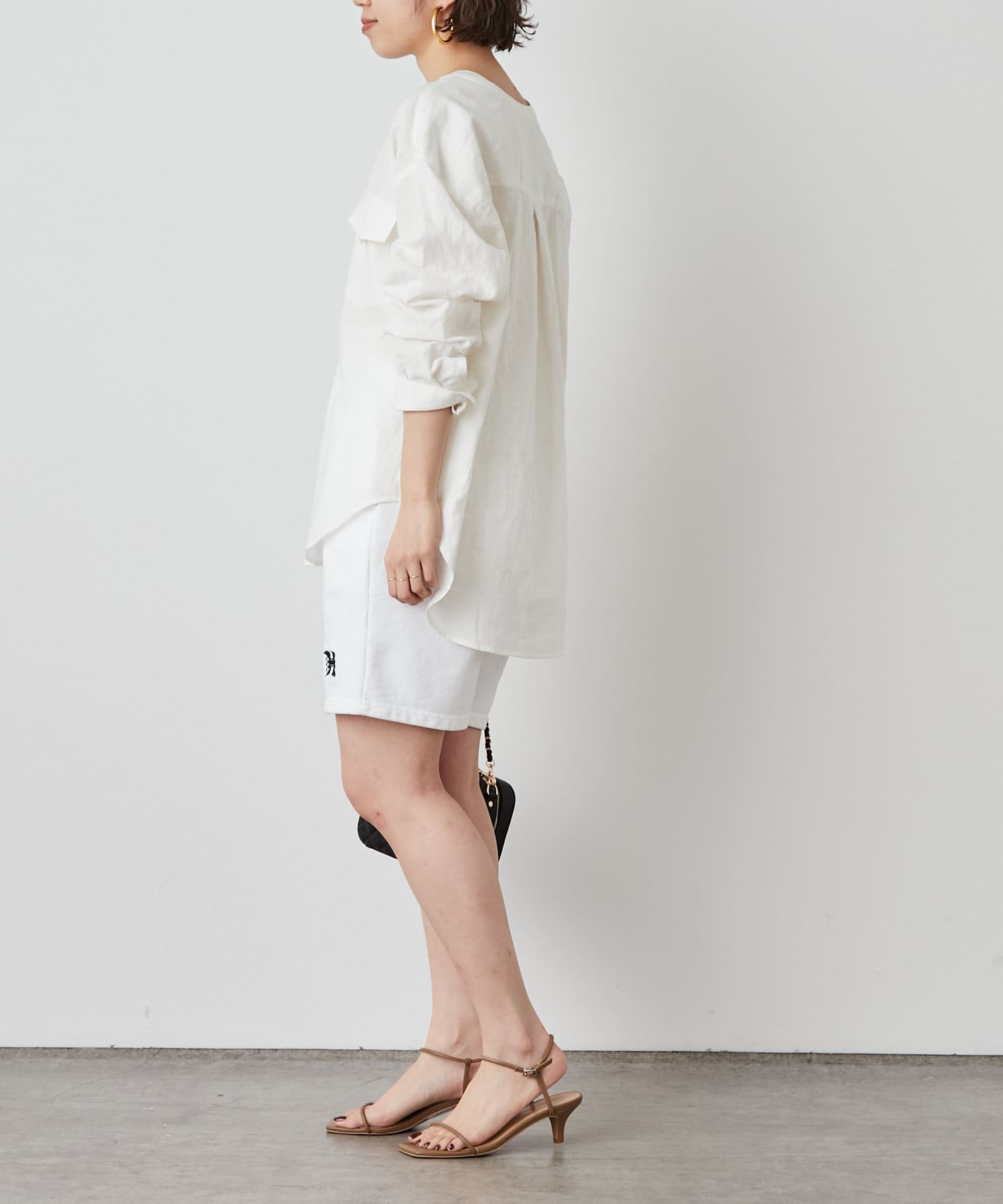 ・リネン素材でリラックス感がありつつ、カジュアルからキレイめまでコーディネートは幅広く楽しめるアイテム。