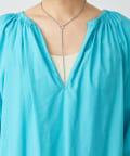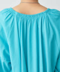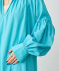 ・肩落ちのボリューム袖と女性らしい首元のシャーリングデザインがさりげなくポイントに。