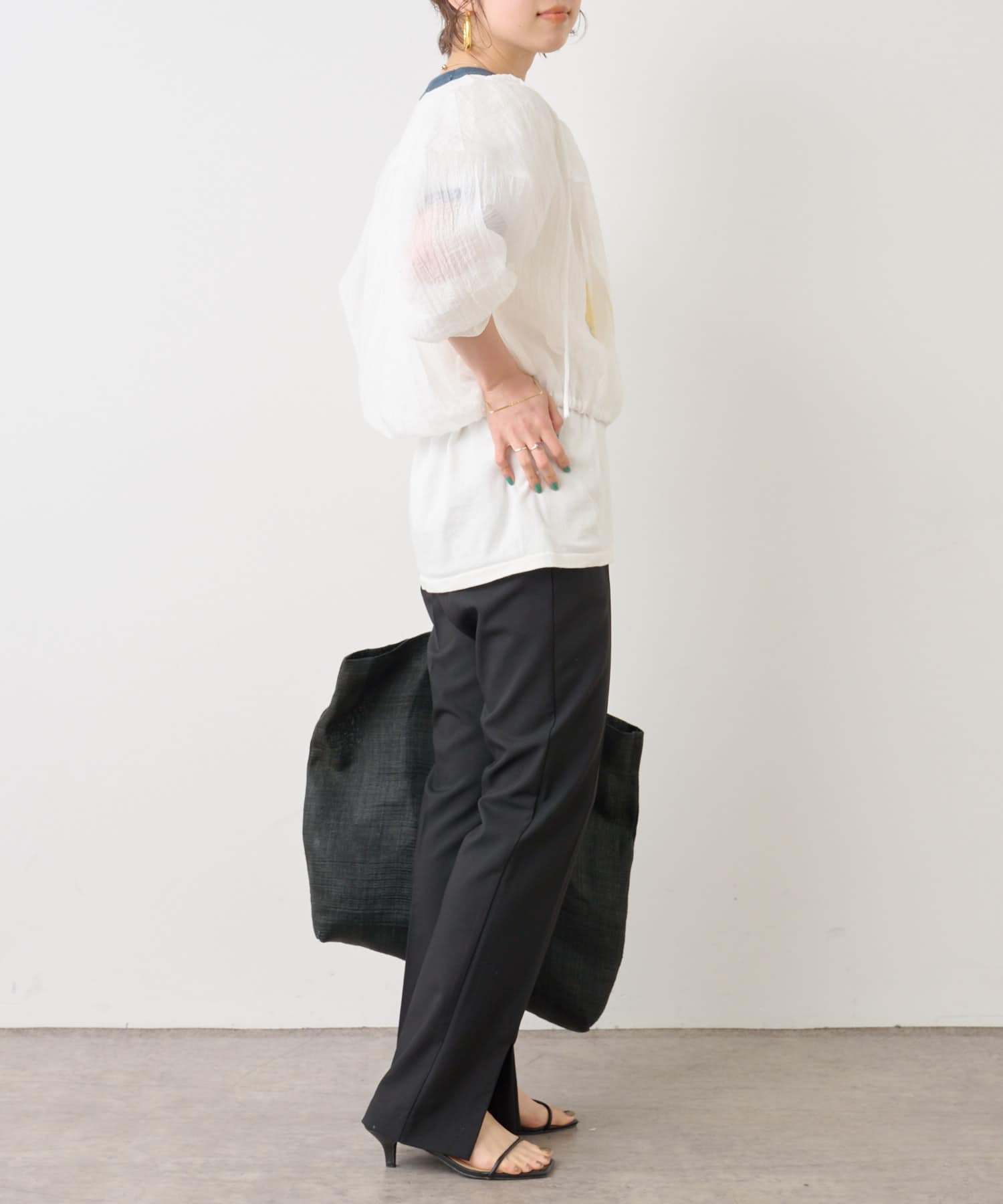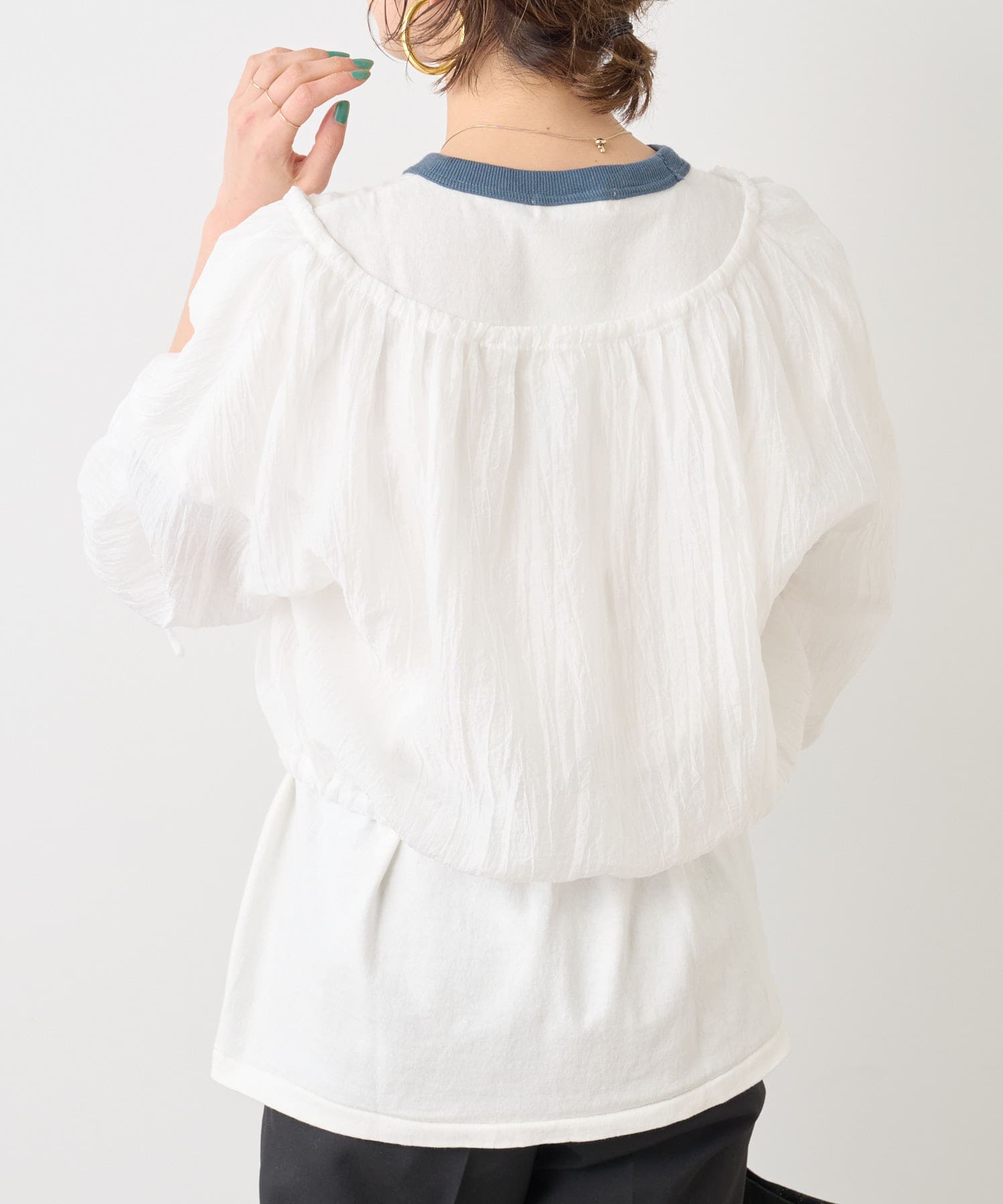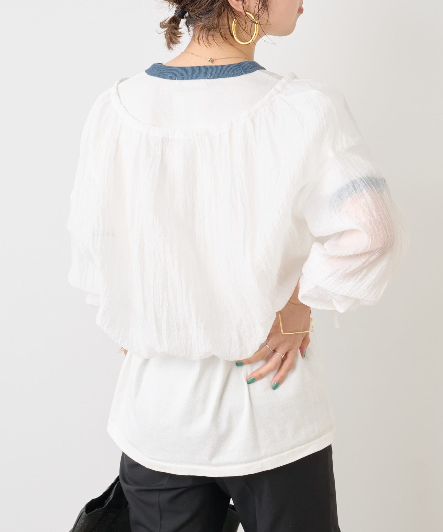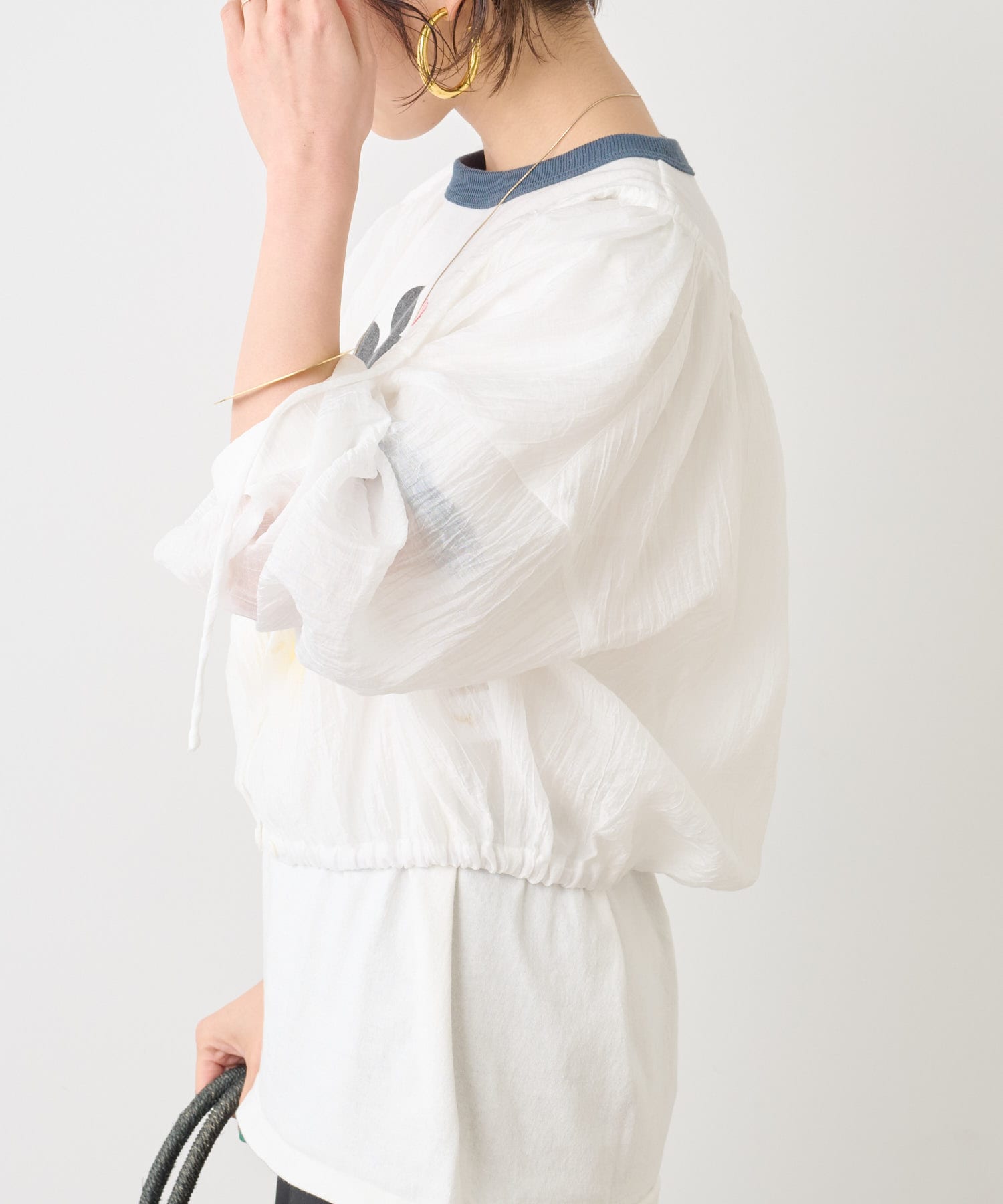 ・身幅はゆったりとしたサイズ感ながらシアー素材なので重くならず、裾にゴムが通っているのでボリューム感と丈を調整して着ていただけます。