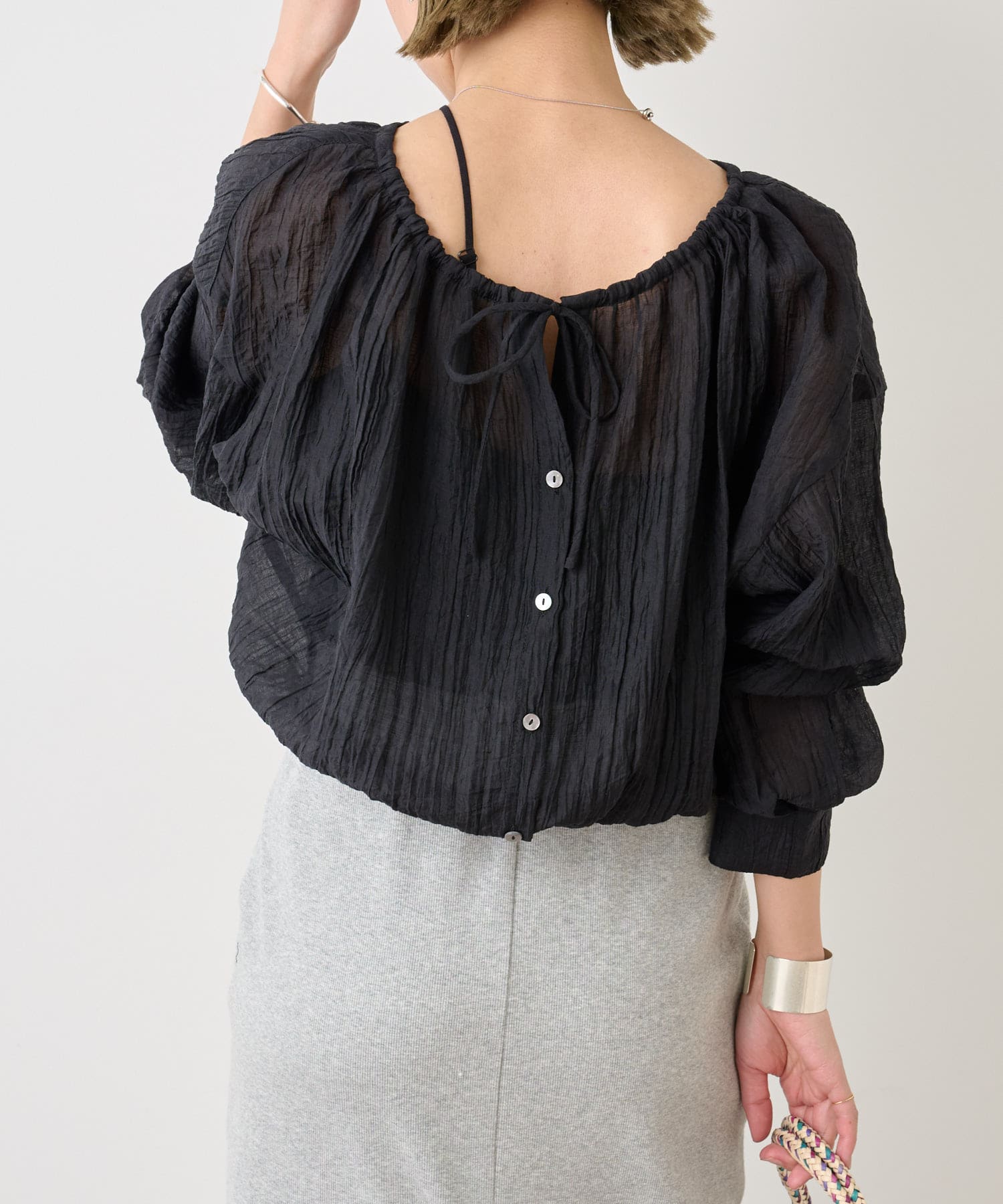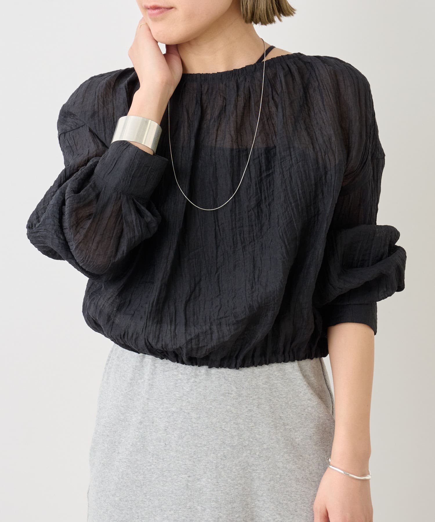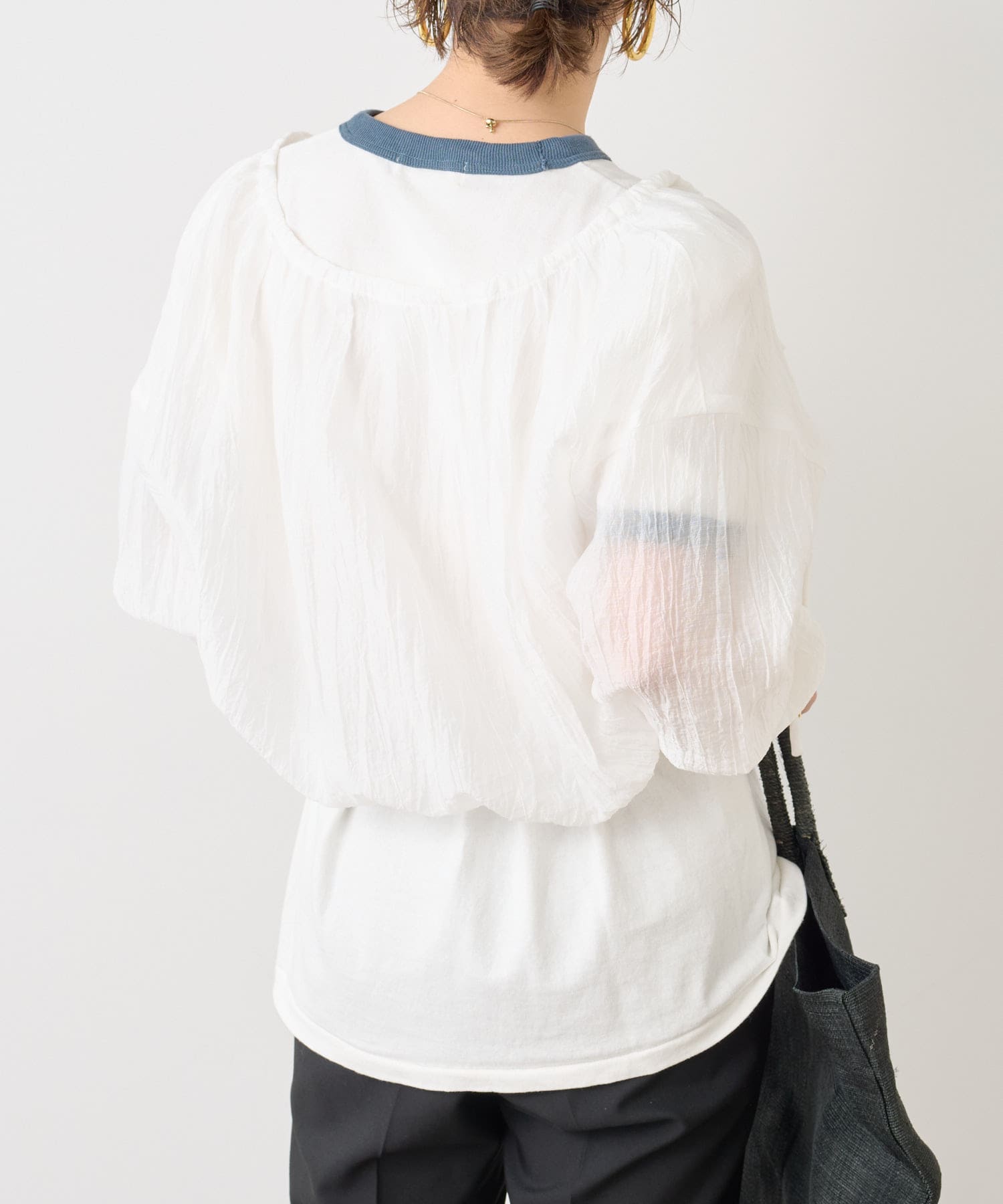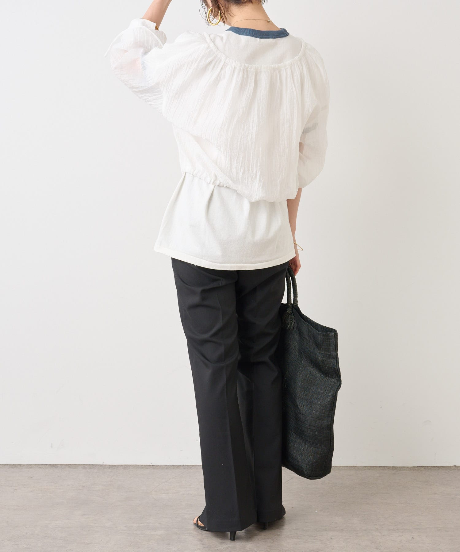 ・身幅はゆったりとしたサイズ感ながらシアー素材なので重くならず、裾にゴムが通っているのでボリューム感と丈を調整して着ていただけます。