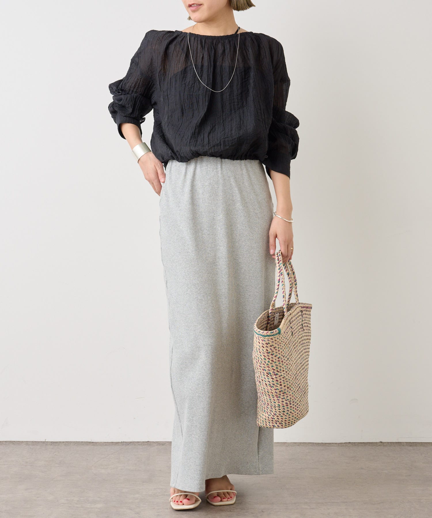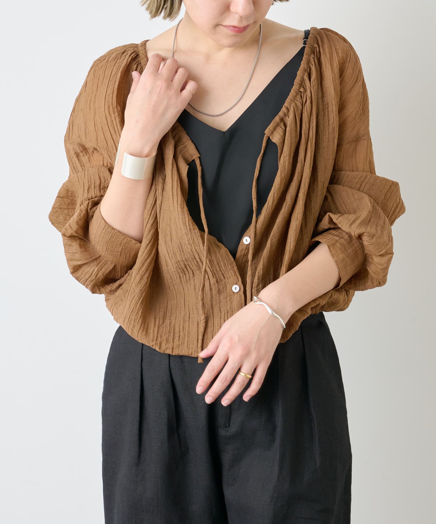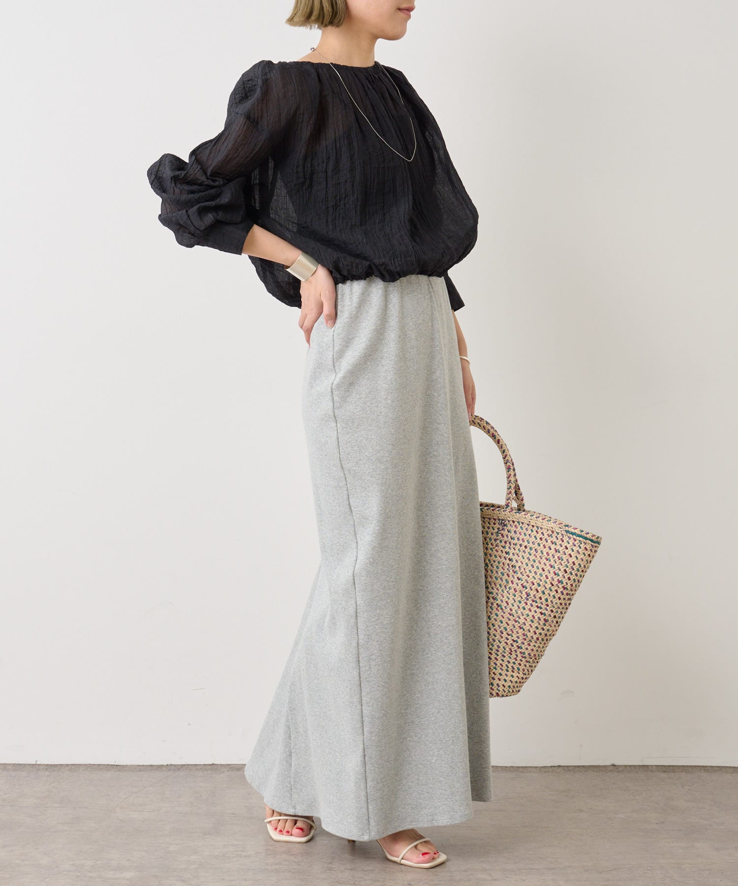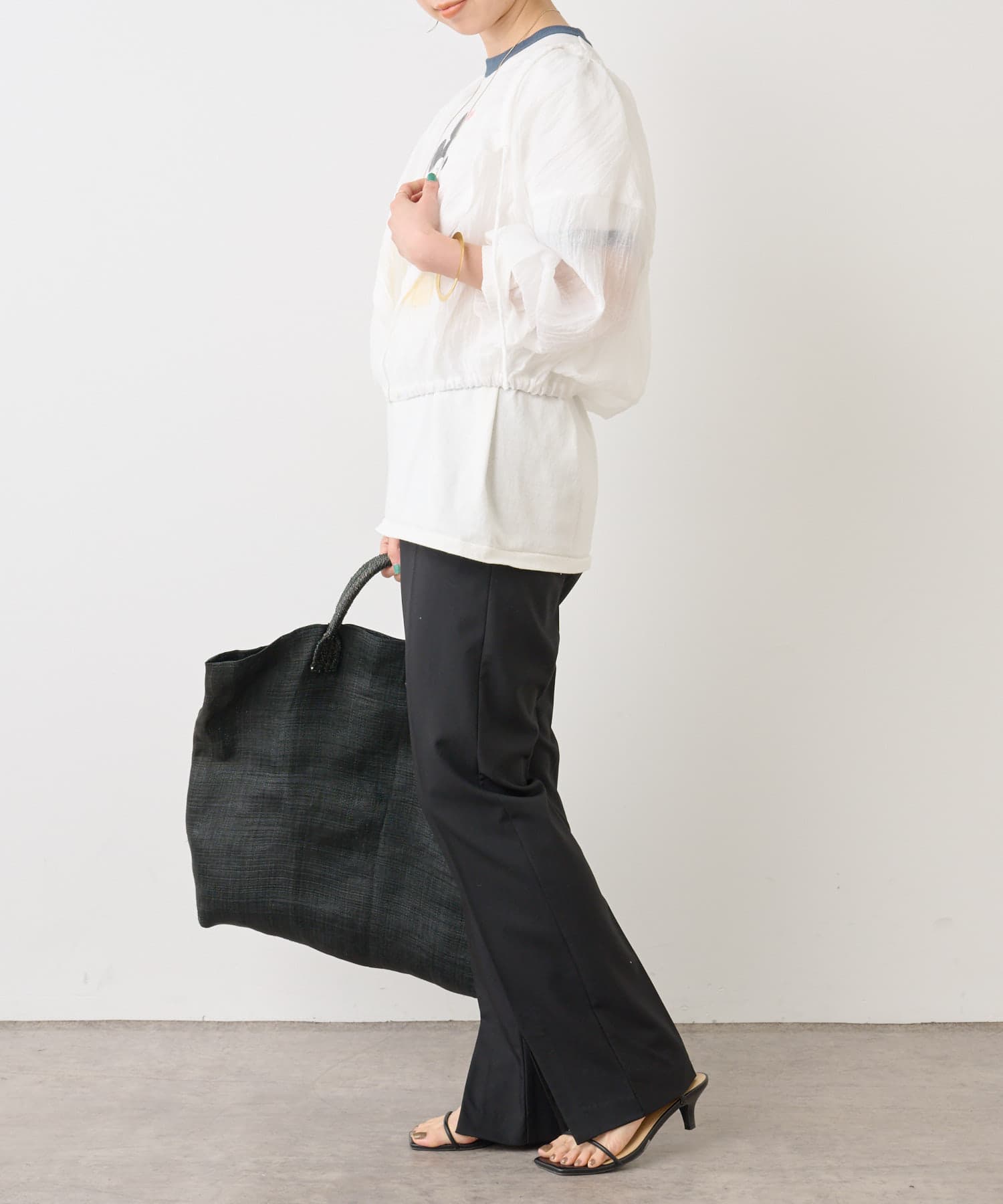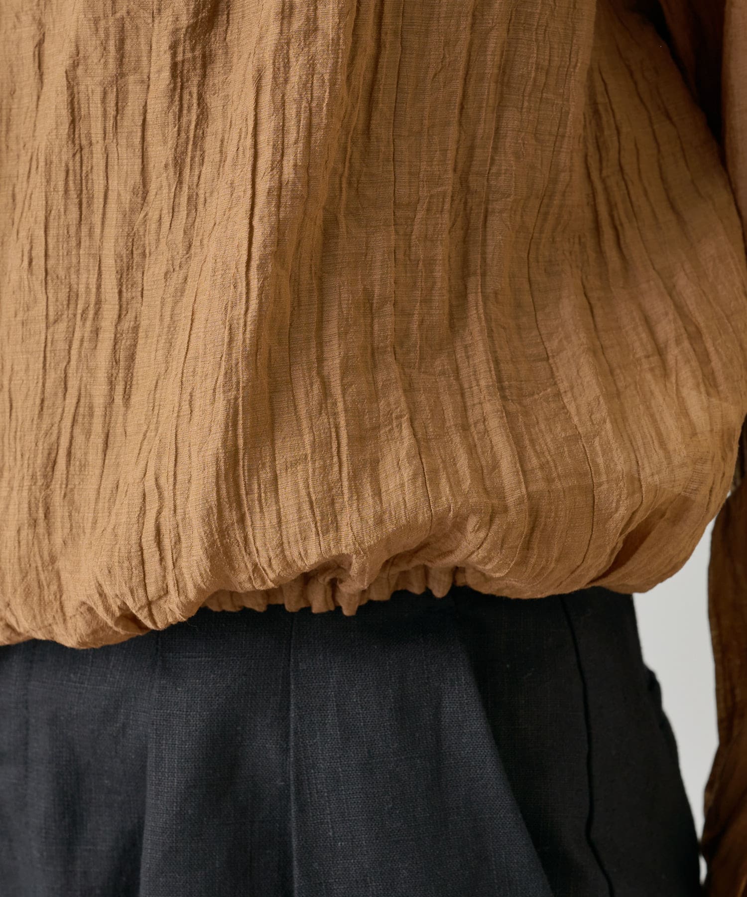 ・身幅はゆったりとしたサイズ感ながらシアー素材なので重くならず、裾にゴムが通っているのでボリューム感と丈を調整して着ていただけます。