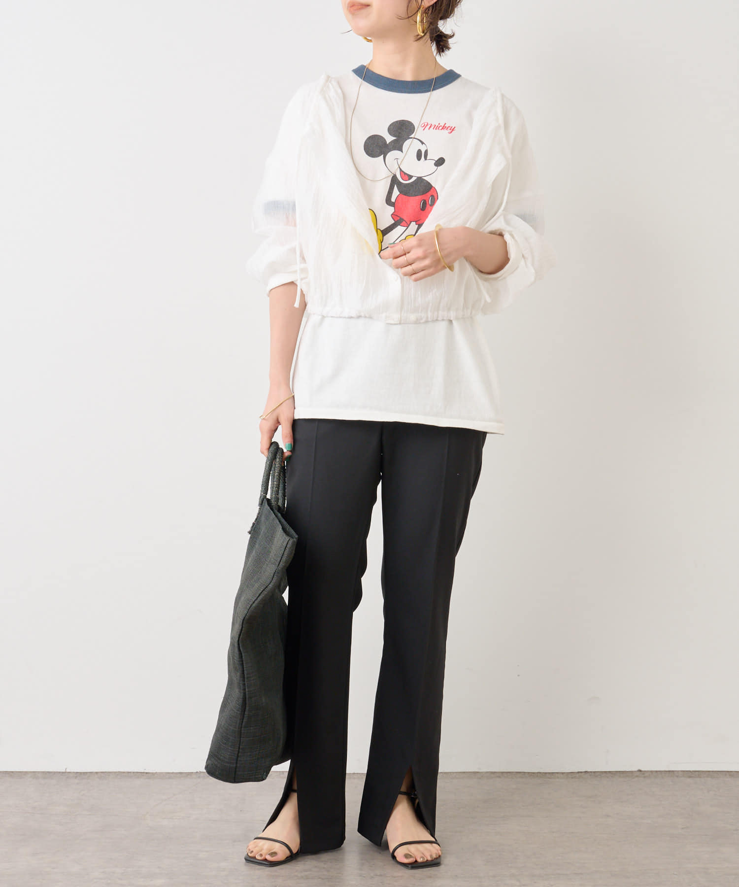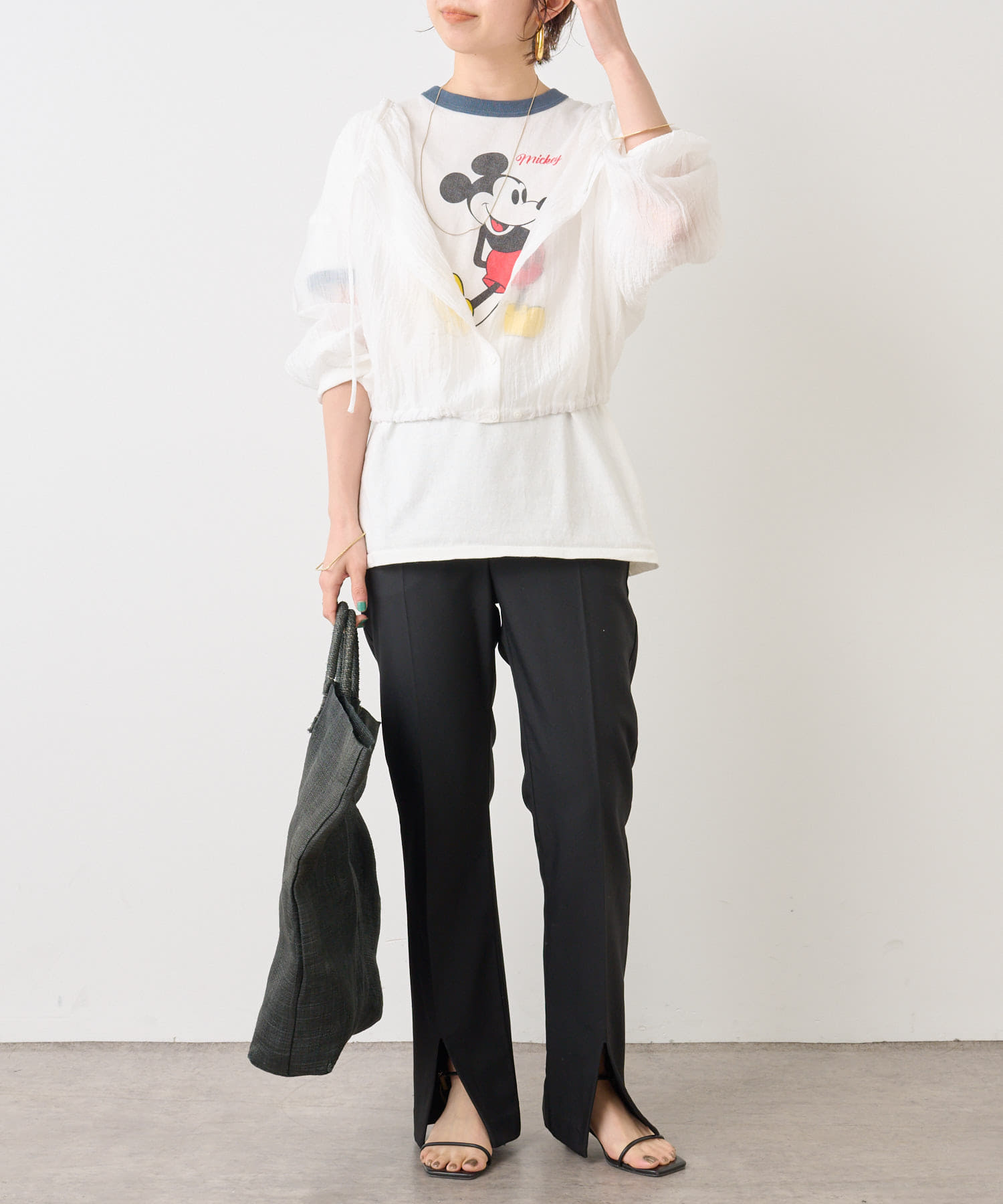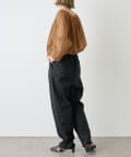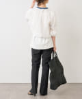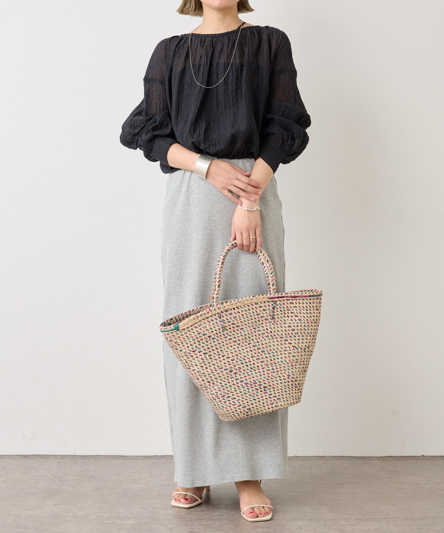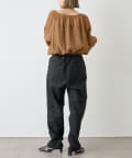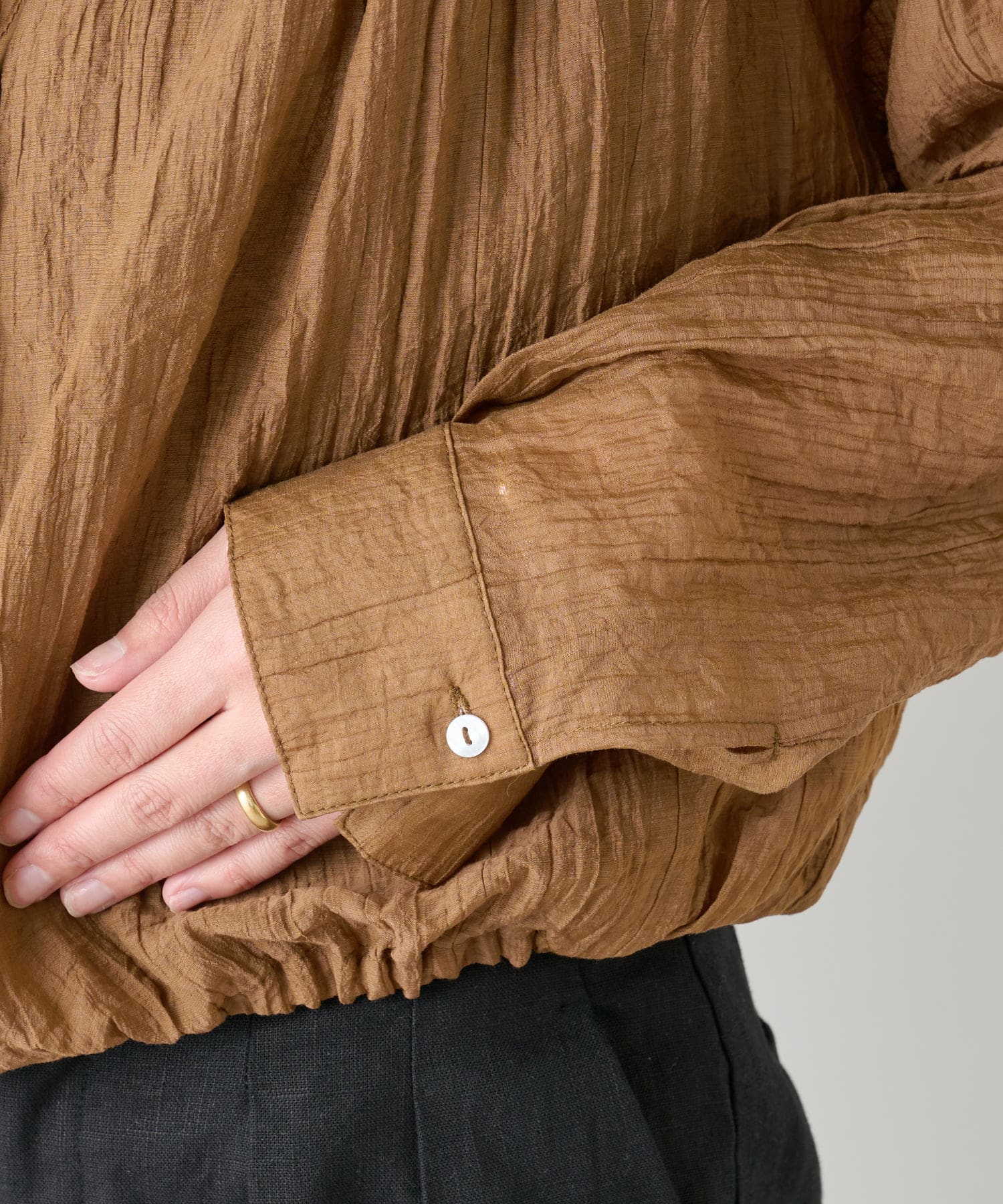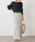 ・身幅はゆったりとしたサイズ感ながらシアー素材なので重くならず、裾にゴムが通っているのでボリューム感と丈を調整して着ていただけます。