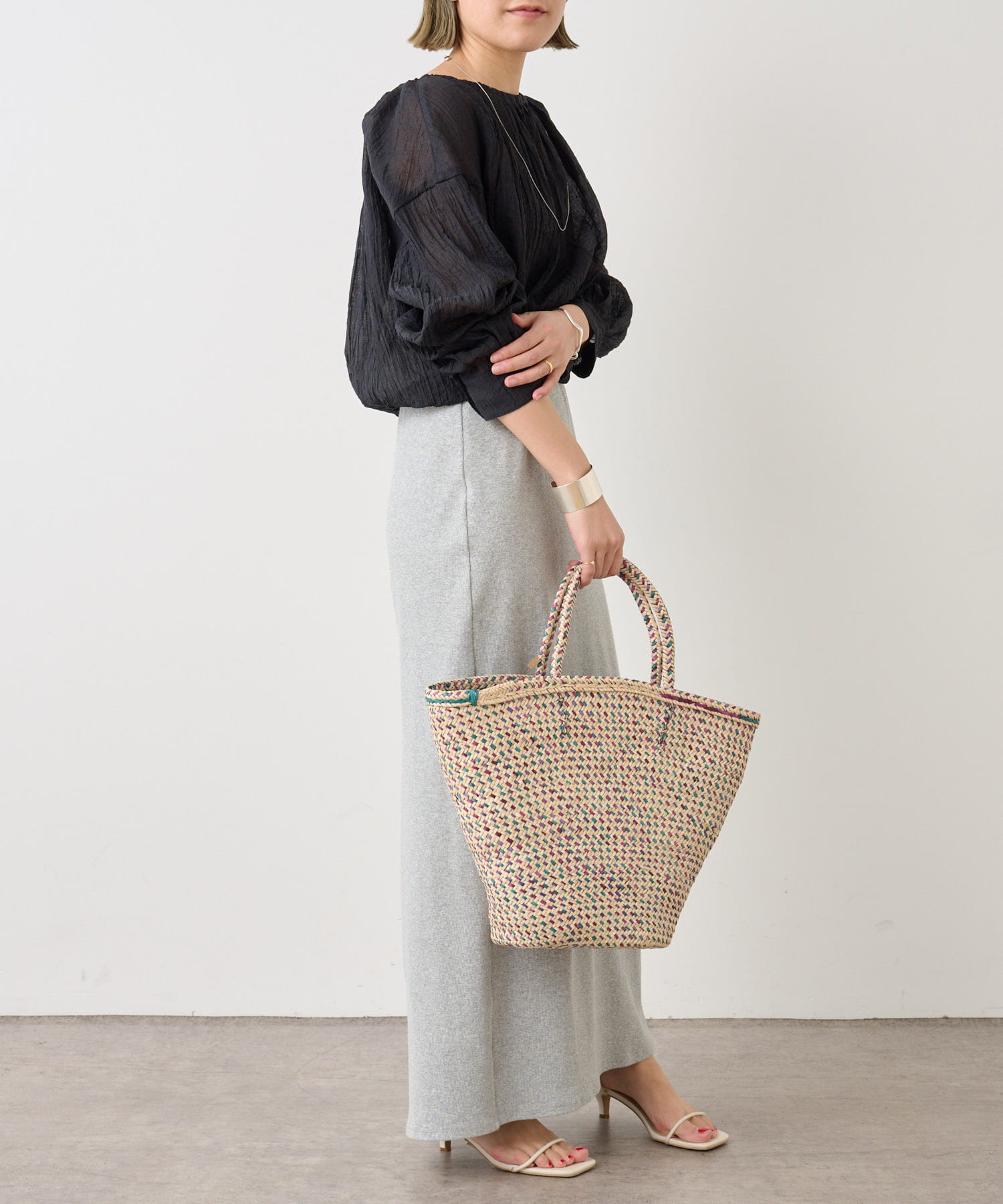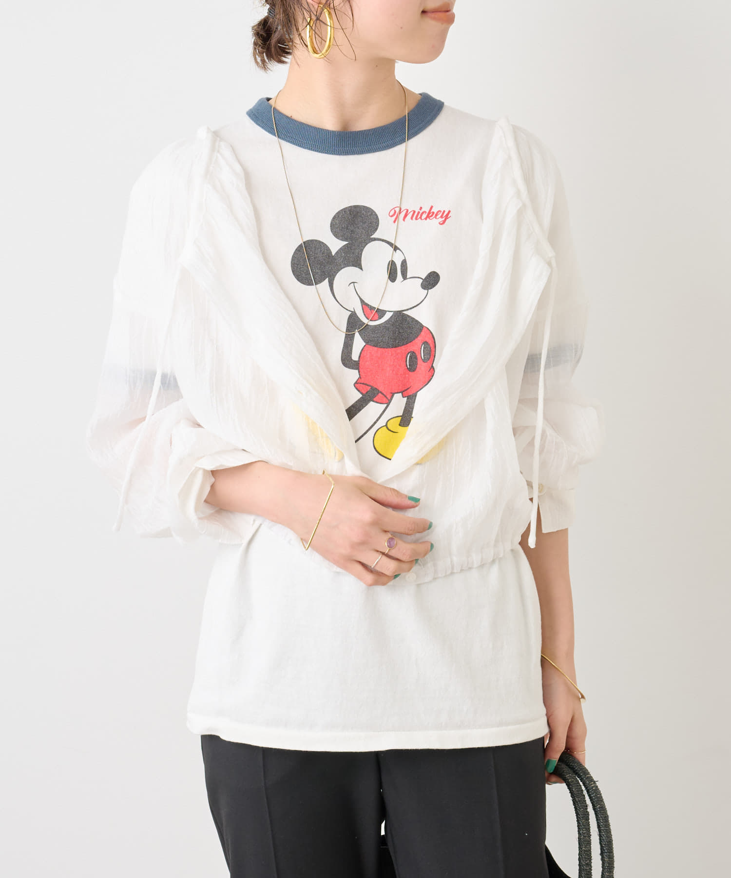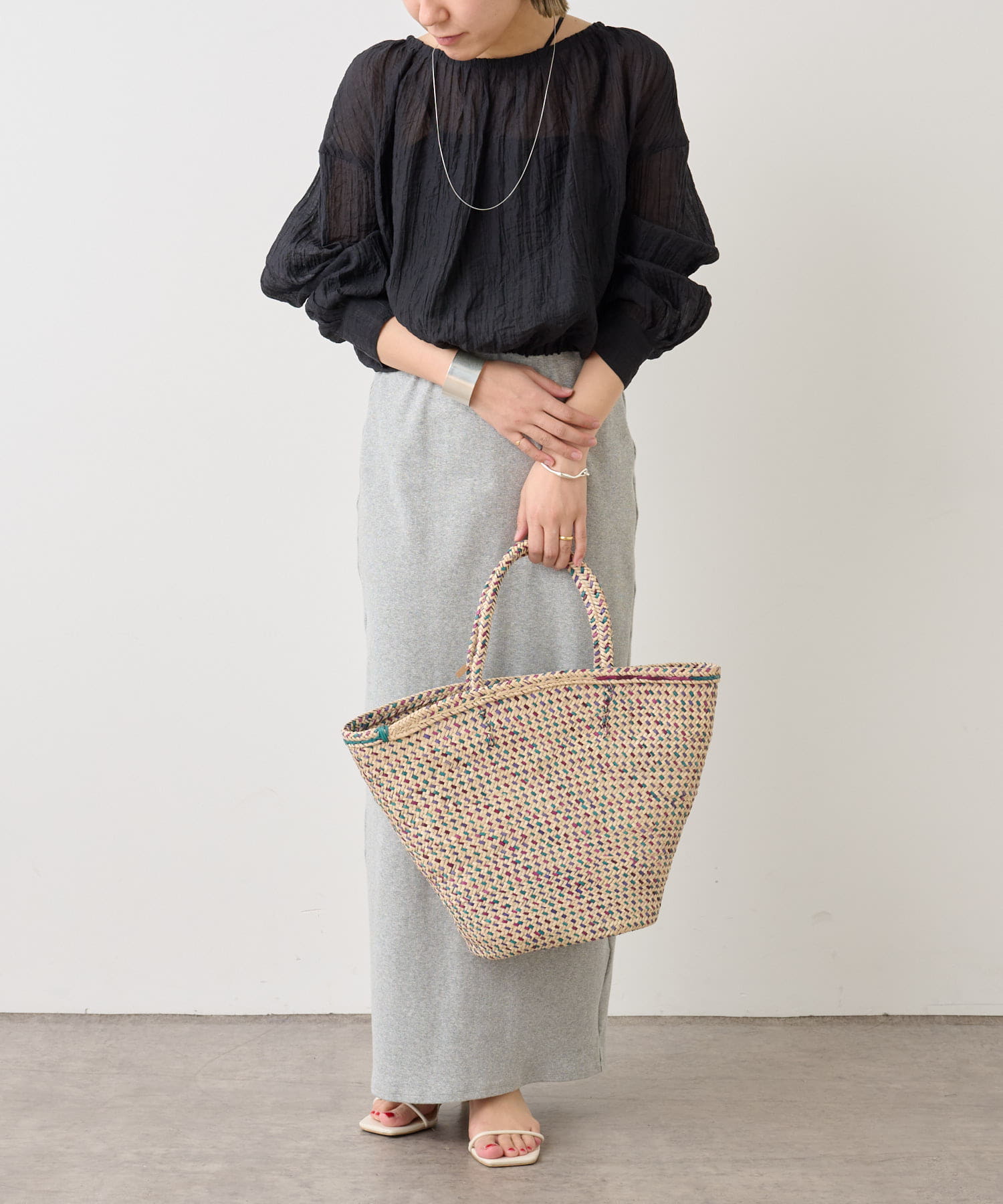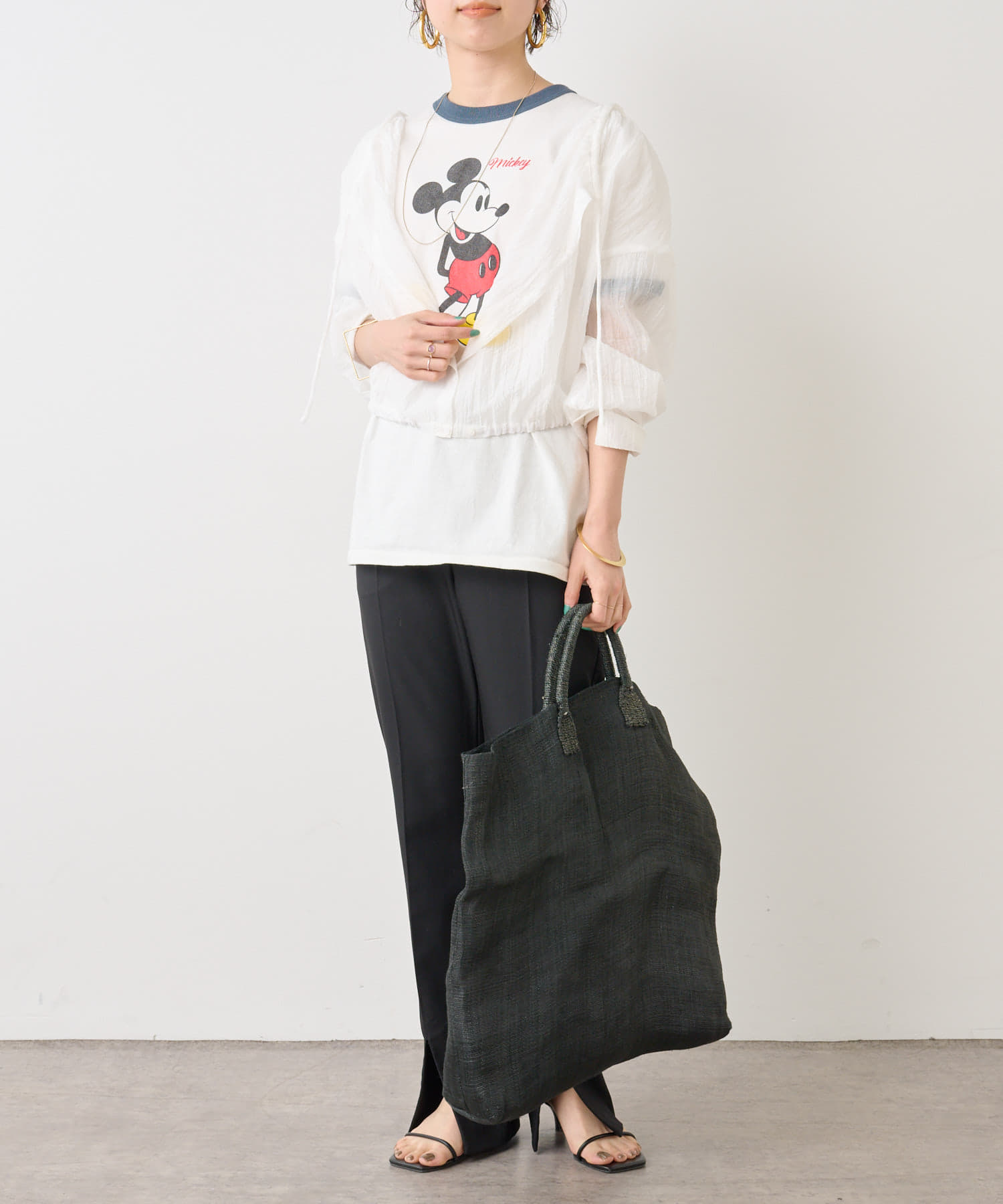 ・身幅はゆったりとしたサイズ感ながらシアー素材なので重くならず、裾にゴムが通っているのでボリューム感と丈を調整して着ていただけます。