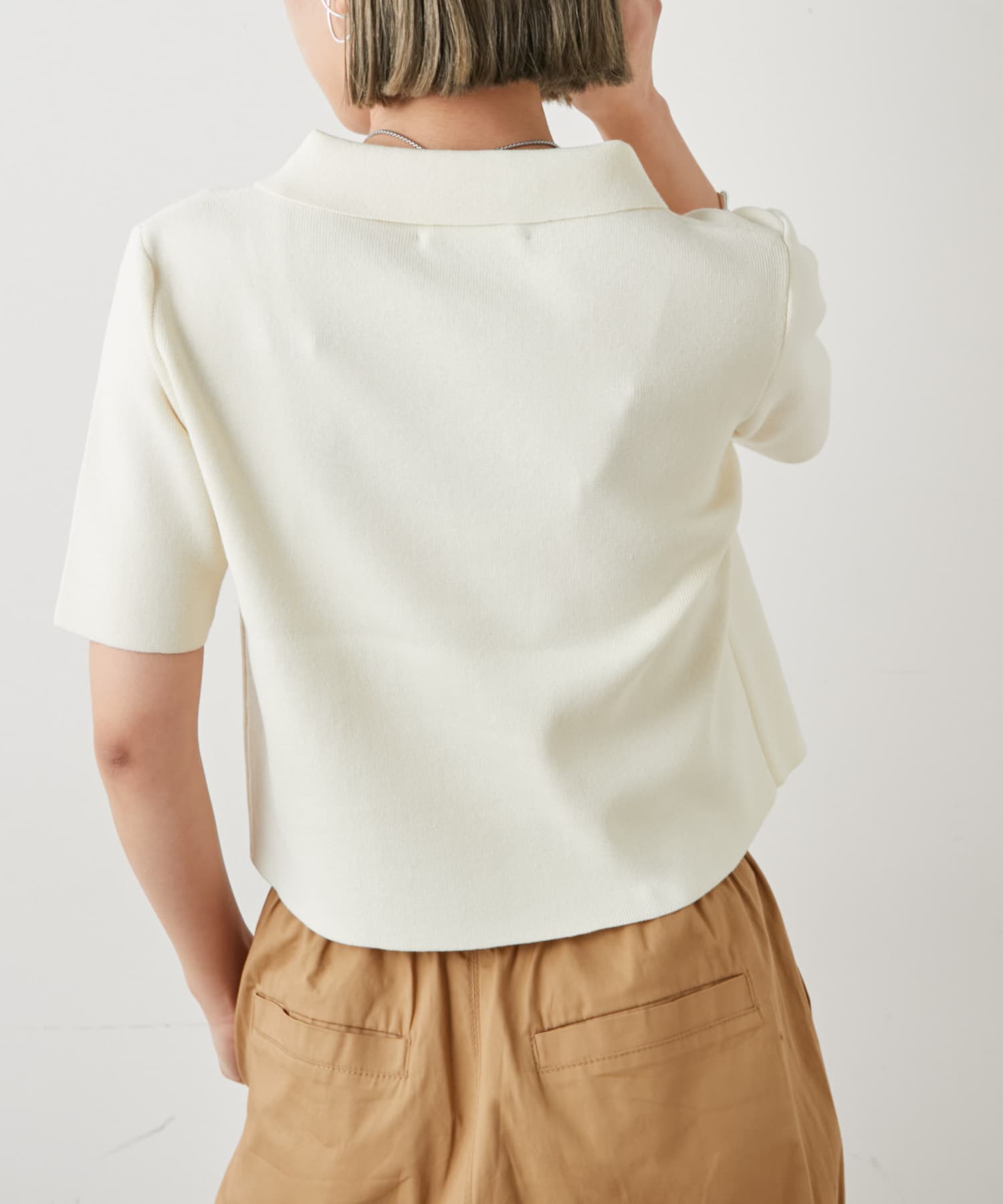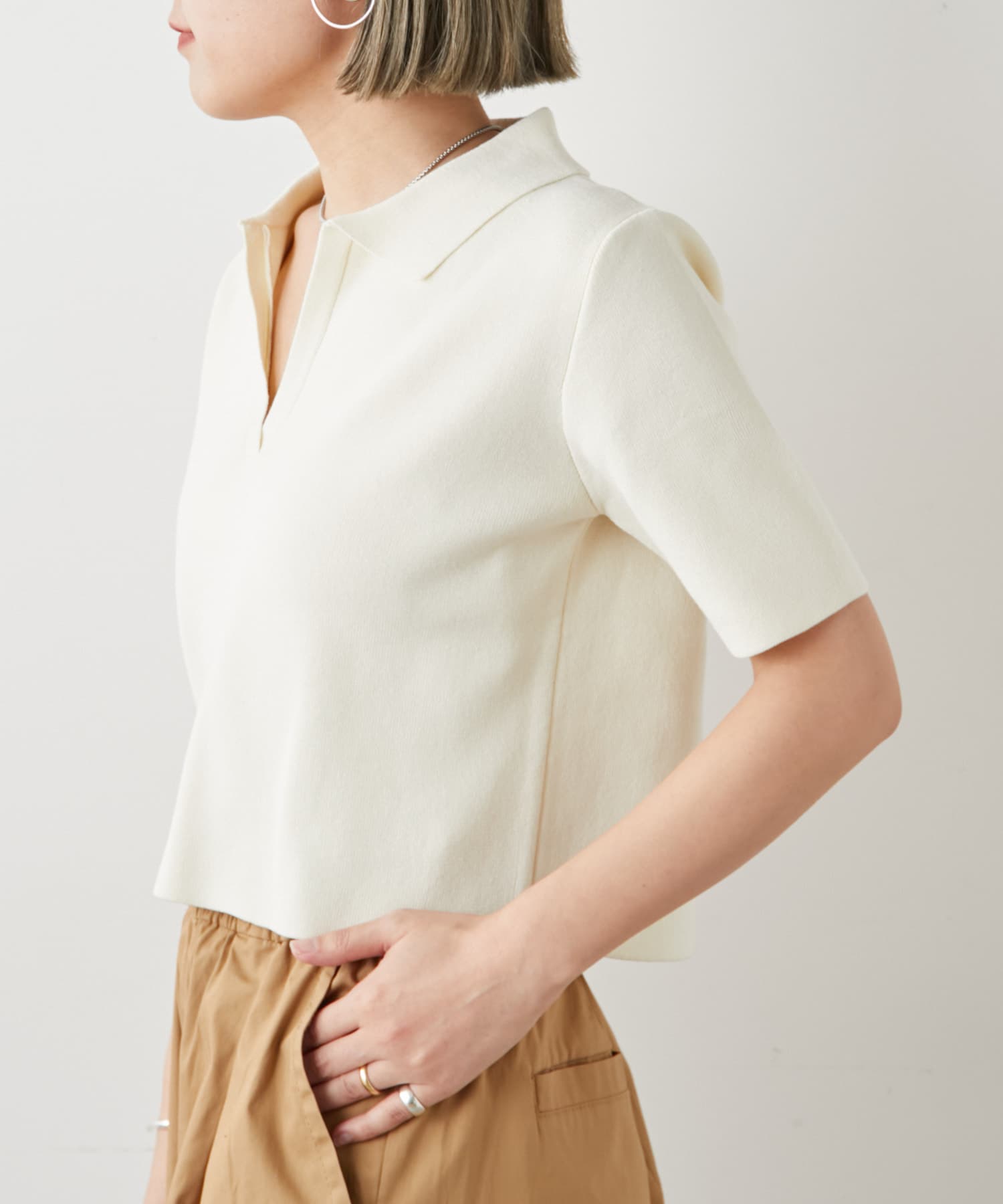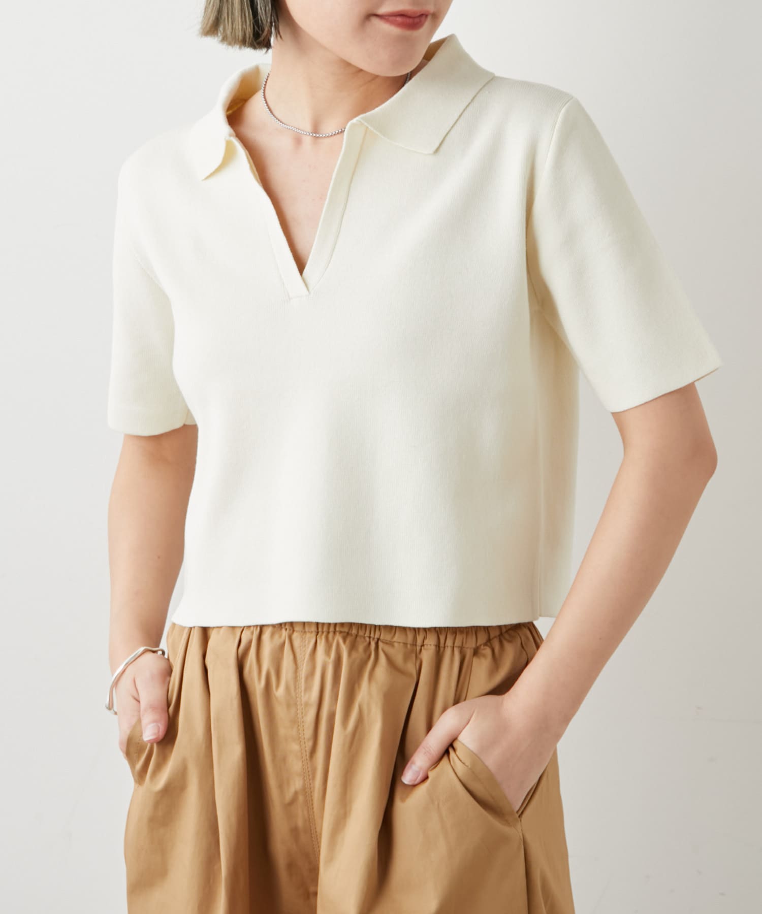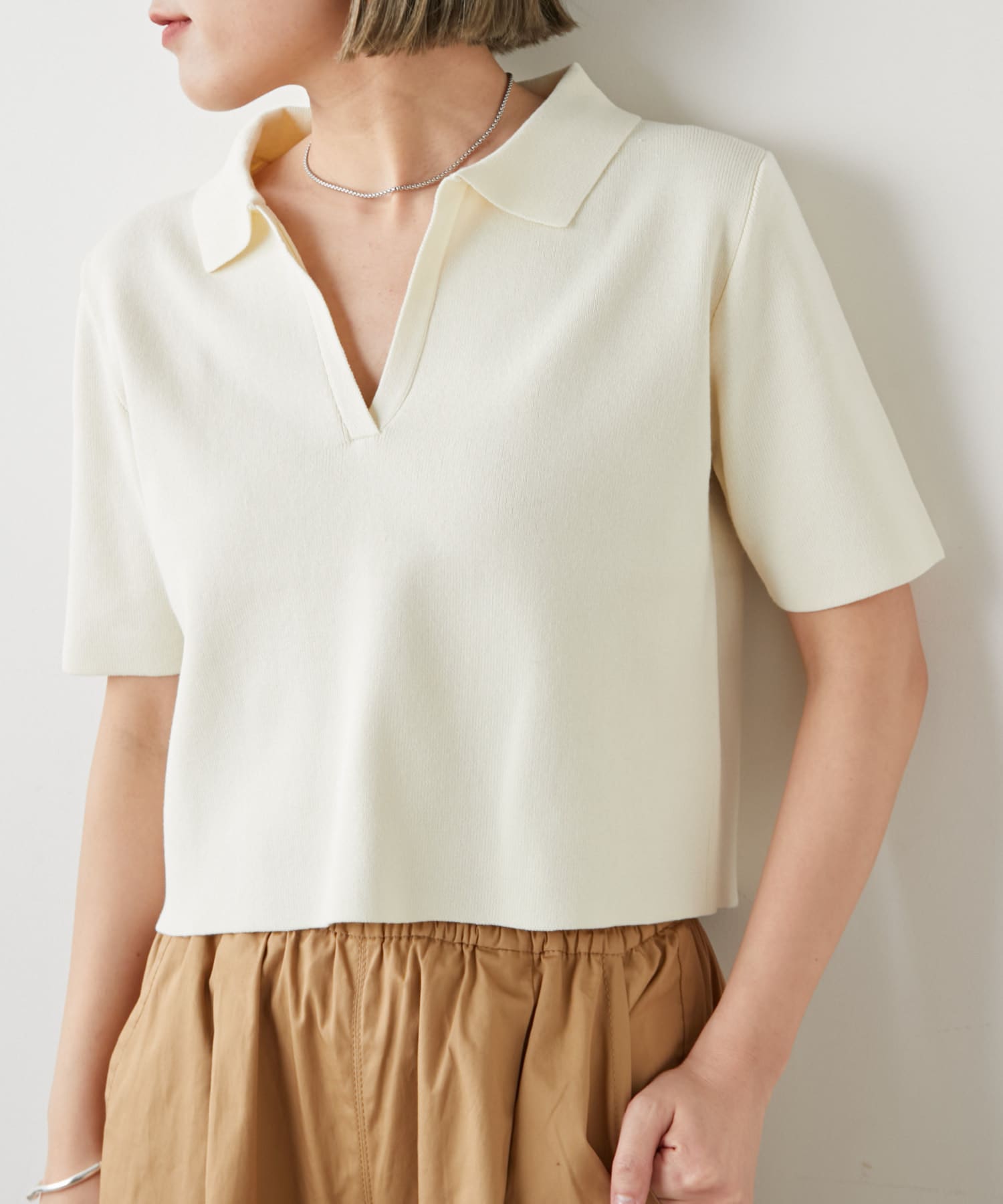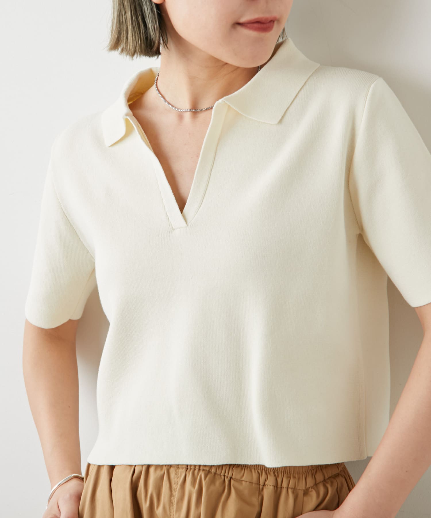 ・ヘルシーな大人の肌見せを叶えるVネックラインと、程よく短めな着丈がポイントの衿付きニット。