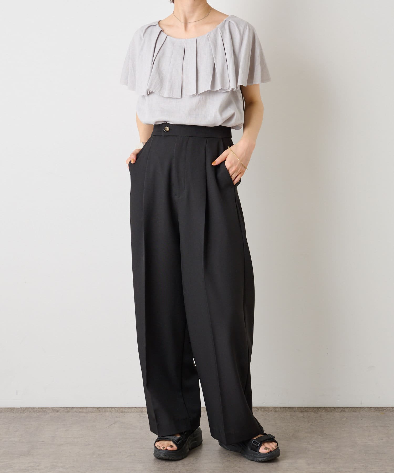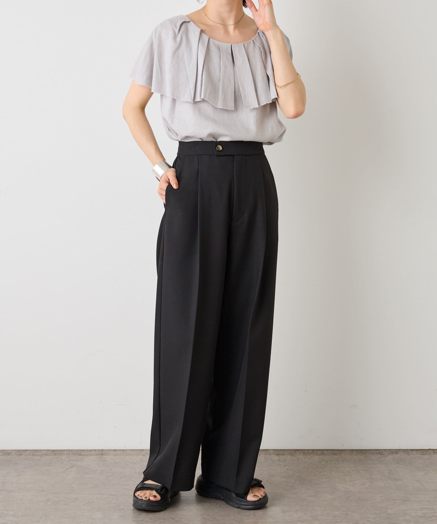 ふわっと揺れるラッフルがエレガントな印象のブラウス