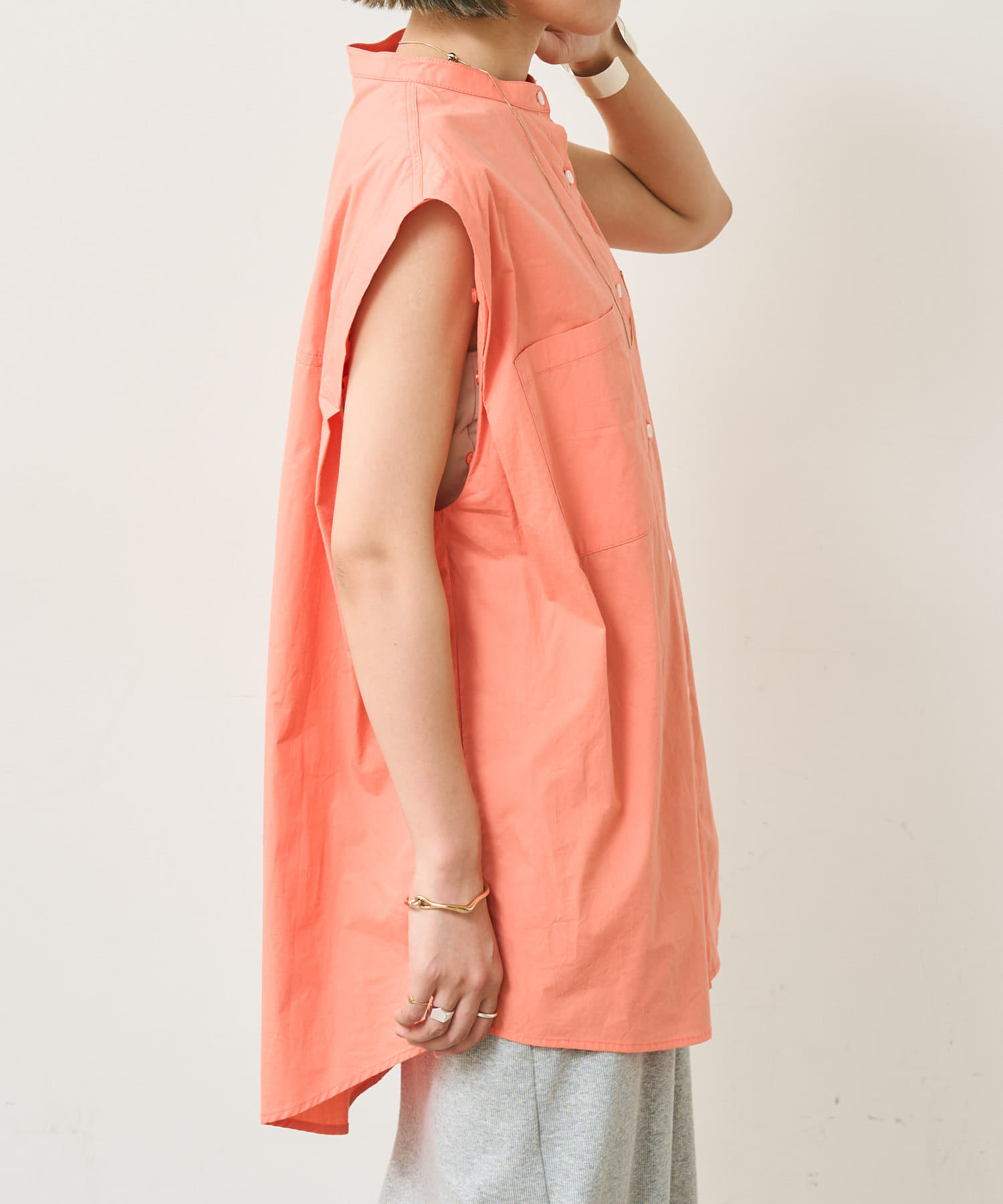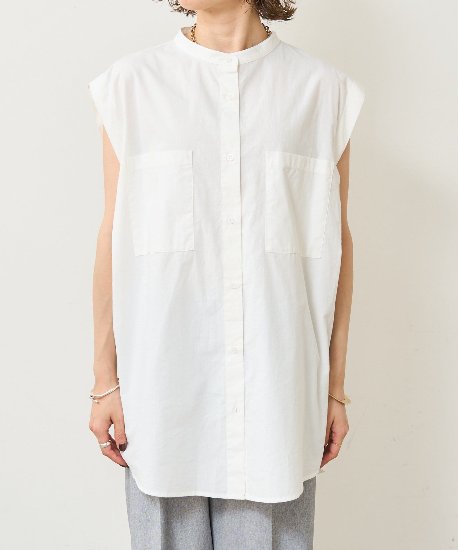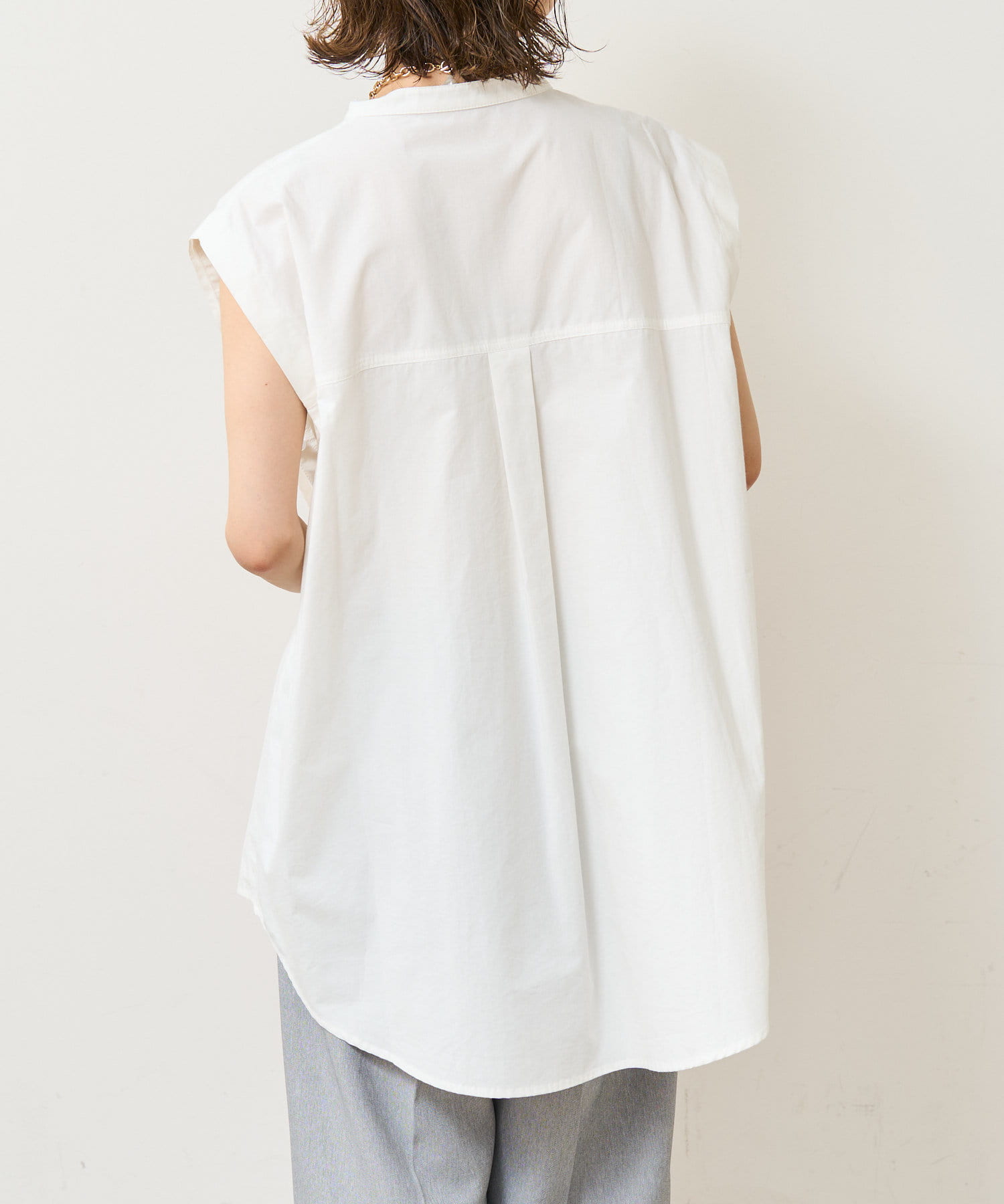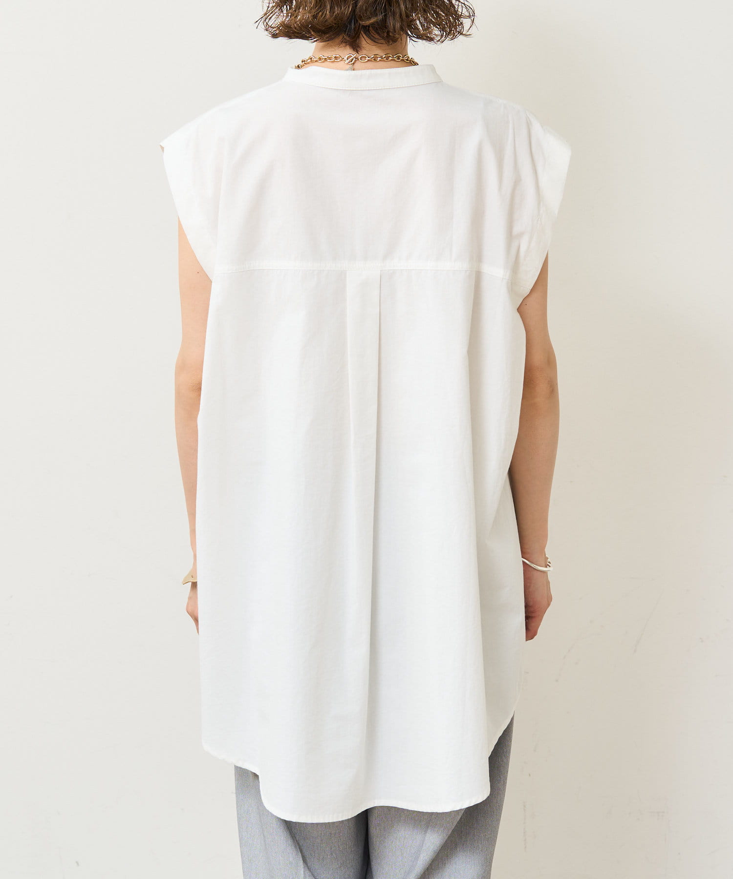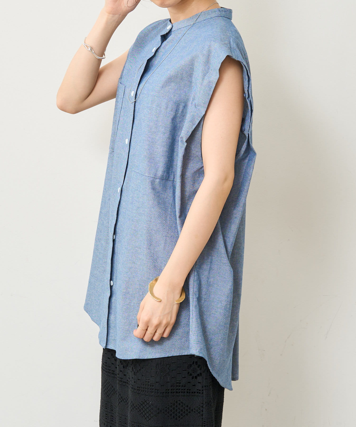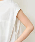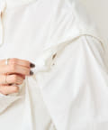 ・アーム部分にボタンが付いており、袖が取り外しができるシャツ。アームのボタンを少し外してヘルシーに肌見せしたり、着方次第でコーディネートの幅が広がる一着。