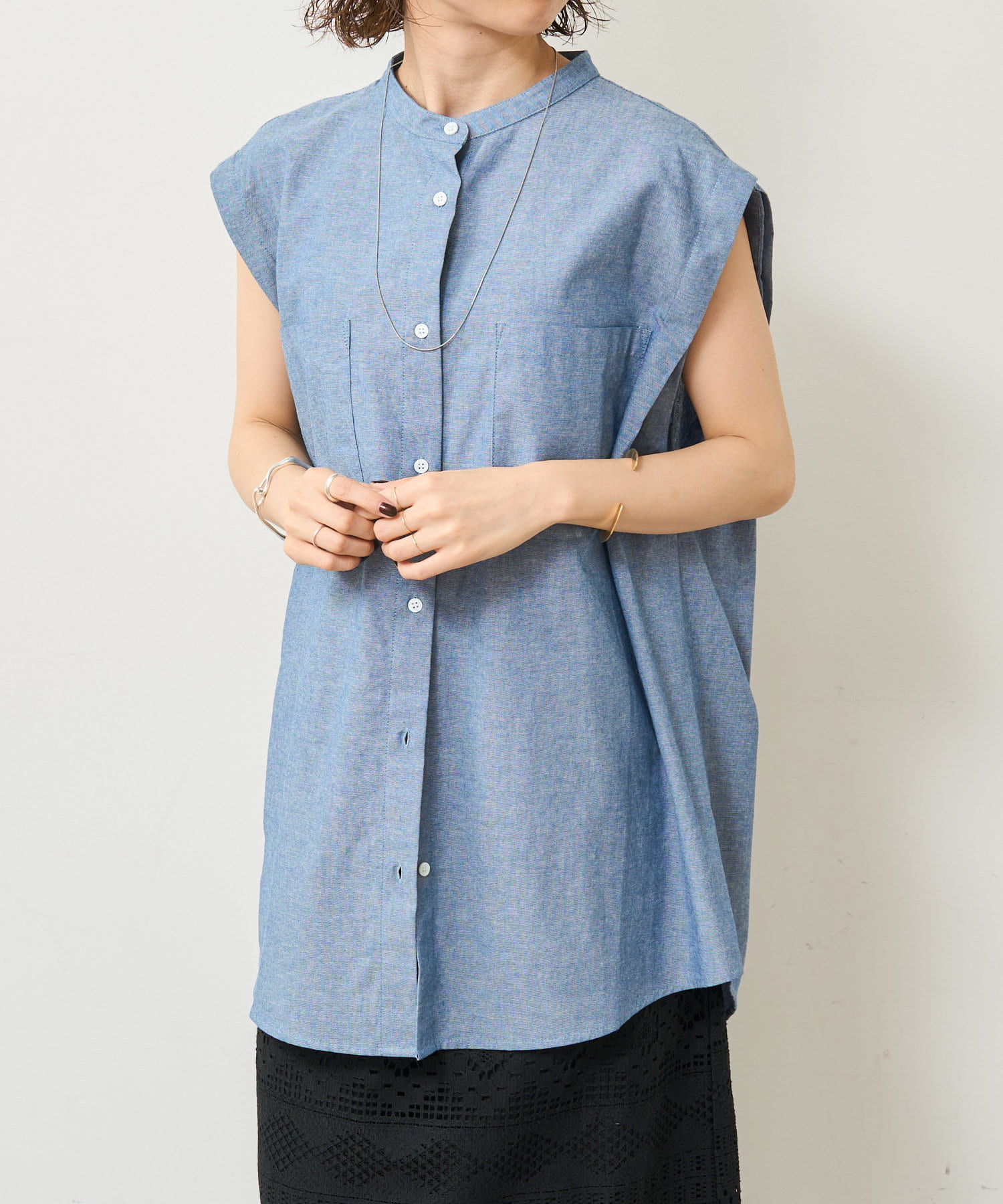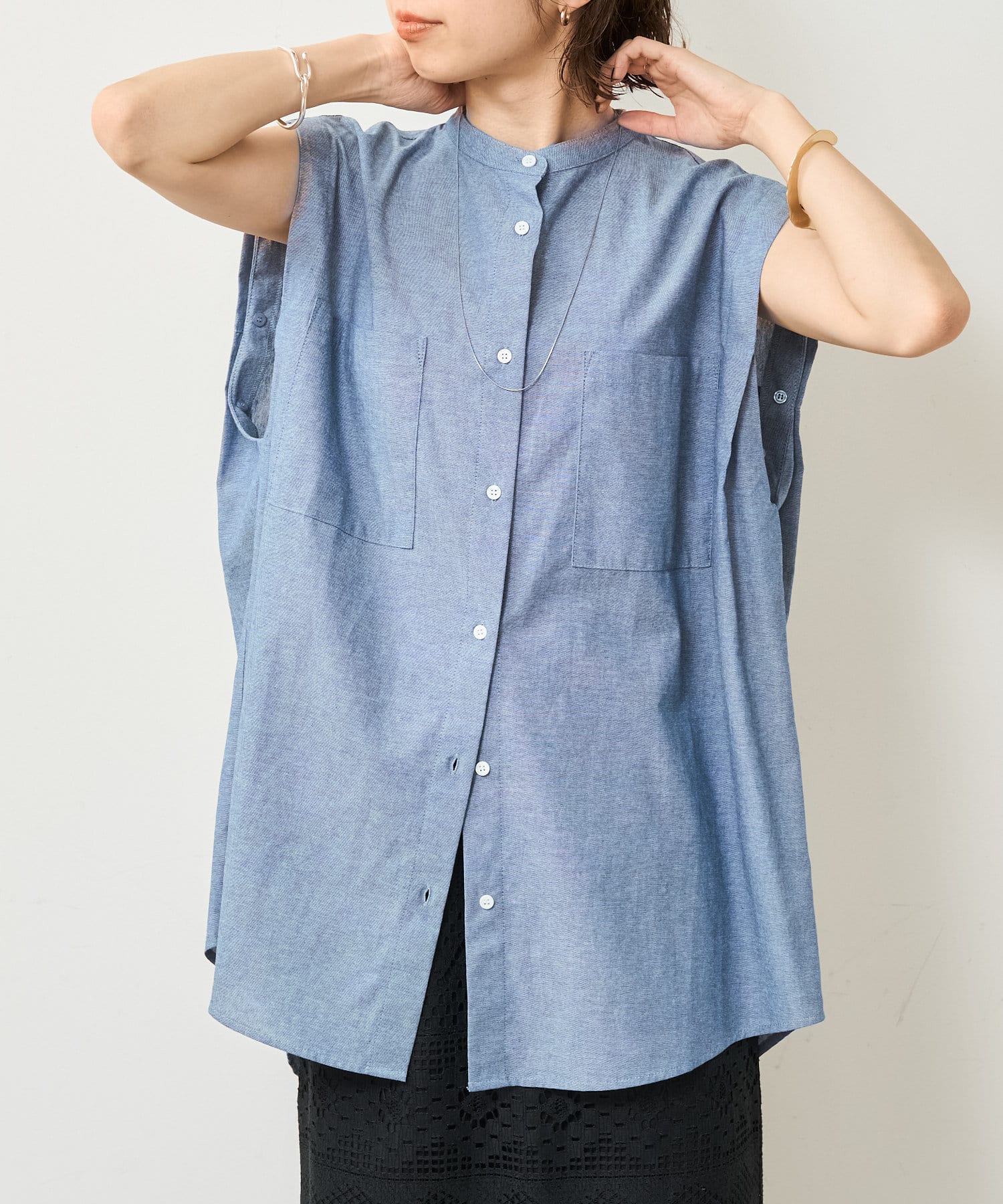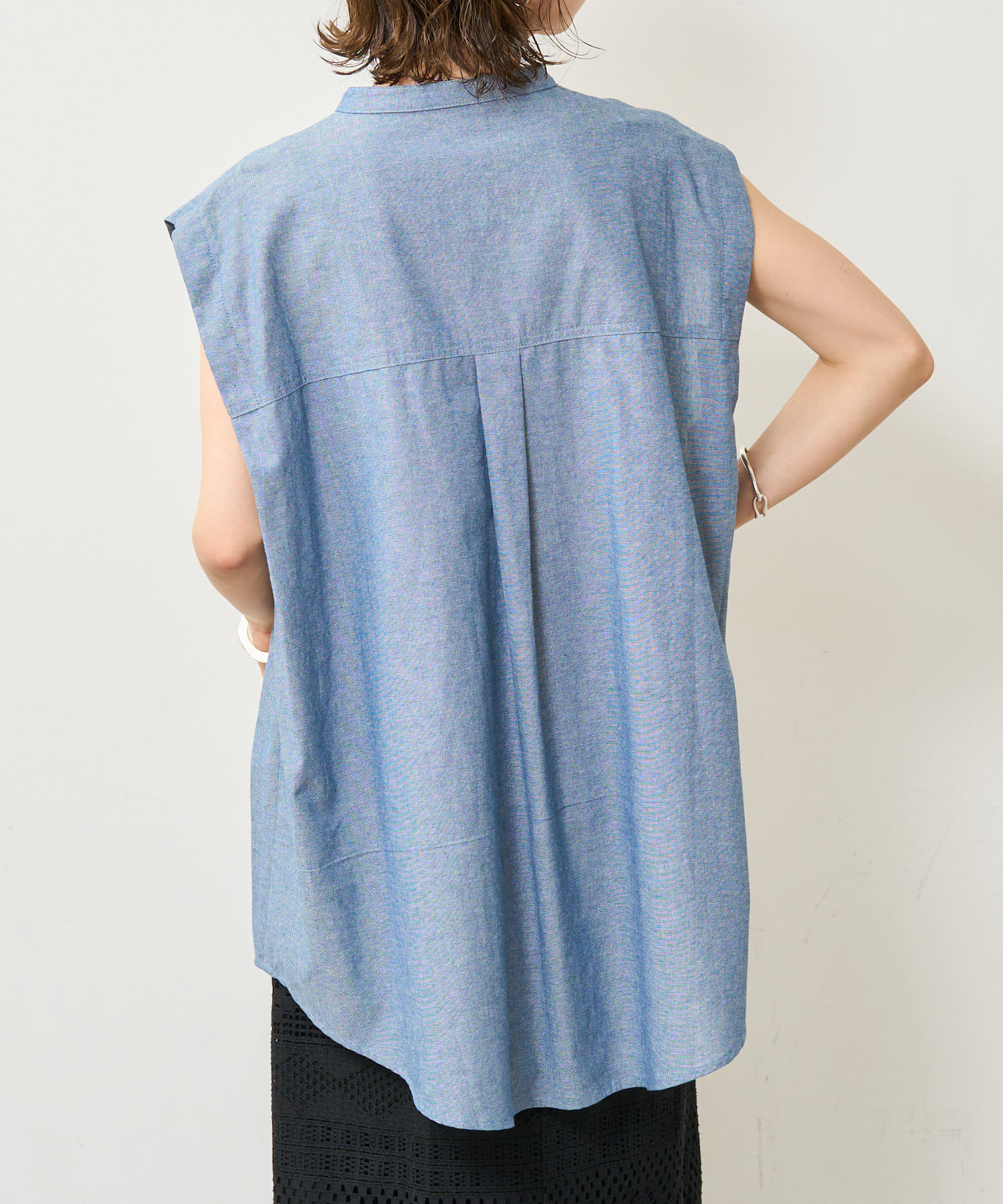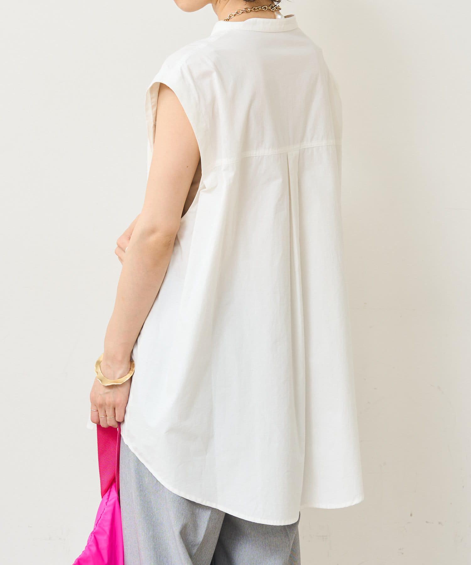 ・アーム部分にボタンが付いており、袖が取り外しができるシャツ。アームのボタンを少し外してヘルシーに肌見せしたり、着方次第でコーディネートの幅が広がる一着。