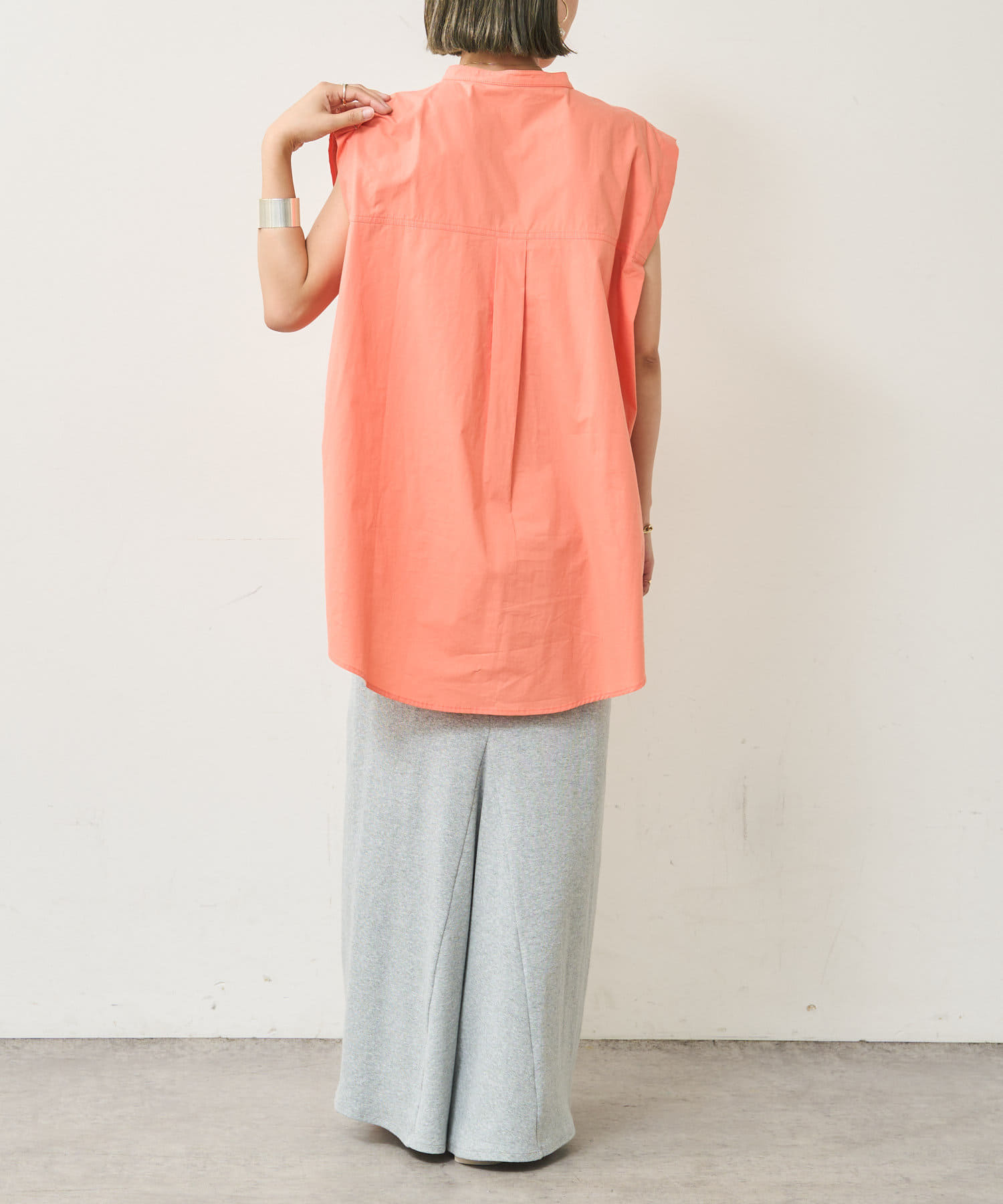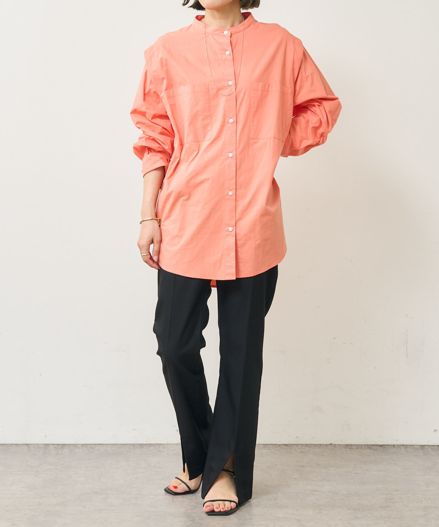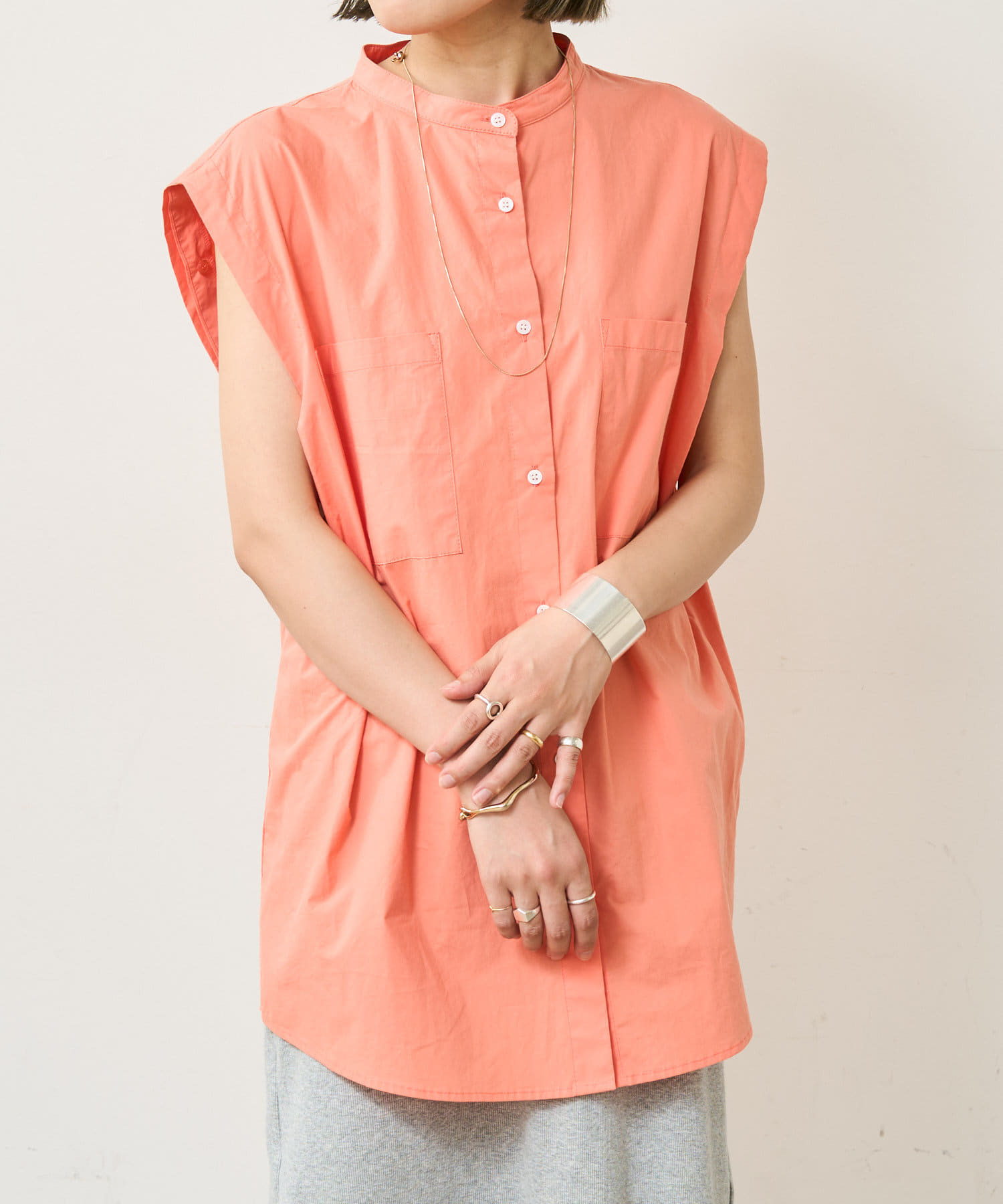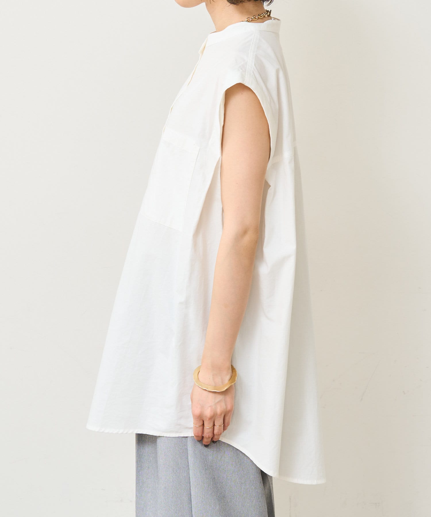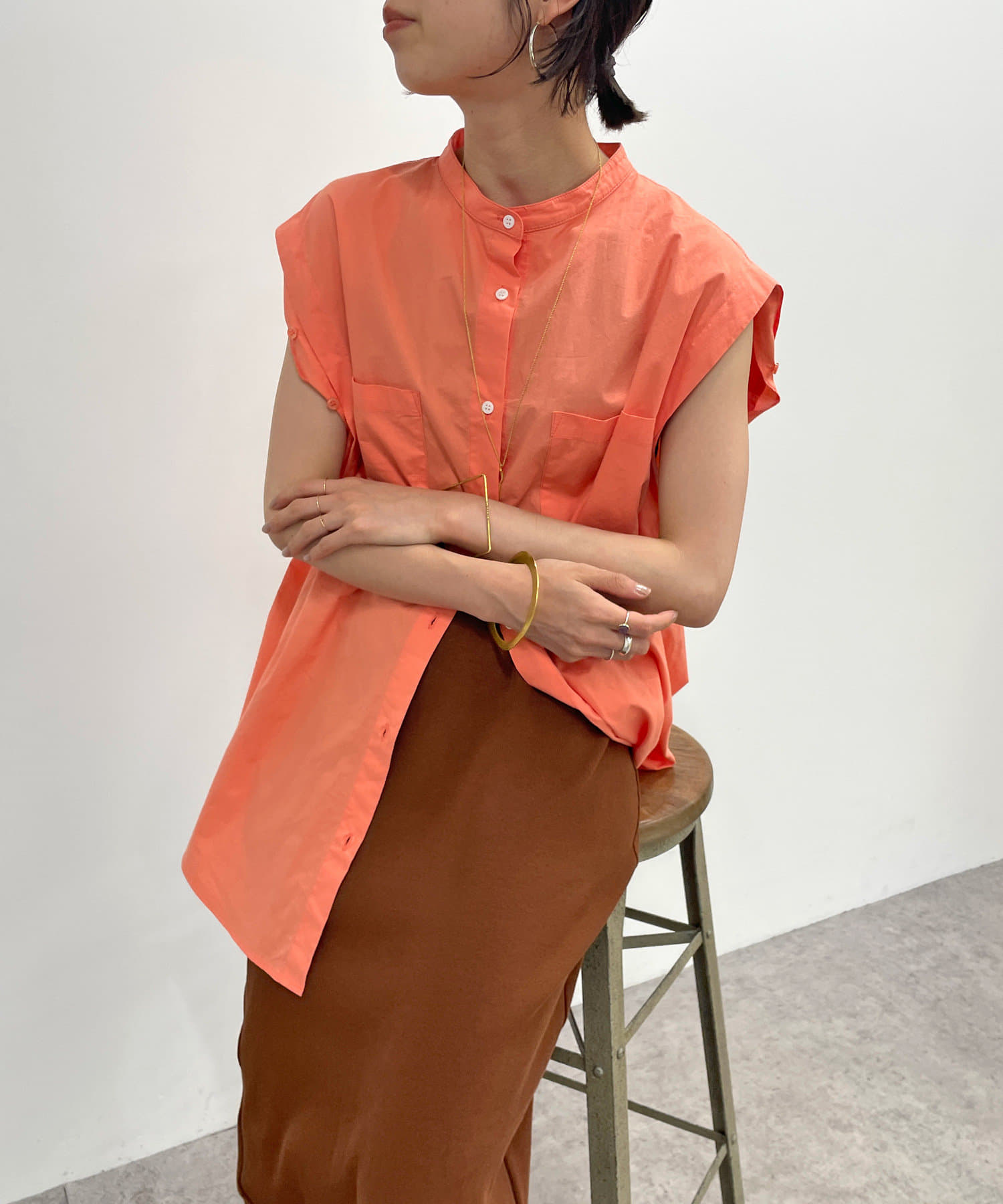 ・アーム部分にボタンが付いており、袖が取り外しができるシャツ。アームのボタンを少し外してヘルシーに肌見せしたり、着方次第でコーディネートの幅が広がる一着。