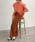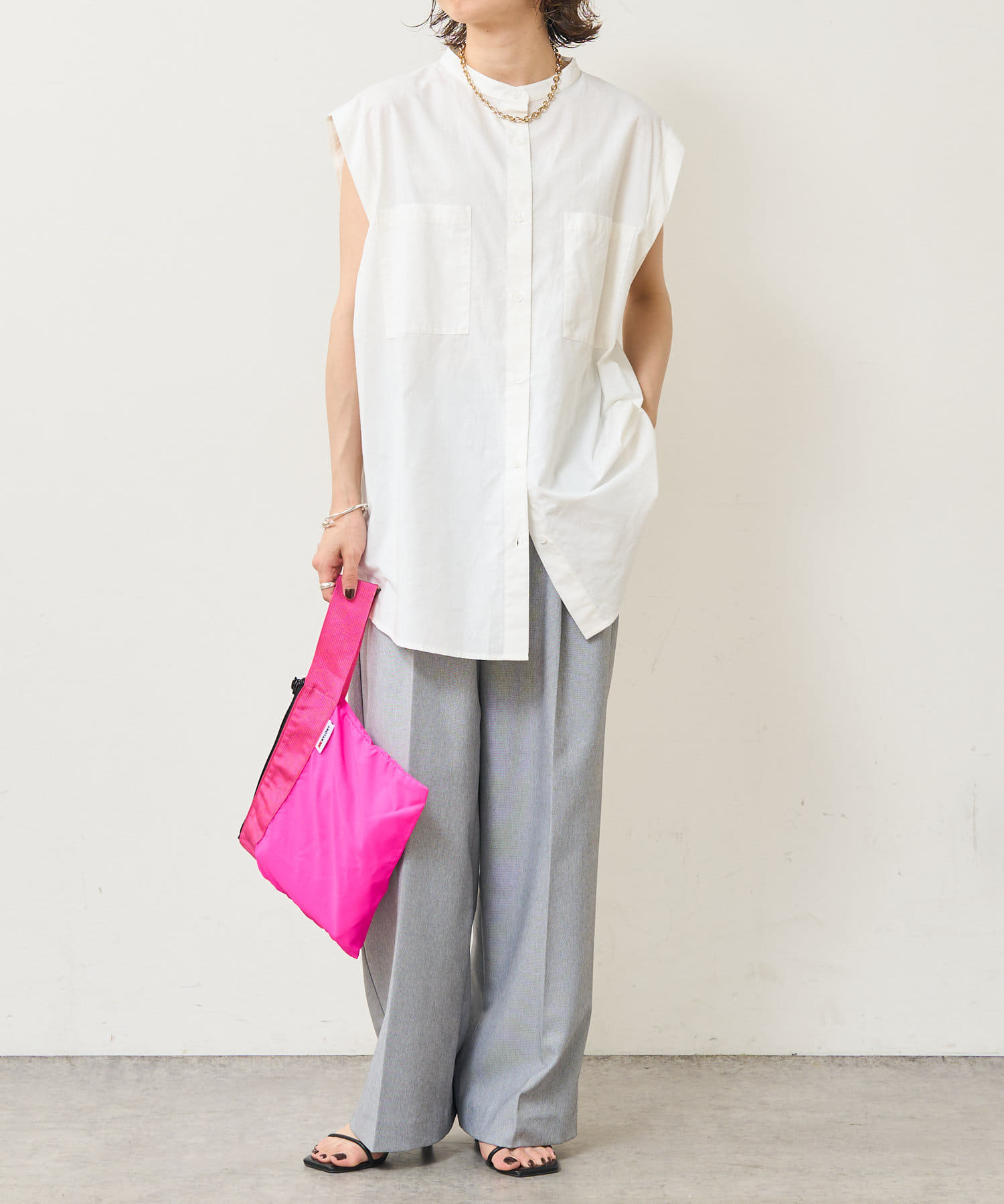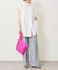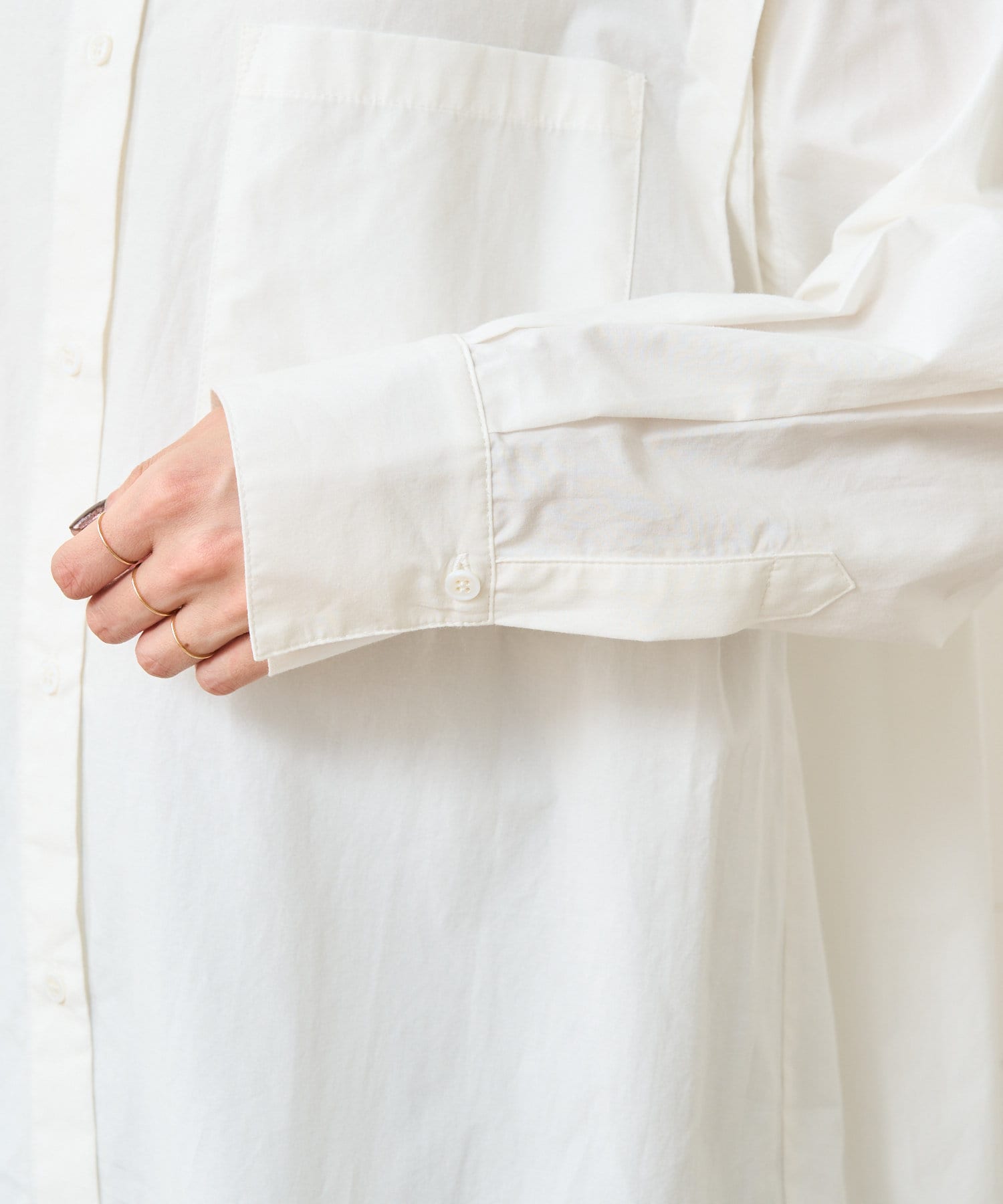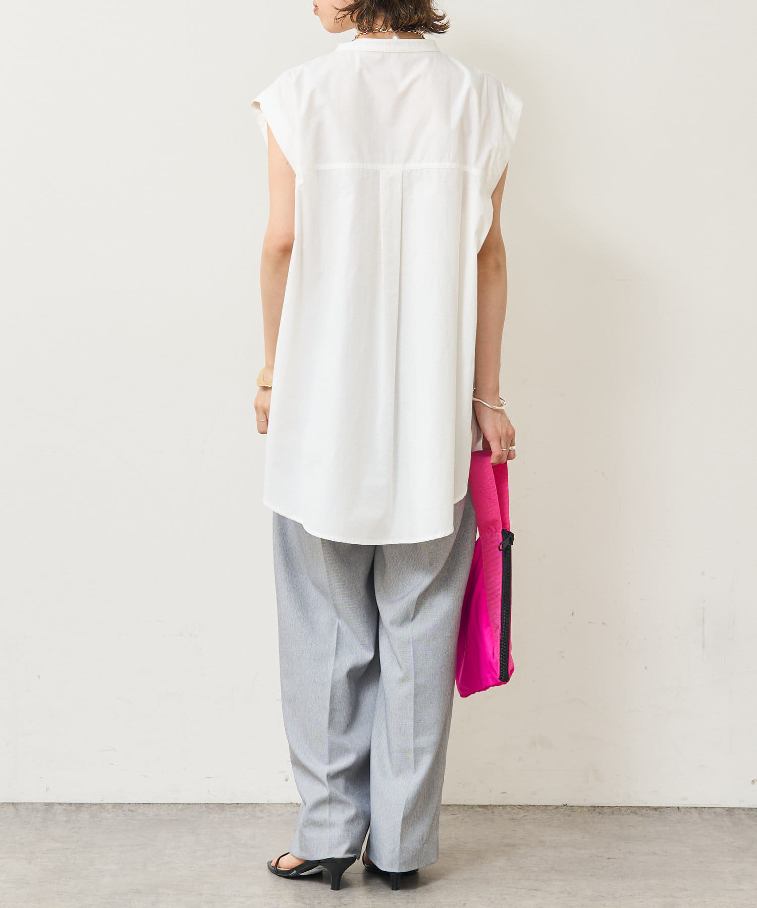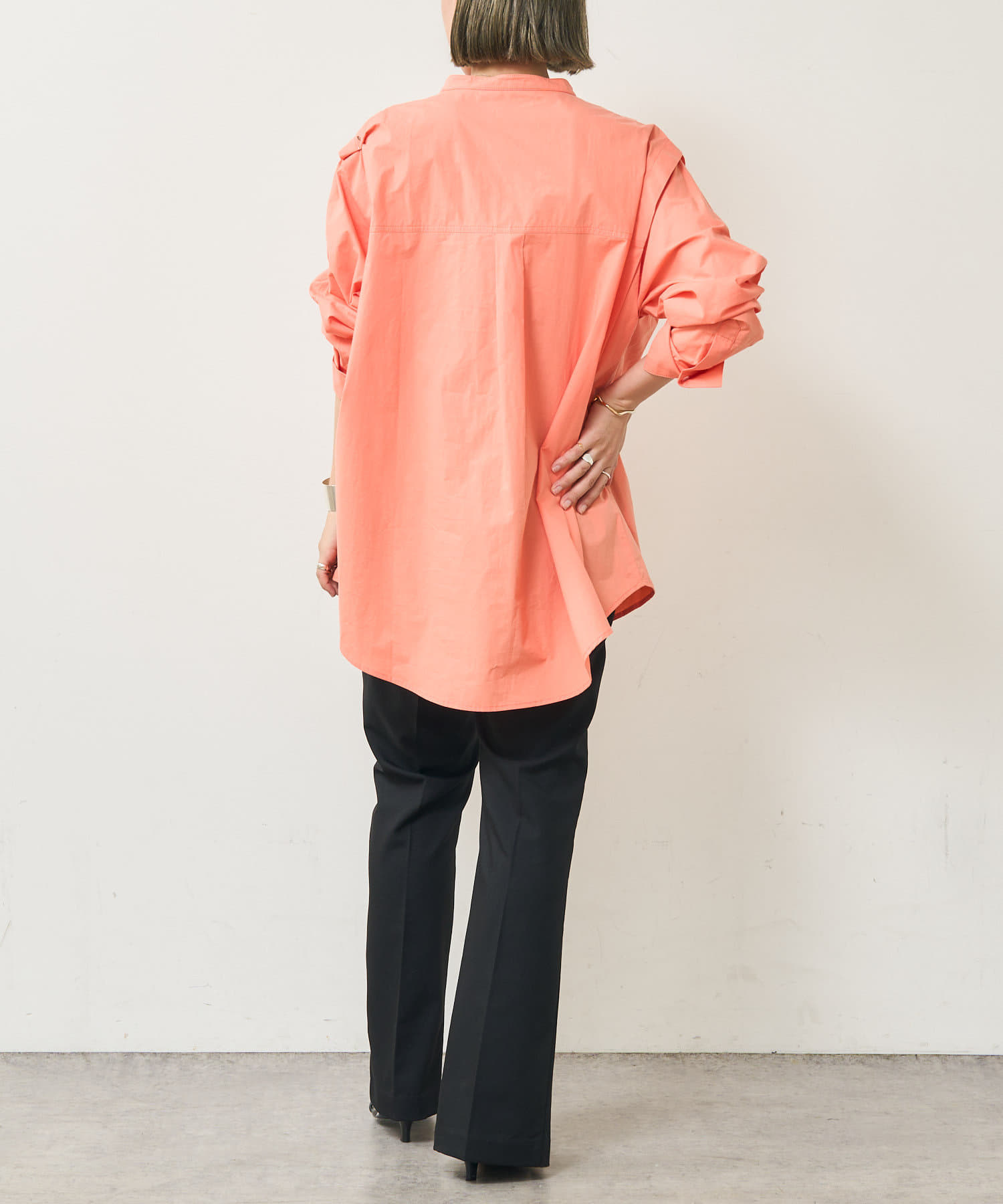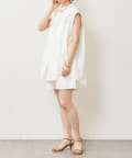 ・アーム部分にボタンが付いており、袖が取り外しができるシャツ。アームのボタンを少し外してヘルシーに肌見せしたり、着方次第でコーディネートの幅が広がる一着。