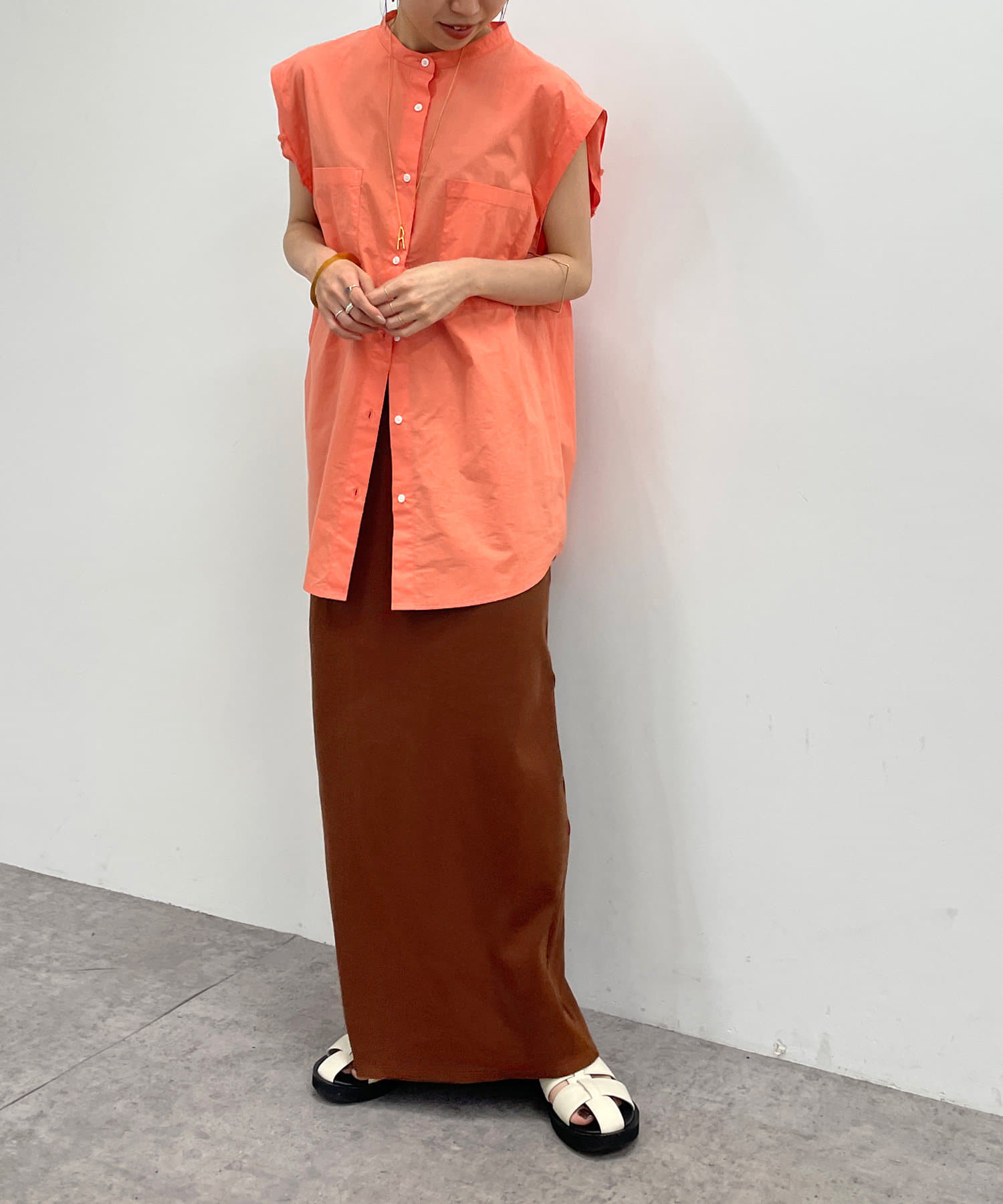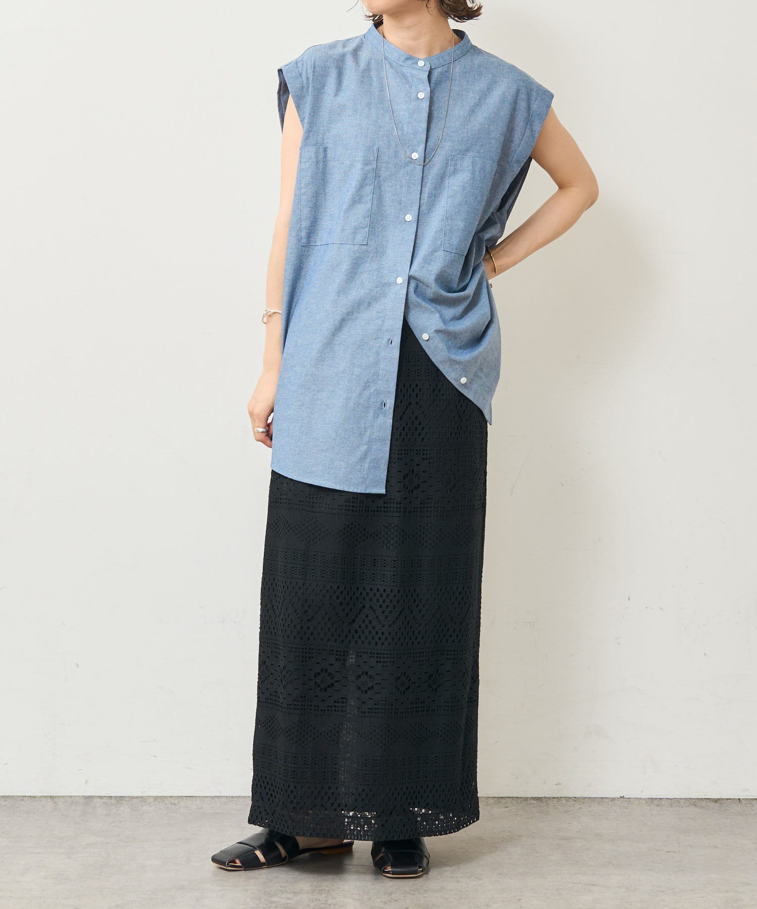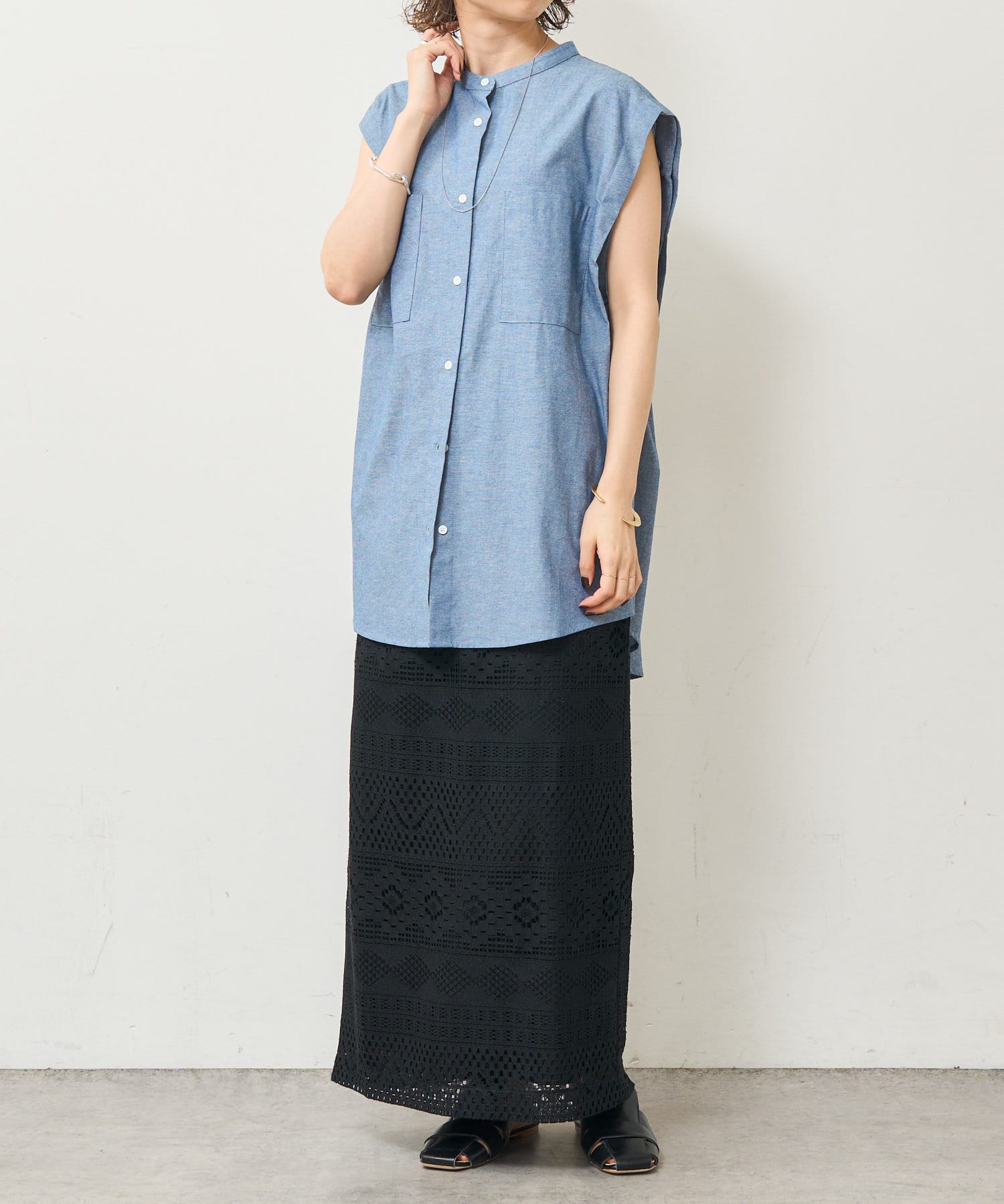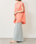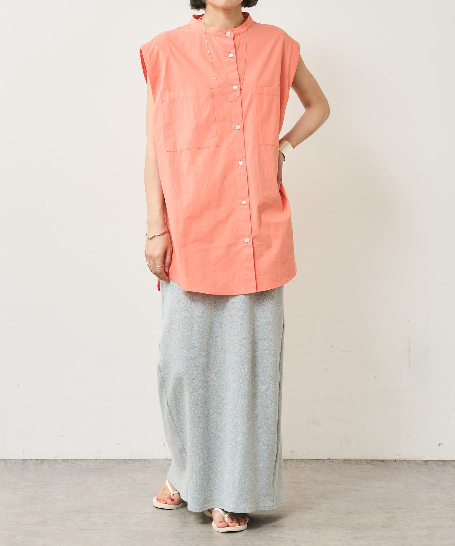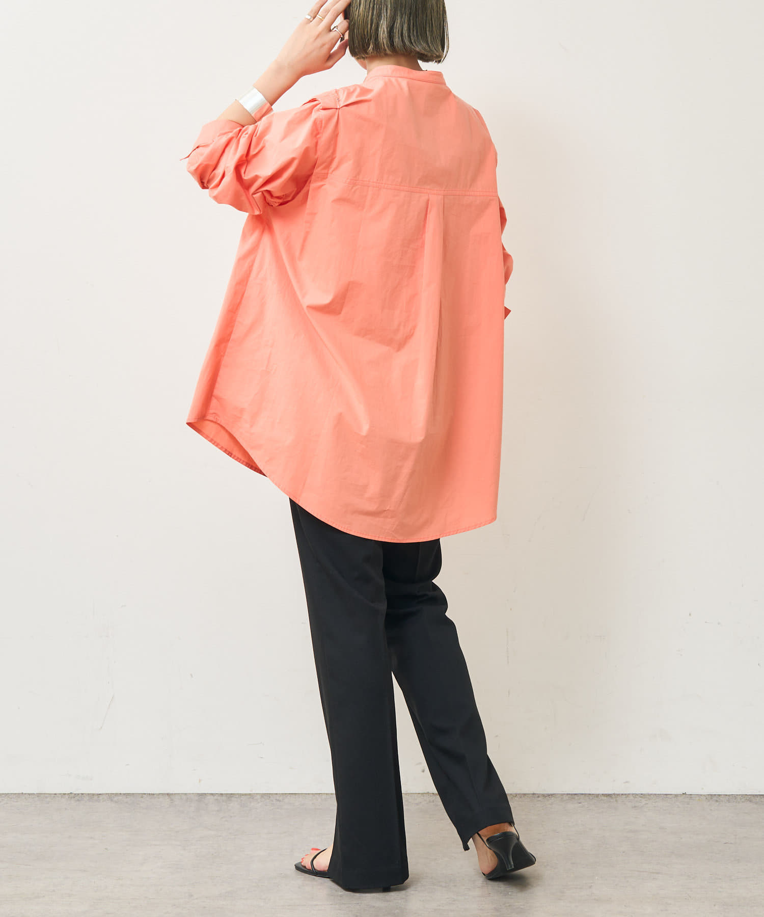 ・アーム部分にボタンが付いており、袖が取り外しができるシャツ。アームのボタンを少し外してヘルシーに肌見せしたり、着方次第でコーディネートの幅が広がる一着。