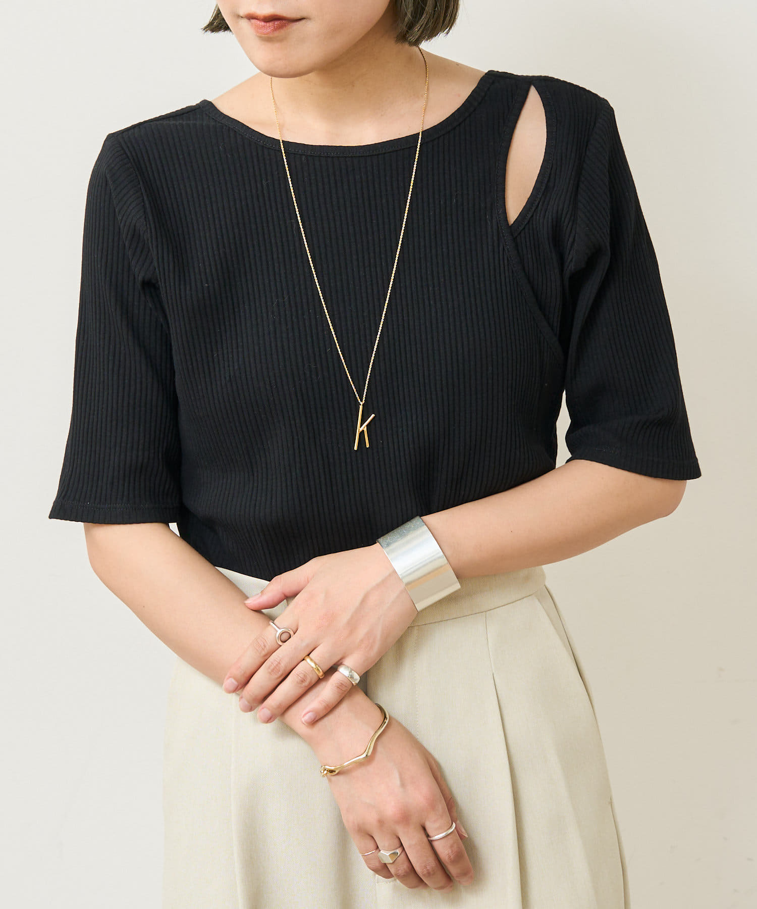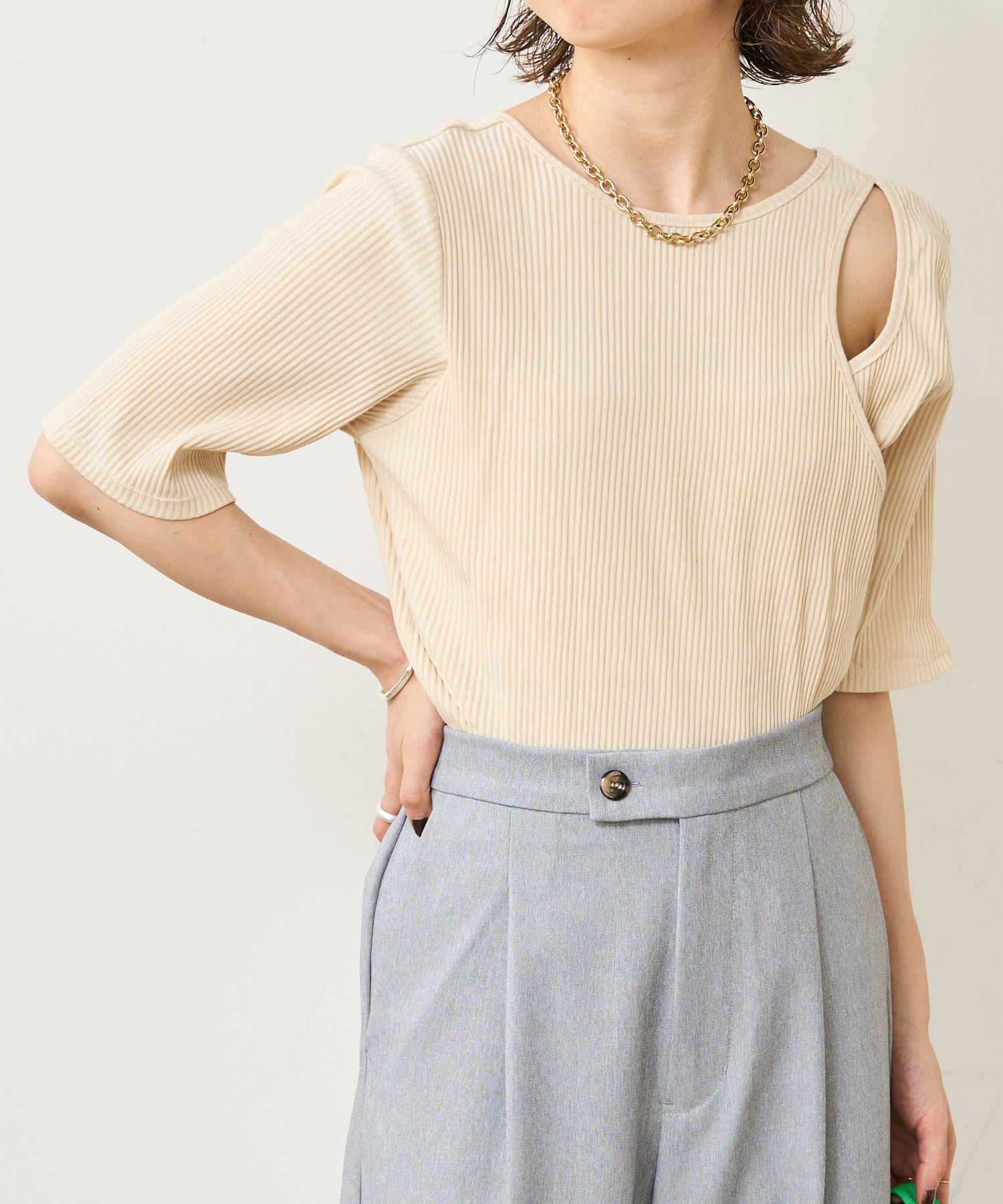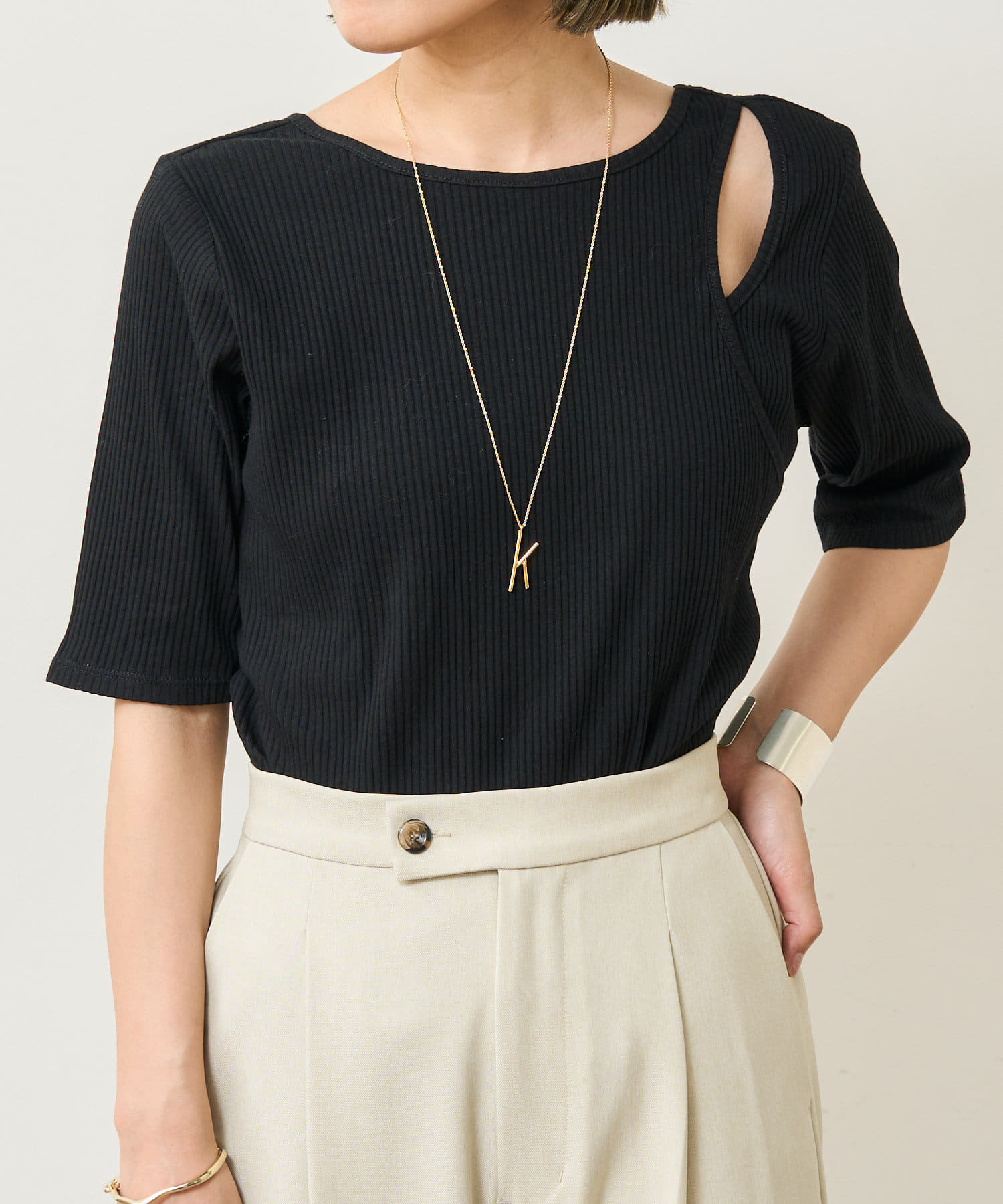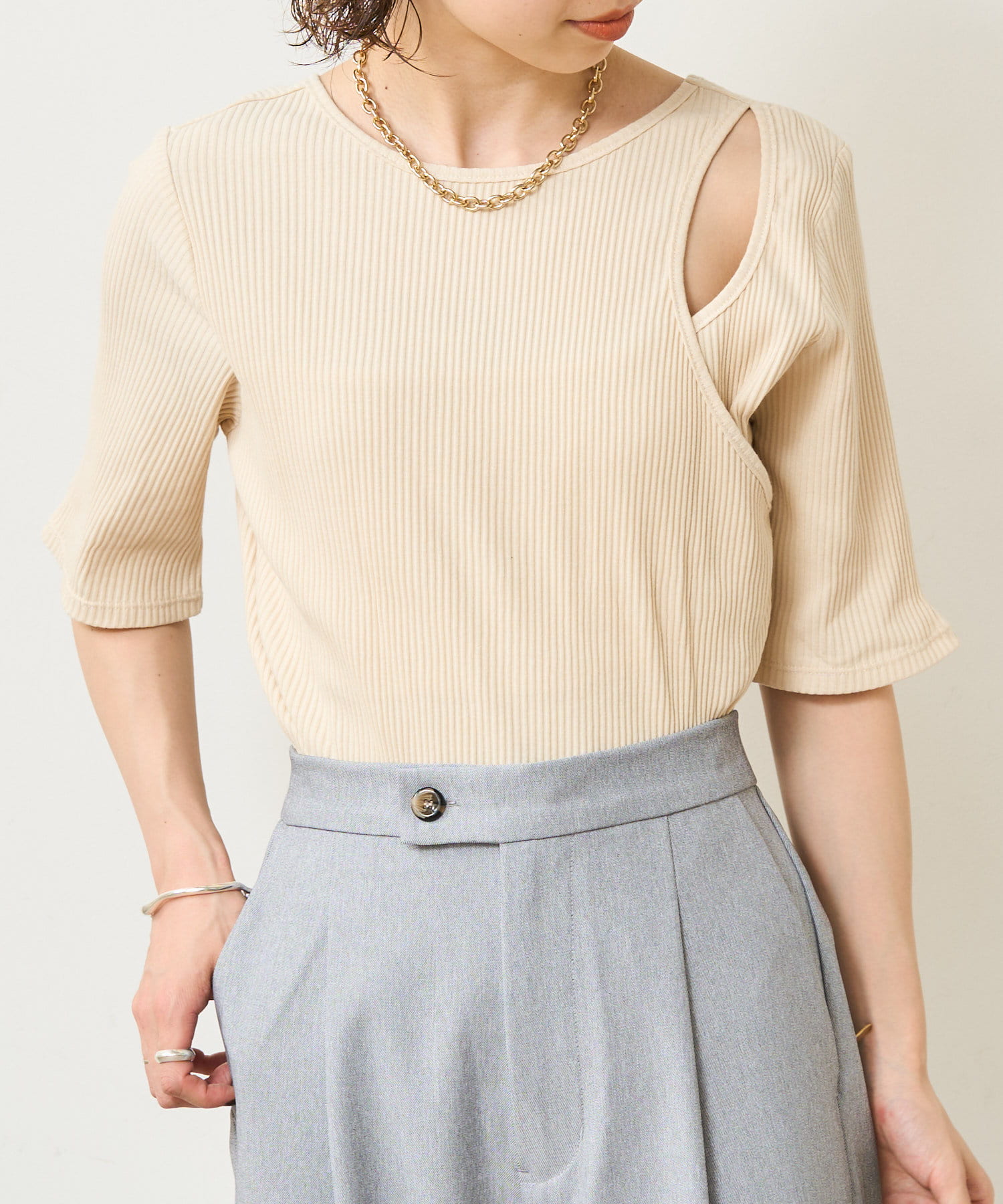 さり気ない肌見せが女性らしいアシンメトリーなリブTシャツ