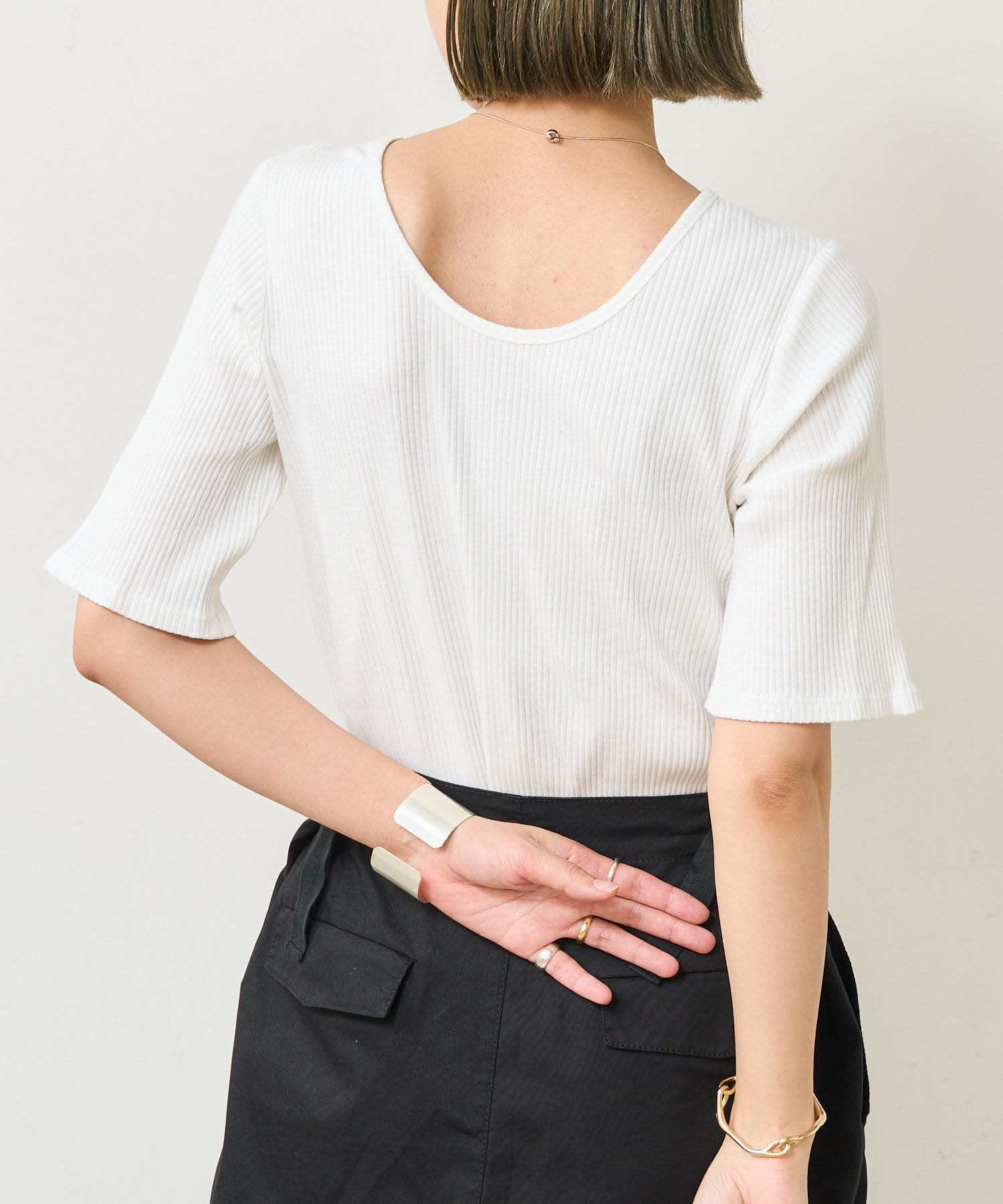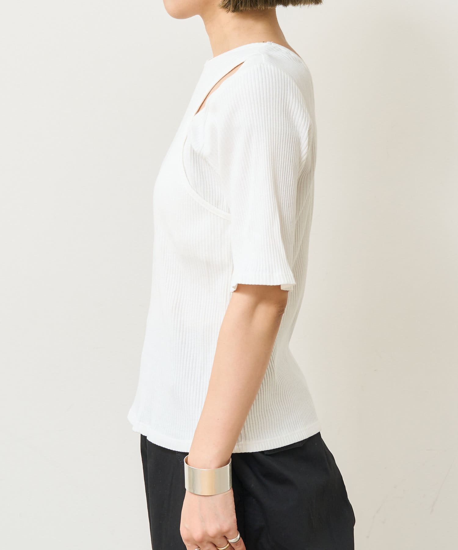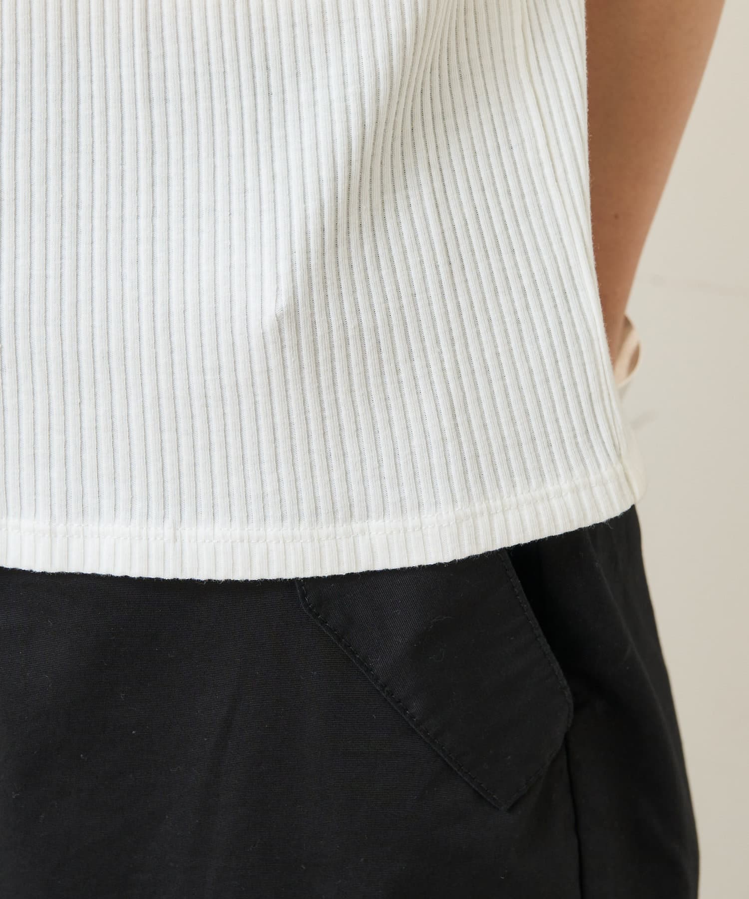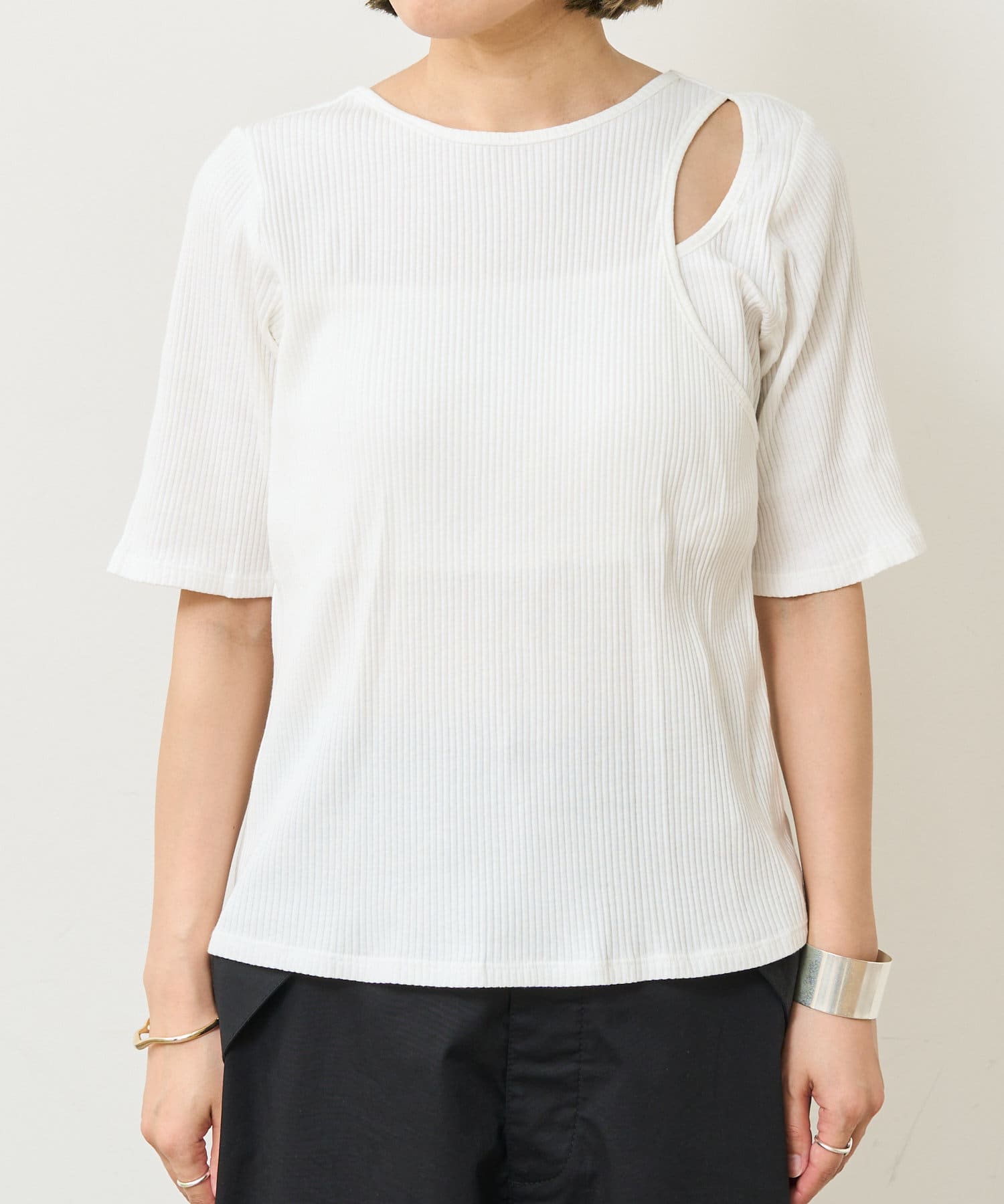 ・心地よいフィット感を味わえる、リブ素材のアシメTシャツ。