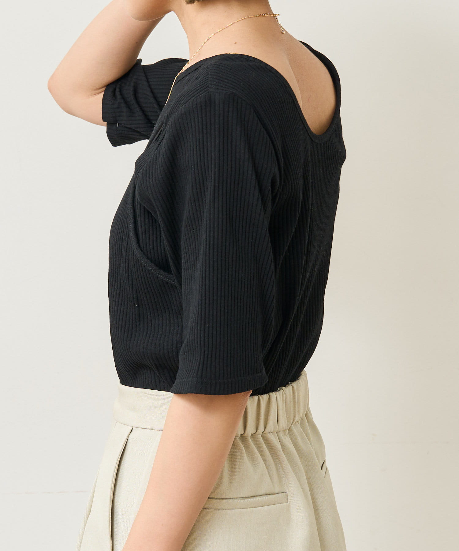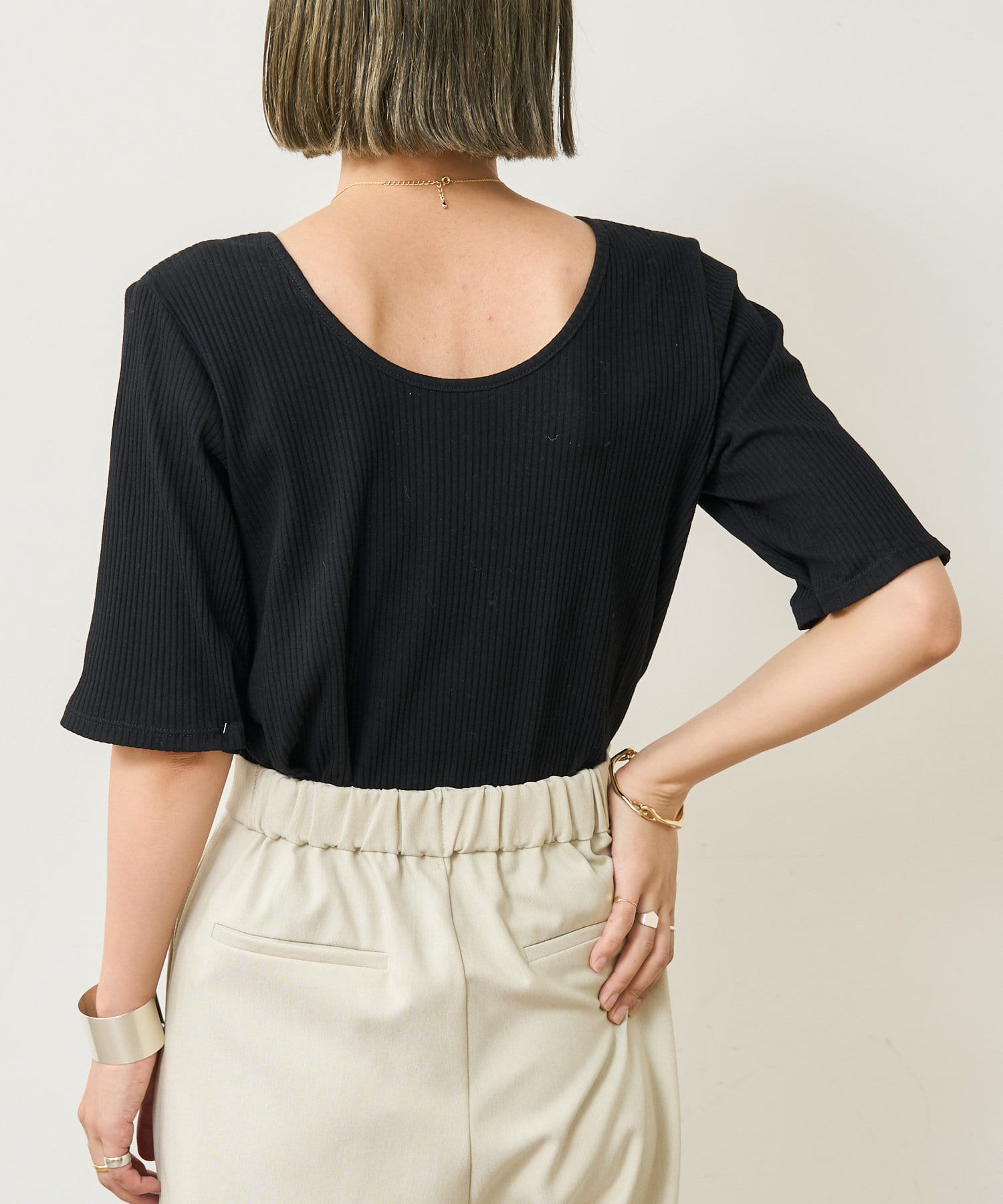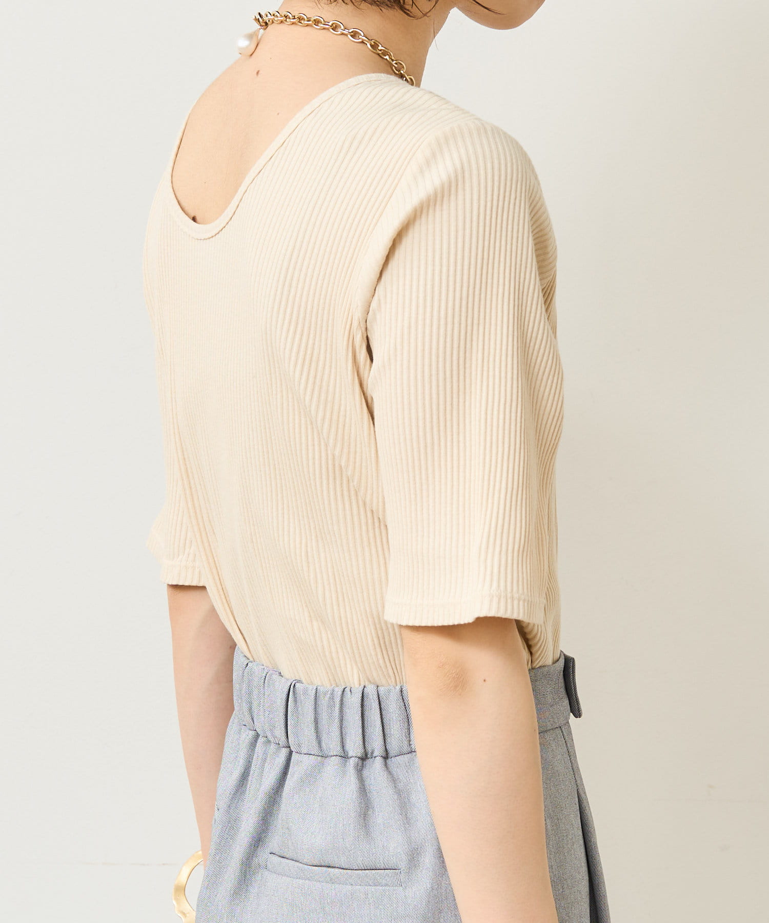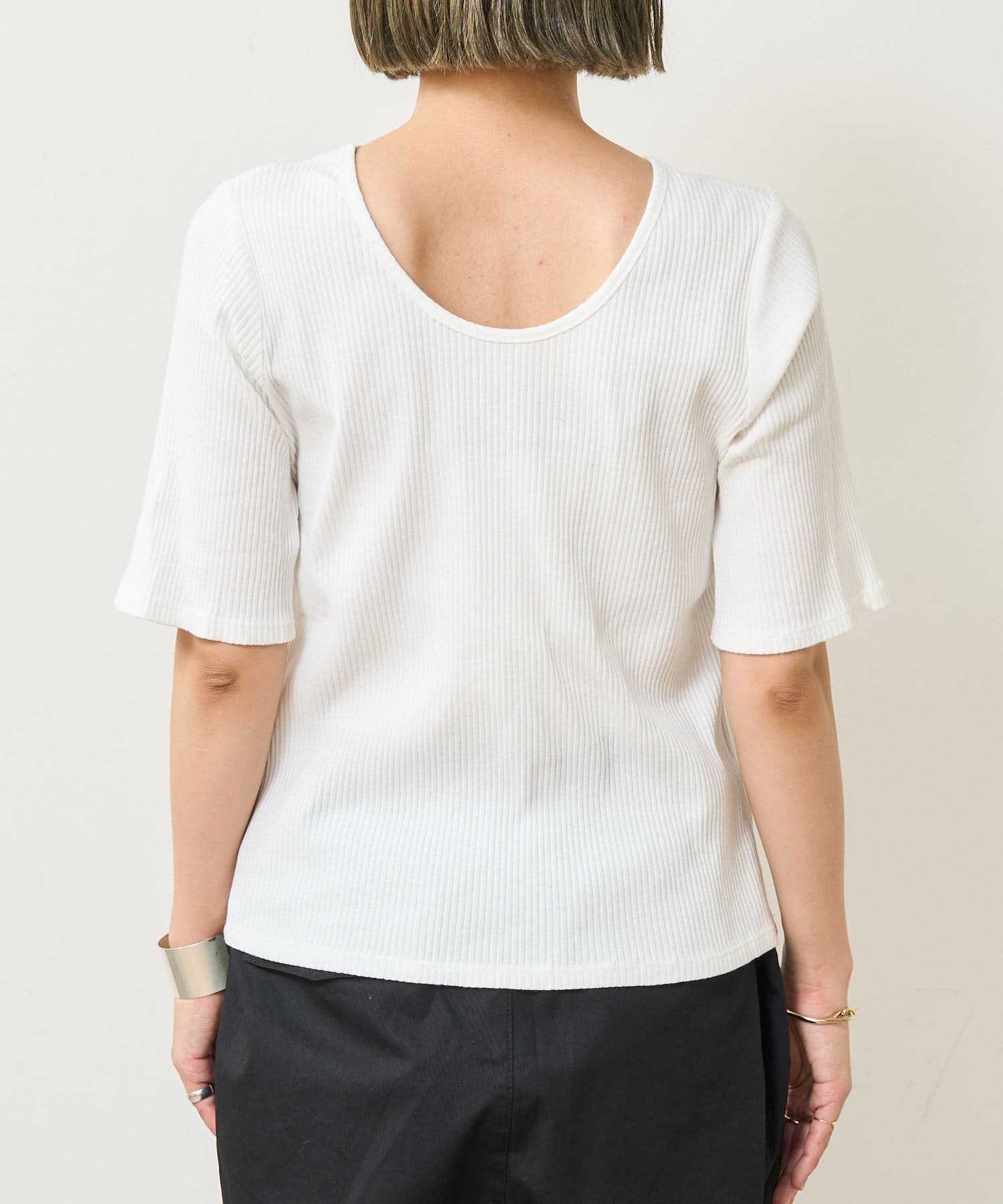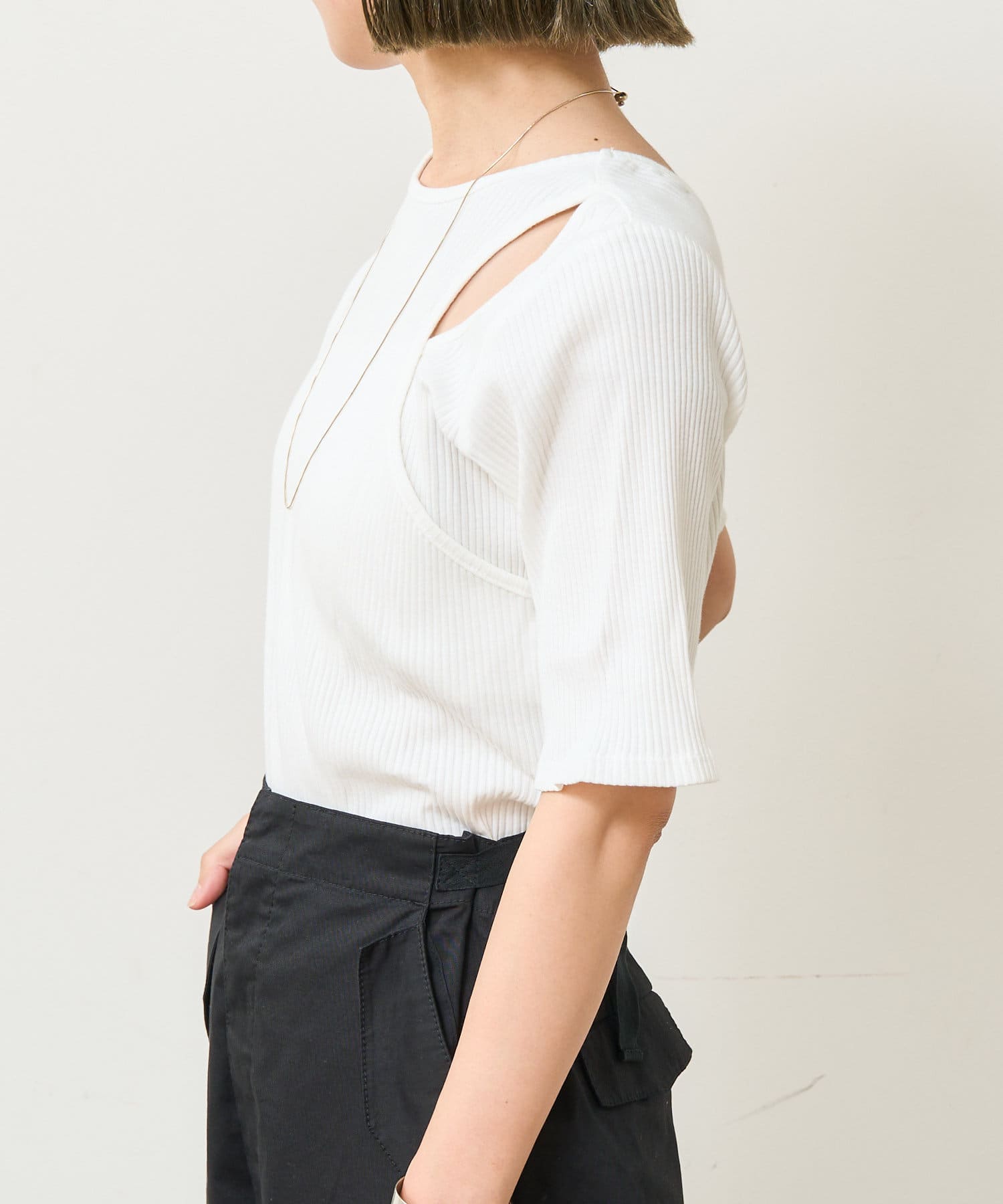 ・心地よいフィット感を味わえる、リブ素材のアシメTシャツ。