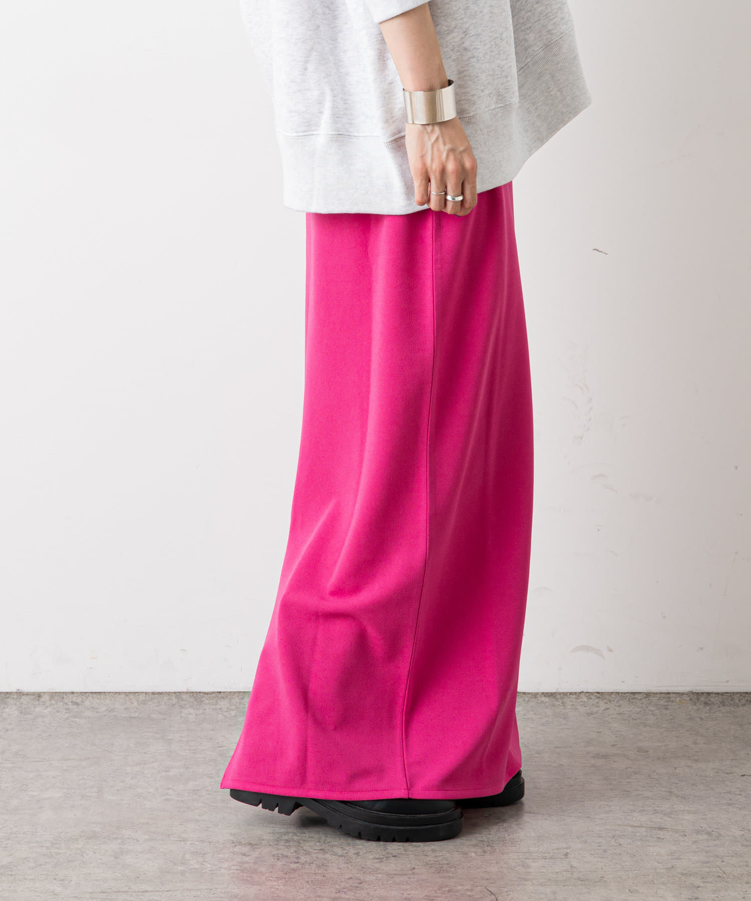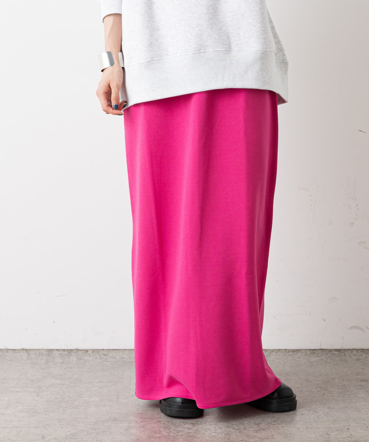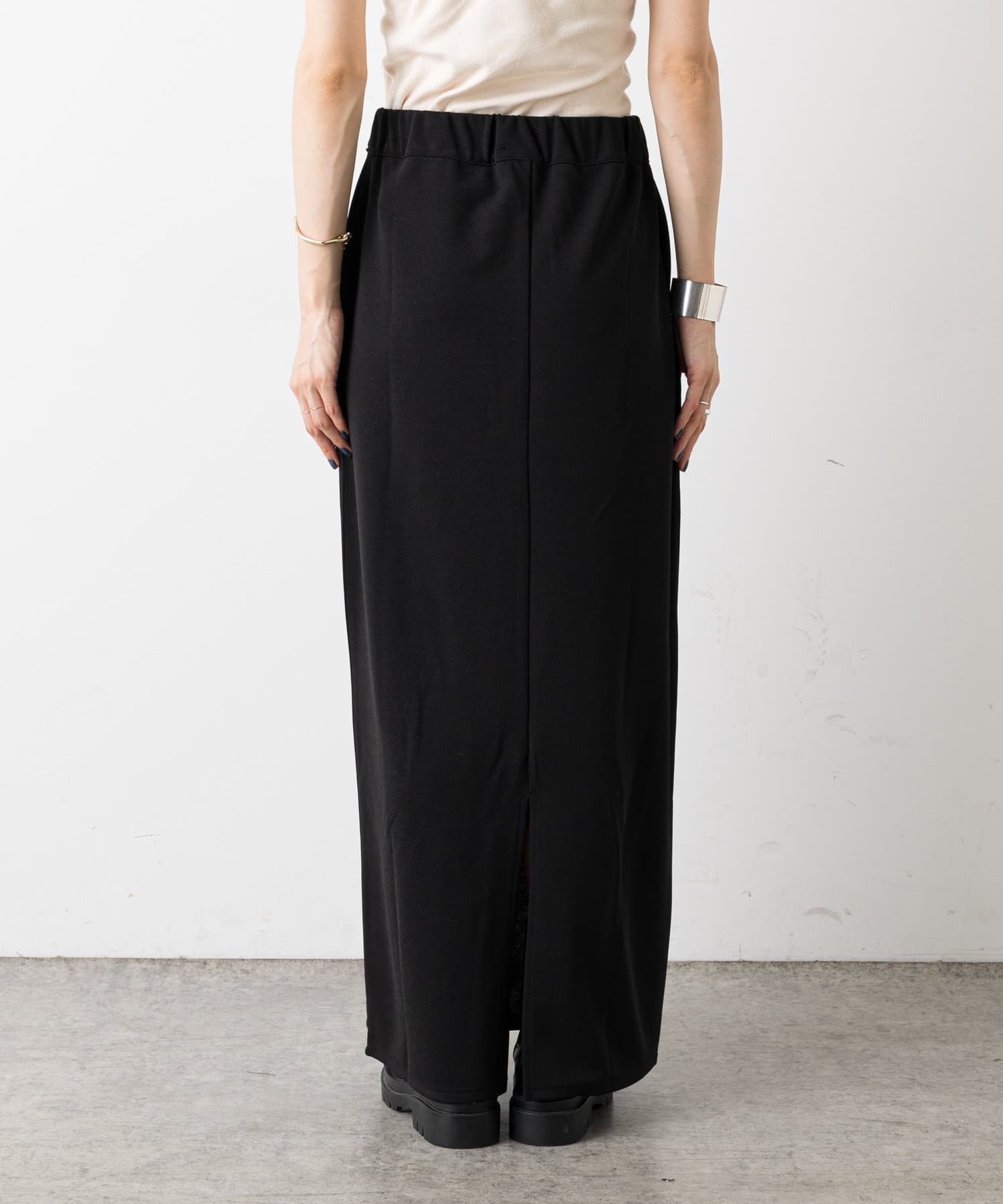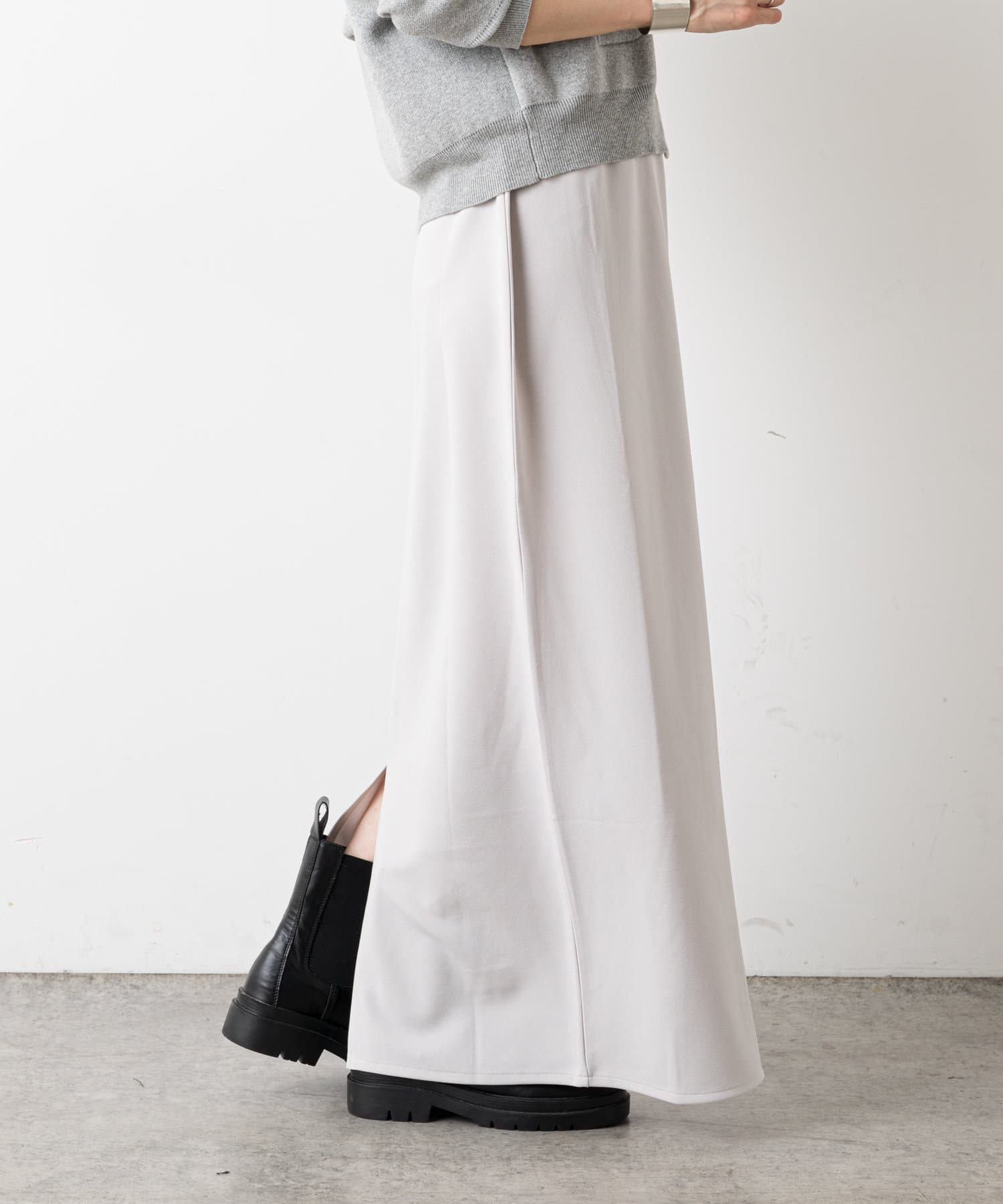 ・肌に溶け込むようなしっとり感のある着心地のロングスカート。伸縮性のある生地とウエストのゴム仕様で、タイトなシルエットですがリラクシーな履き心地です。
