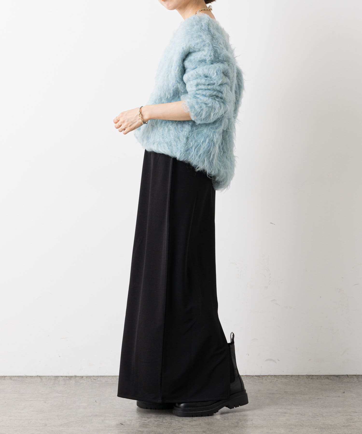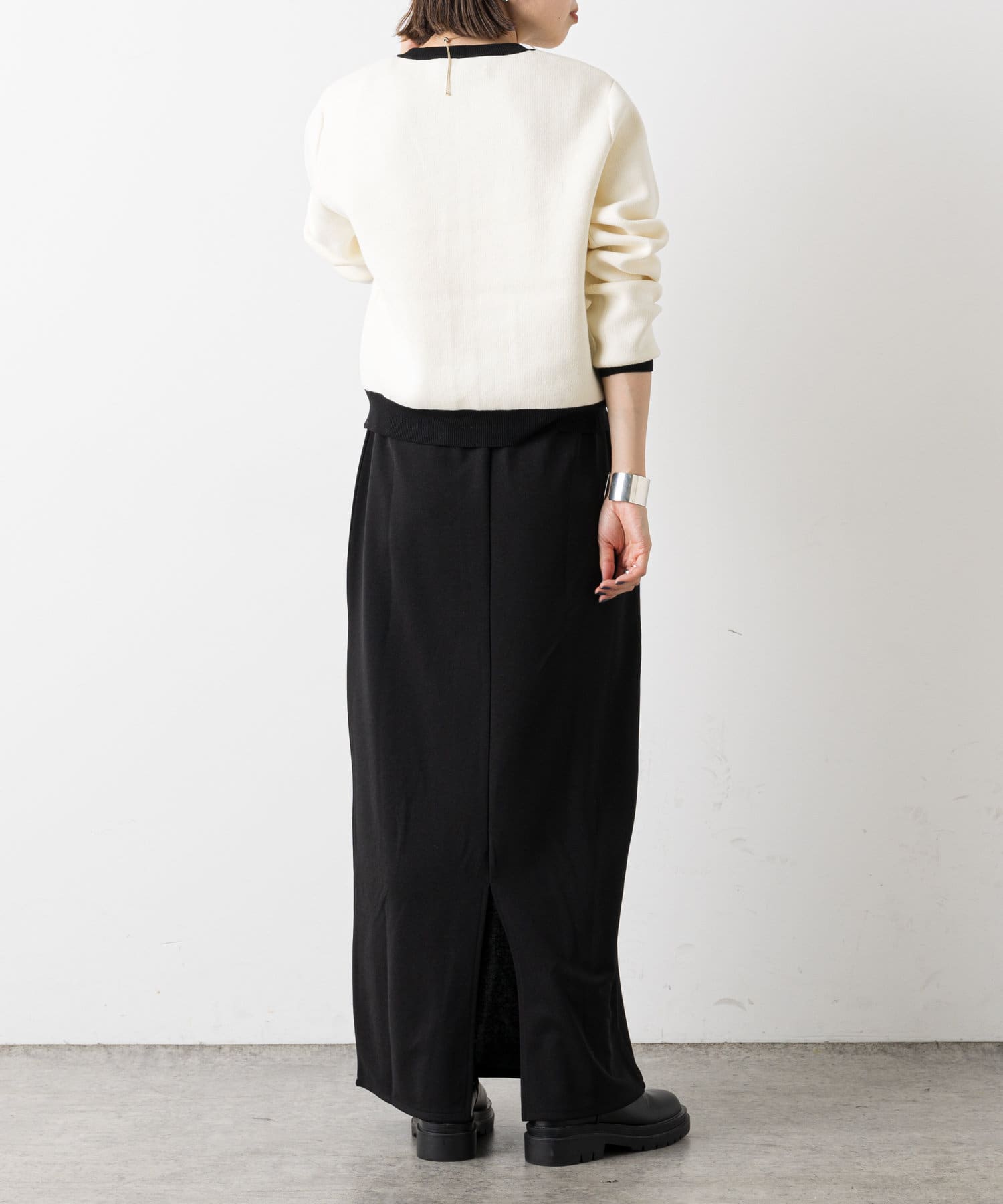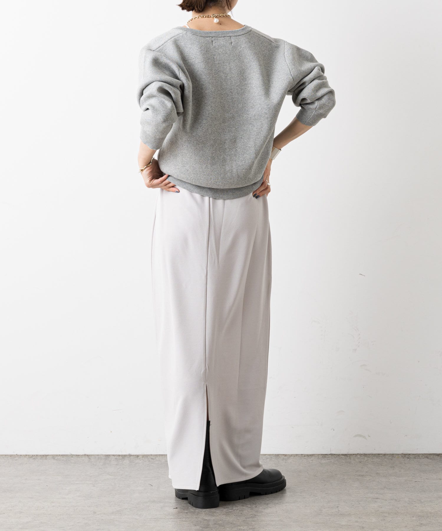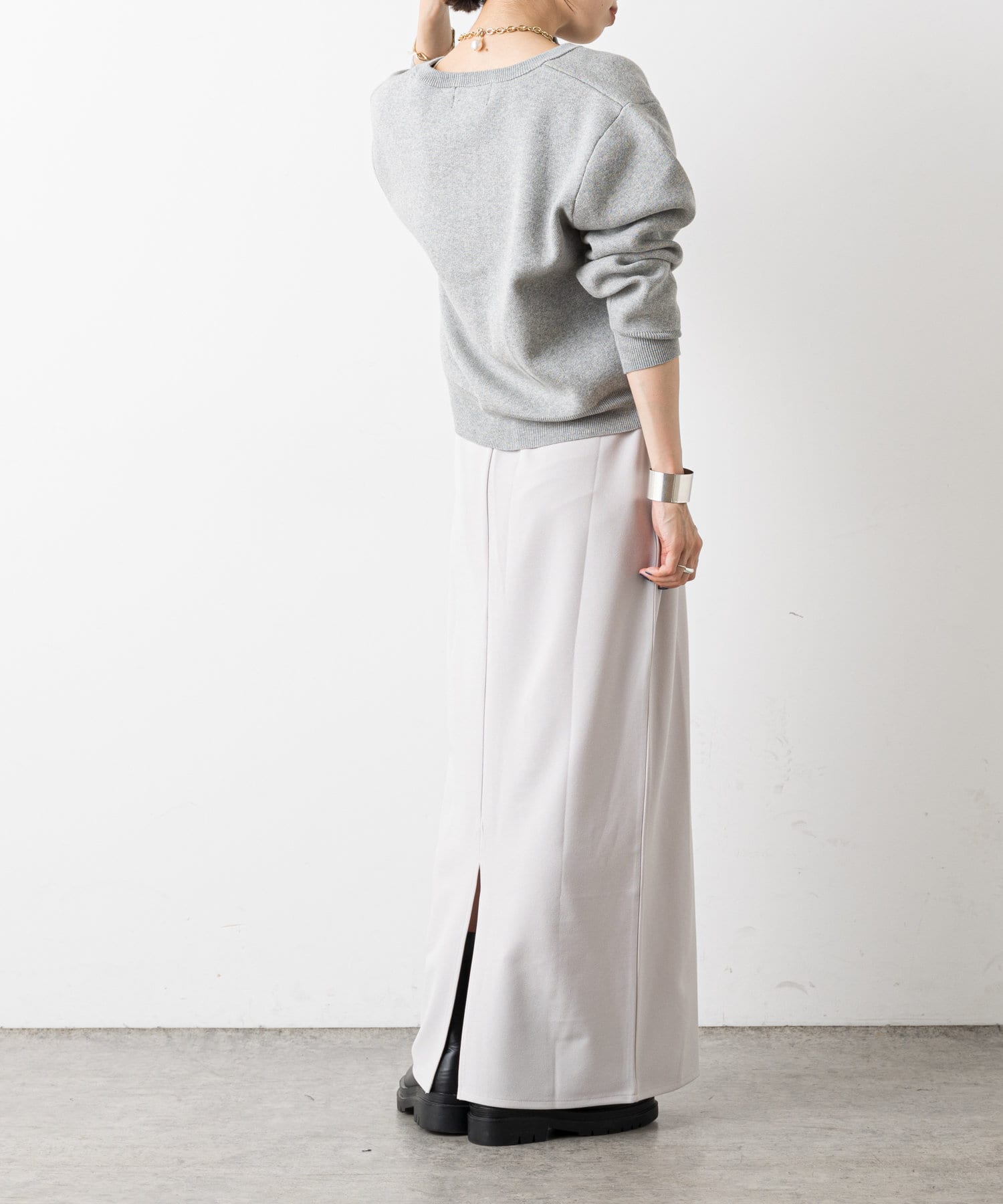 ・肌に溶け込むようなしっとり感のある着心地のロングスカート。伸縮性のある生地とウエストのゴム仕様で、タイトなシルエットですがリラクシーな履き心地です。