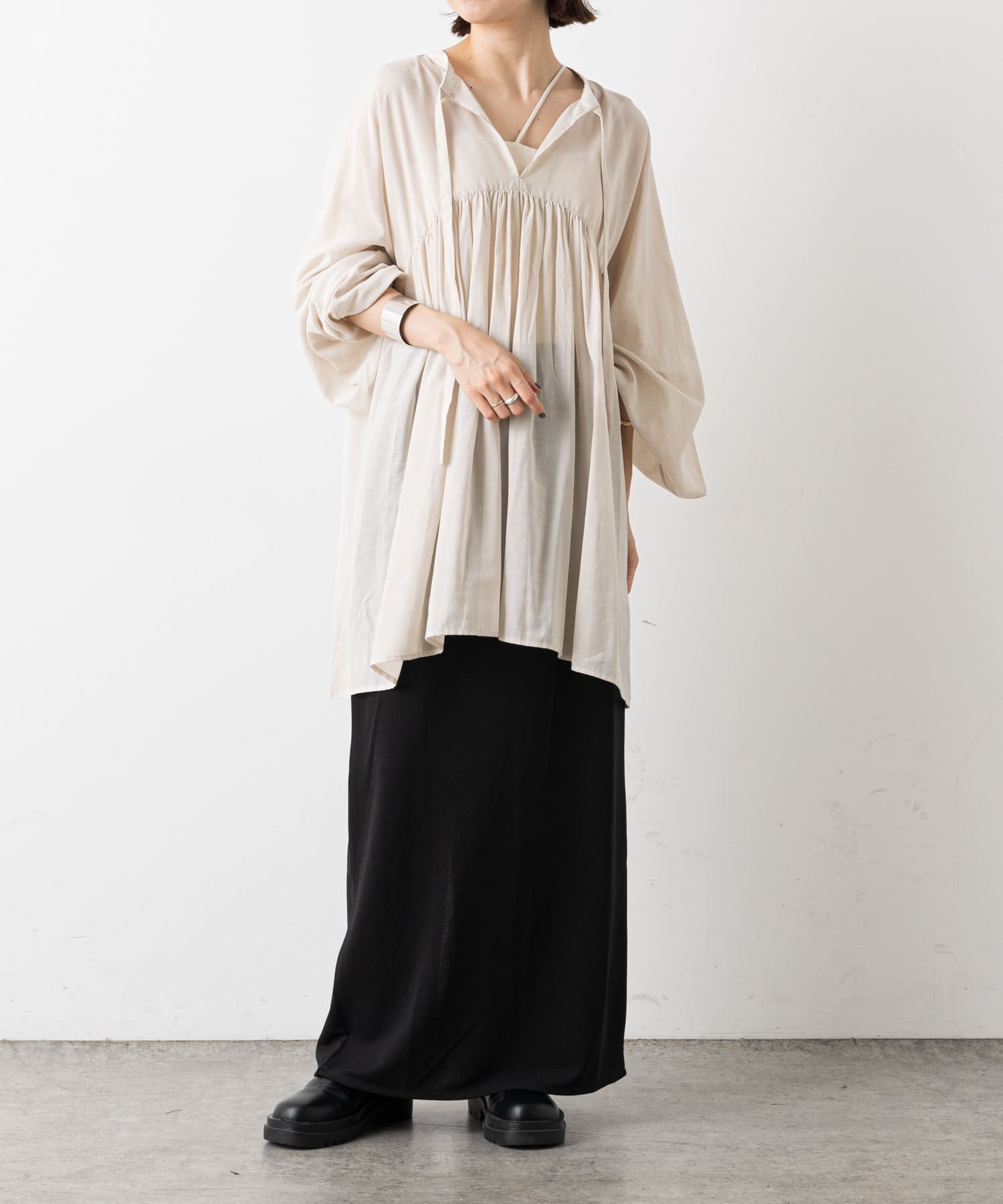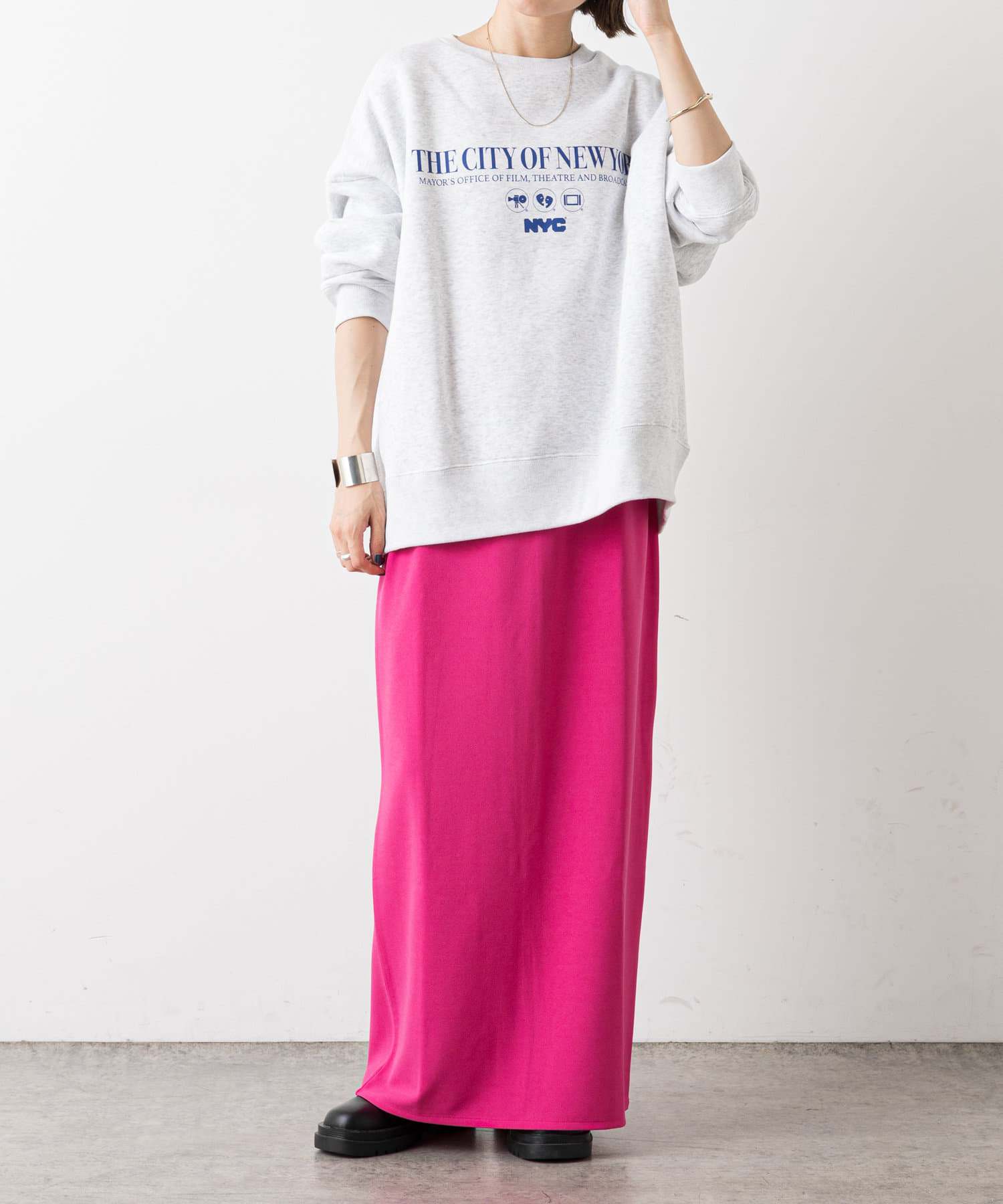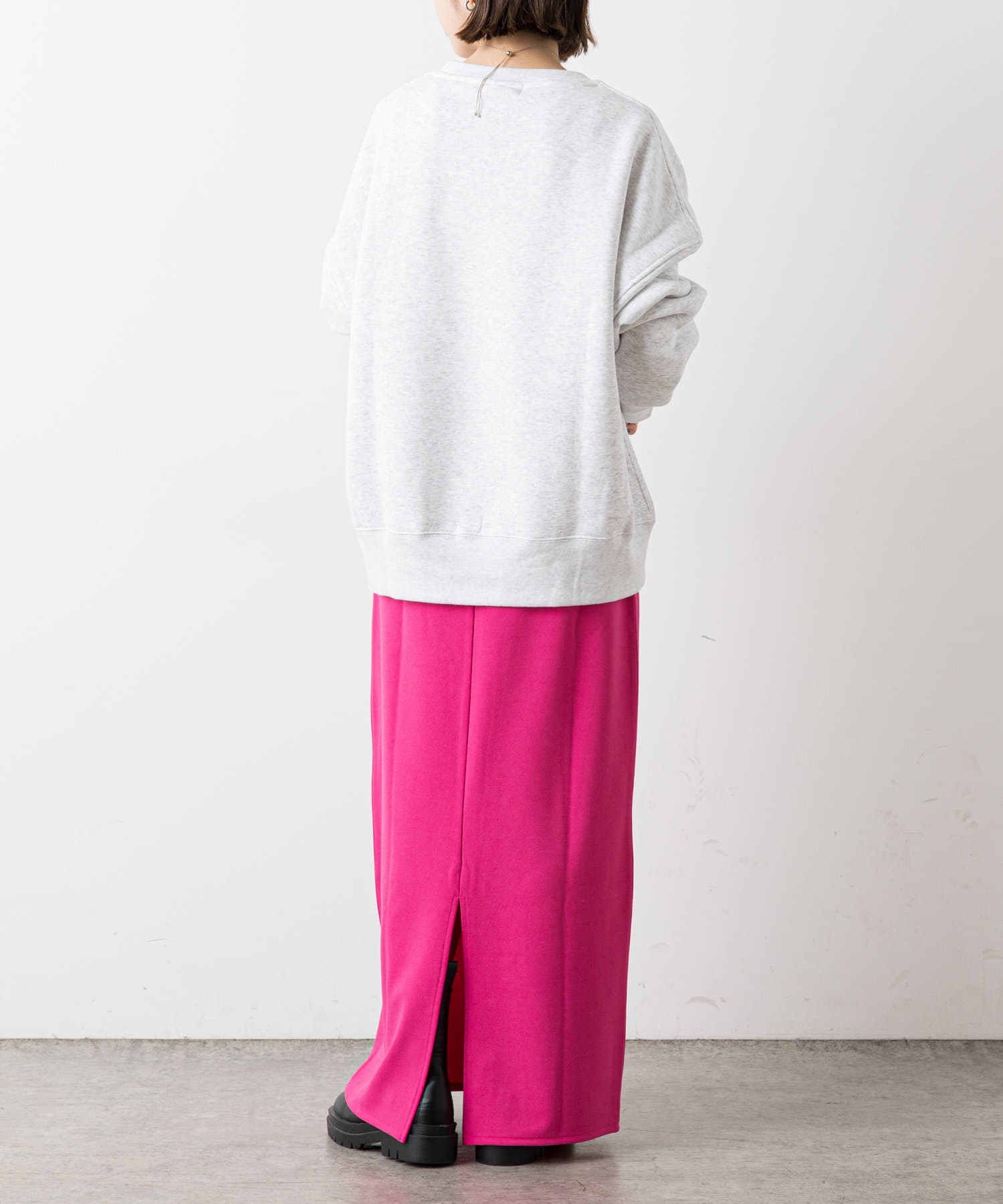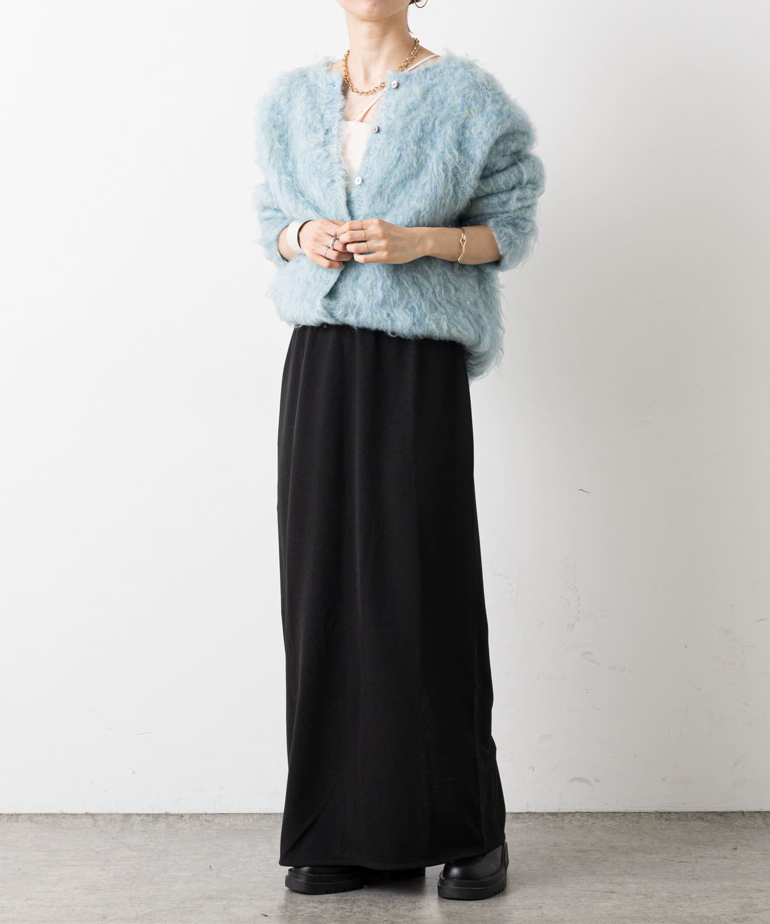 ・肌に溶け込むようなしっとり感のある着心地のロングスカート。伸縮性のある生地とウエストのゴム仕様で、タイトなシルエットですがリラクシーな履き心地です。
