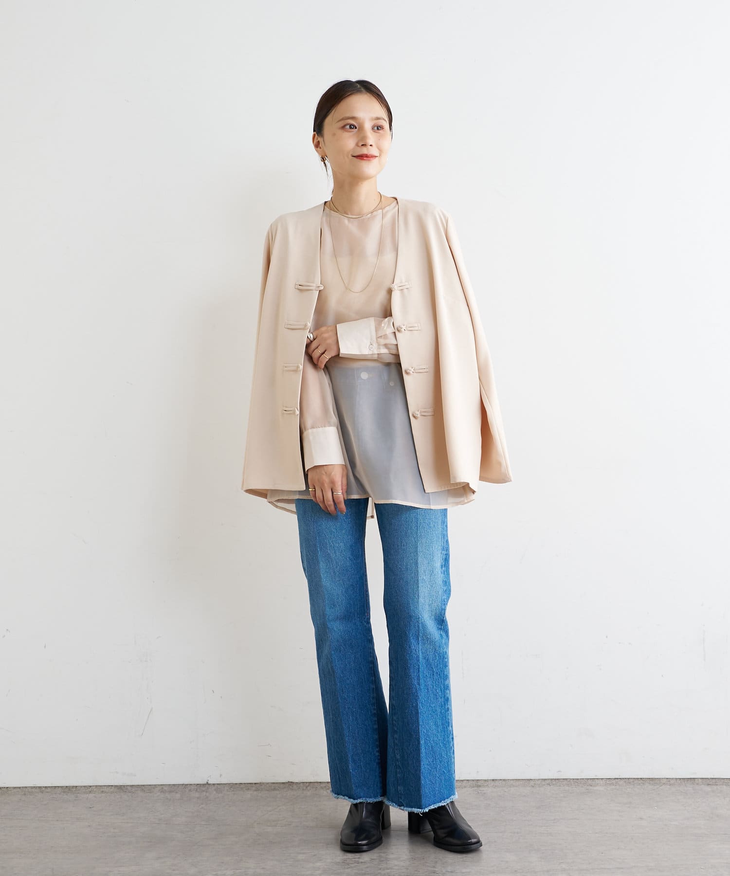 ・ノーカラーデザインが首回りをすっきりと見せてくれて、アクセサリーや小物が映える一着。