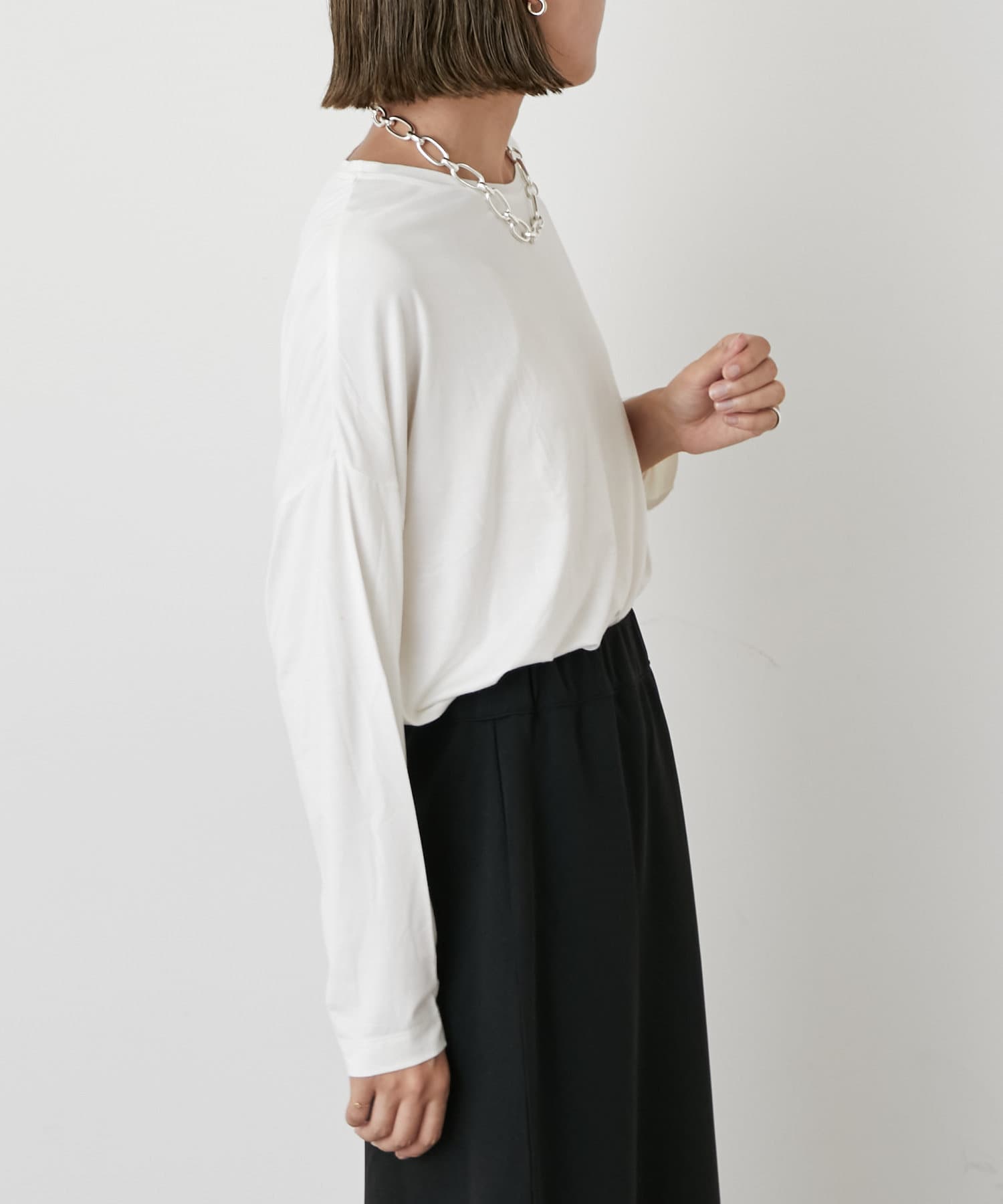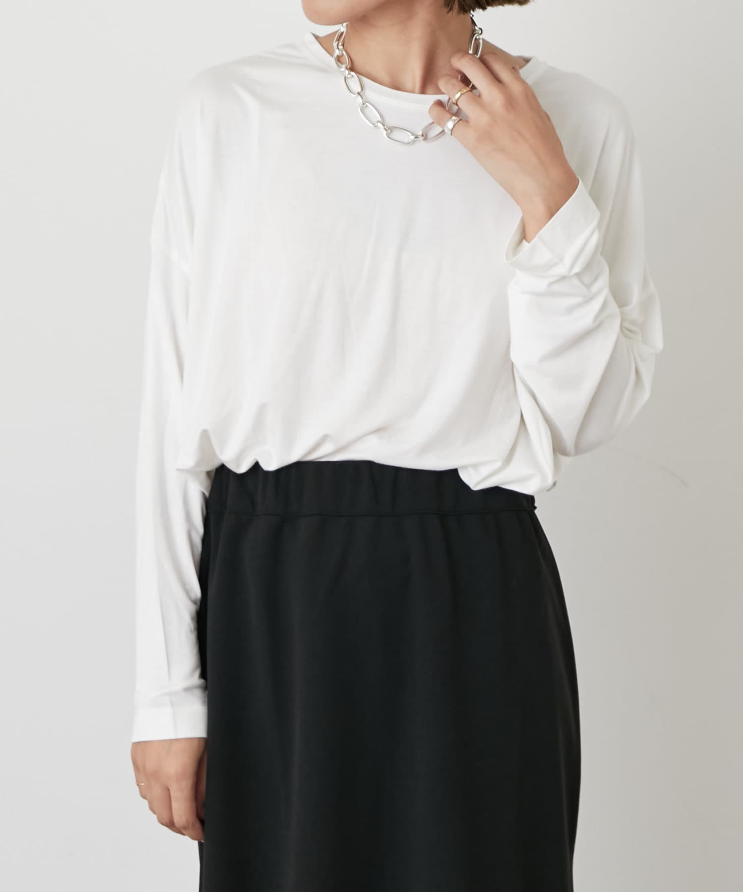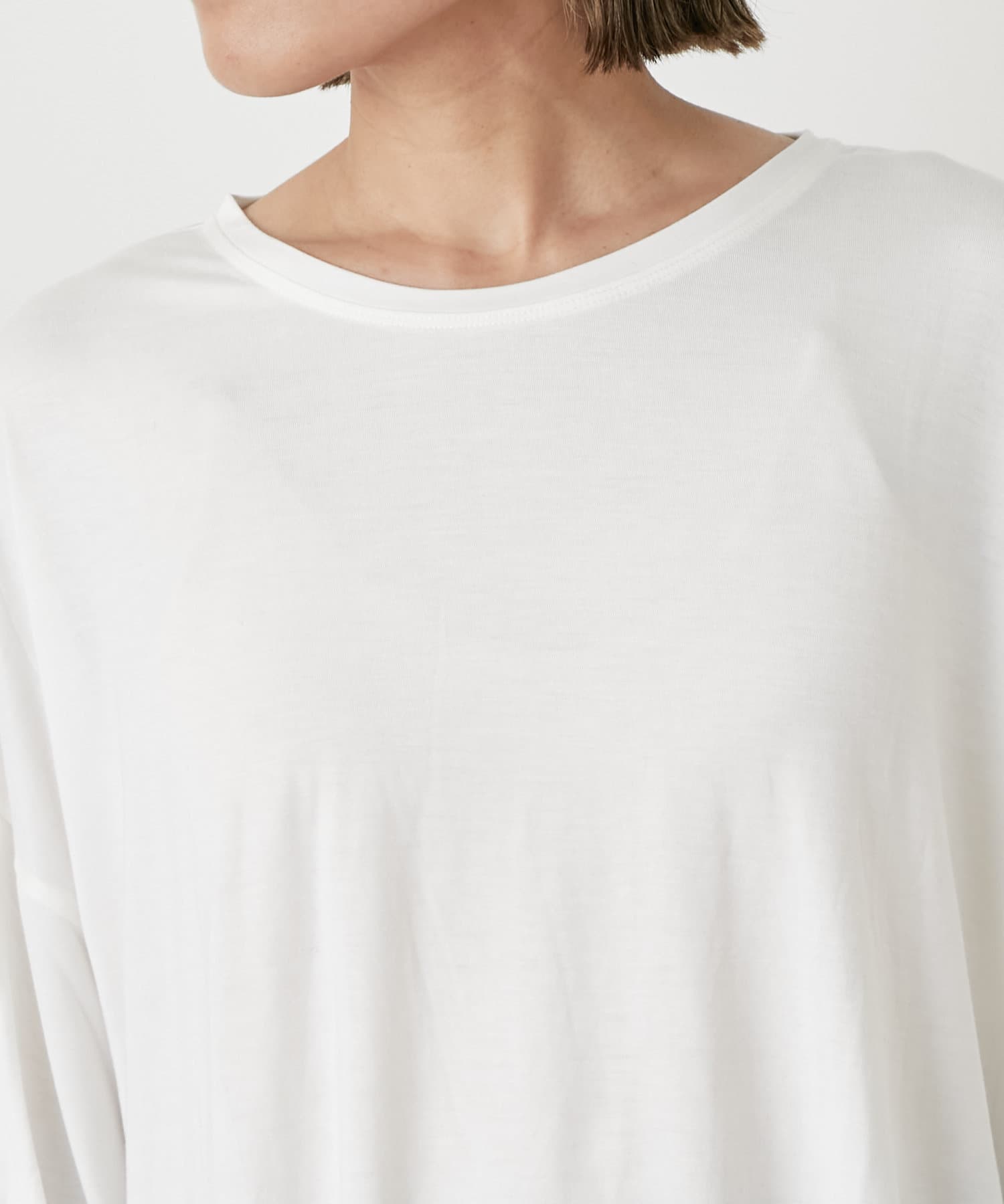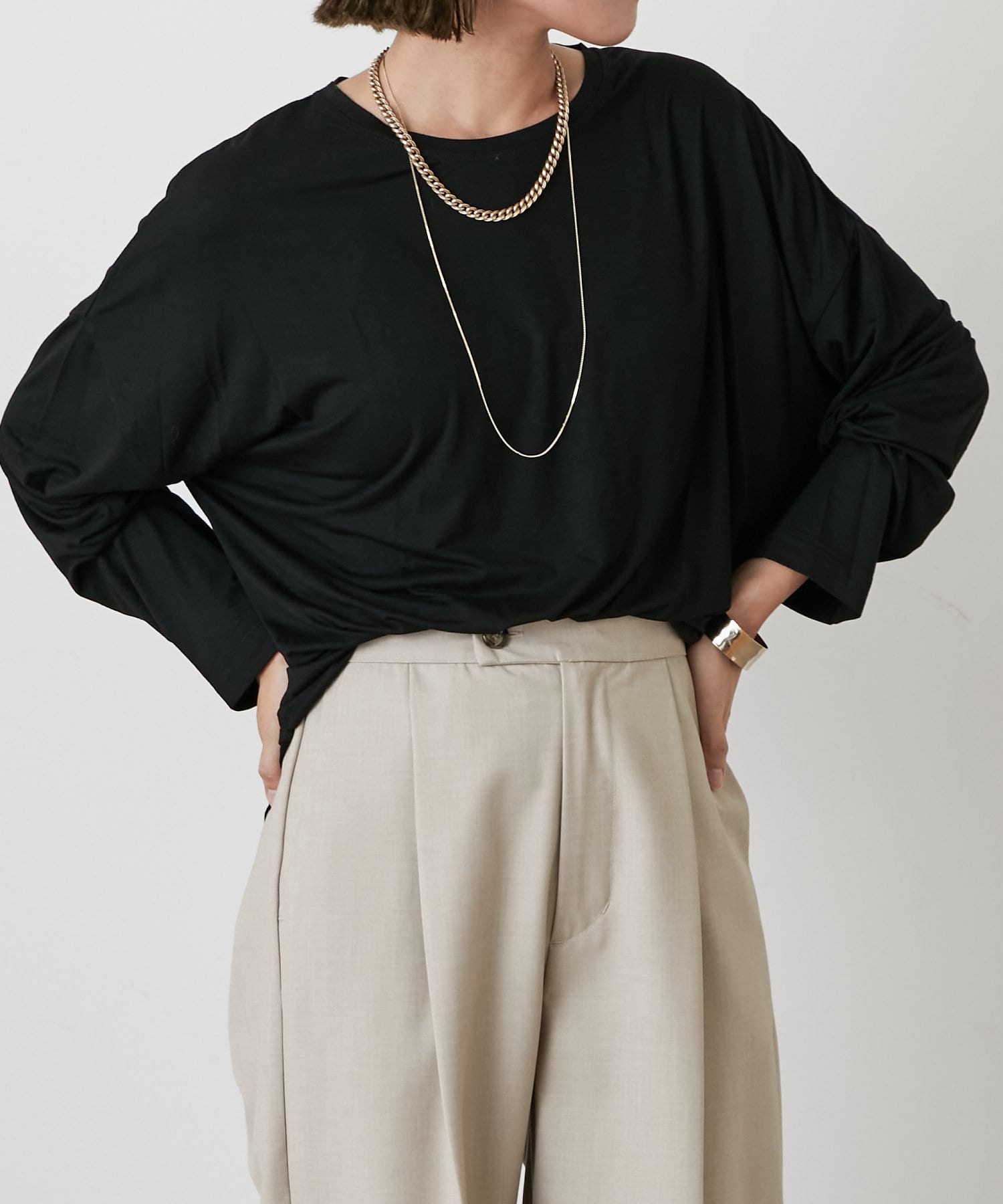 ・柔らかく肌馴染みの良い生地を使用しており、程よいシアー感が今年らしいレイヤードにもぴったりな一枚。