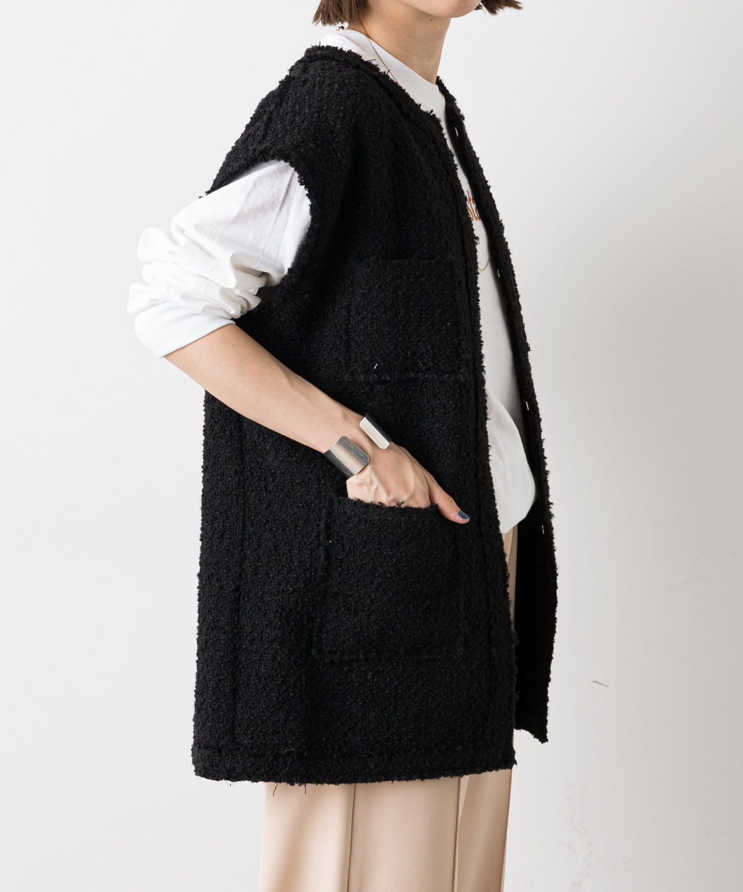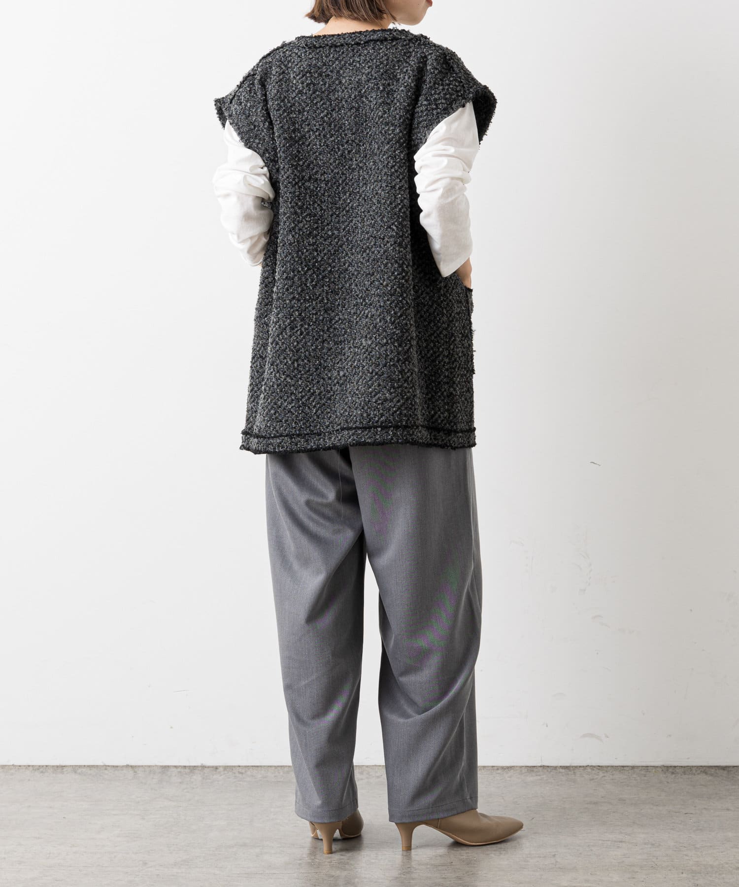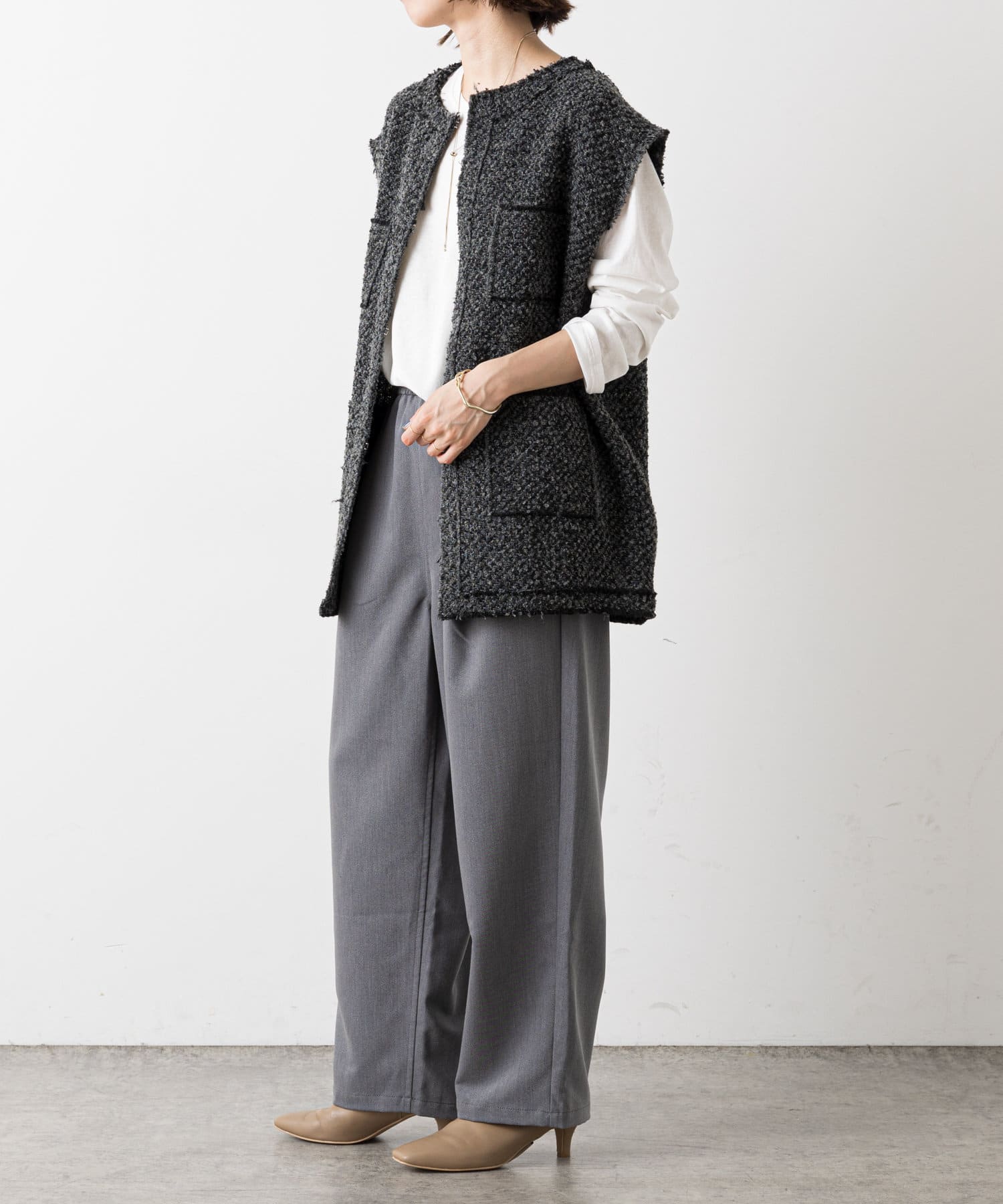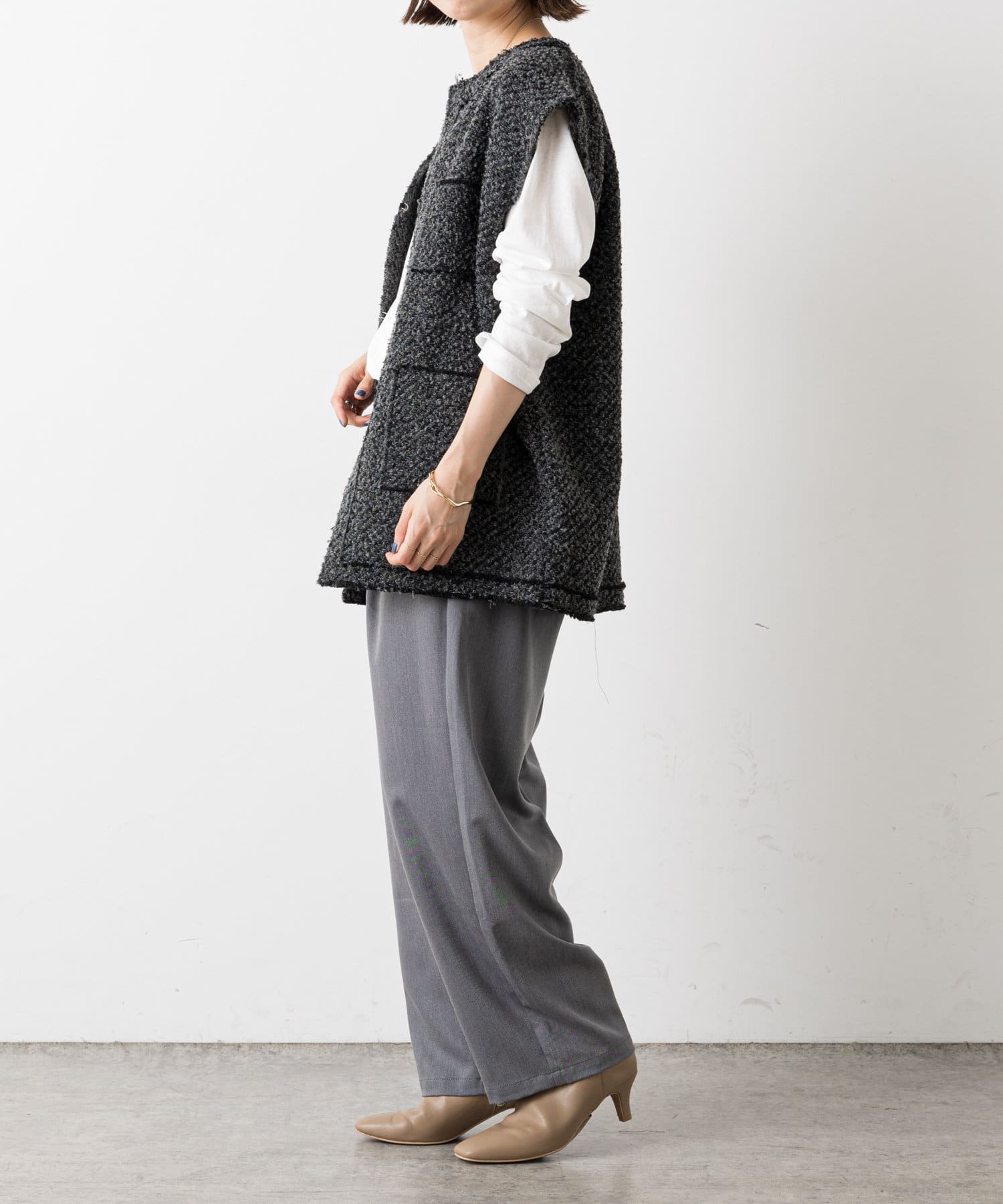 ・秋冬らしいツイード生地を使用したベストは、スタイリングにプラスするだけで一気にこなれた印象に仕上げてくれます。