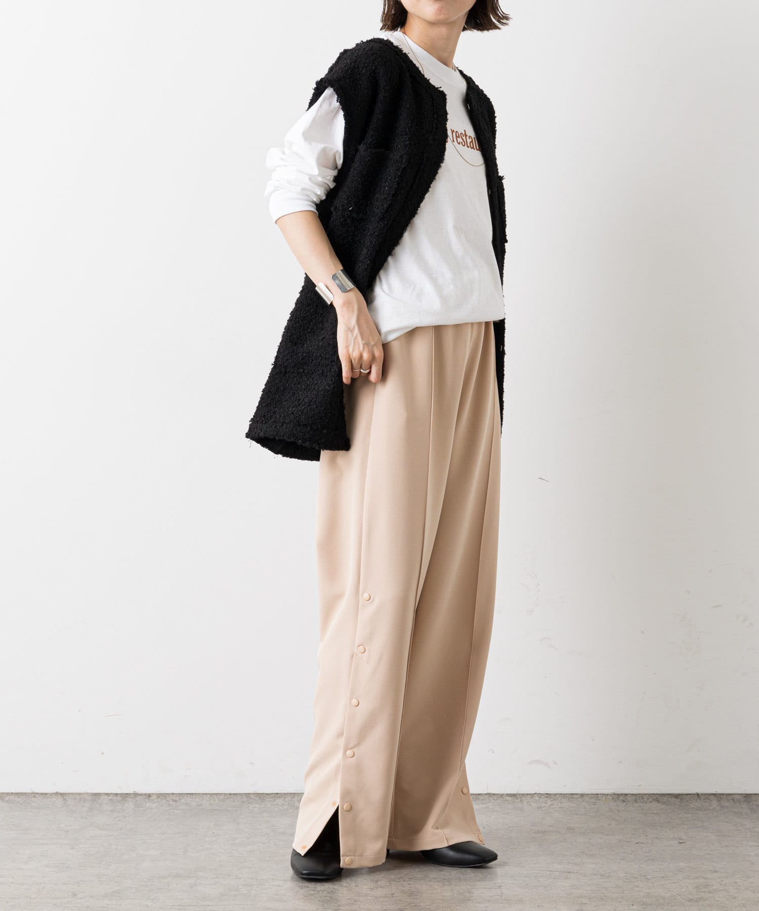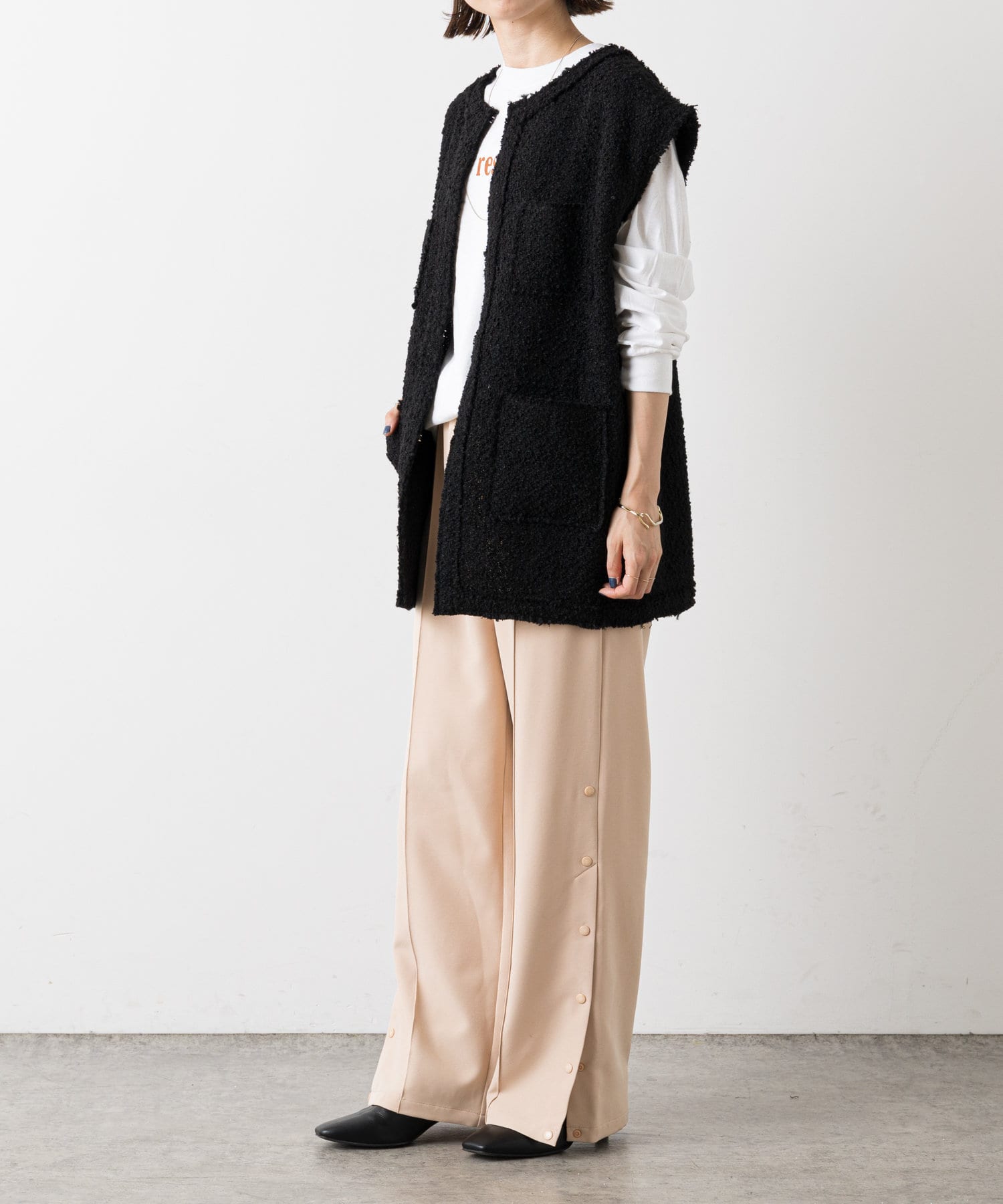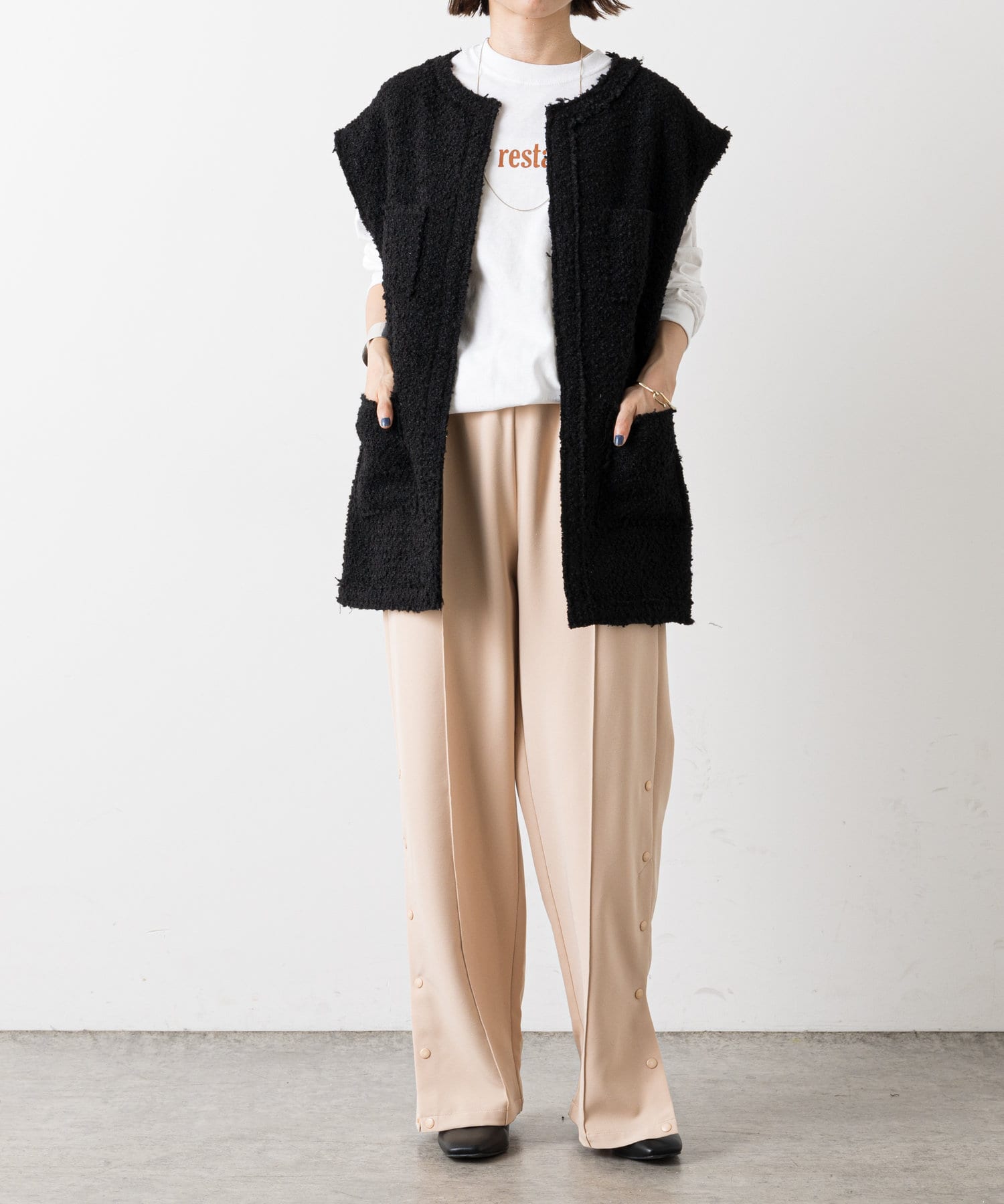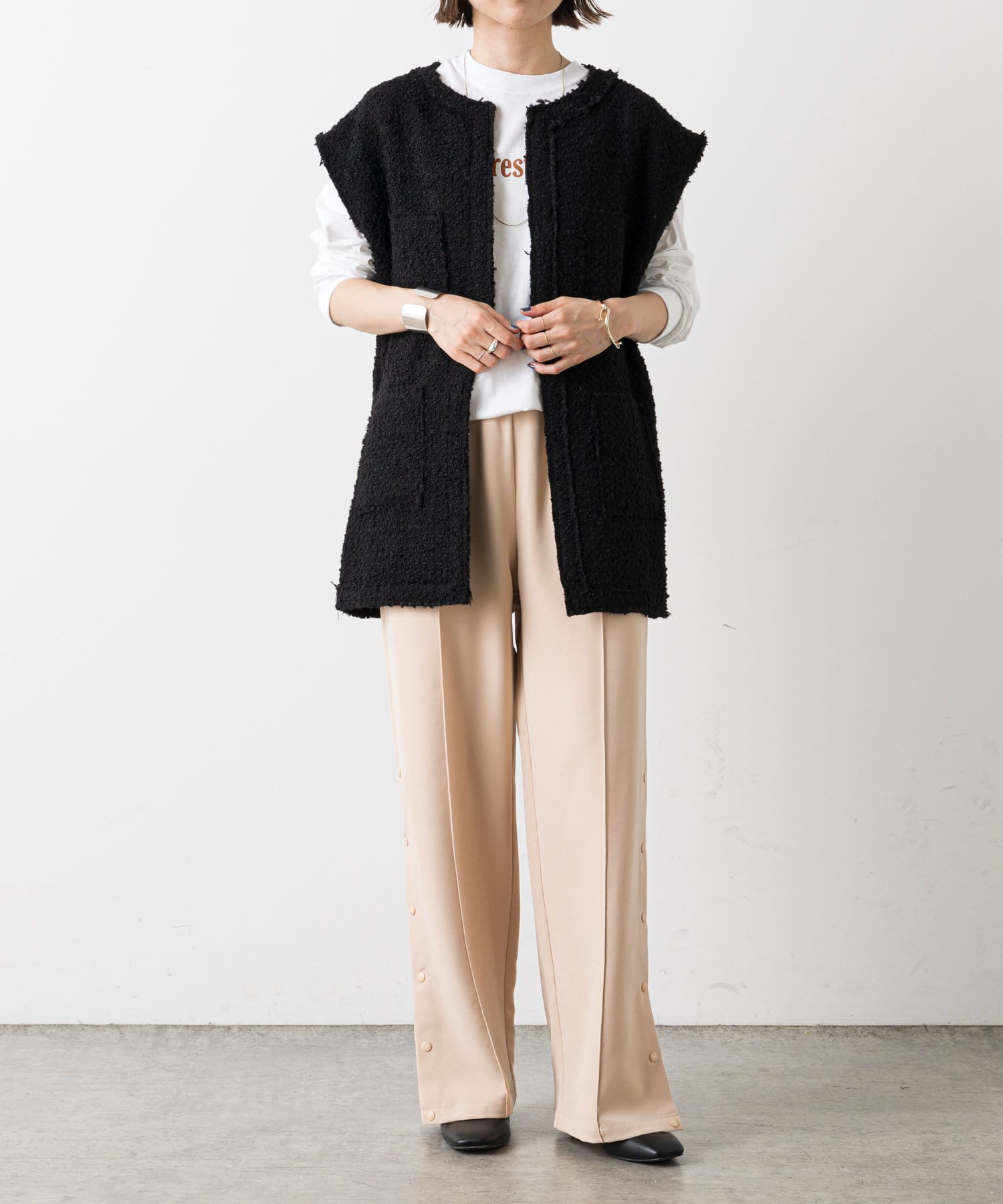 ・秋冬らしいツイード生地を使用したベストは、スタイリングにプラスするだけで一気にこなれた印象に仕上げてくれます。