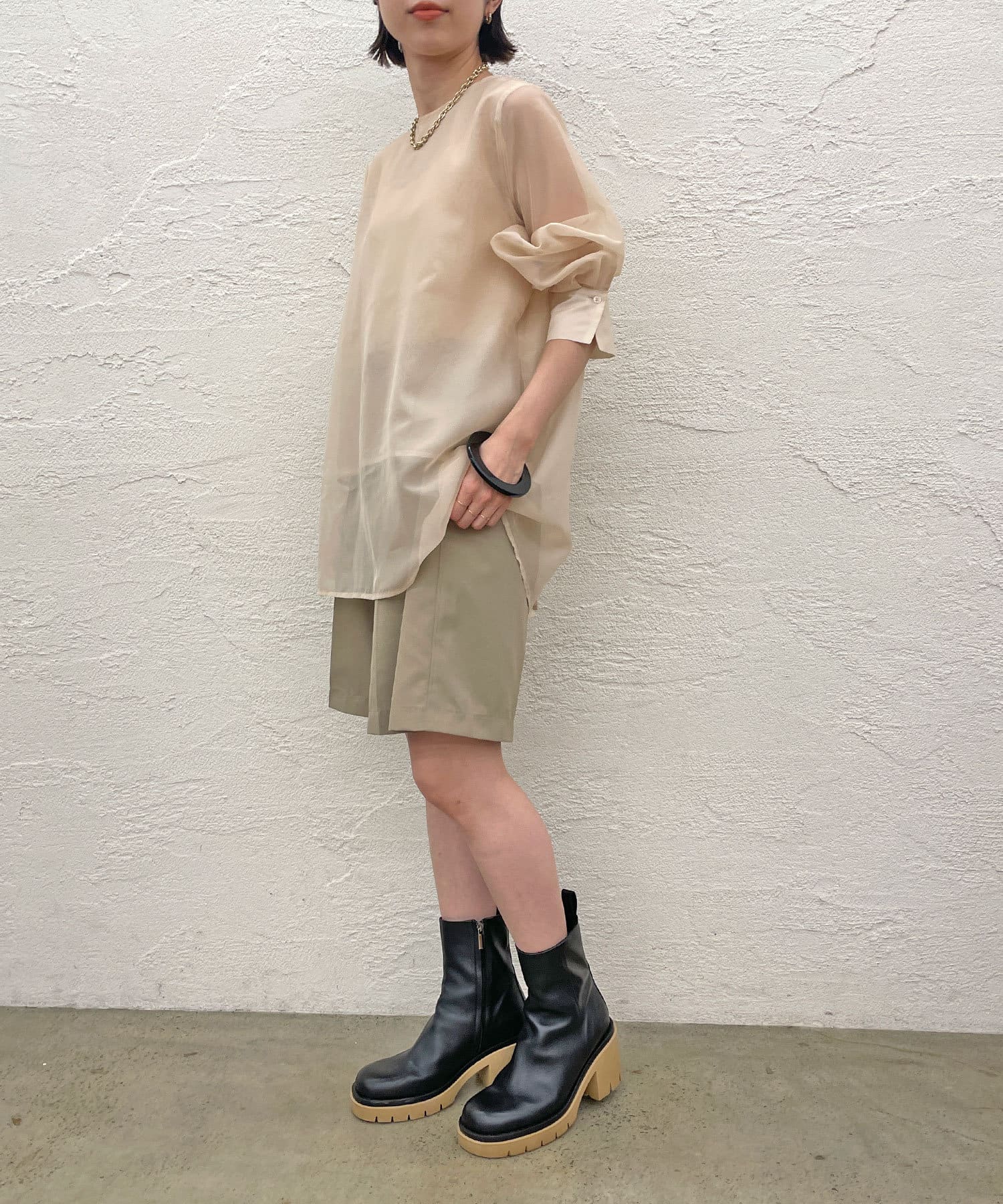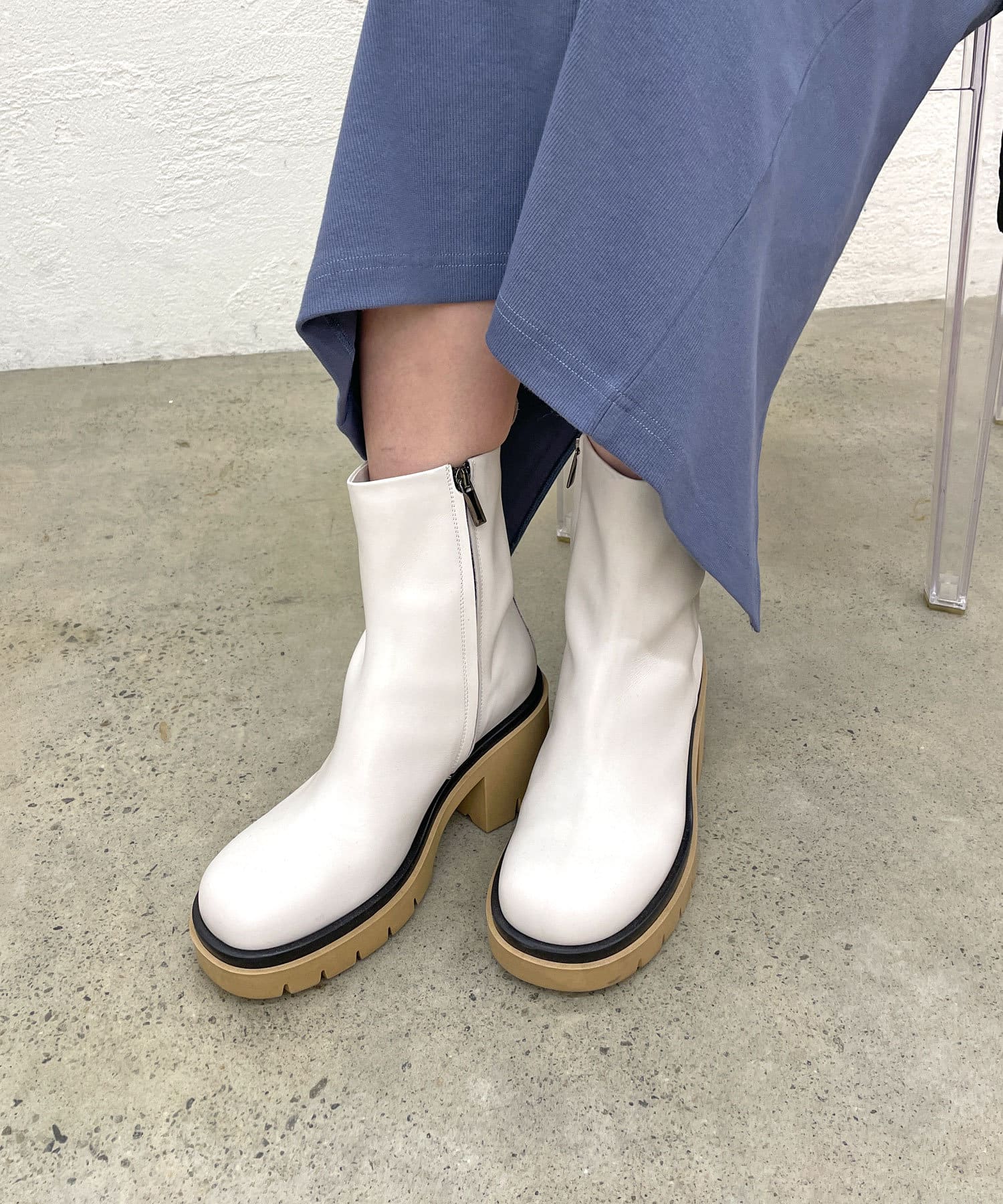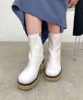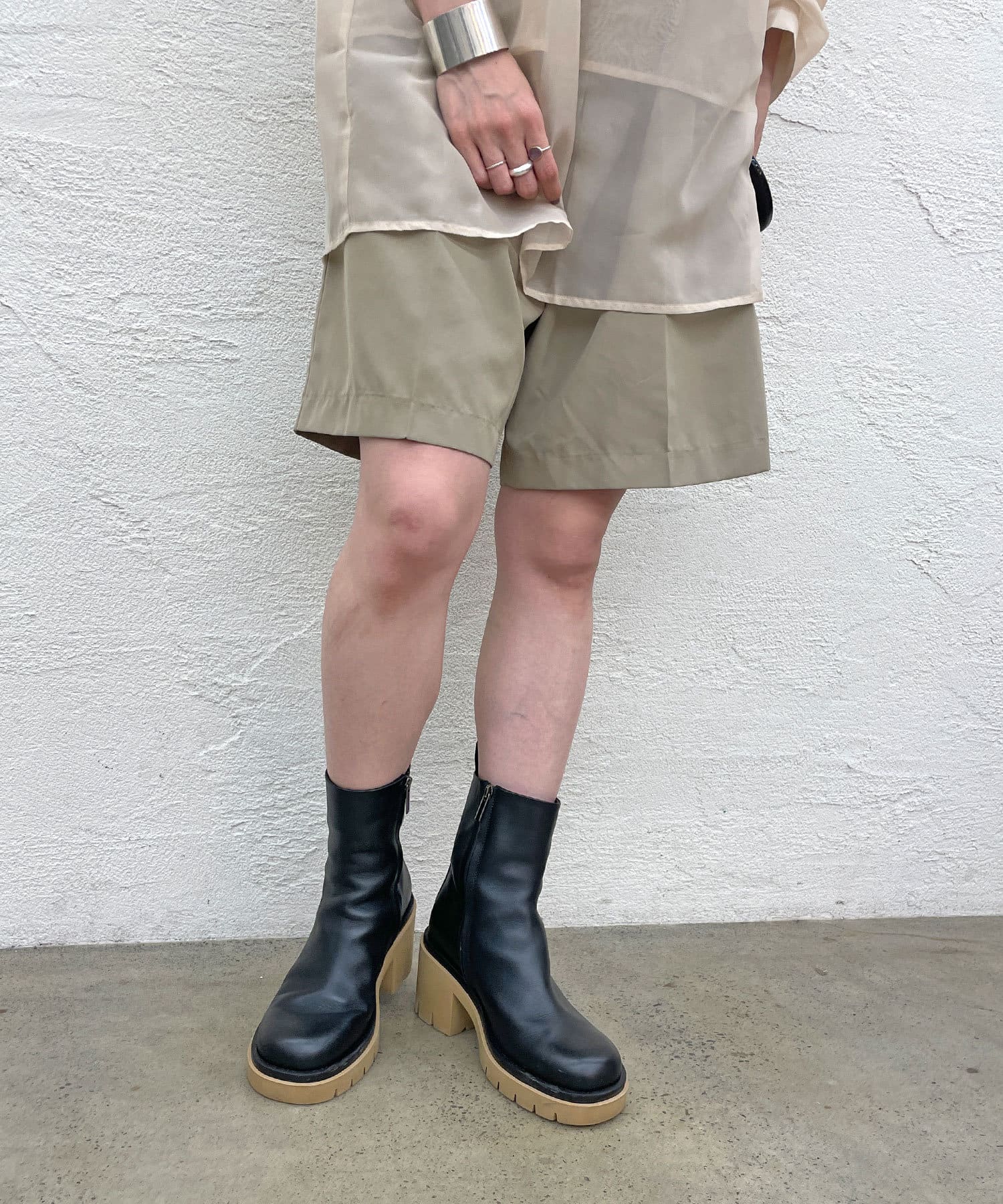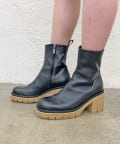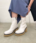 ・ベージュの厚底ソールが存在感があり、個性が光るショートブーツ。コーディネートのポイントになり、脚長効果も◎