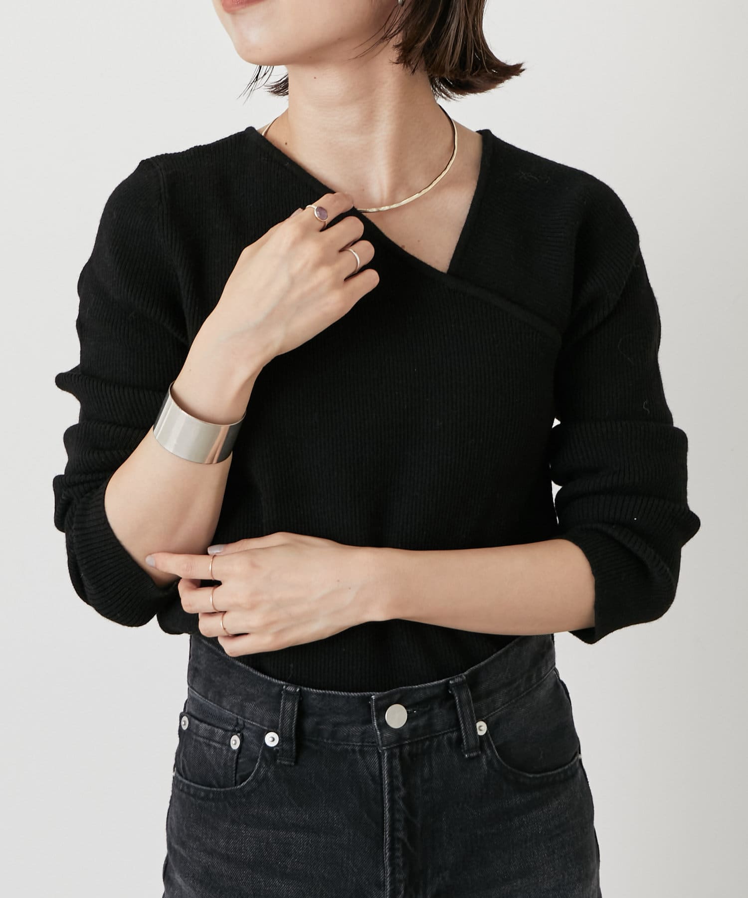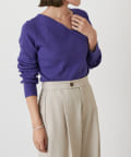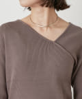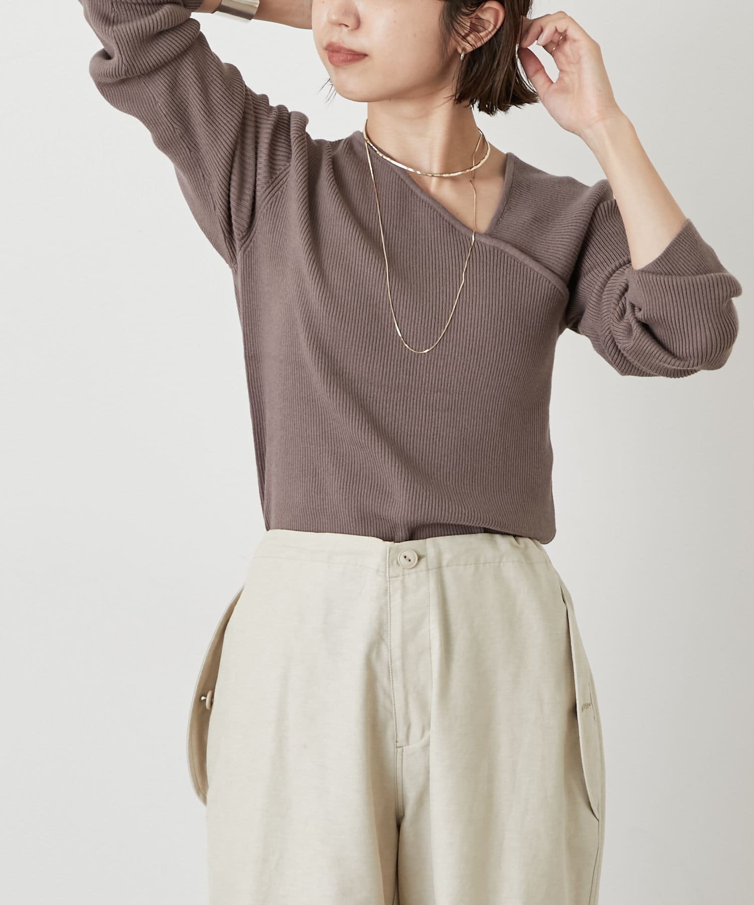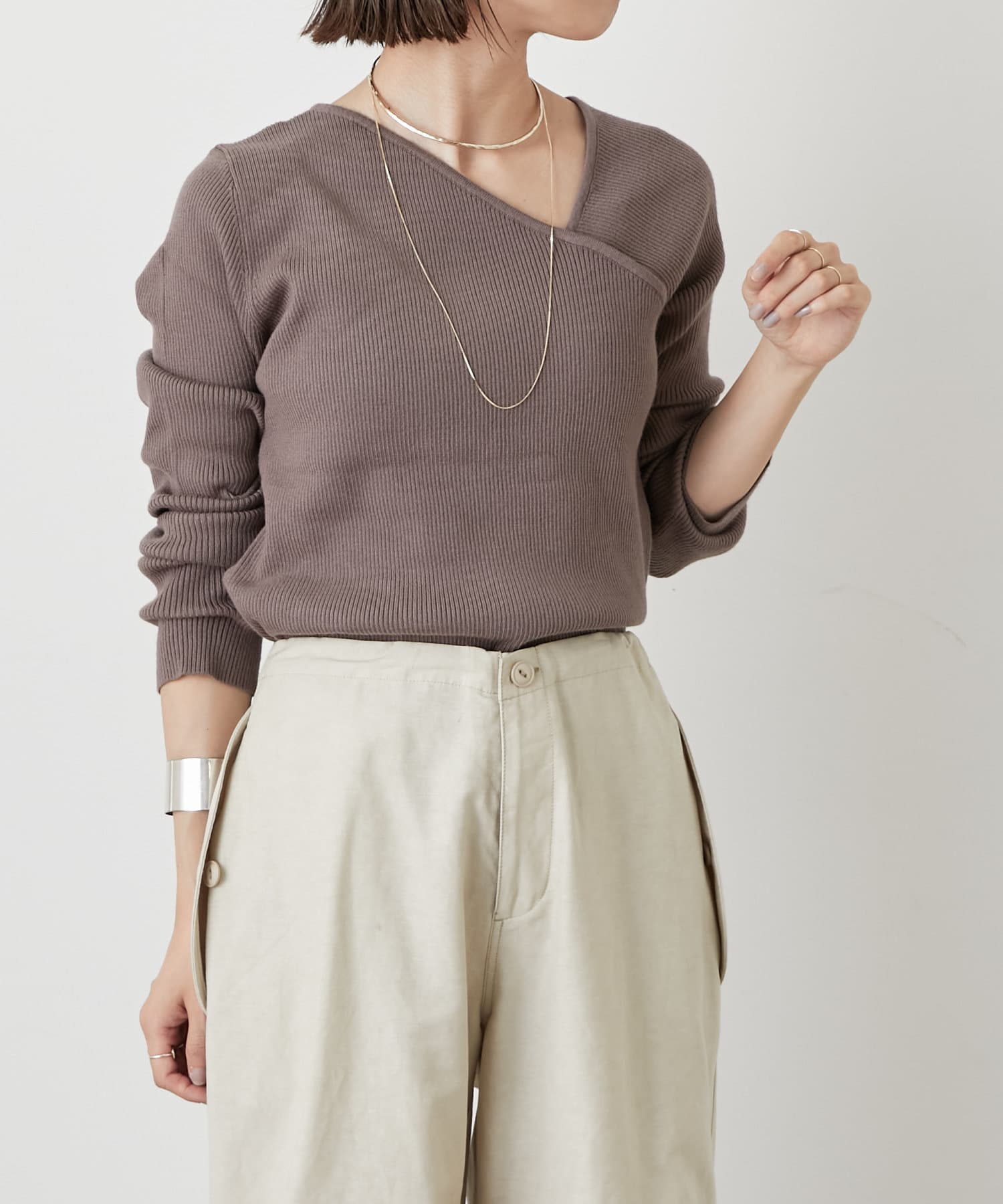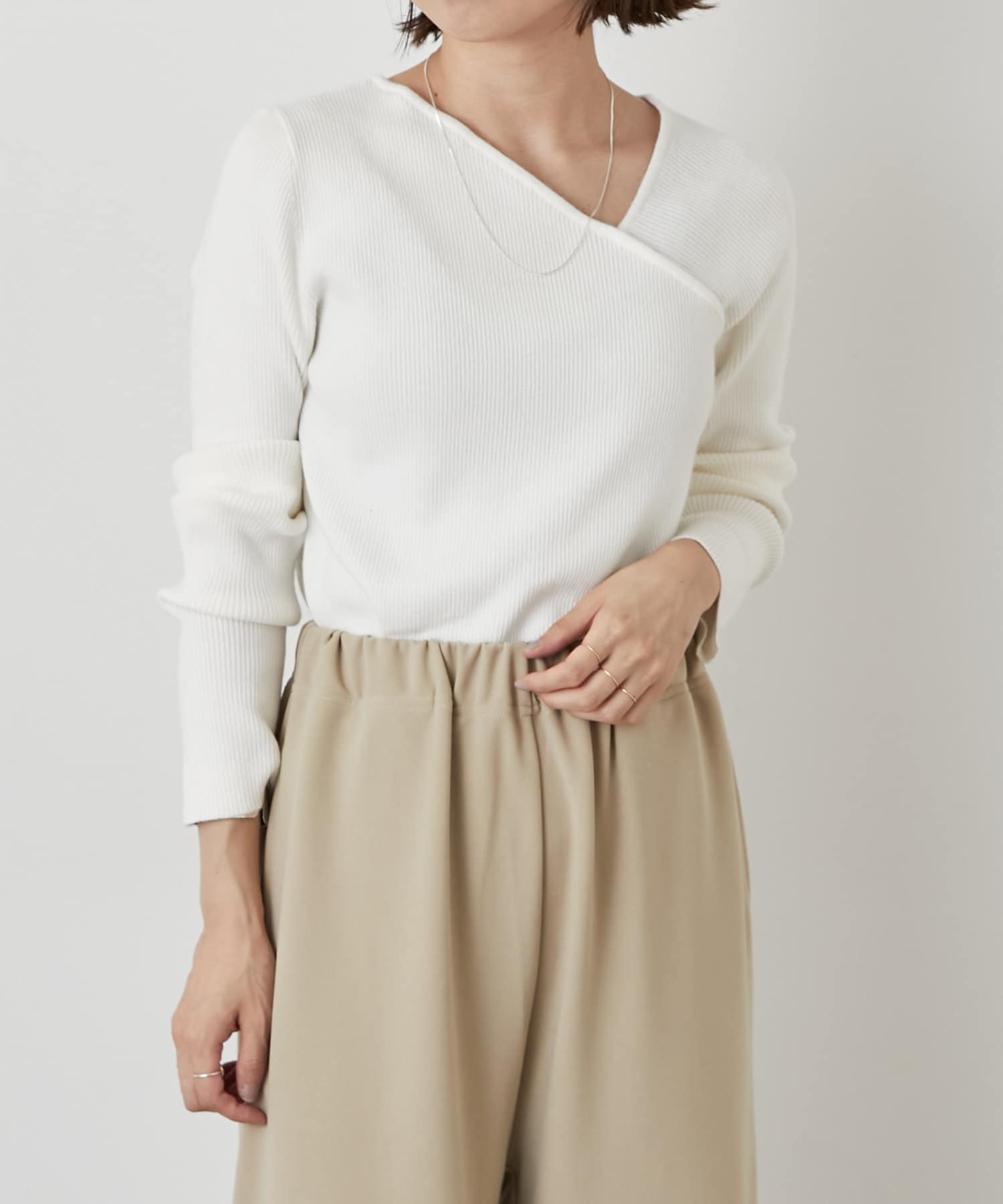 デコルテラインをさりげなく覗かせる変形ネックのプルオーバー