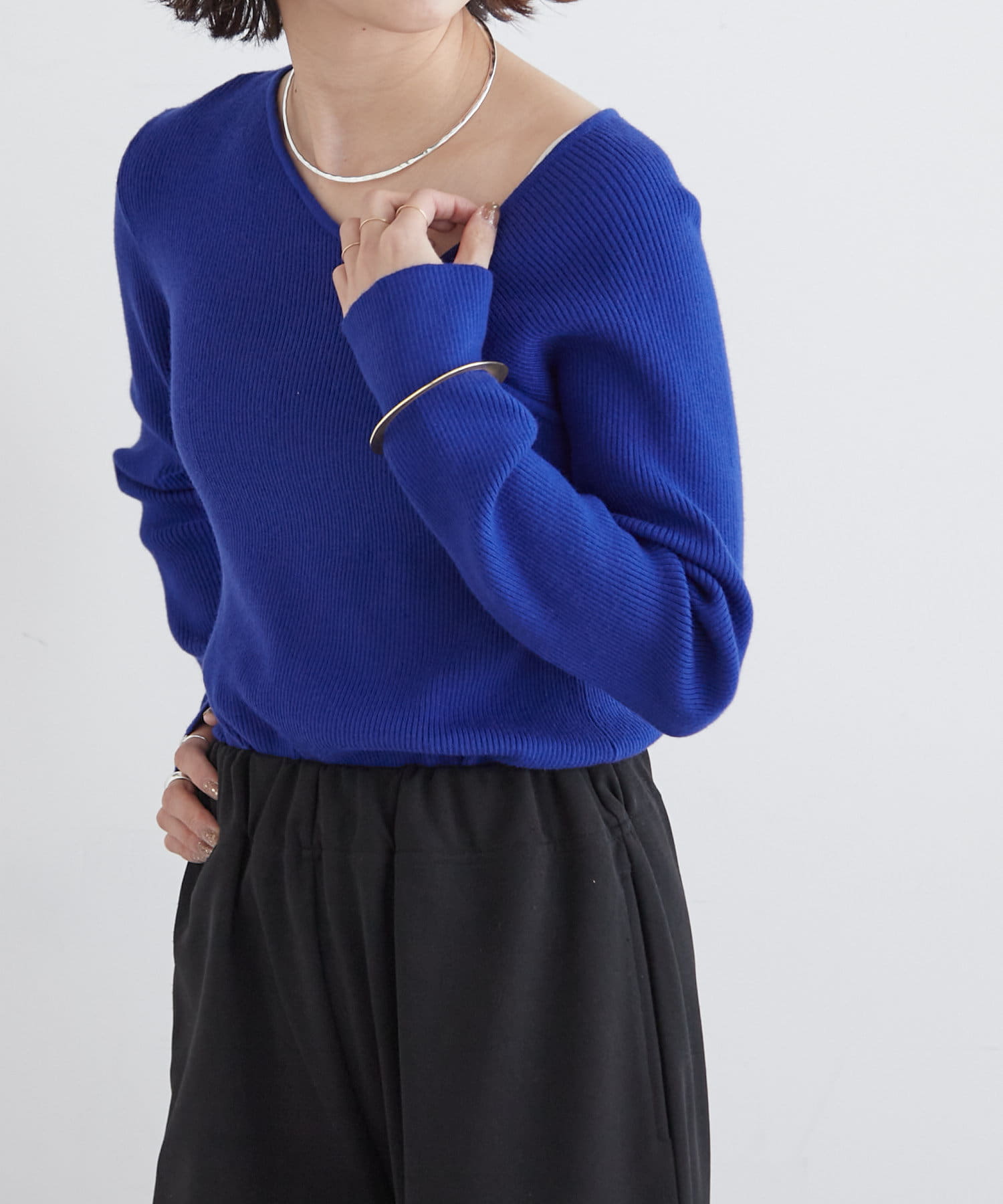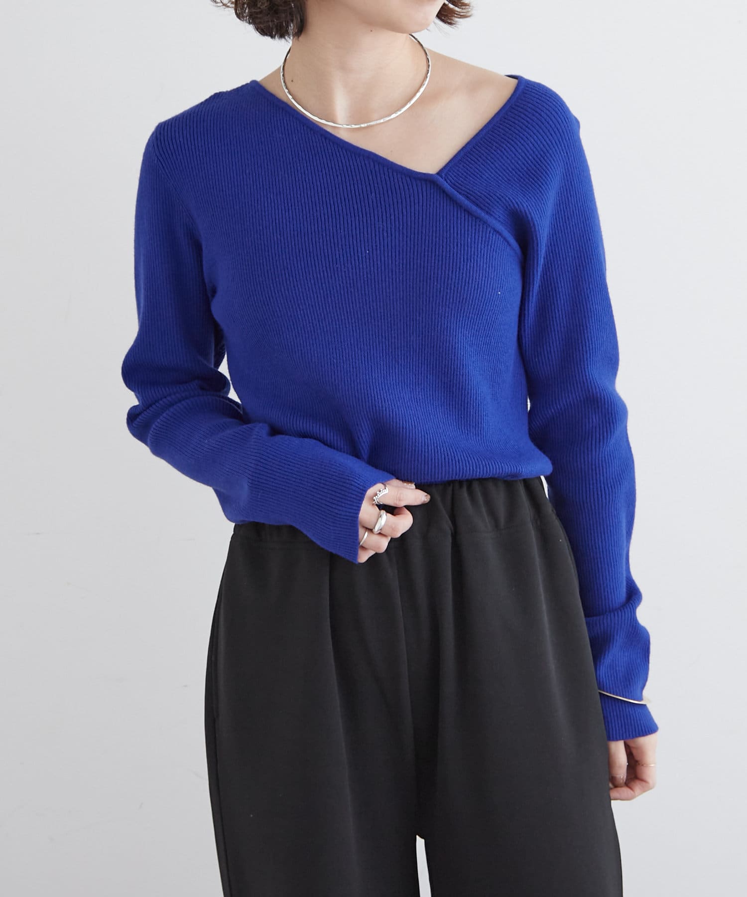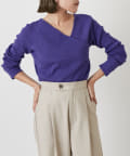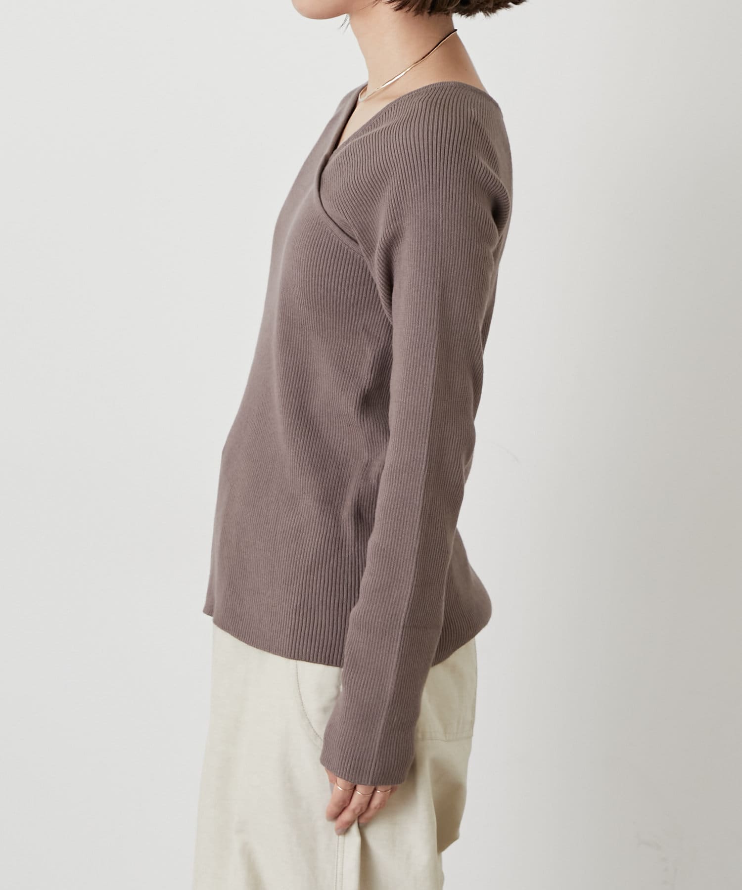 デコルテラインをさりげなく覗かせる変形ネックのプルオーバー