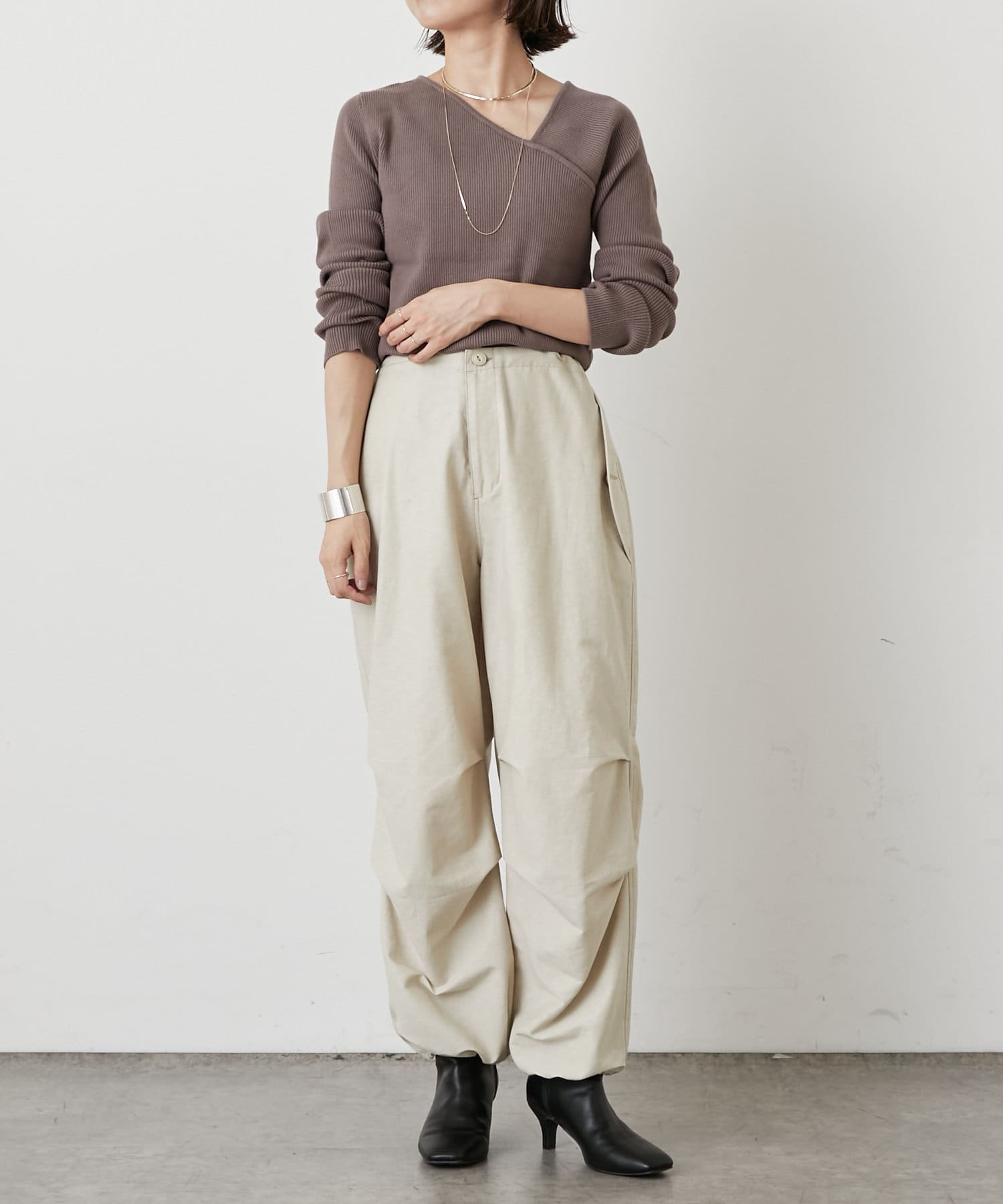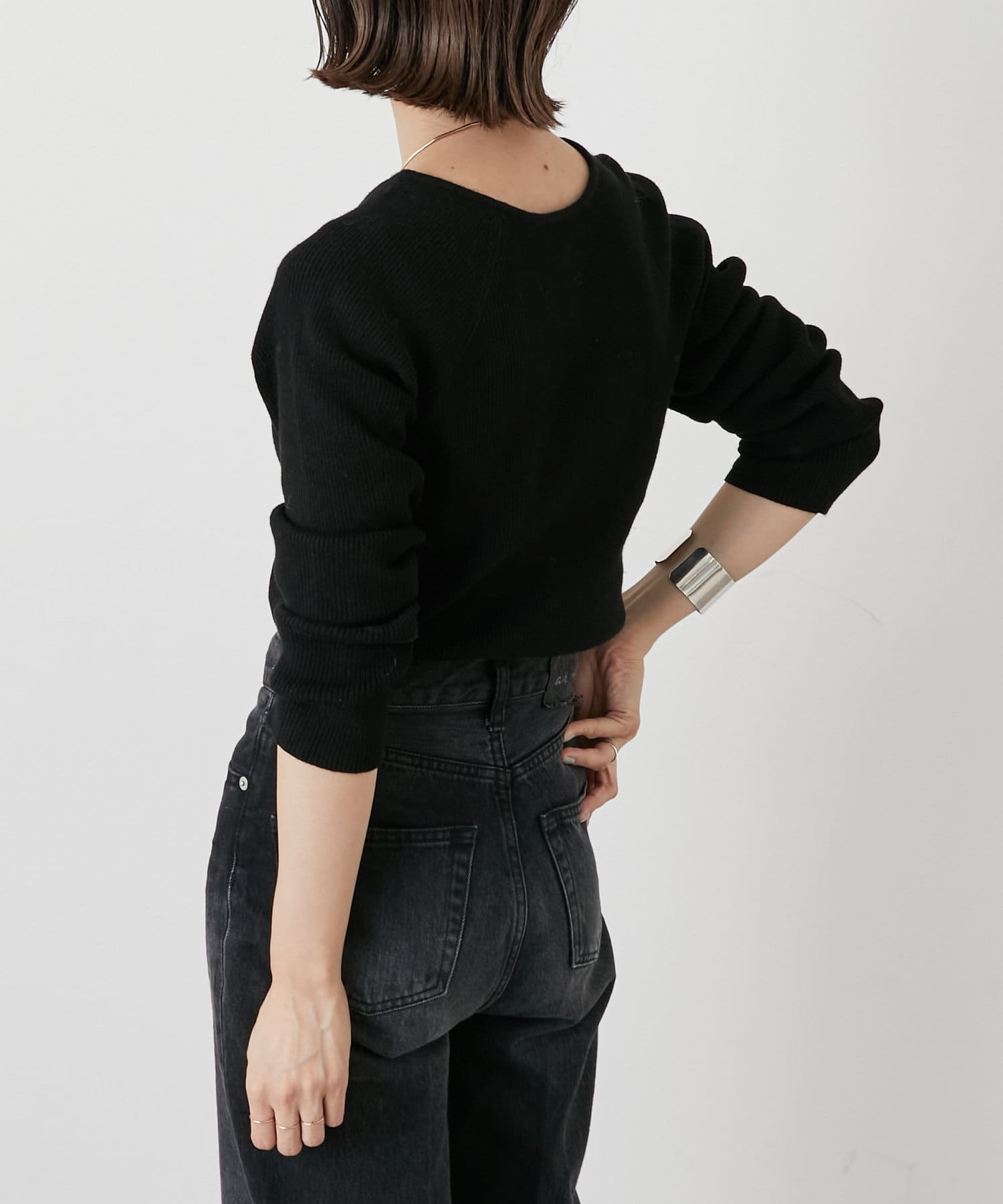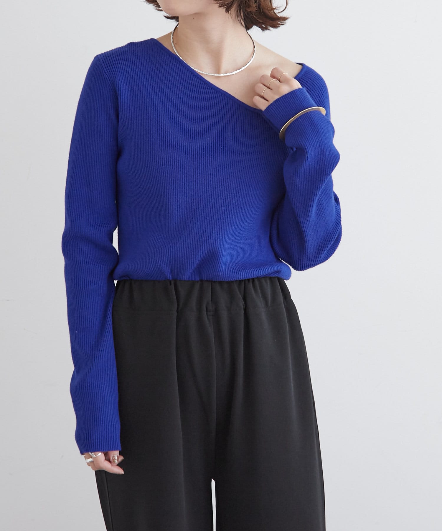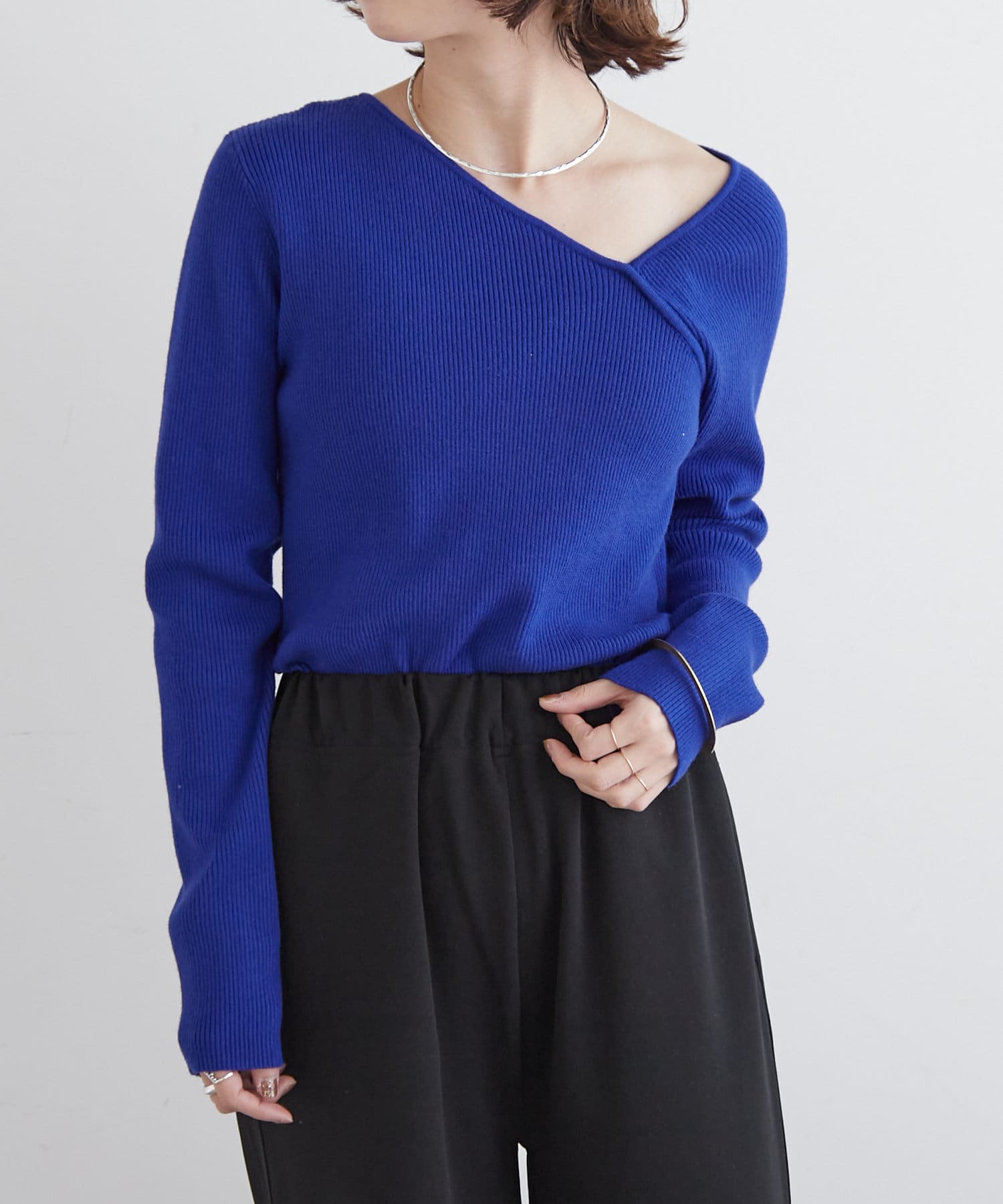 デコルテラインをさりげなく覗かせる変形ネックのプルオーバー