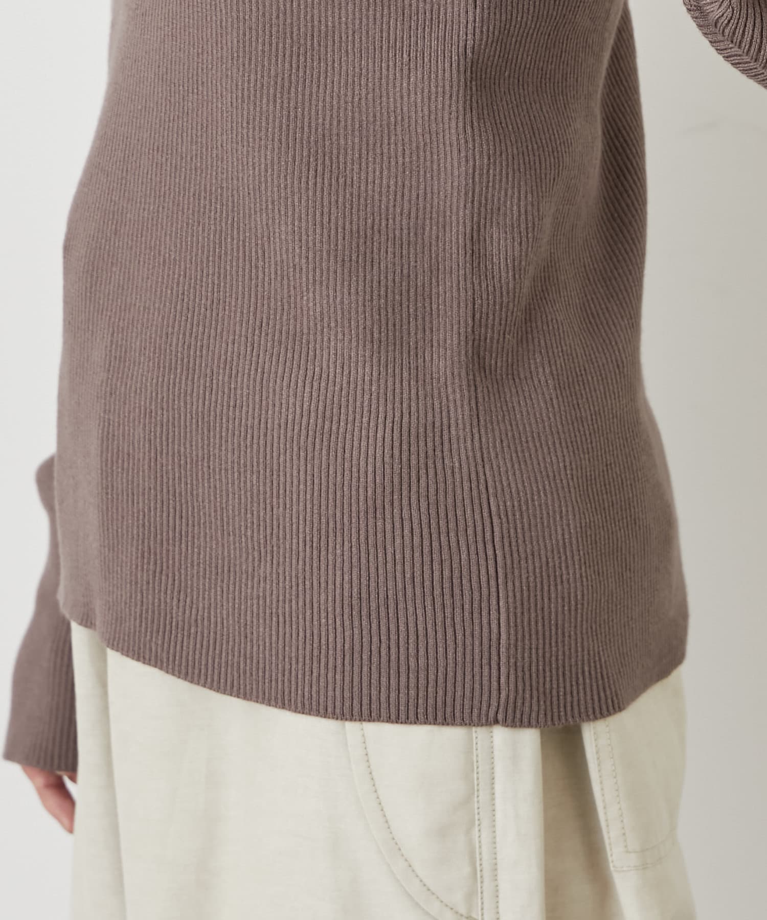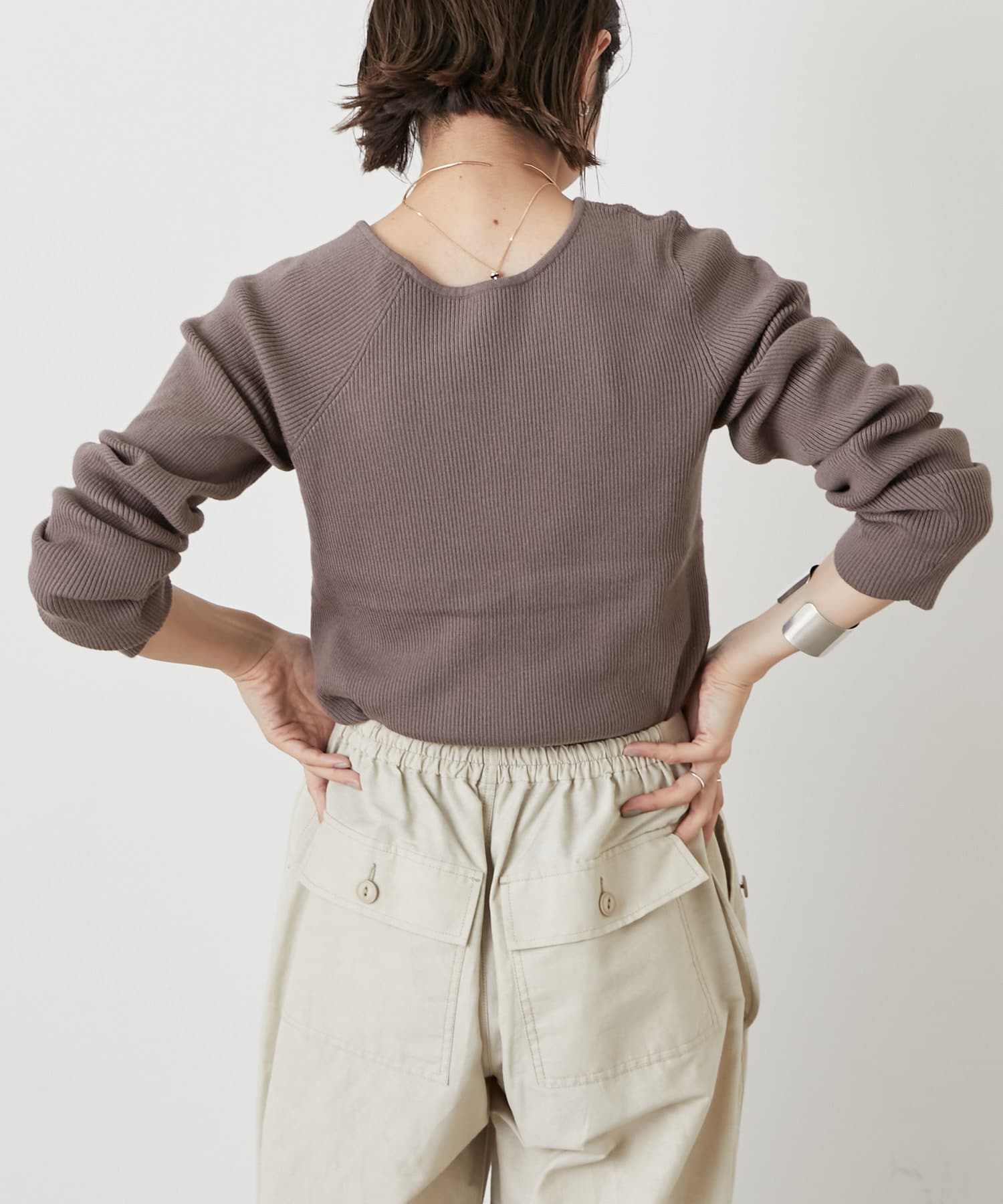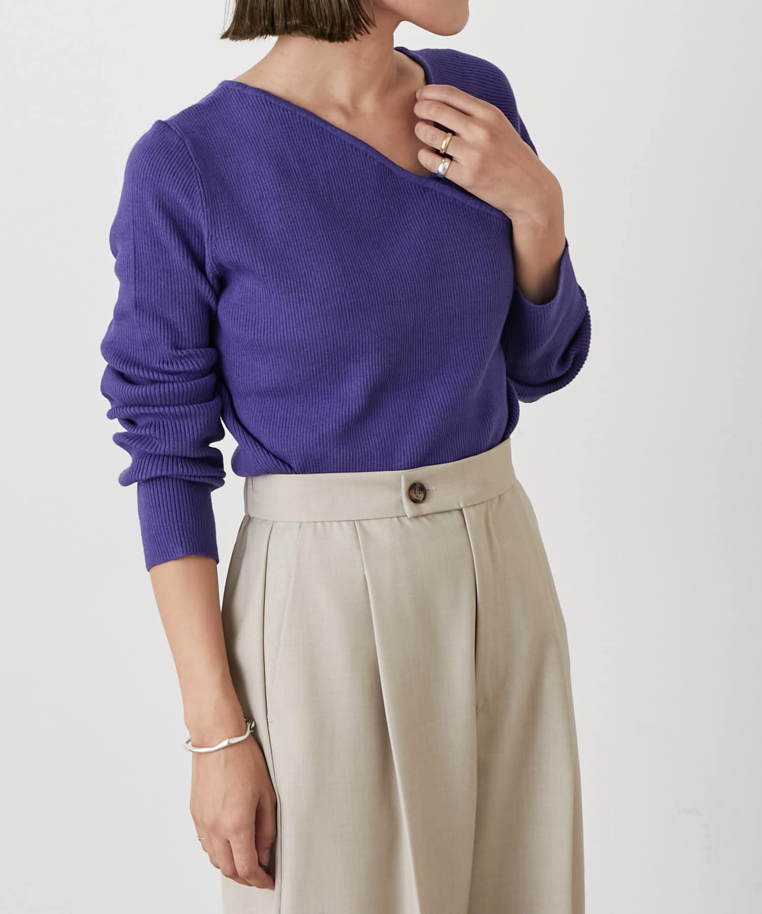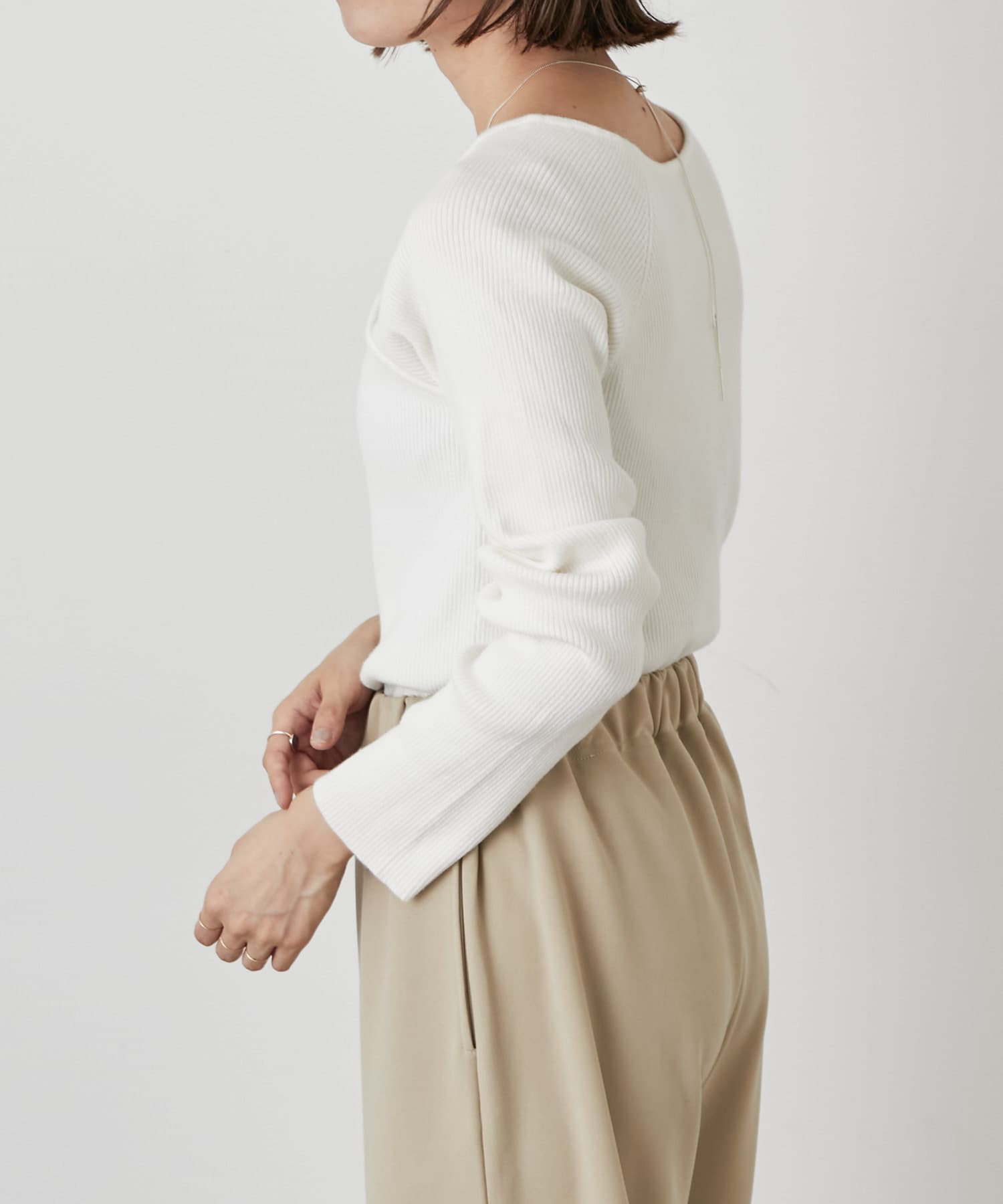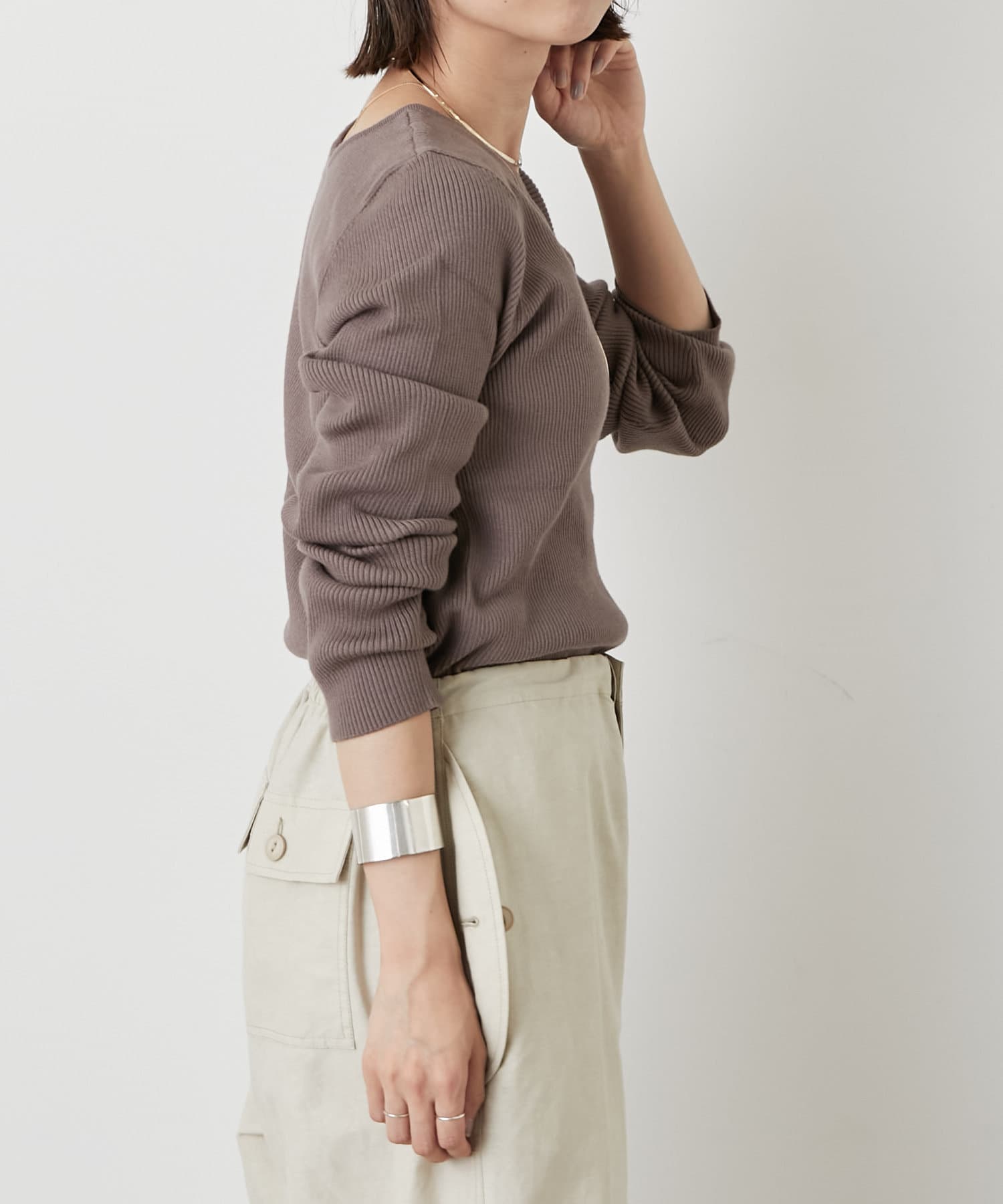 ・伸縮性のあるリブの編地がボディラインに程よくフィット。上半身をすっきりと女性らしく見せてくれます。