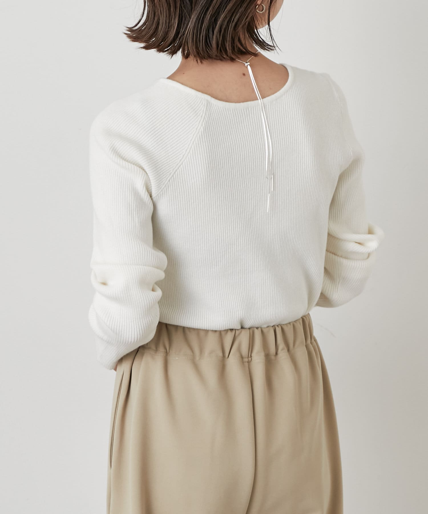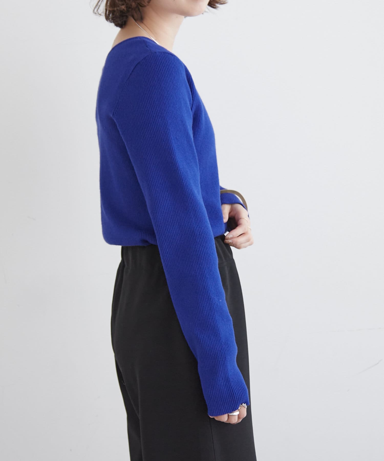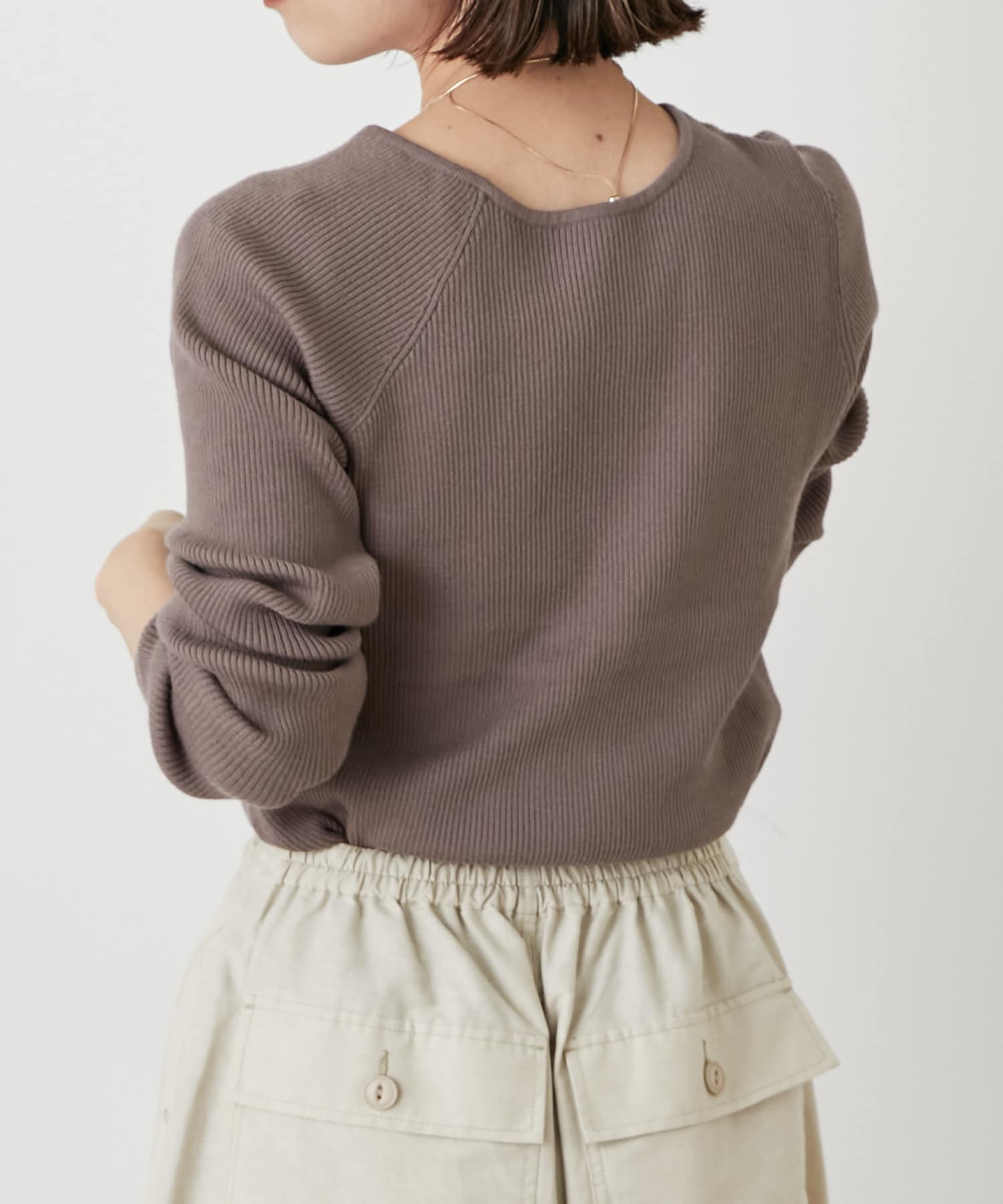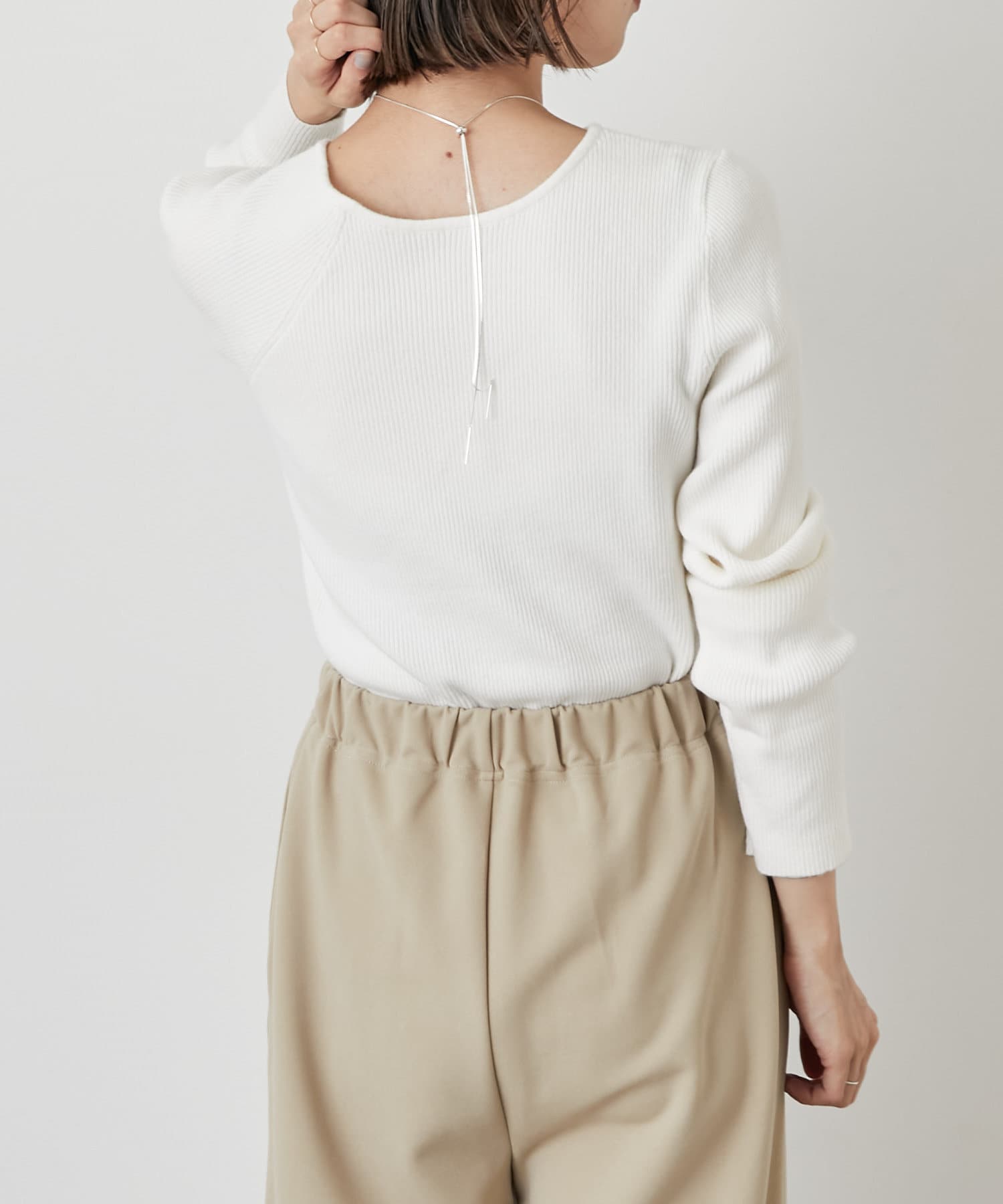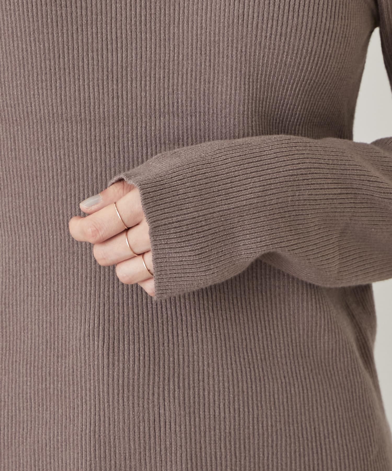 ・伸縮性のあるリブの編地がボディラインに程よくフィット。上半身をすっきりと女性らしく見せてくれます。