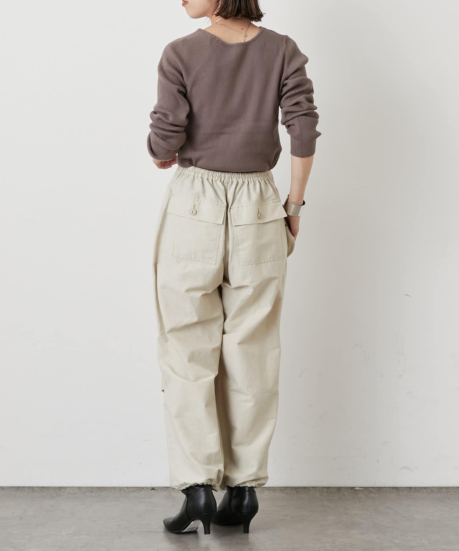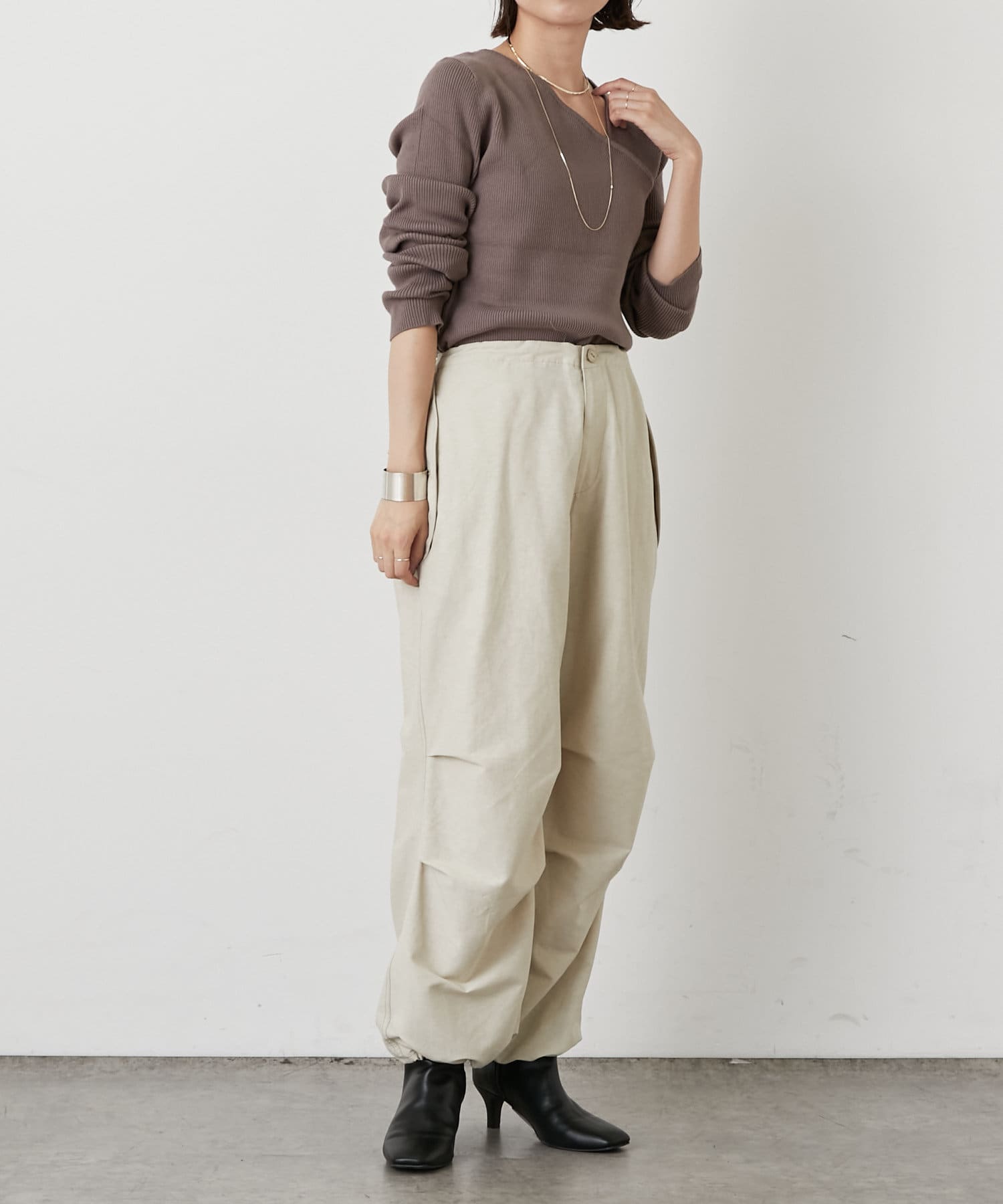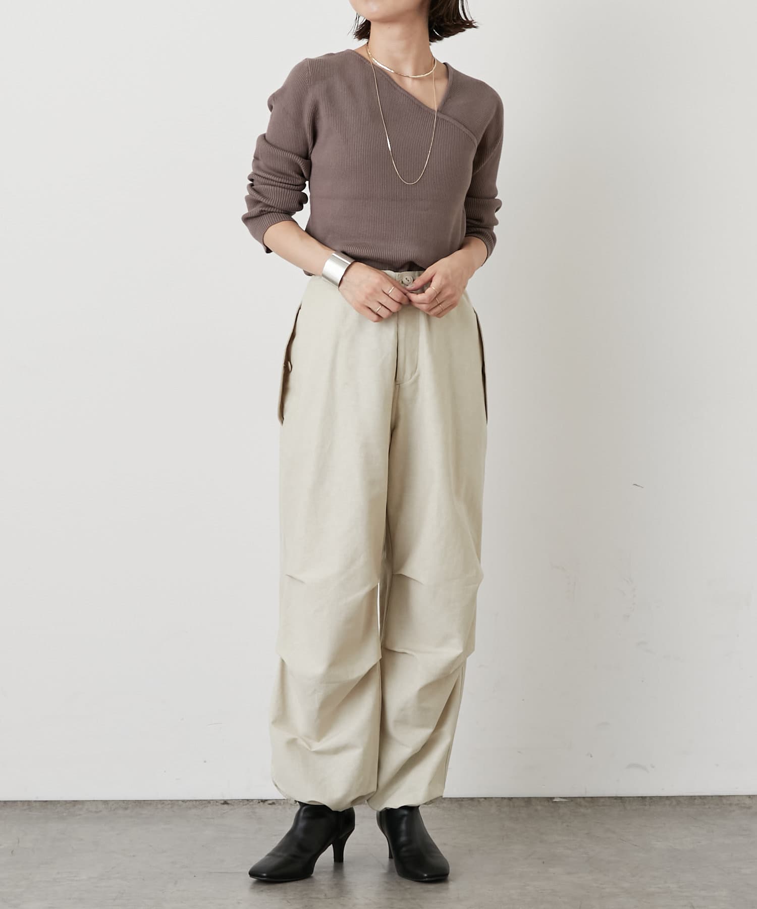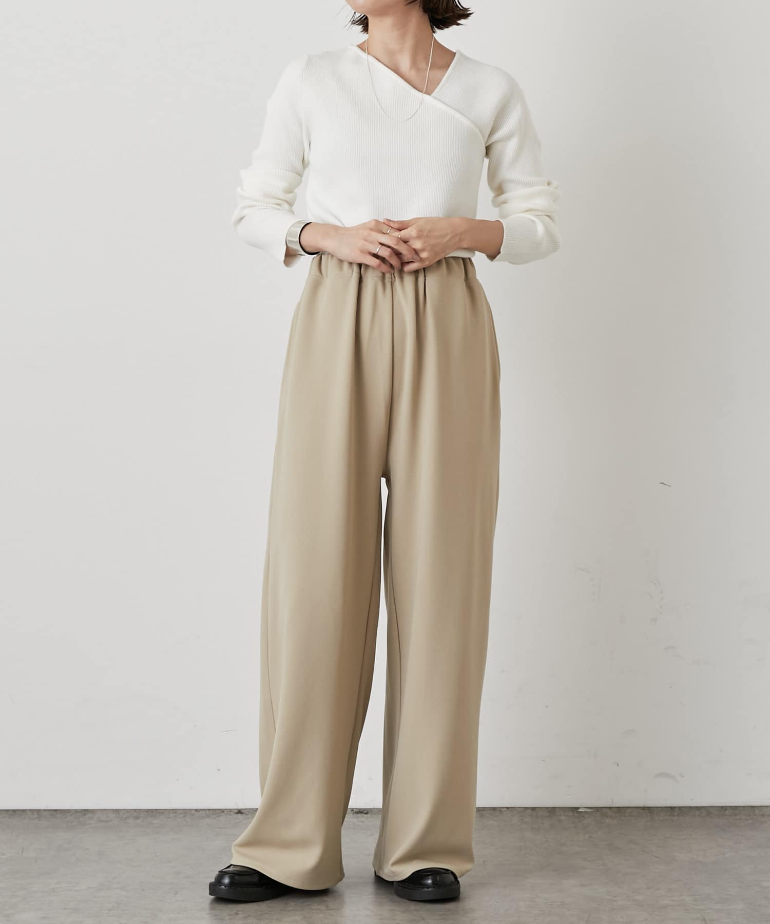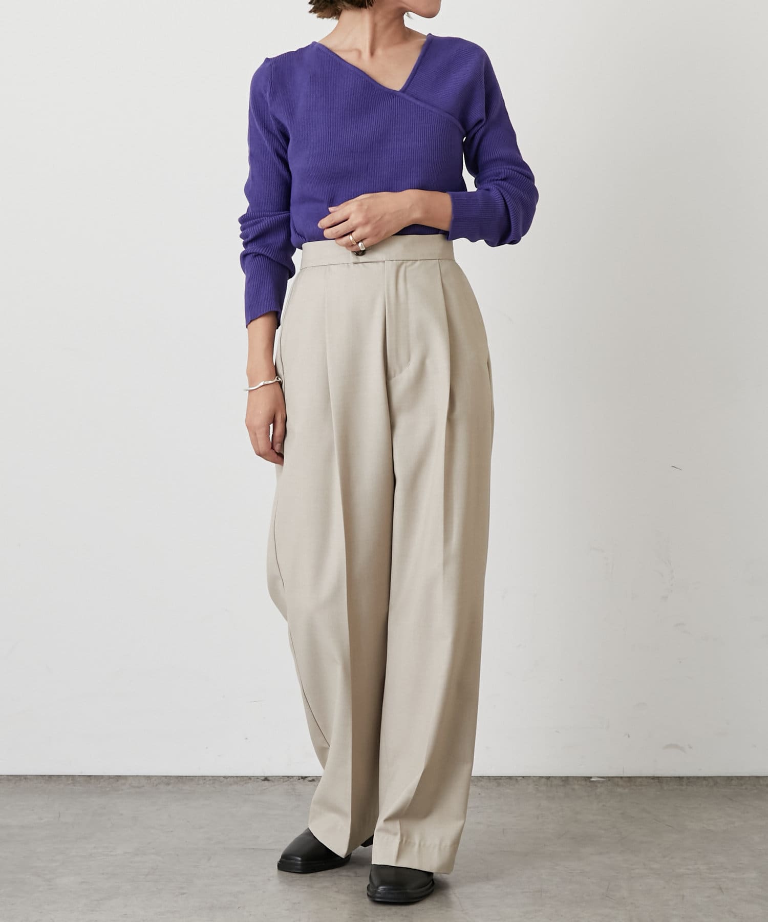 ・伸縮性のあるリブの編地がボディラインに程よくフィット。上半身をすっきりと女性らしく見せてくれます。