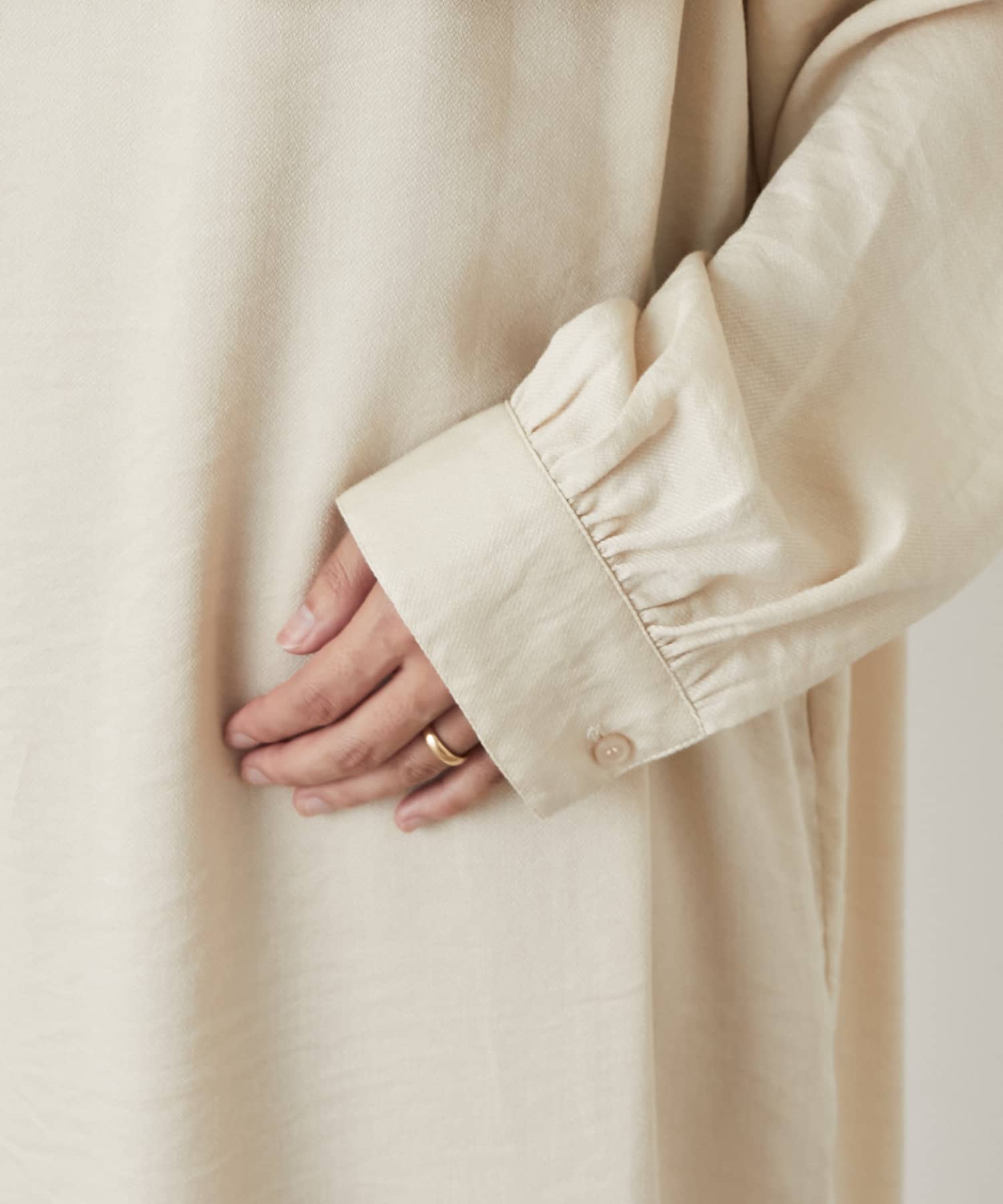 ・ややゆとりのあるIラインのワンピースは、身体のラインを拾いづらくさりげなく体型カバーも◎袖のボリュームで、フェミニンな印象で女性らしく着ていただけます。