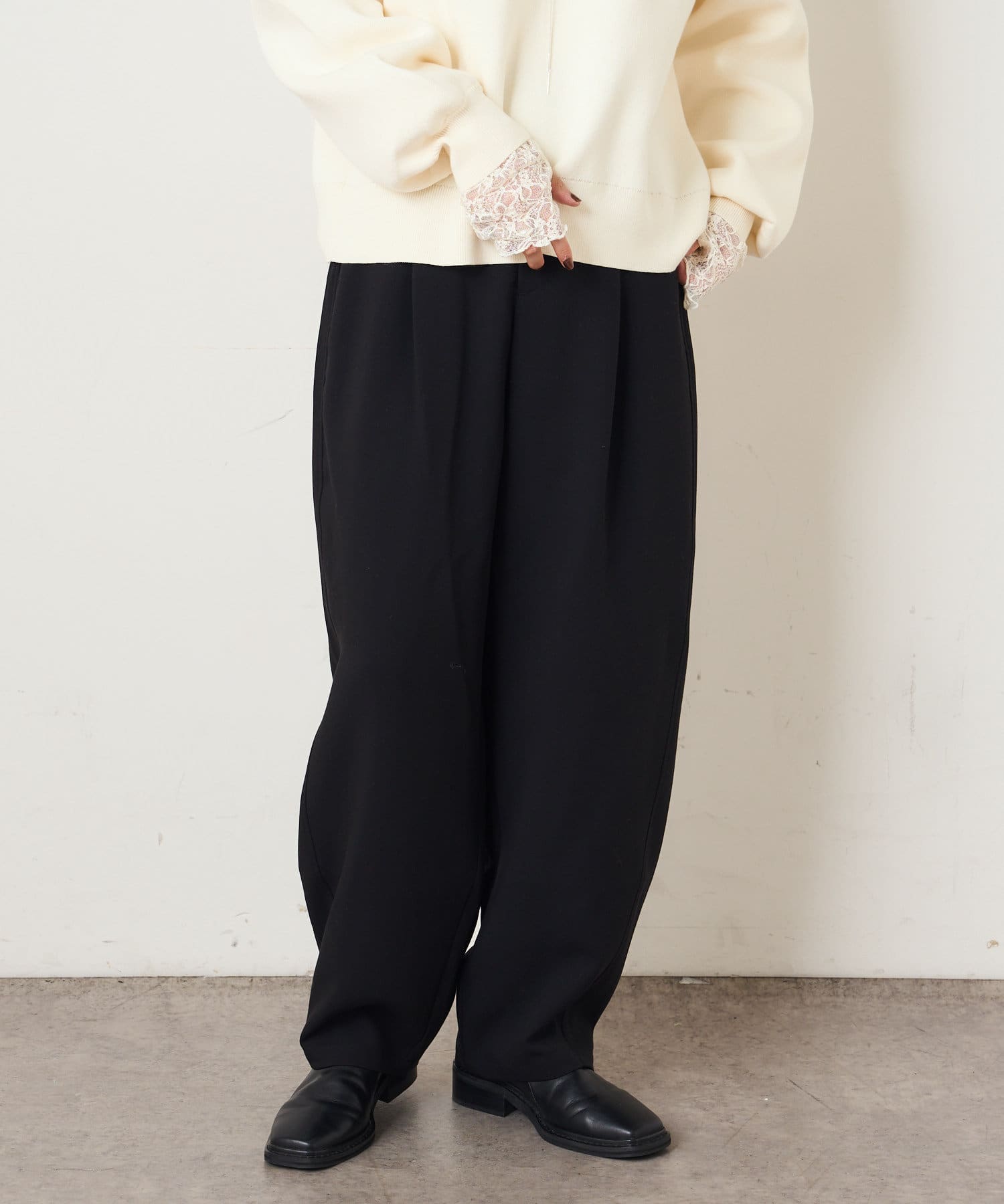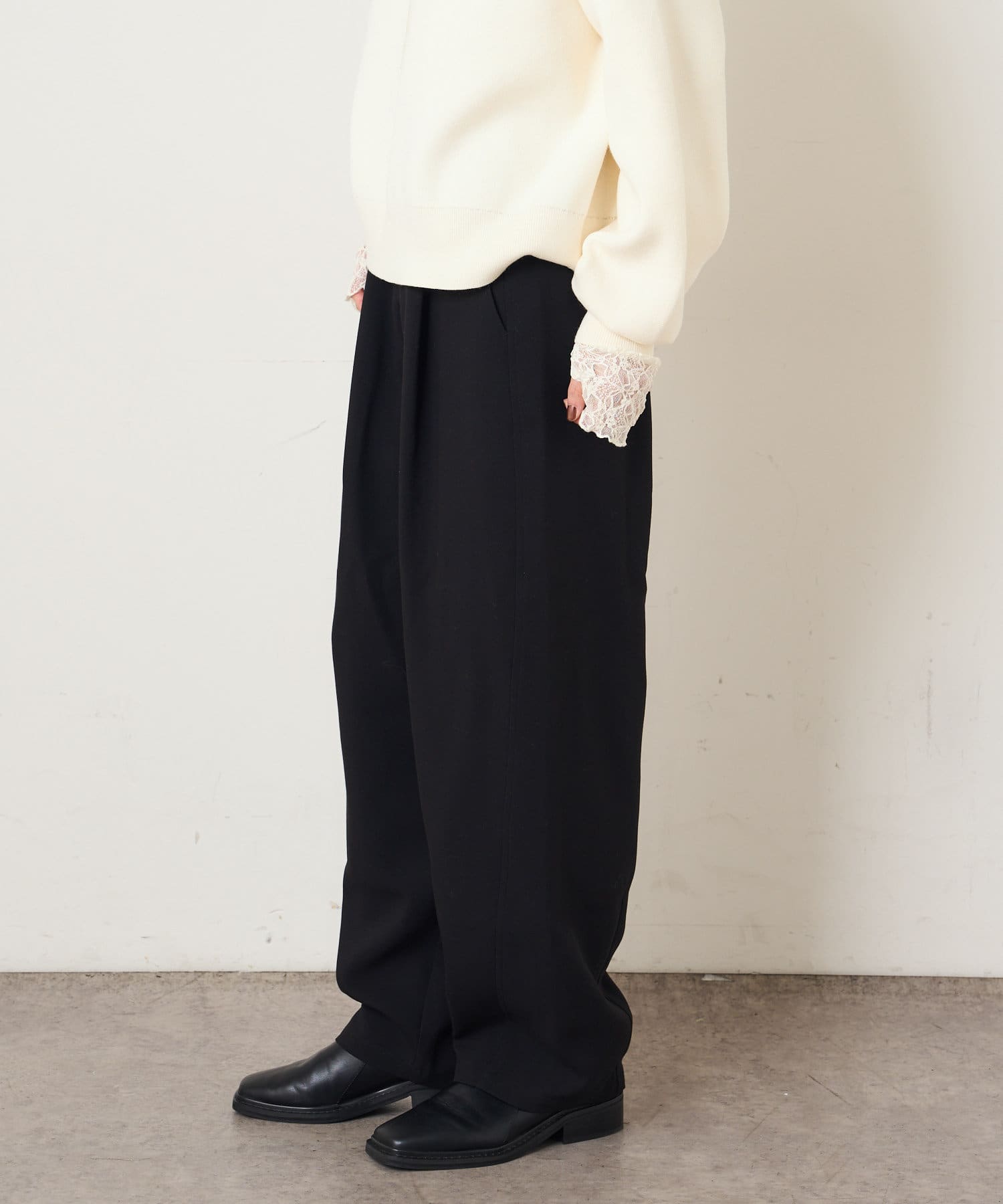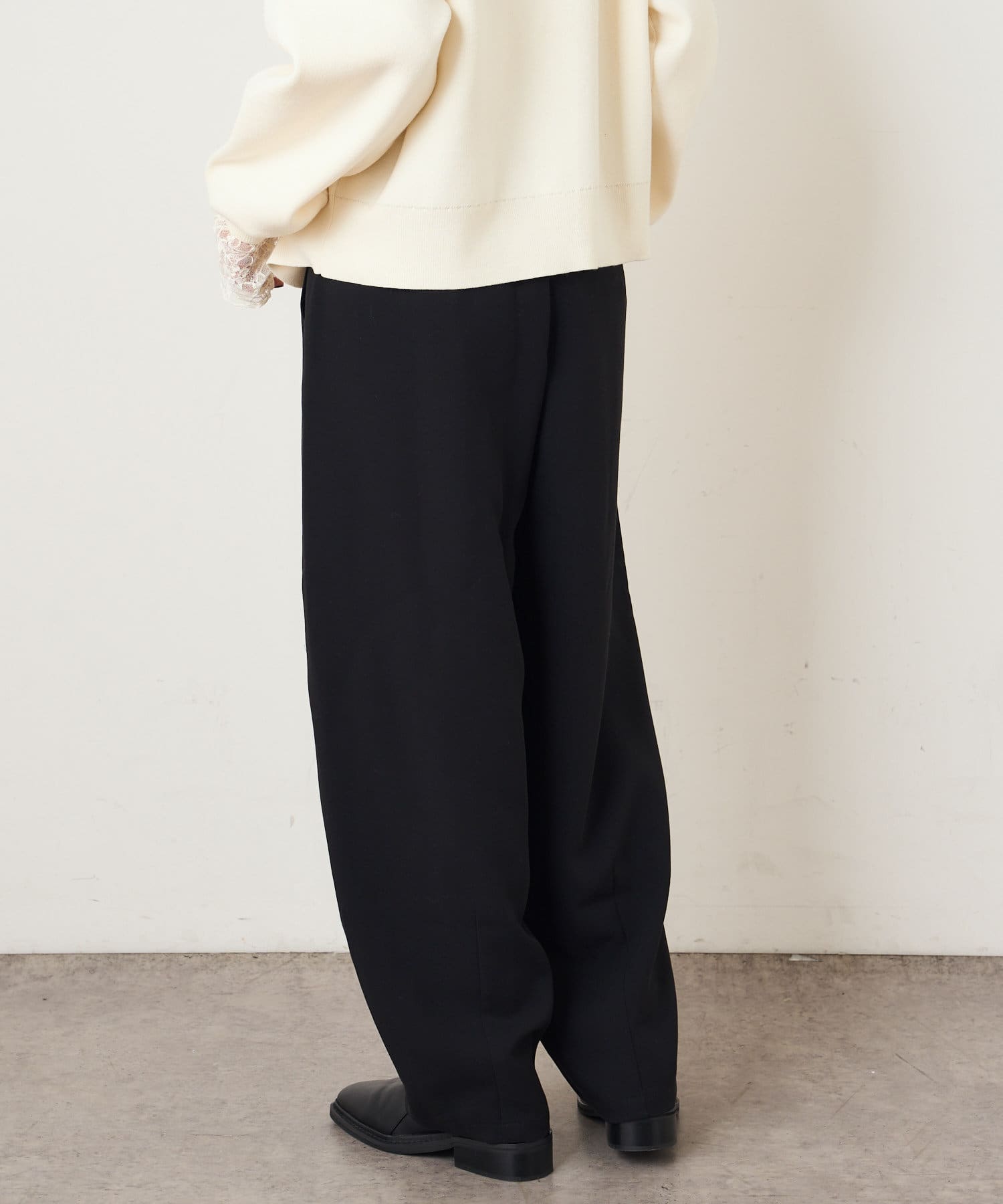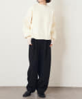 ・脚のラインを拾いずらいハリのある素材と、ゆったりシルエットが華奢見えしてくれるパンツです。