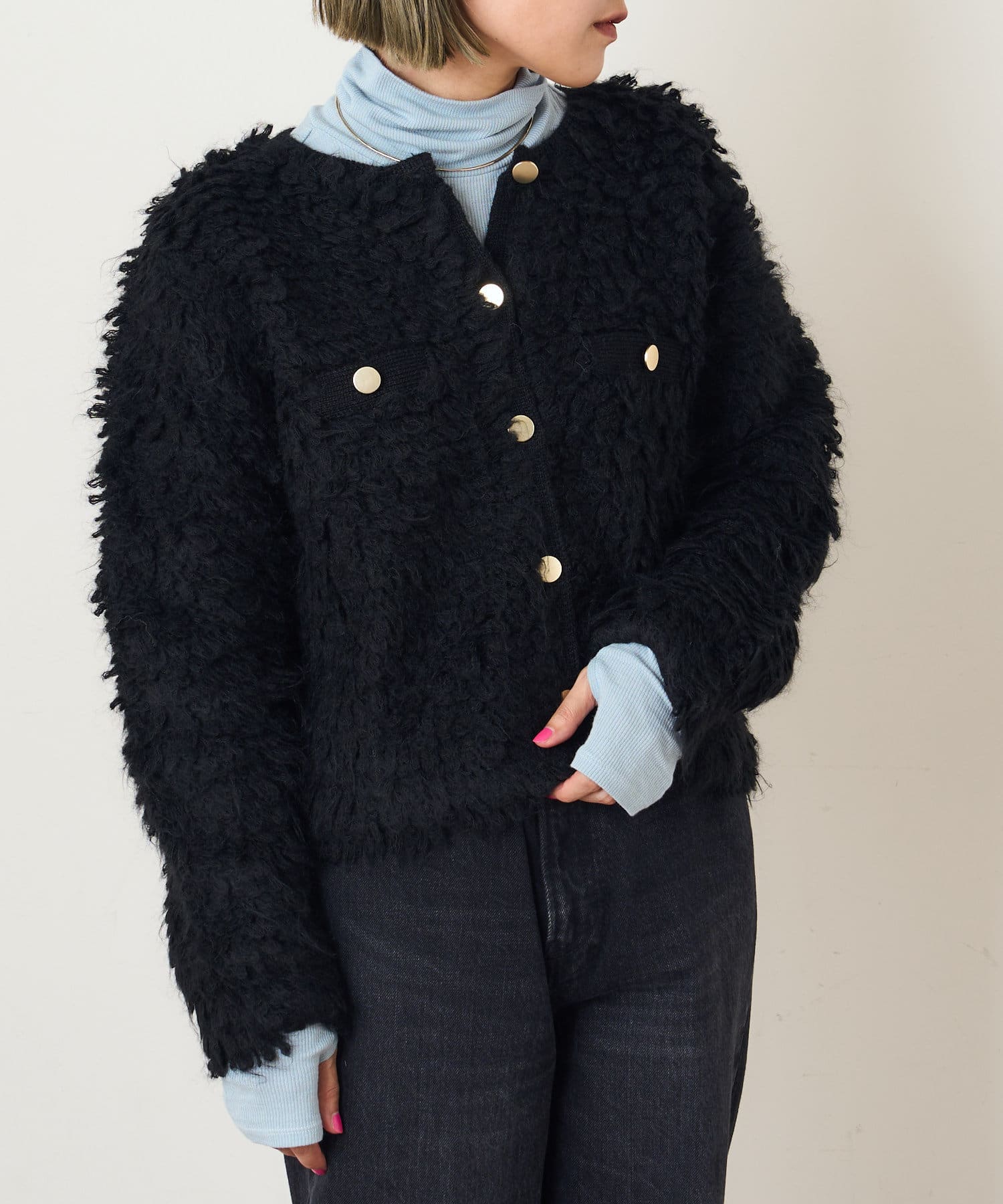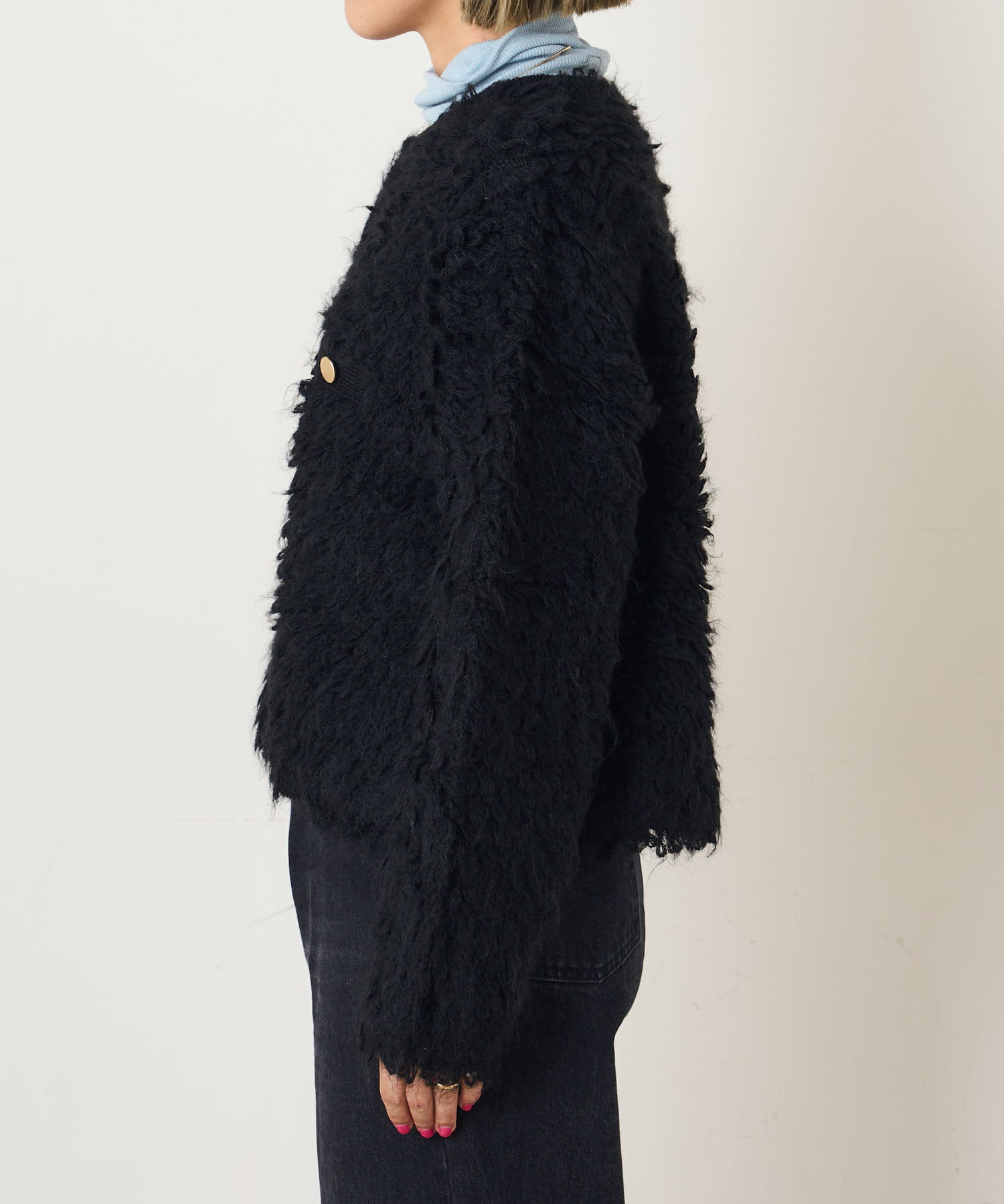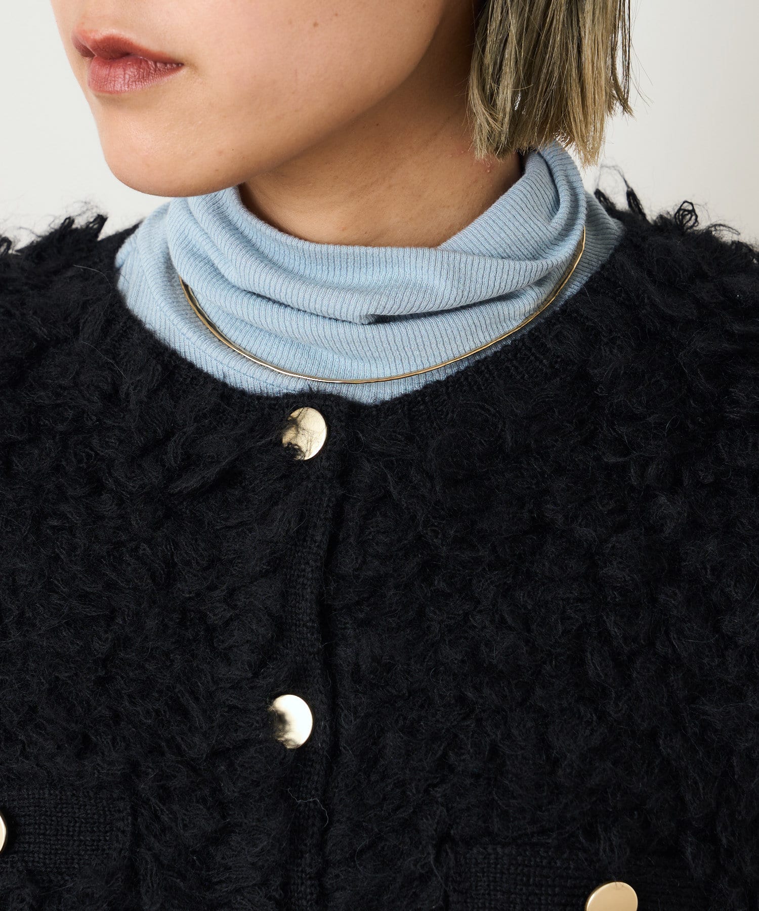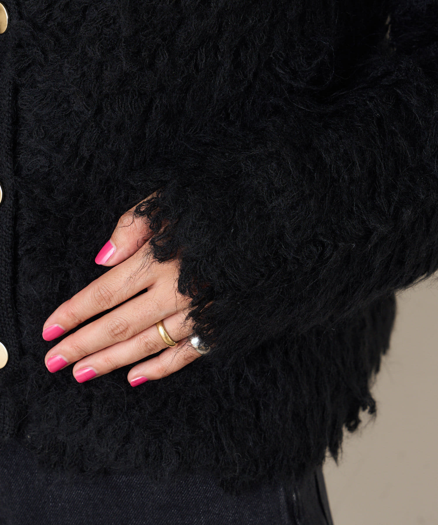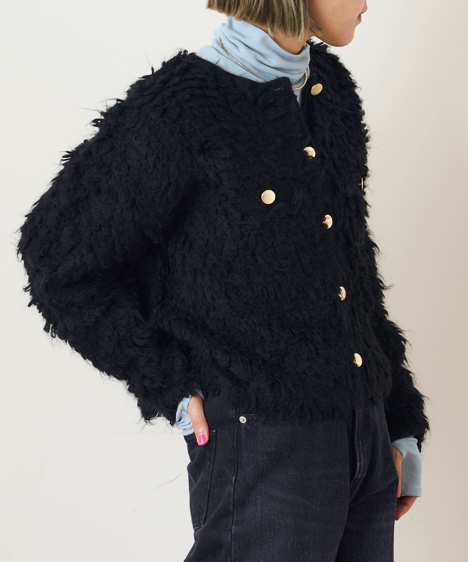 ・ループ編みのボリュームと丸みのあるシルエットが可愛いカーディガン。身丈がやや短めなのでボリュームがあっても重くならずにバランスの取りやすい一着。