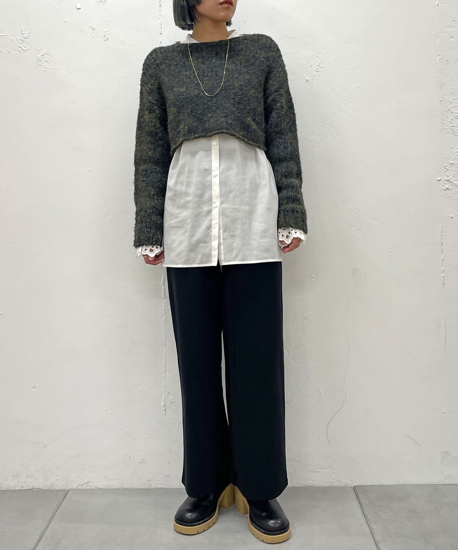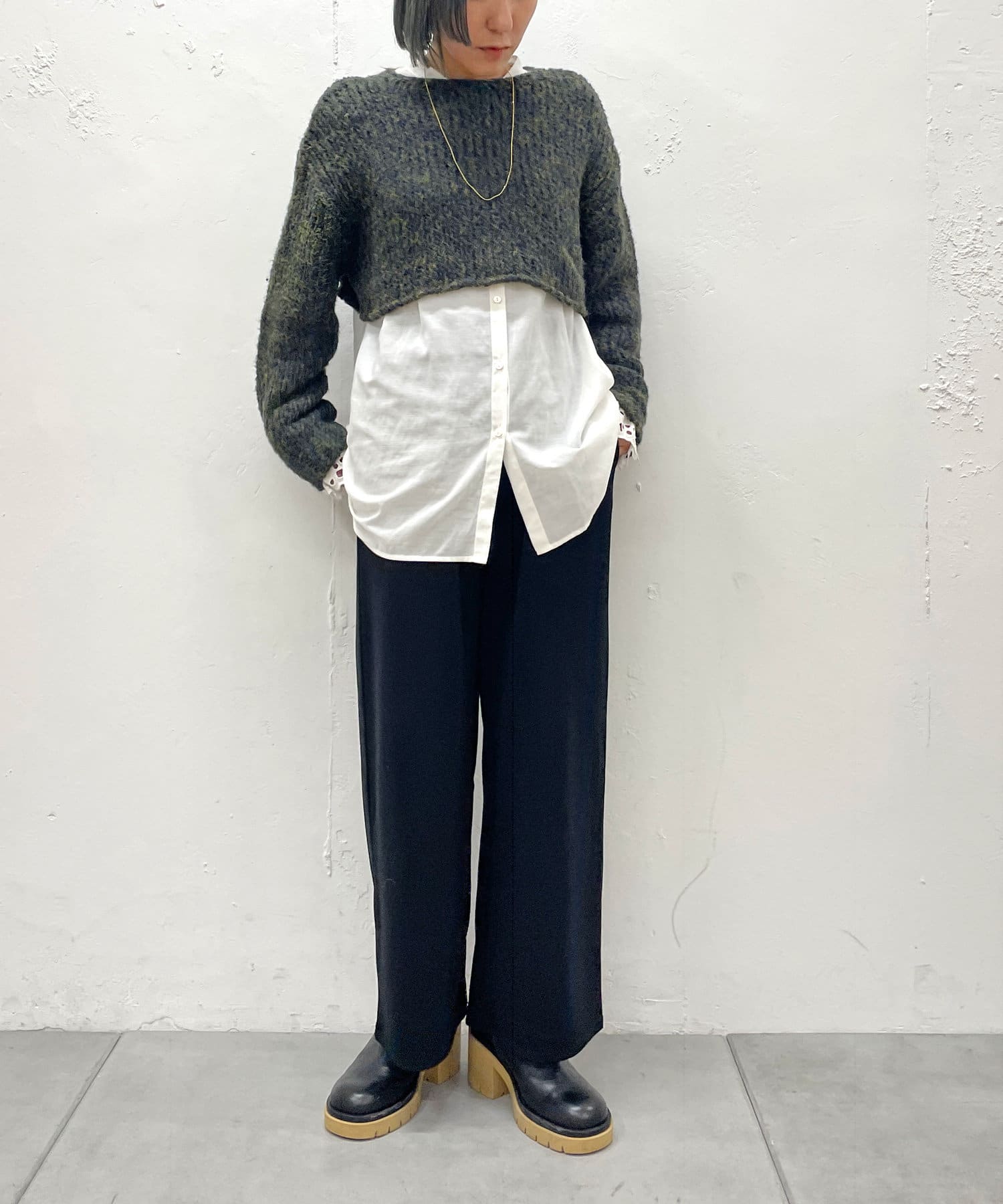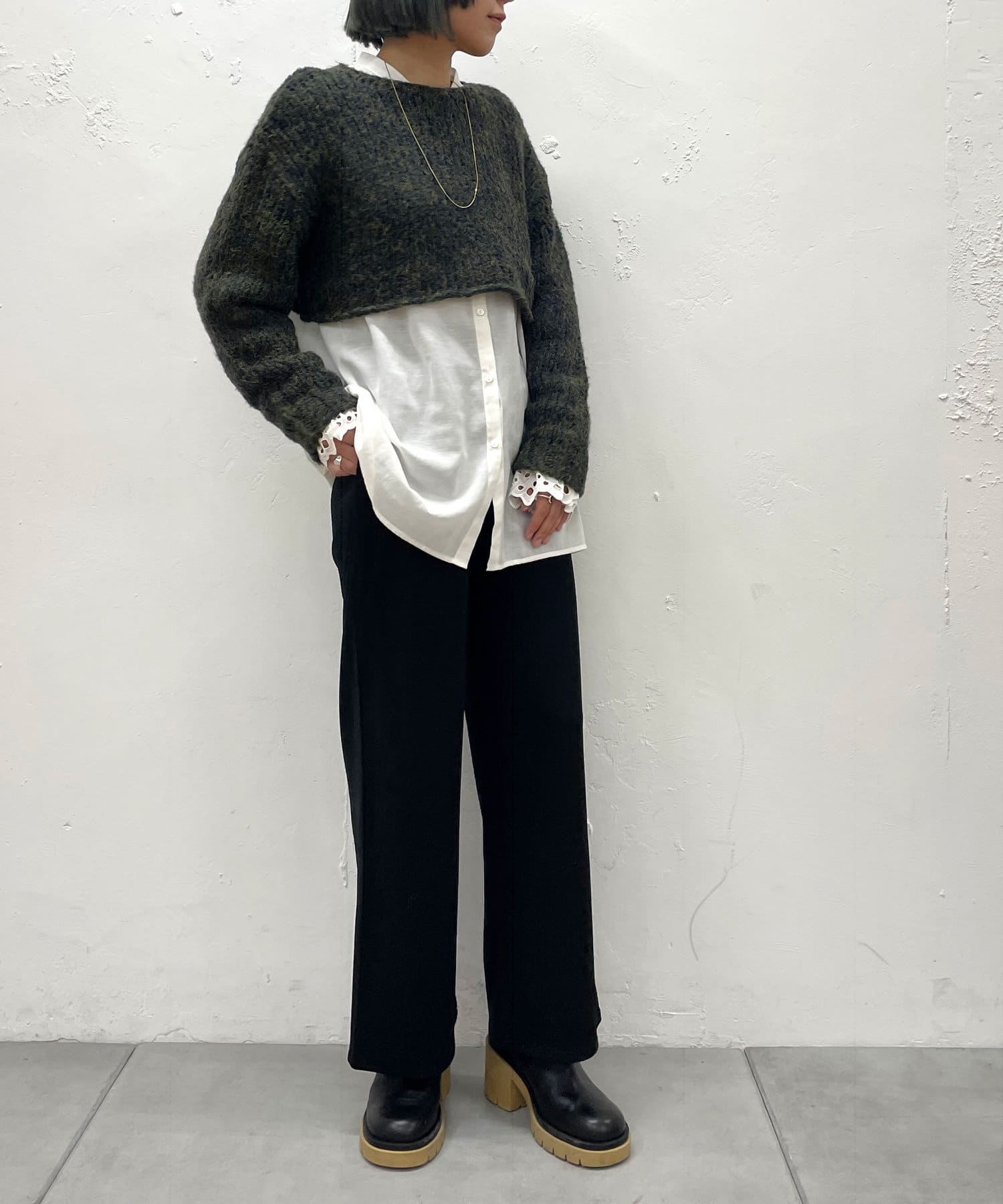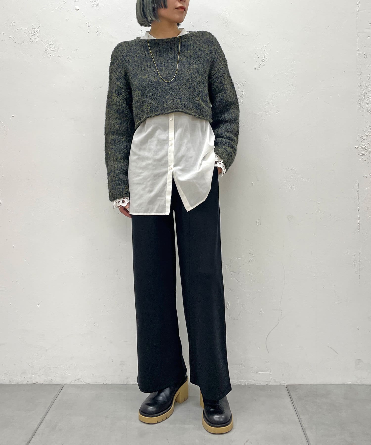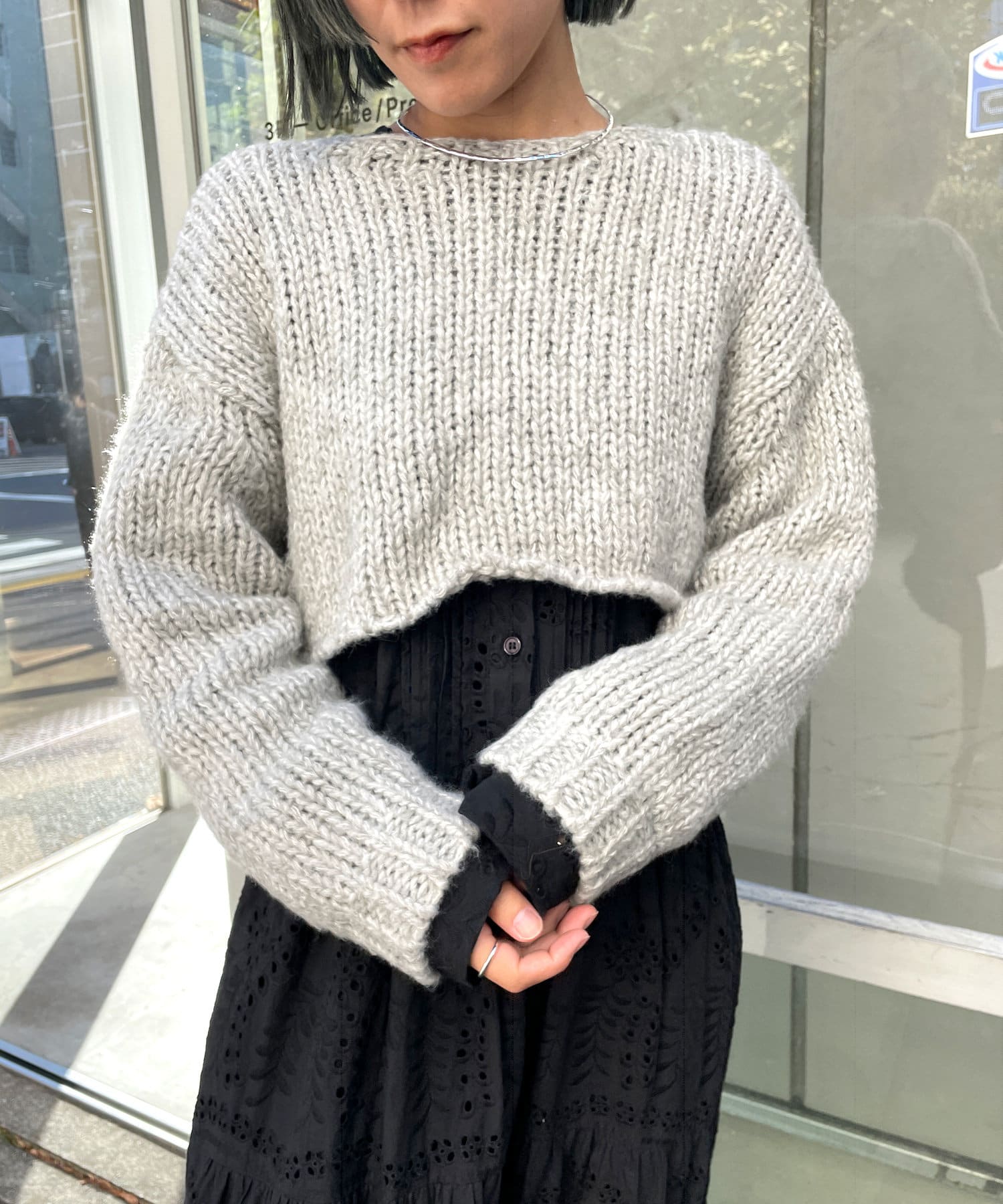 ・シンプルながらショート丈が今年らしい、旬のレイヤードスタイルが楽しめるショートニット。