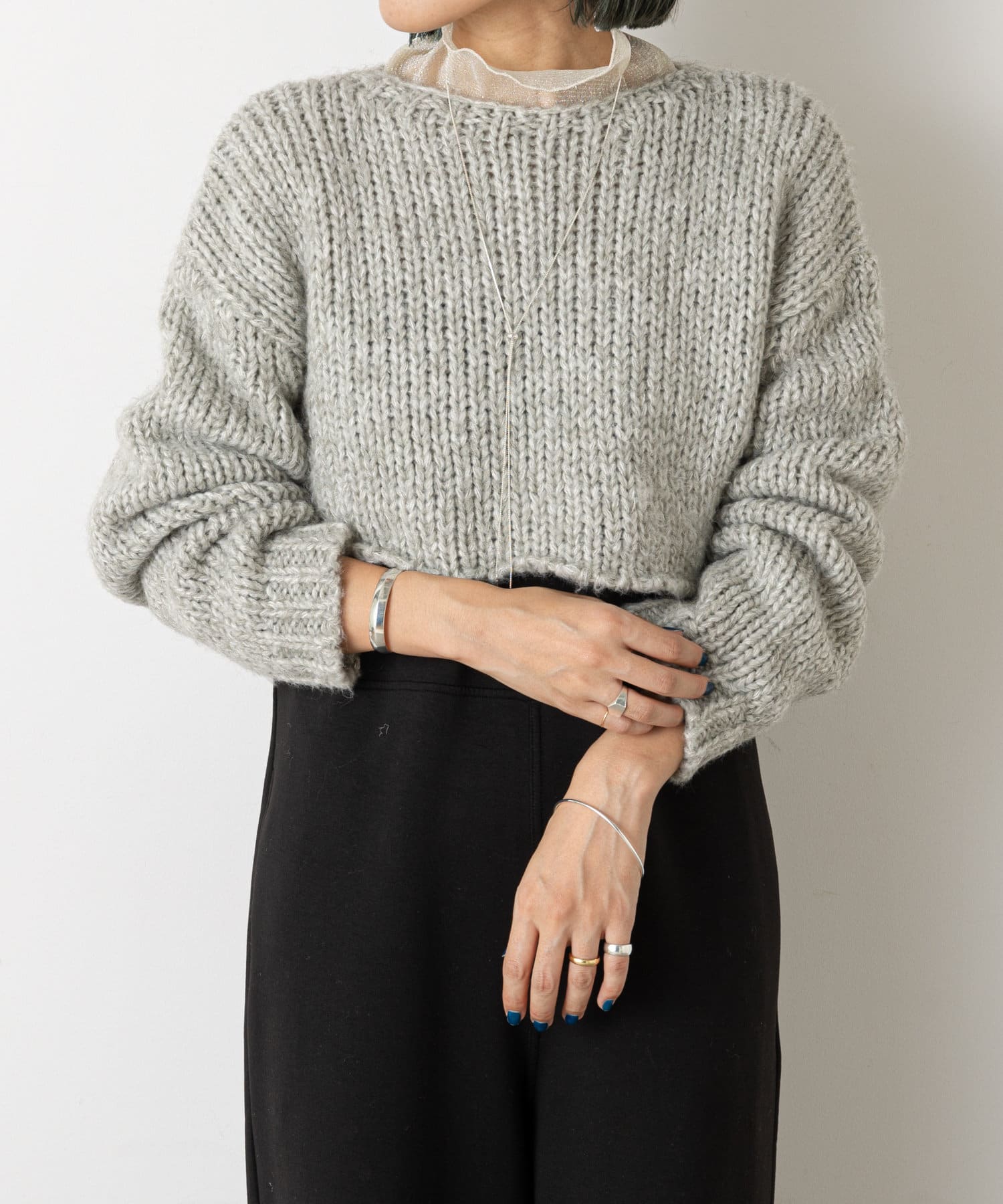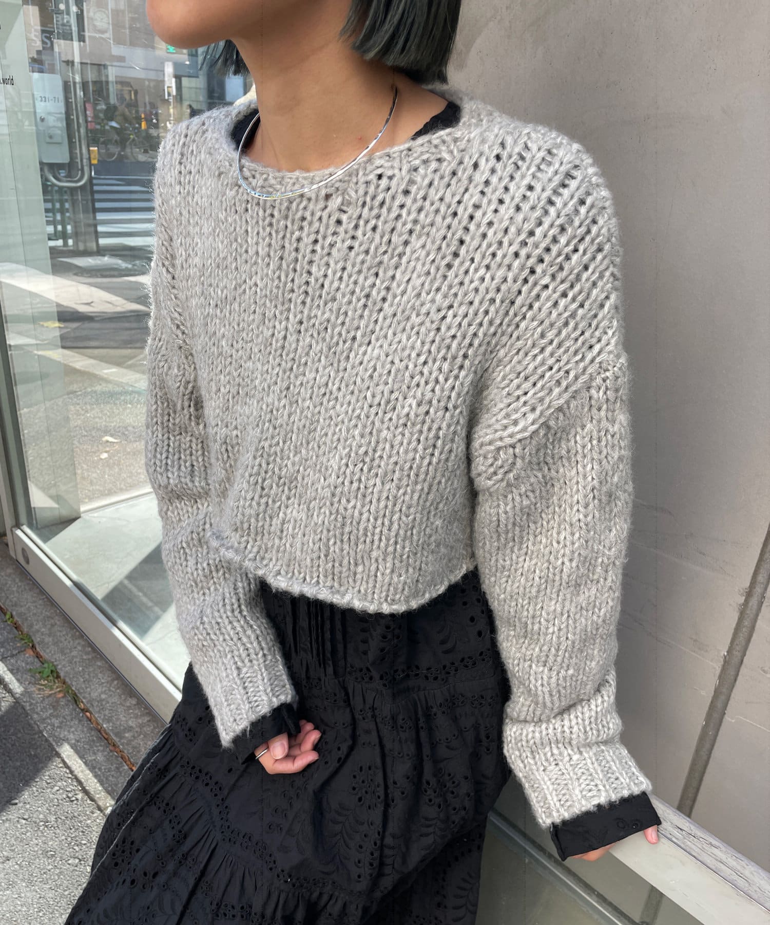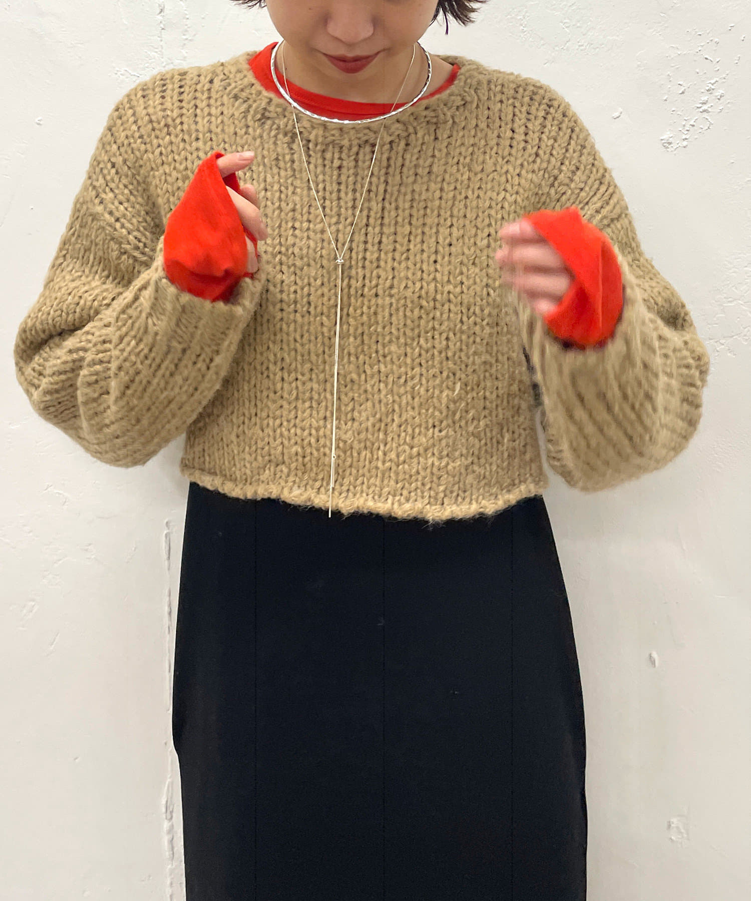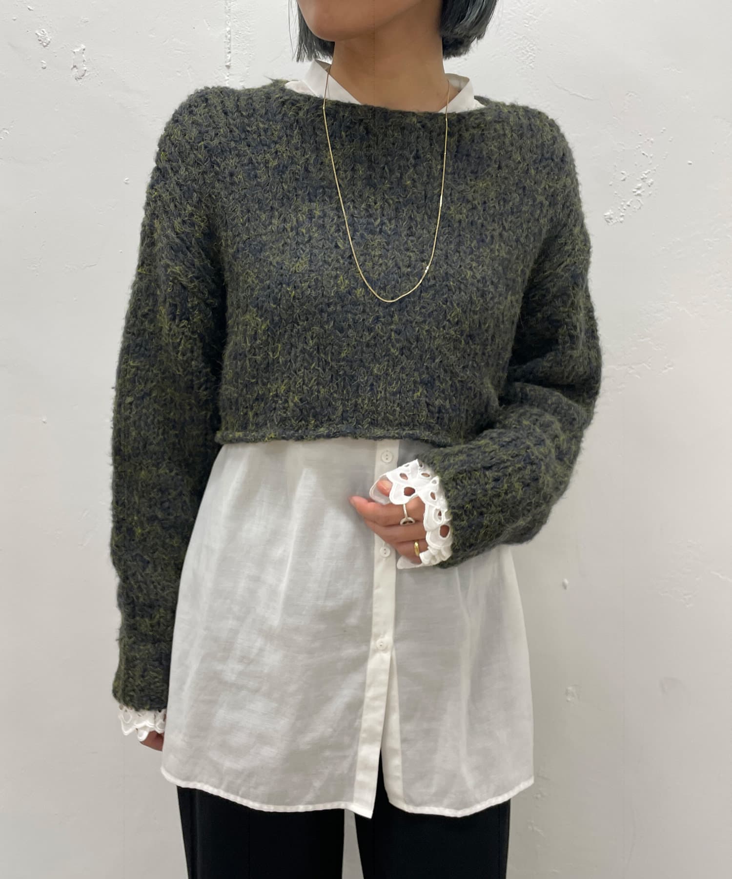 ・シンプルながらショート丈が今年らしい、旬のレイヤードスタイルが楽しめるショートニット。