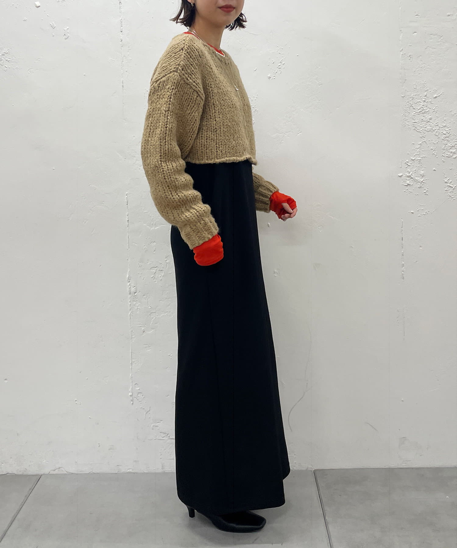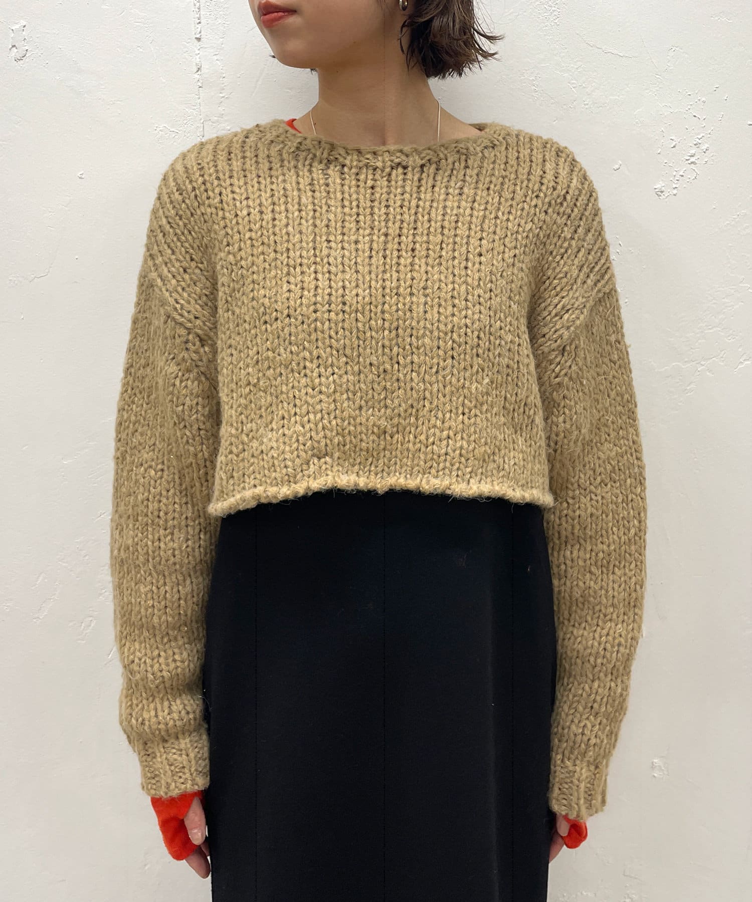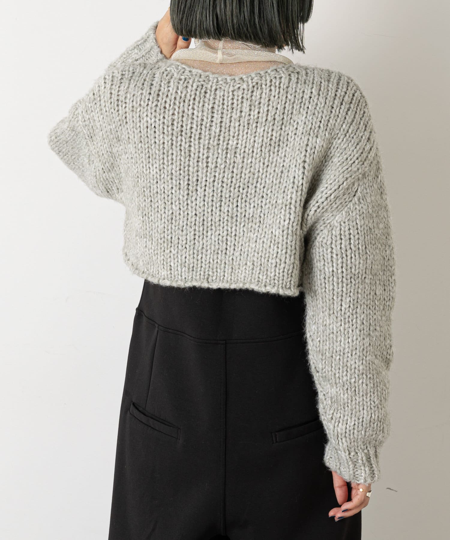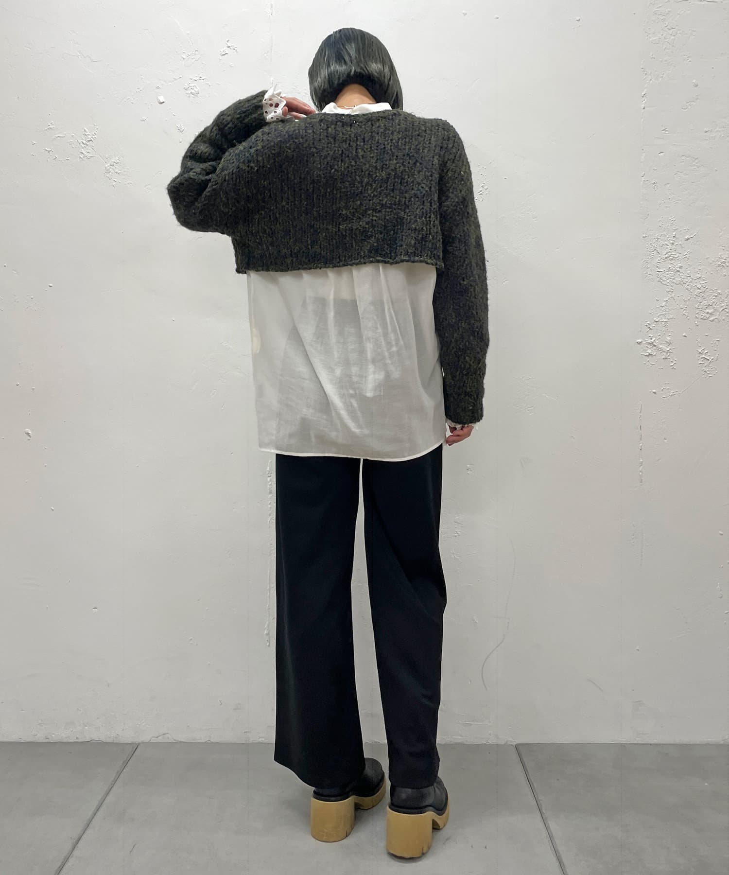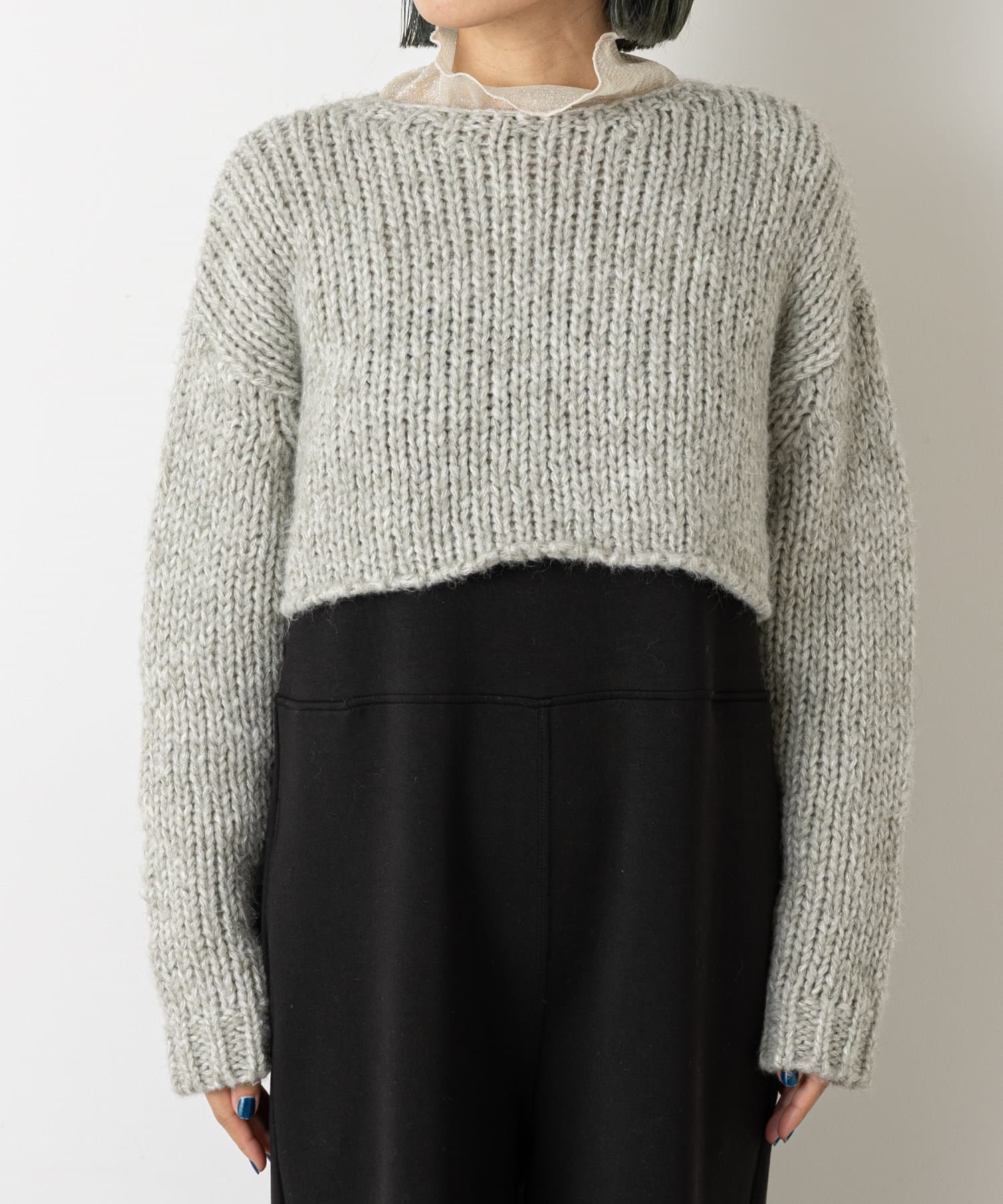 ・シンプルながらショート丈が今年らしい、旬のレイヤードスタイルが楽しめるショートニット。