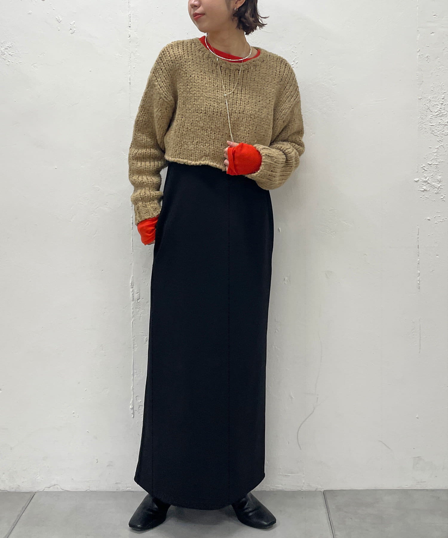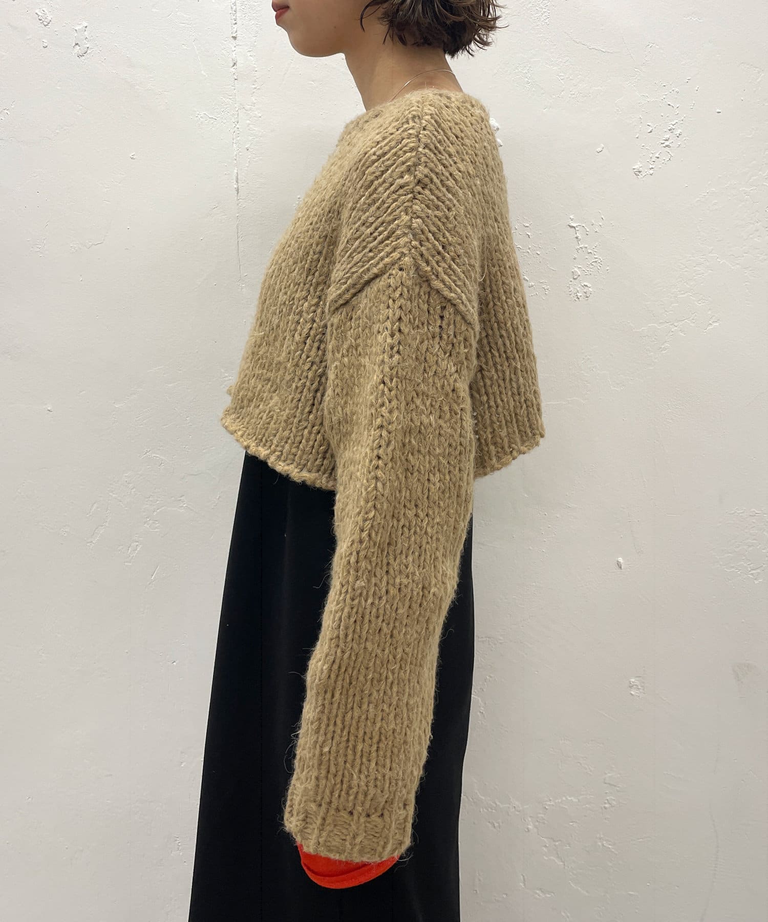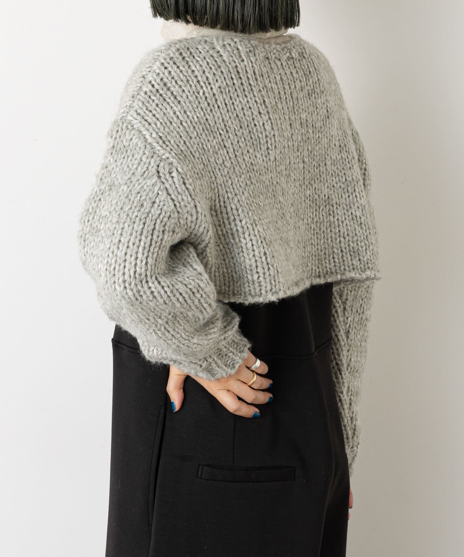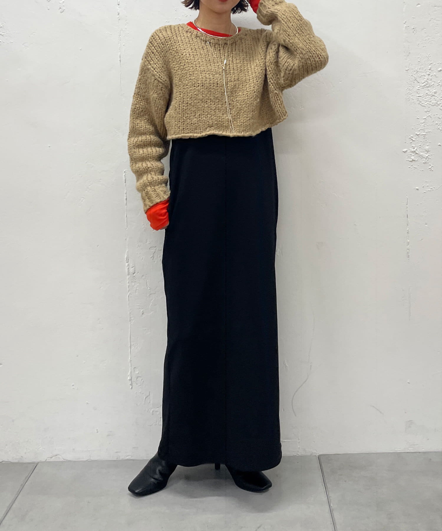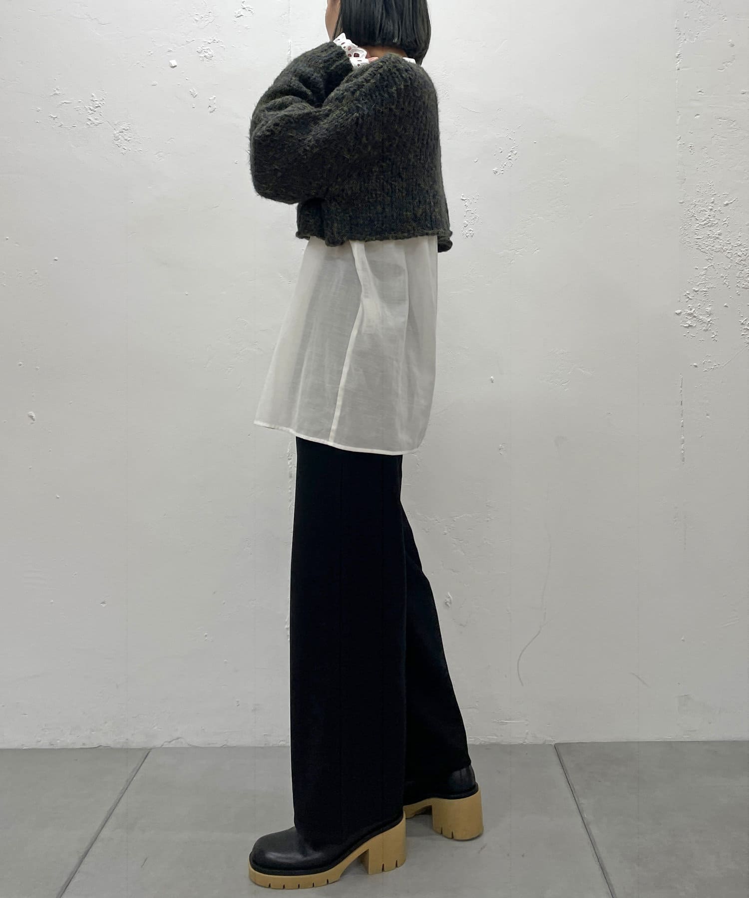 ・シンプルながらショート丈が今年らしい、旬のレイヤードスタイルが楽しめるショートニット。