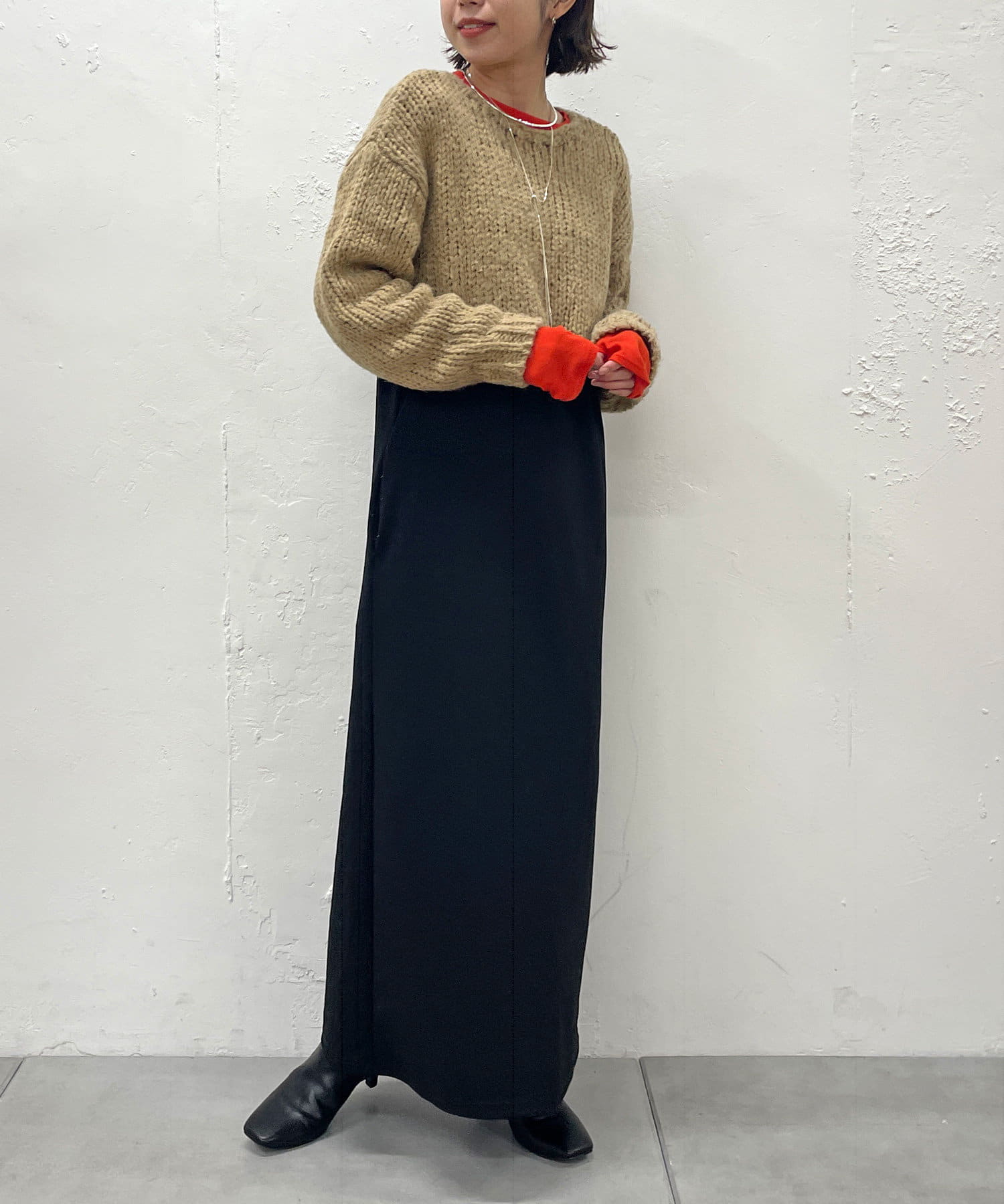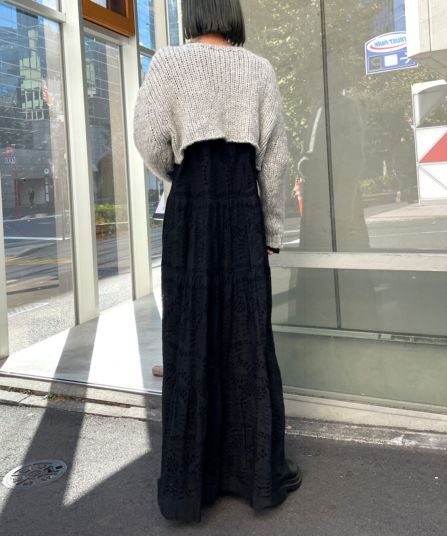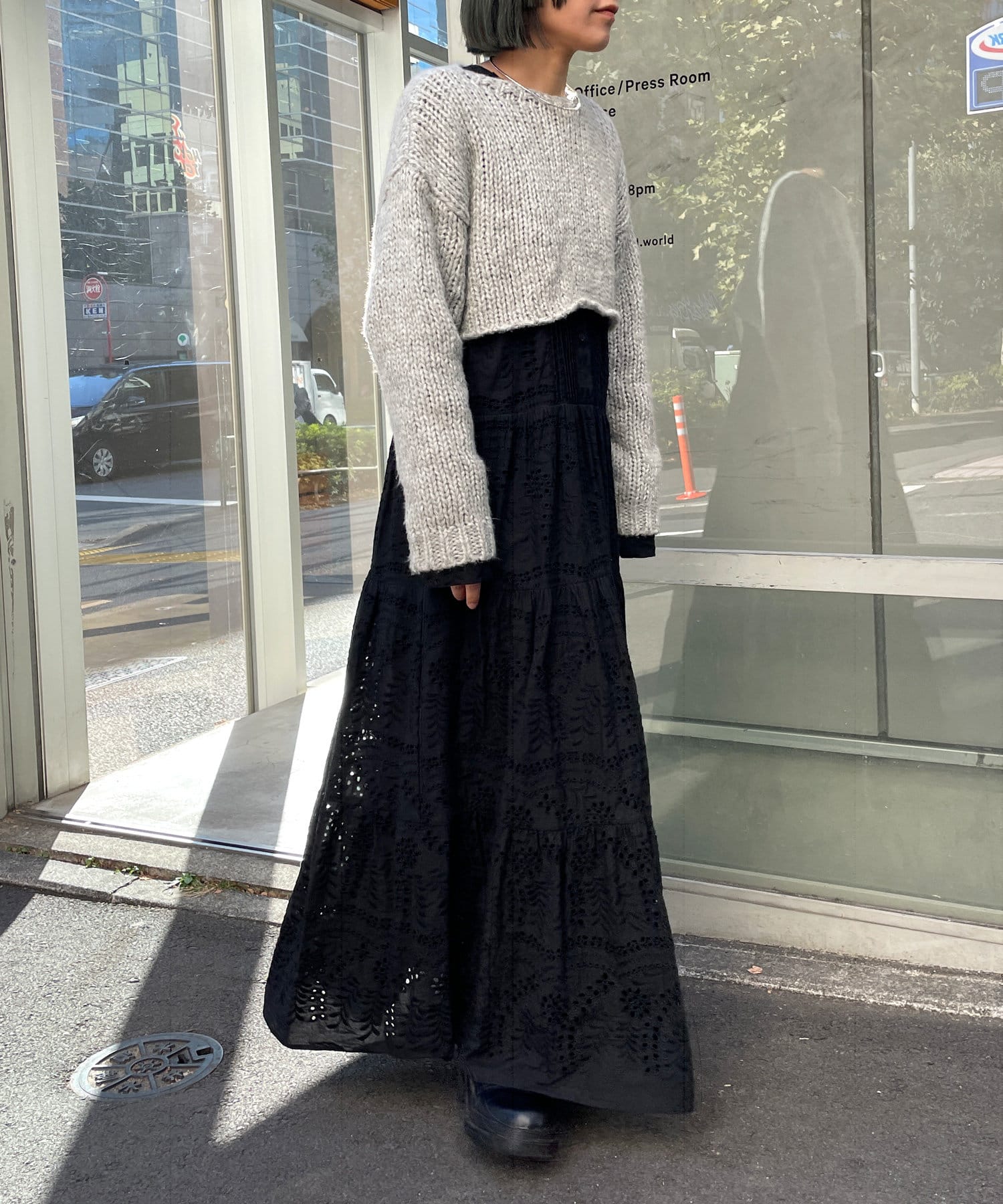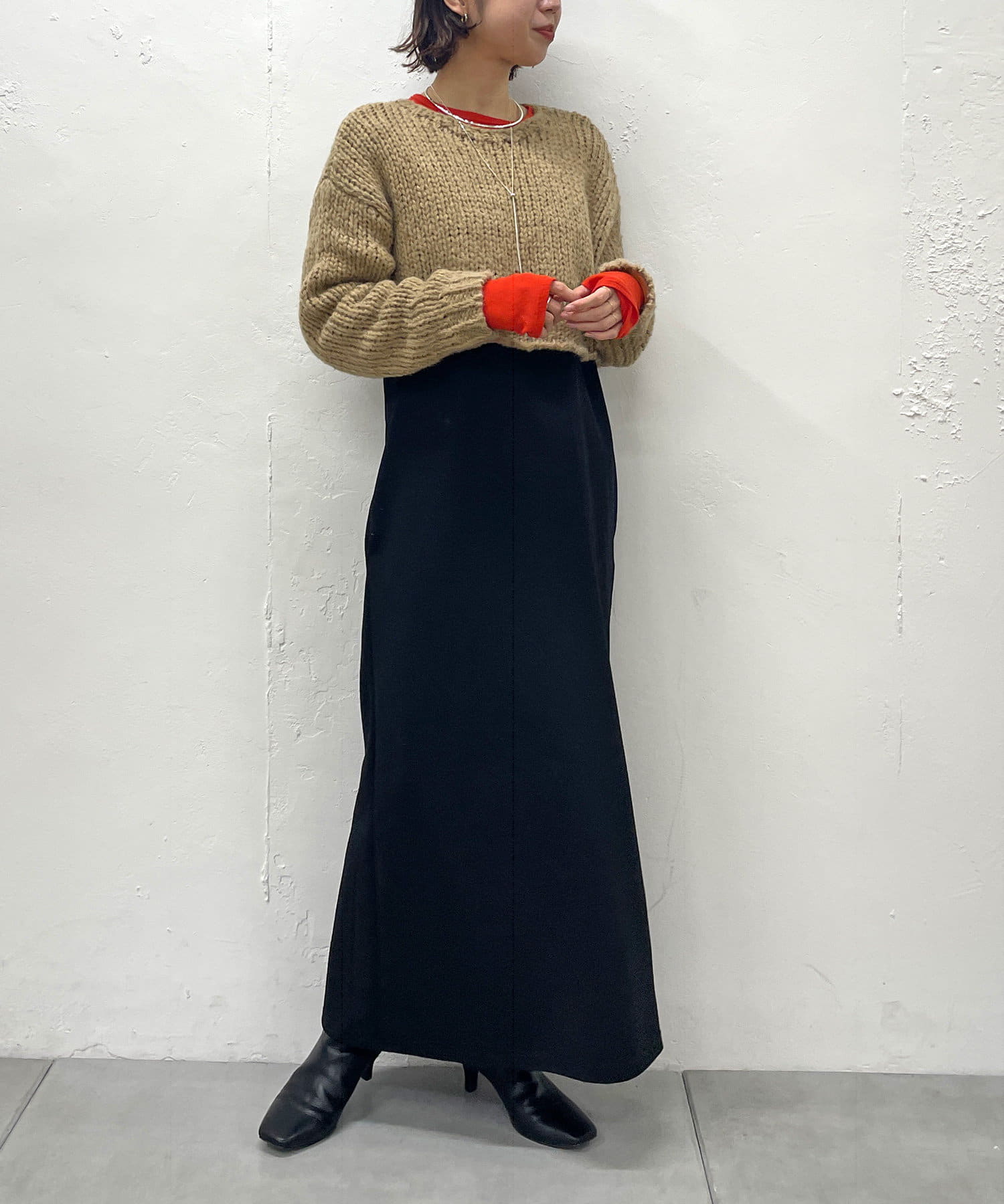 ・シンプルながらショート丈が今年らしい、旬のレイヤードスタイルが楽しめるショートニット。