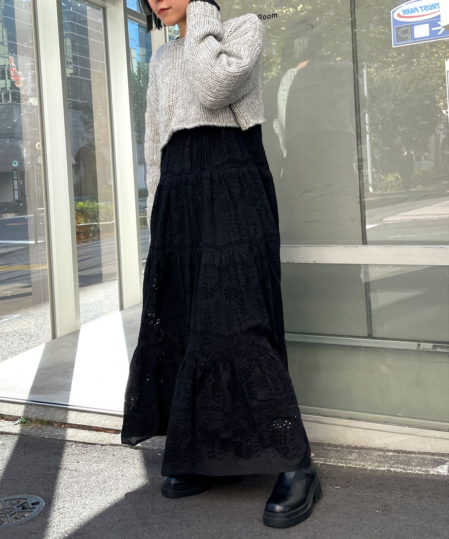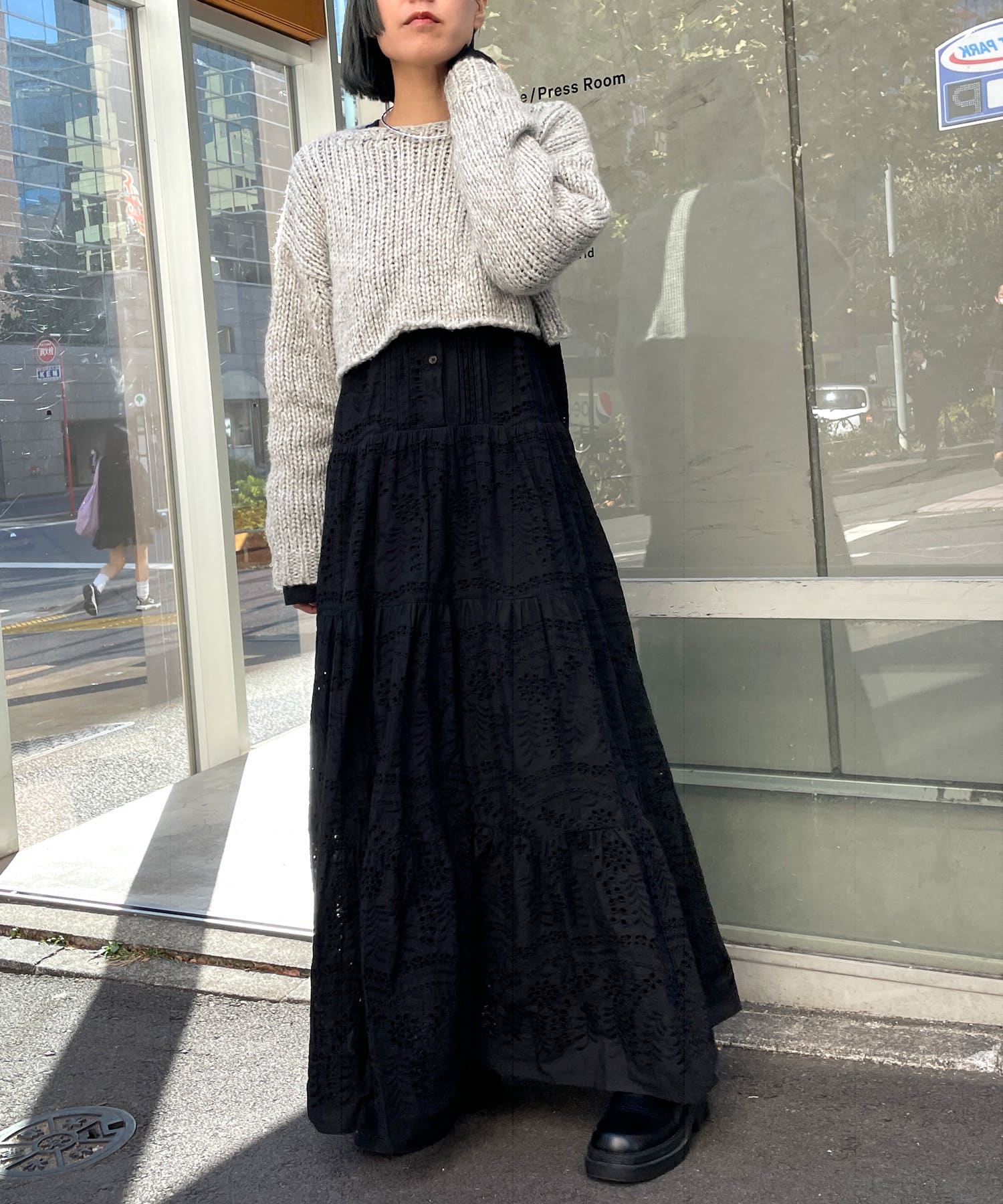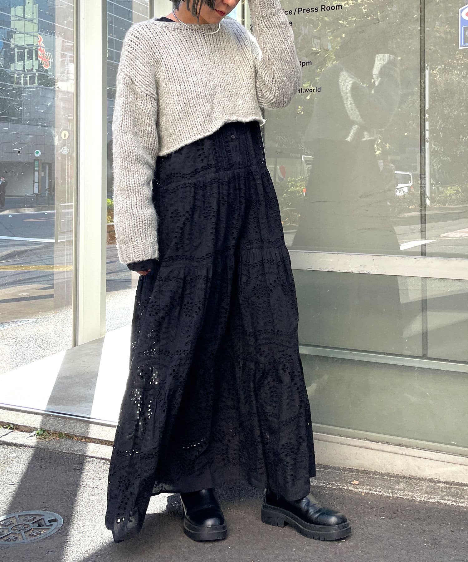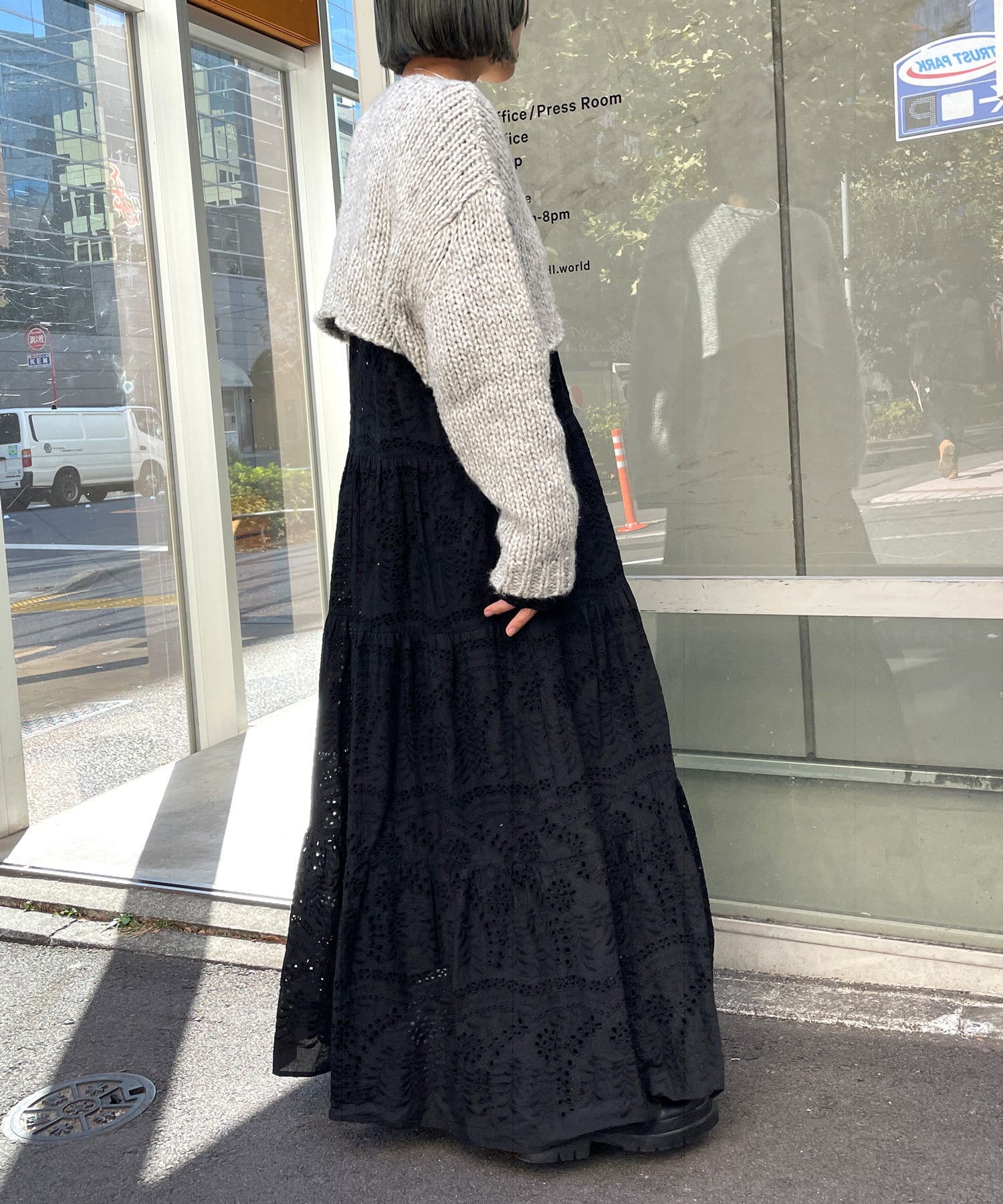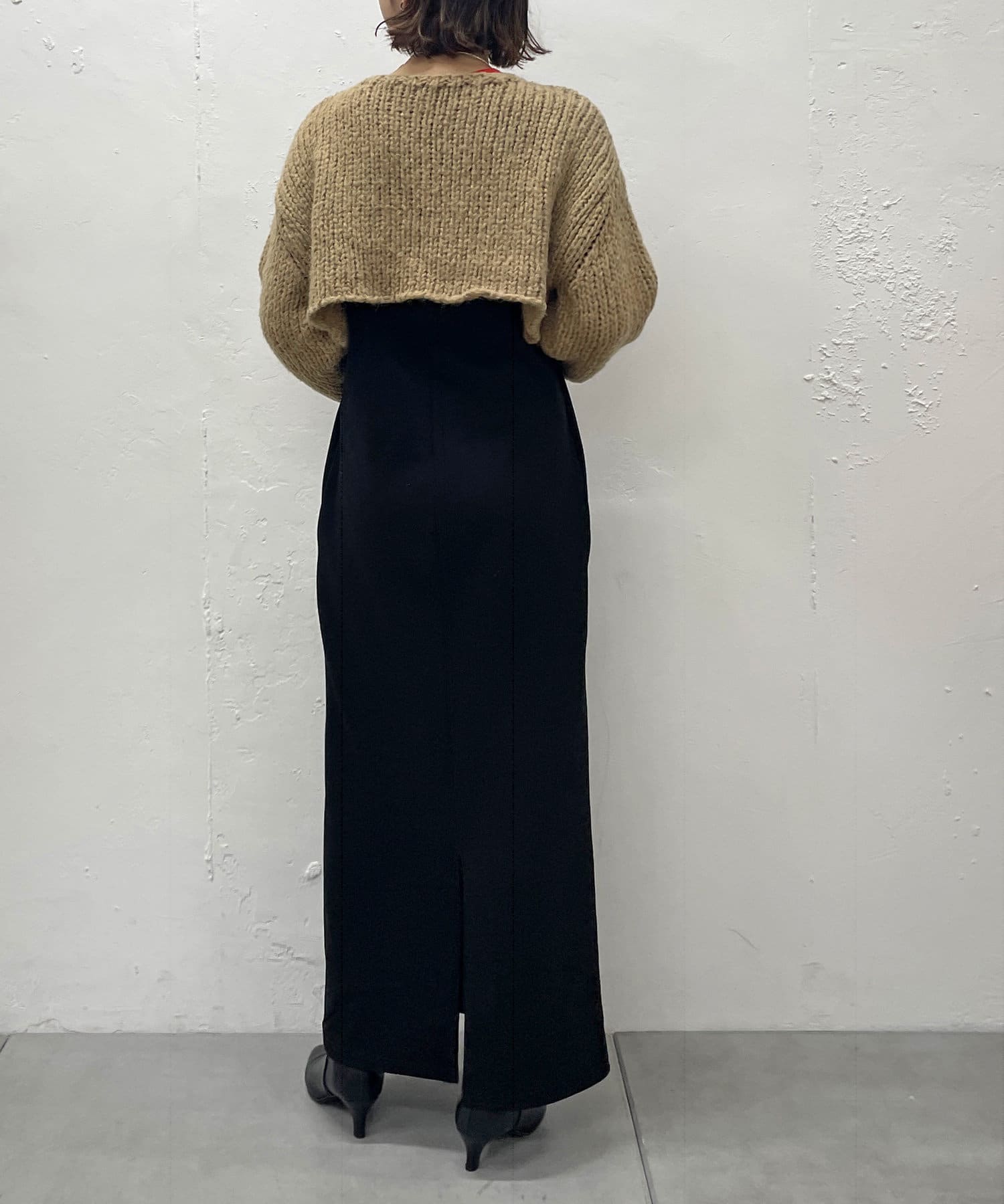 ・シンプルながらショート丈が今年らしい、旬のレイヤードスタイルが楽しめるショートニット。