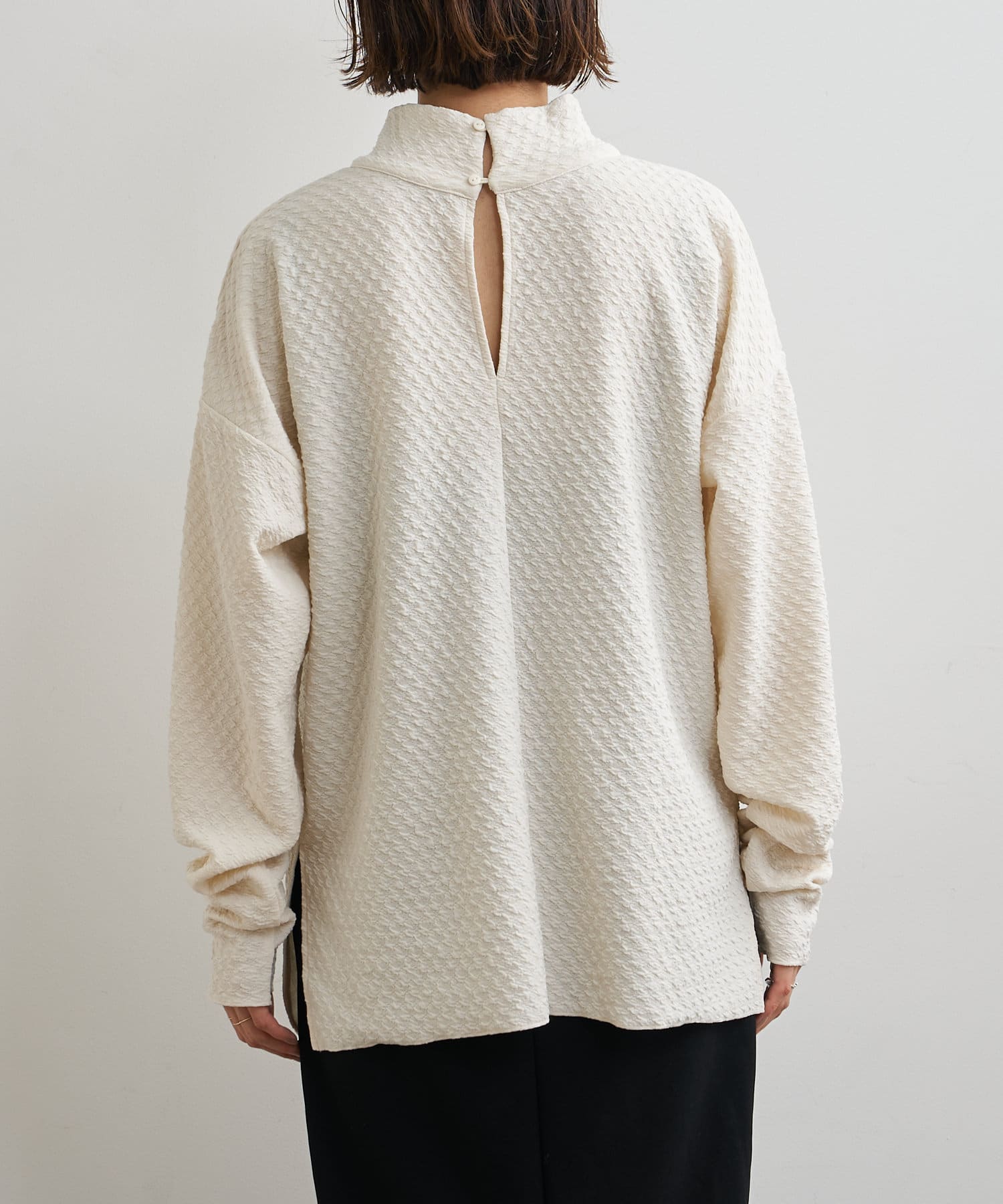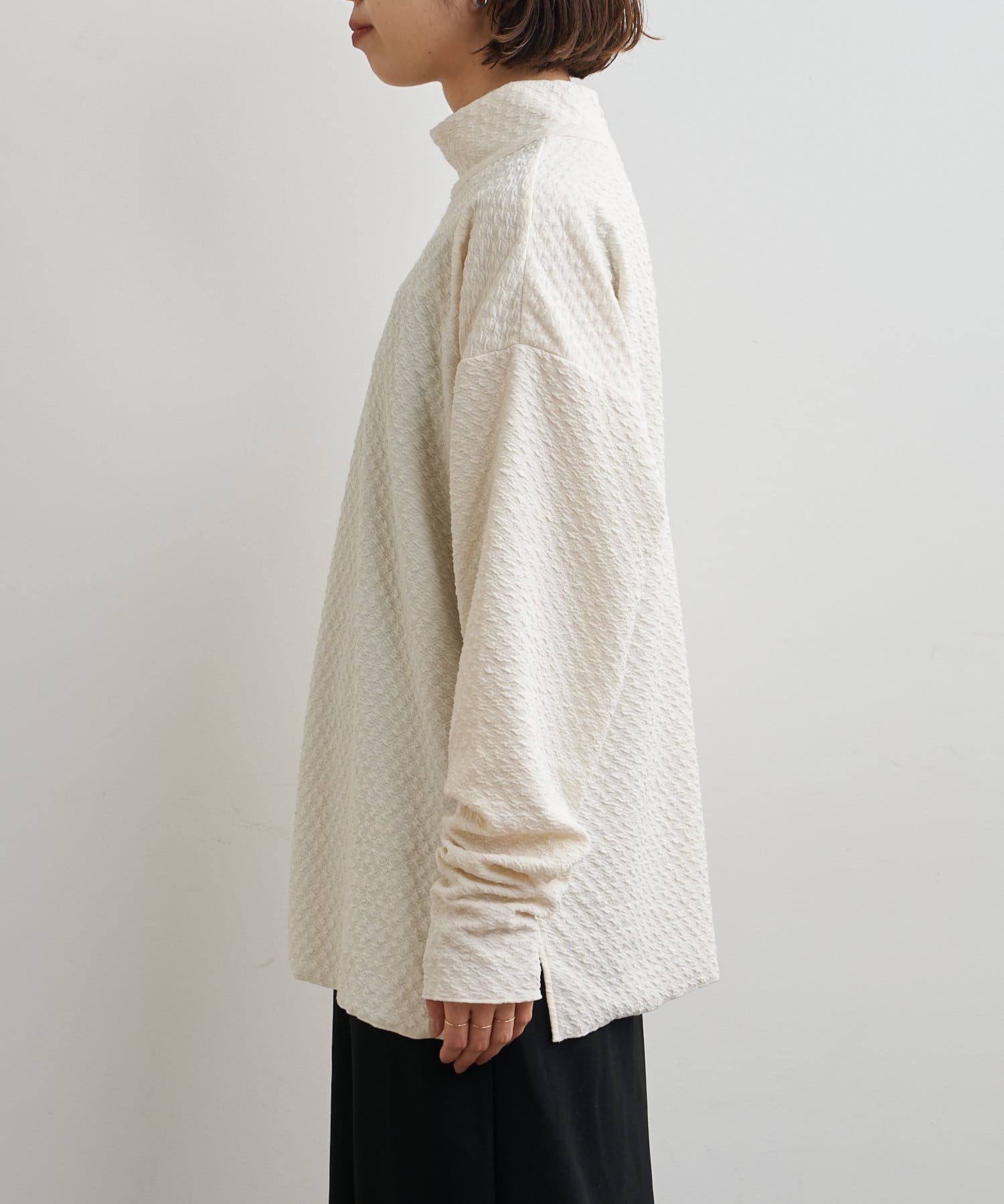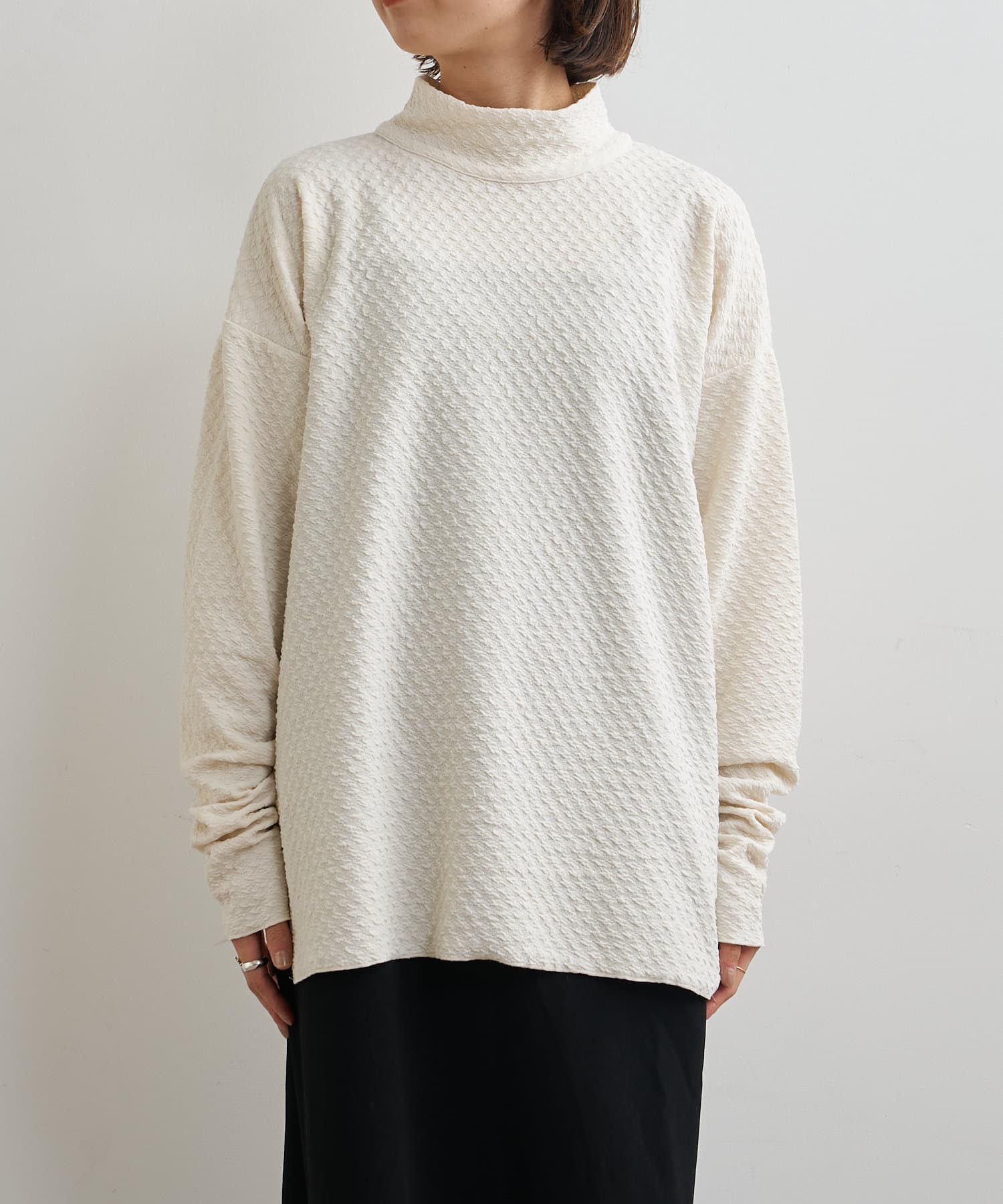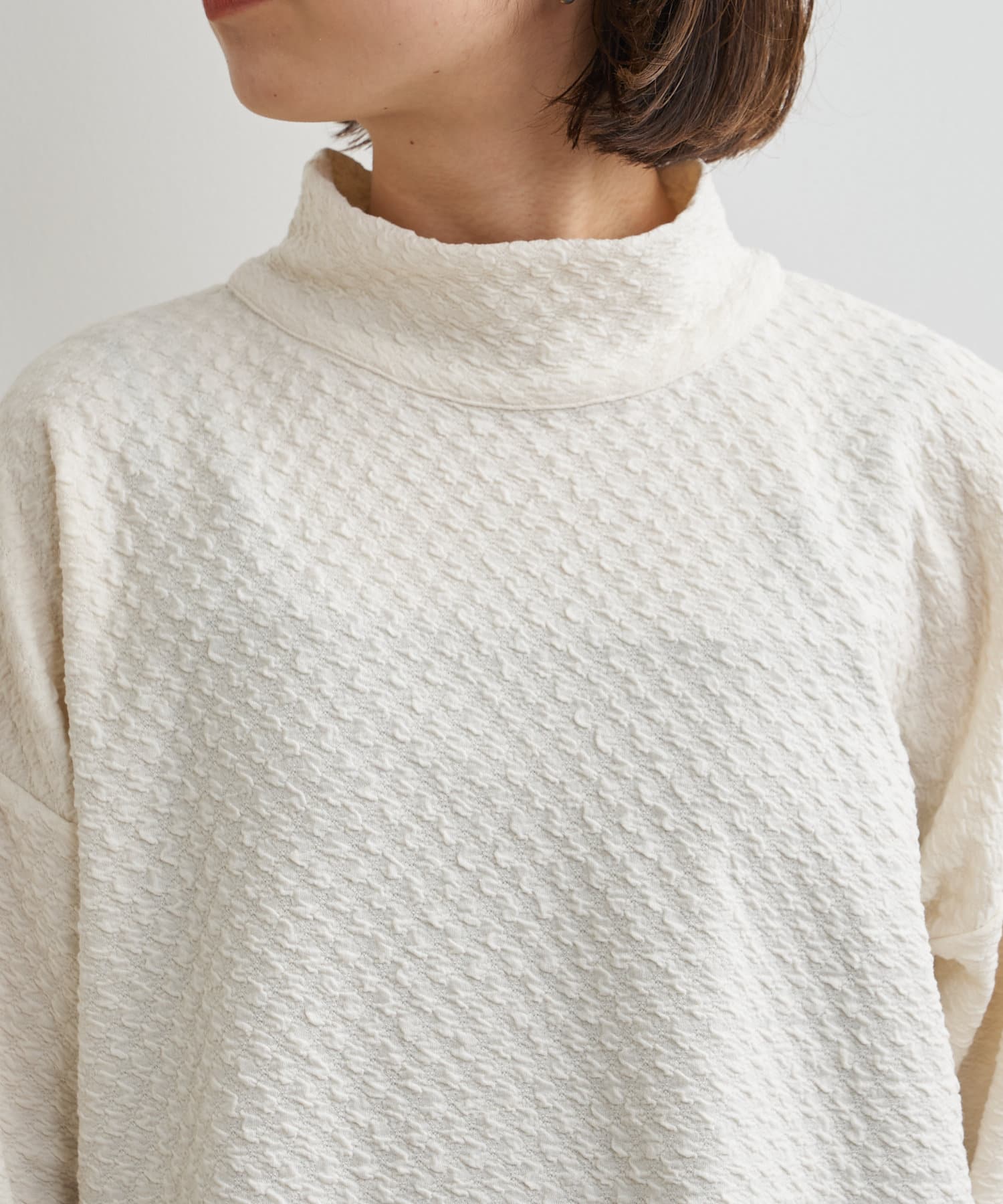 ・ぽこぽことした凹凸のある素材が特徴的で、ニットとの合わせはもちろん一枚でも様になるハイネックプルオーバー。